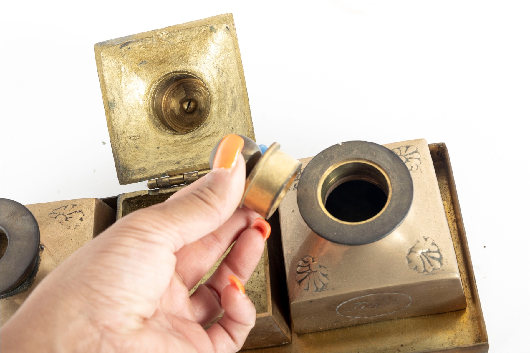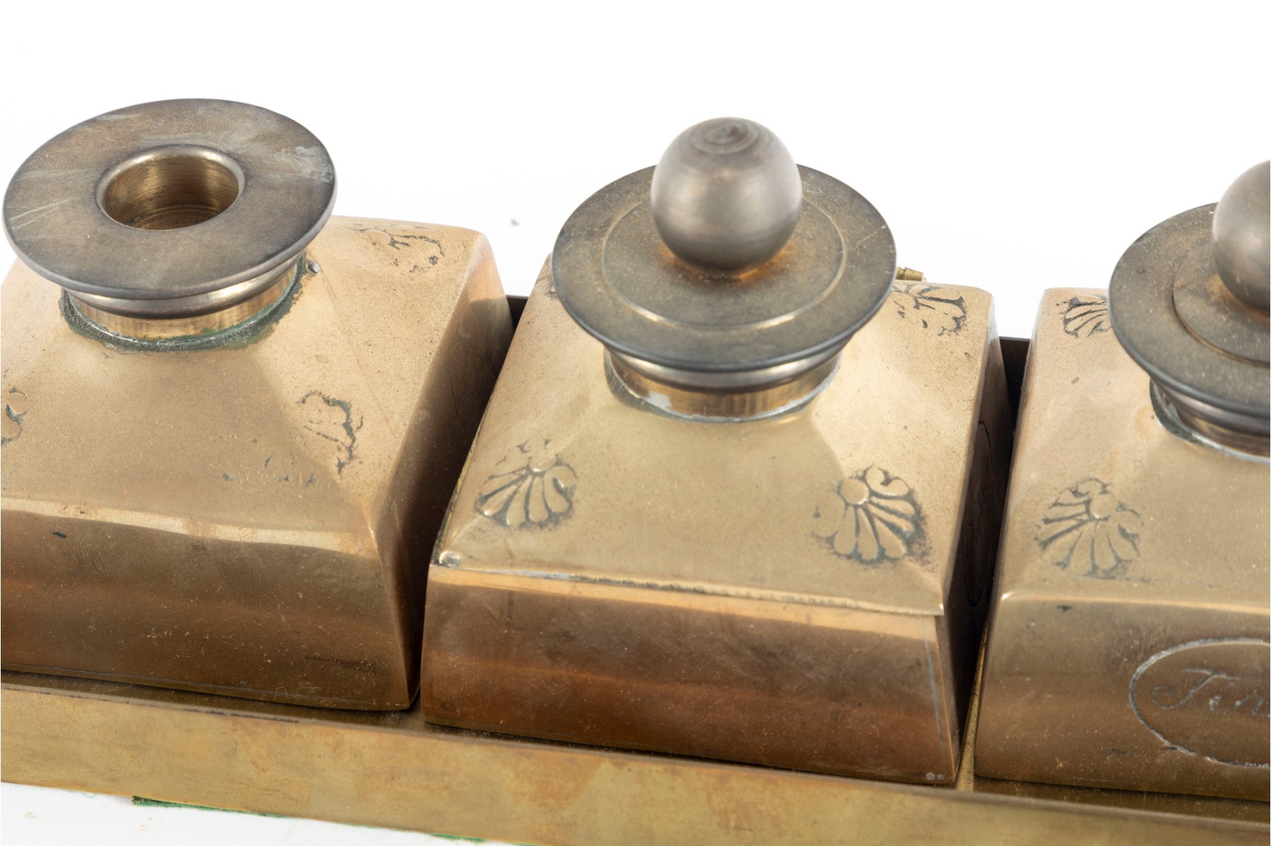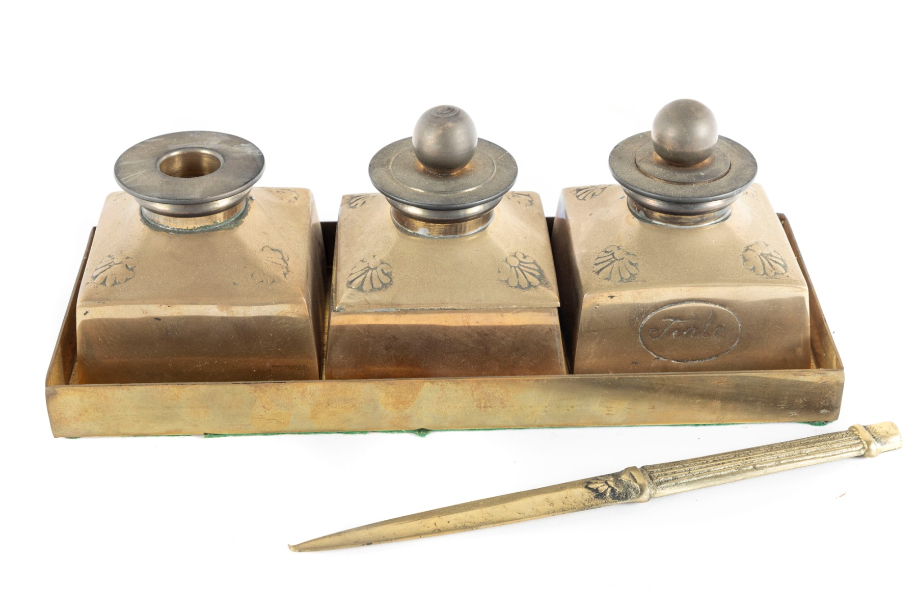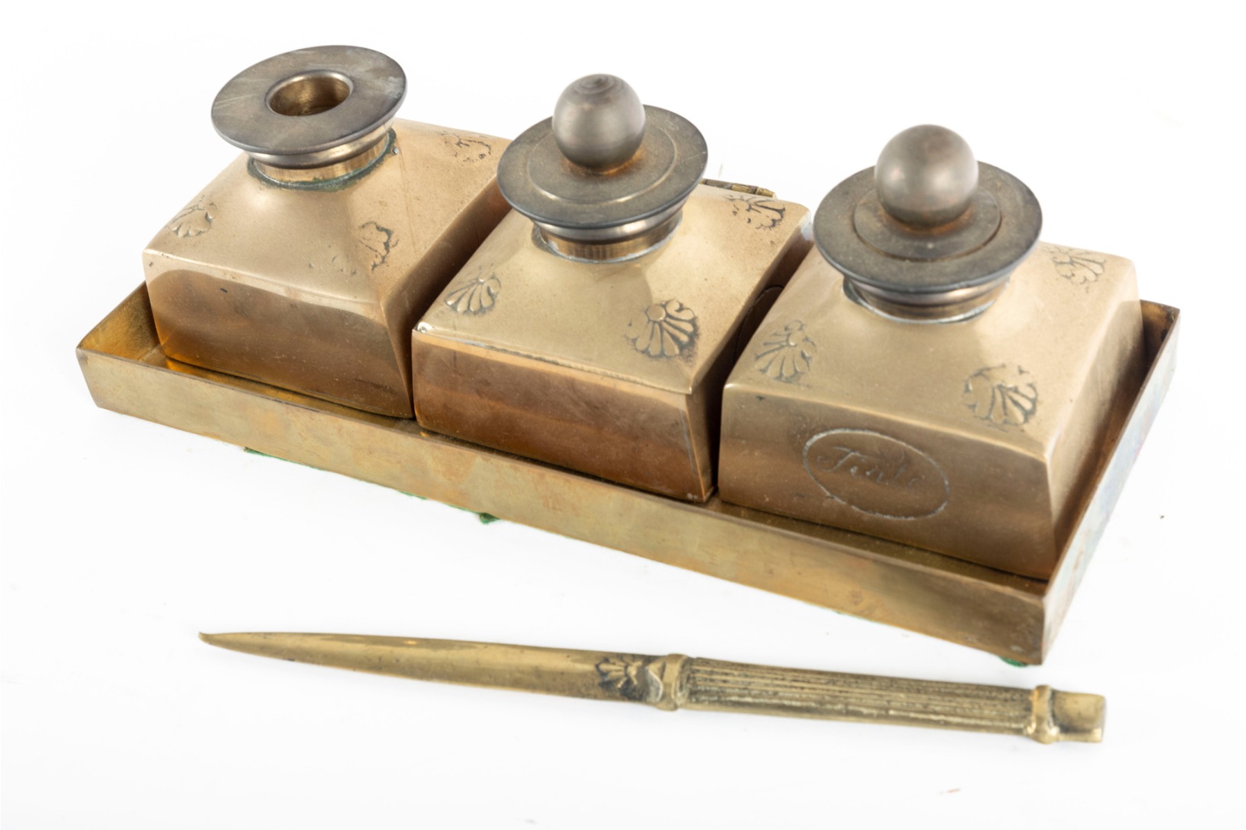 An antique desktop inkwell set from Portugal. Features three heavy brass inkwells, tray and letter opener.