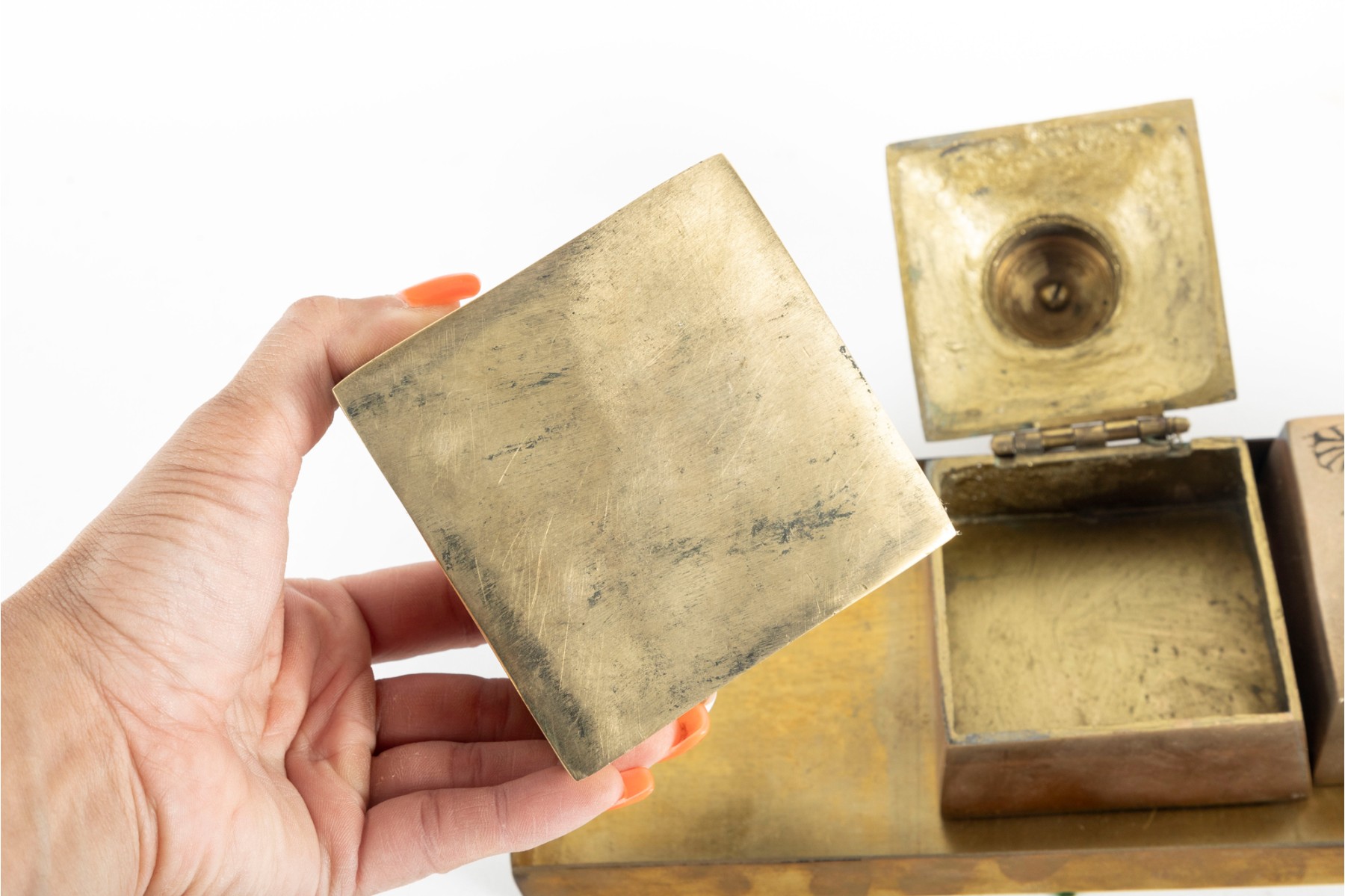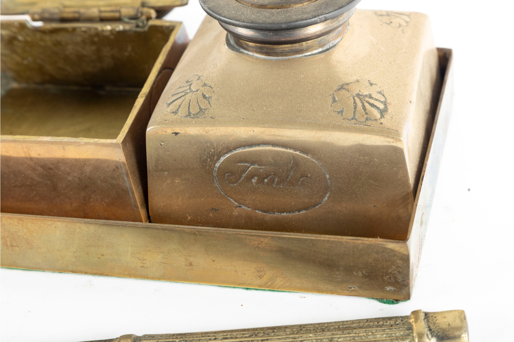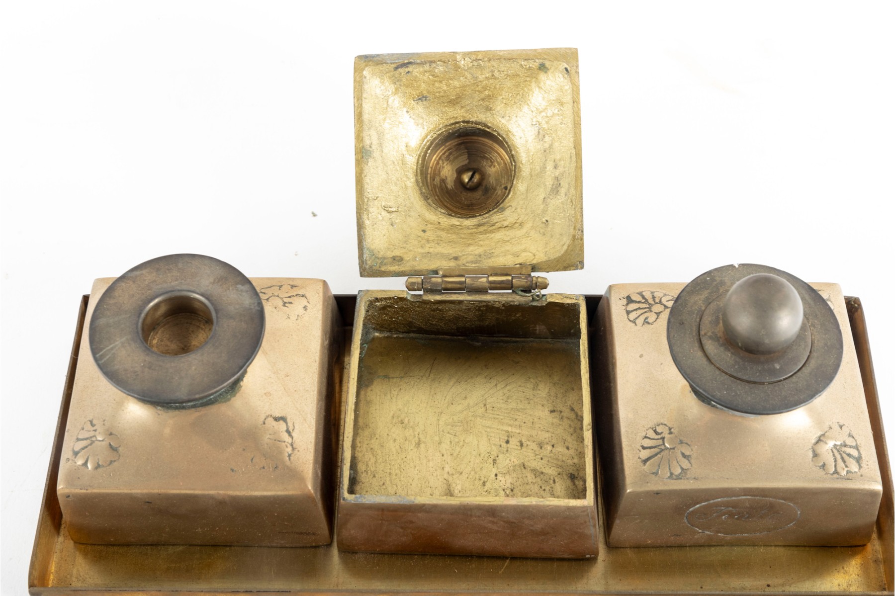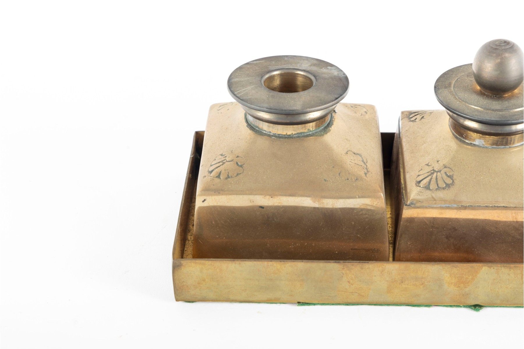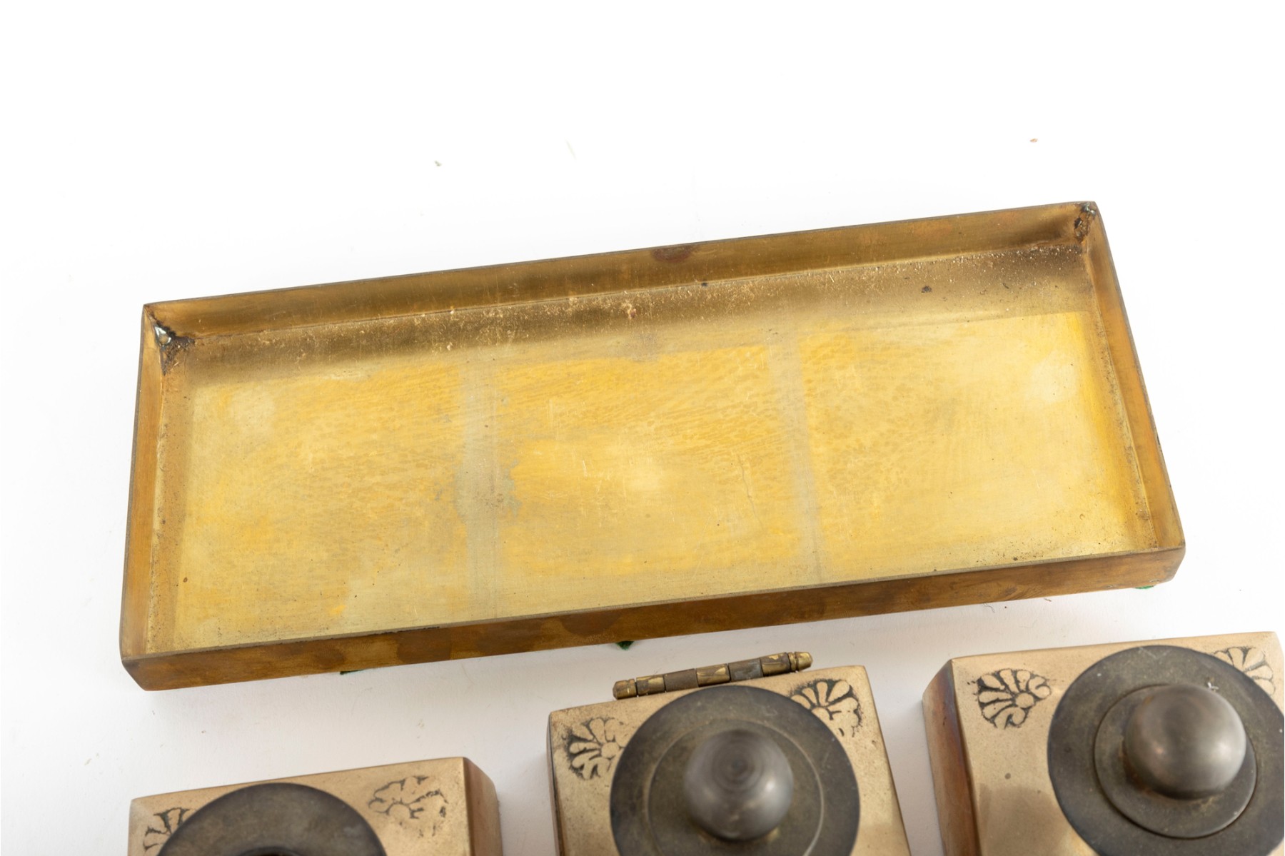 An antique desktop inkwell set from Portugal. Features three heavy brass inkwells, tray and letter opener.
