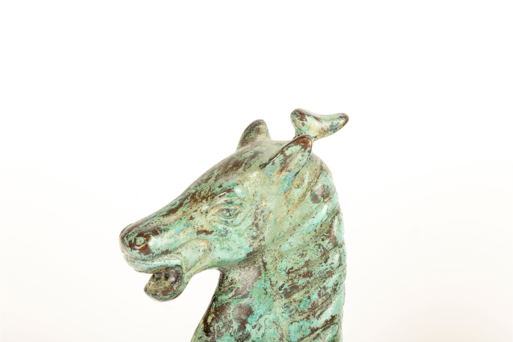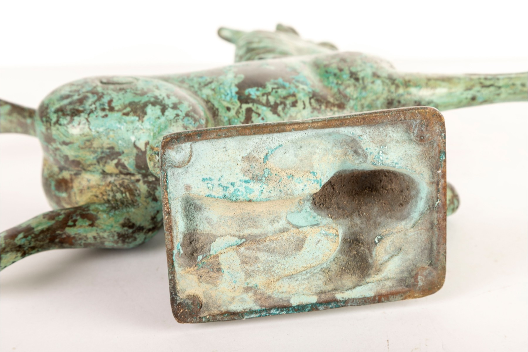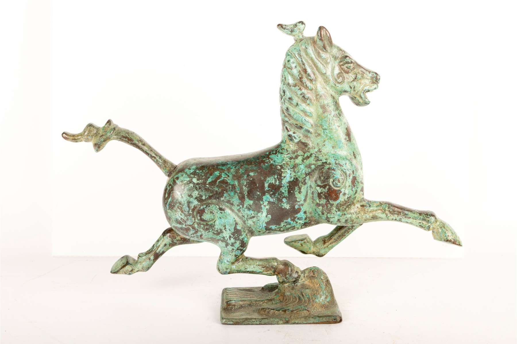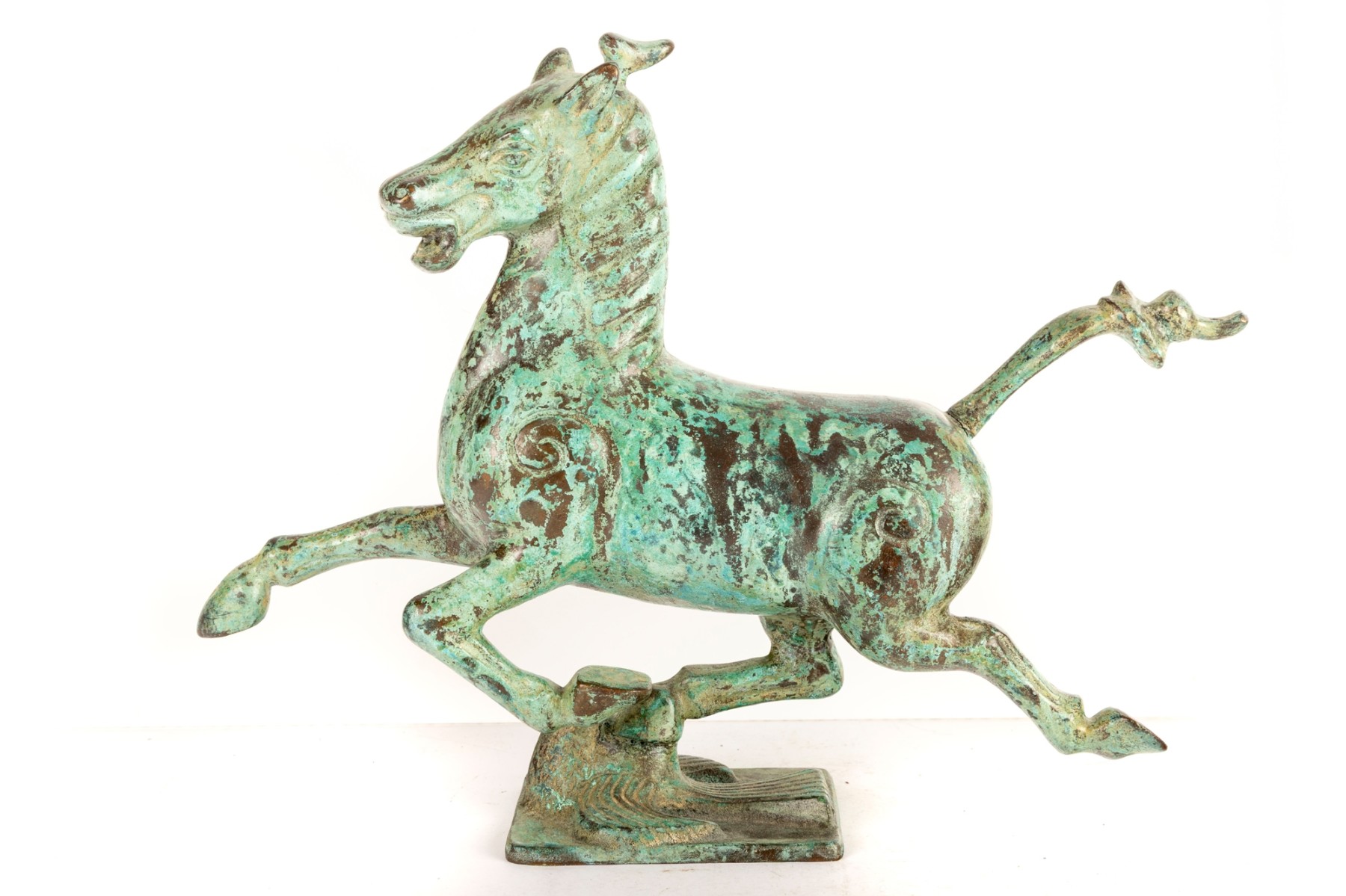 A finely cast solid brass statue depicting a trotting horse in mid-stride, finished with a heavy verdigris patina that lends it an aged, weathered character.