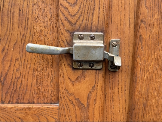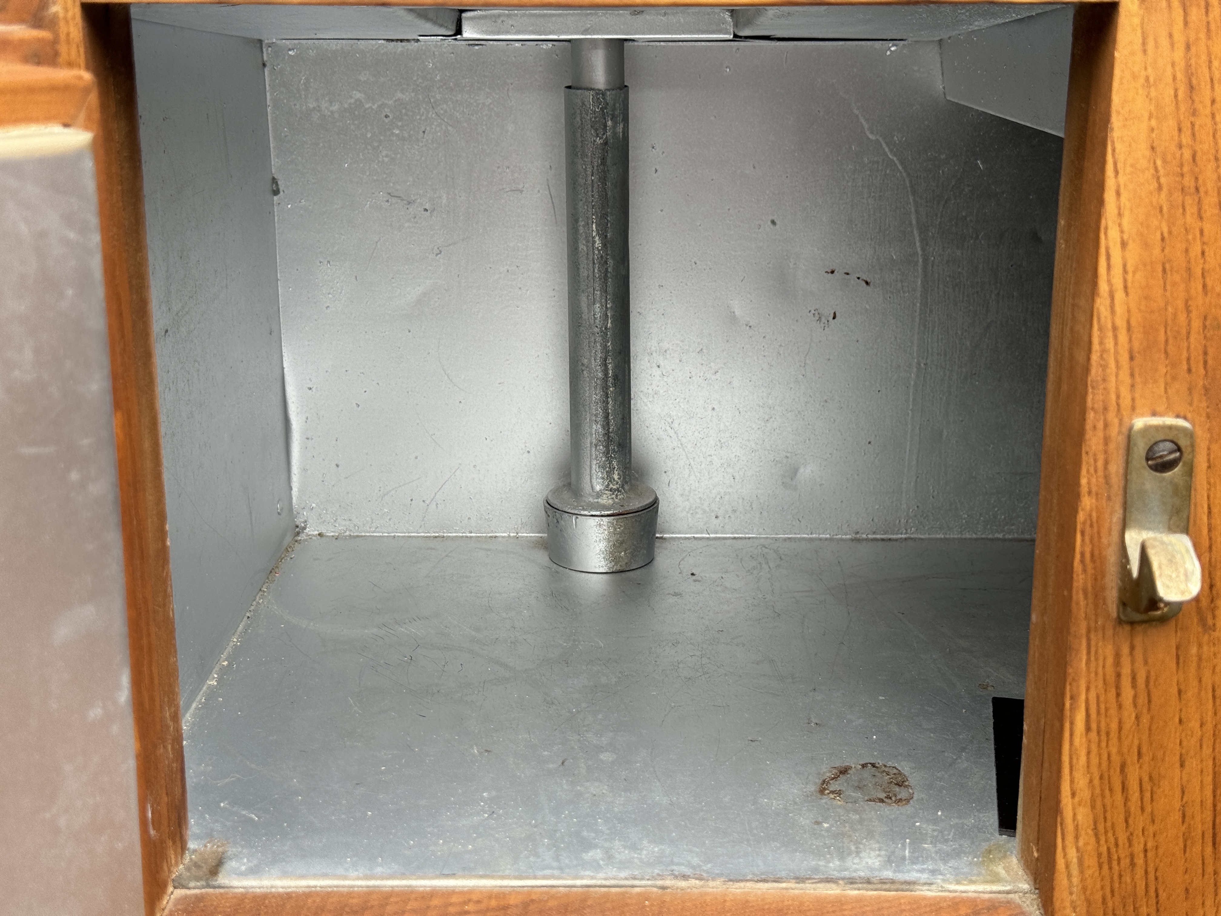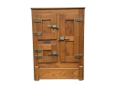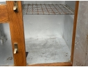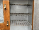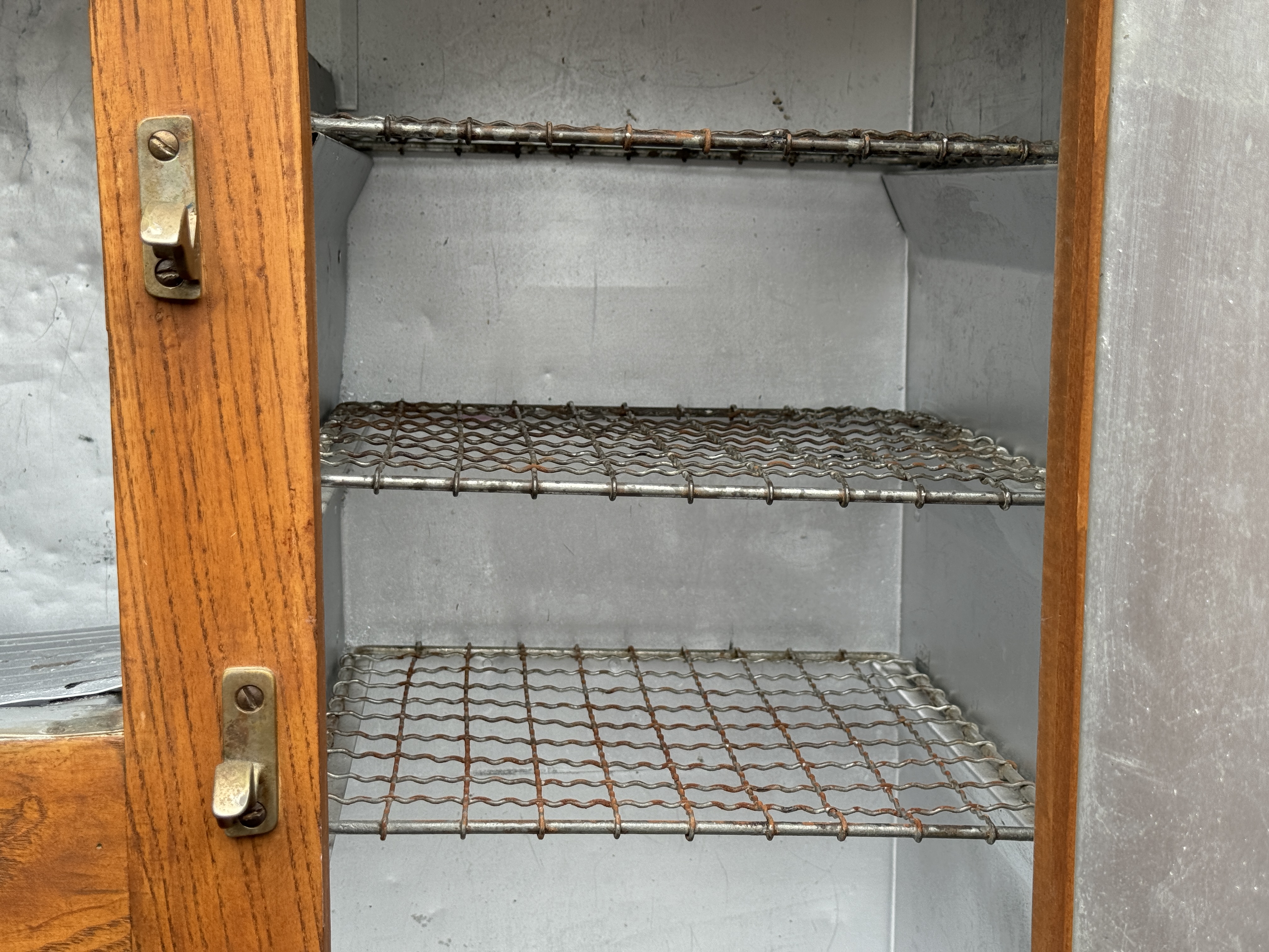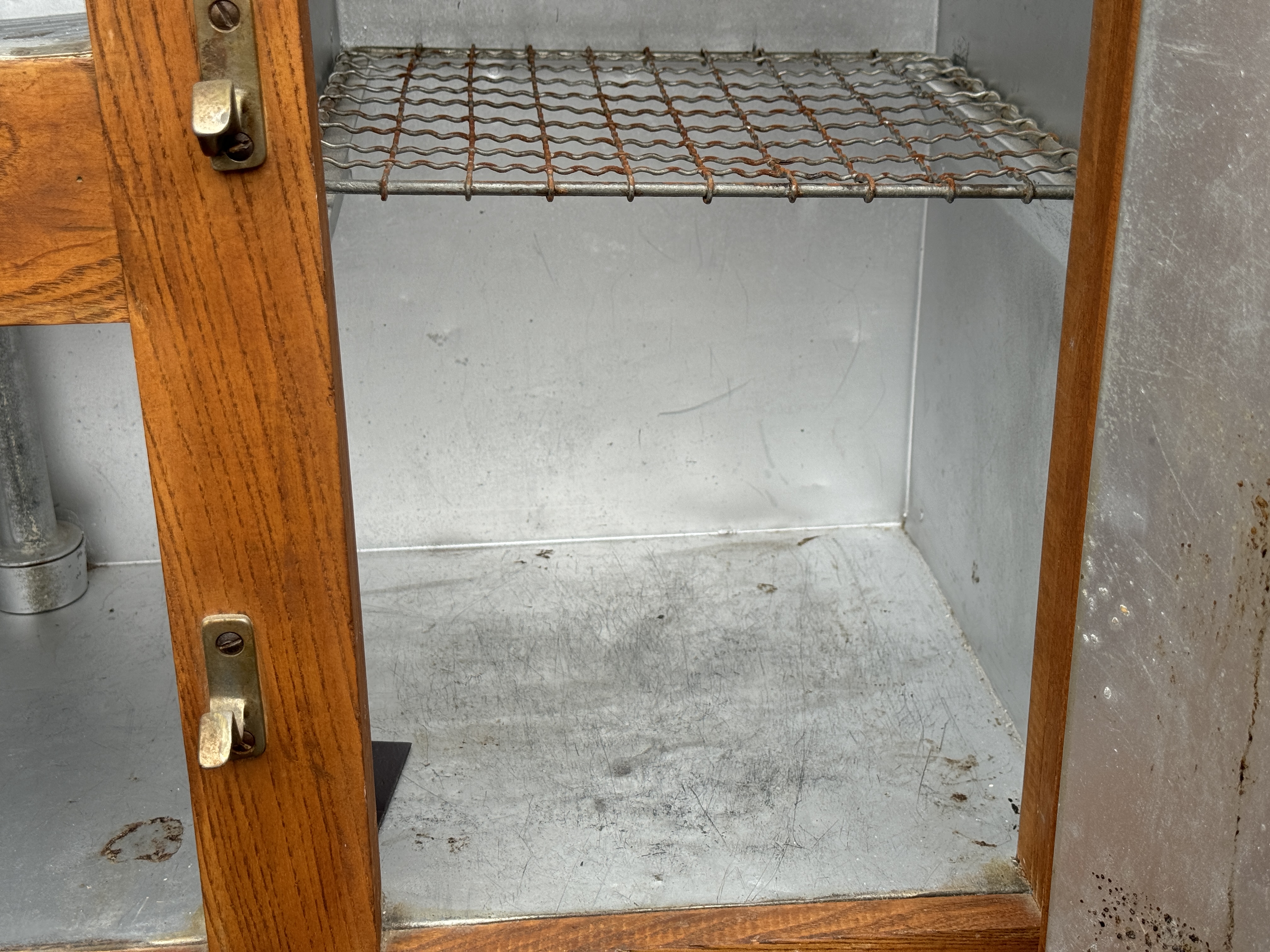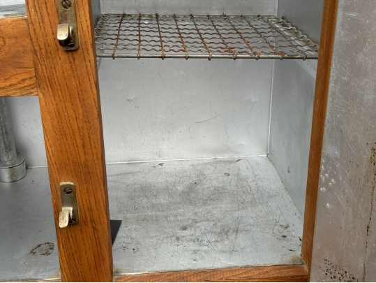 A very well made solid oak ice box with quality latches and hinges with three timing lined drawers opening to reveal three metal grid shelves on the right and ridged cold shelf on the left. Sturdy with good weight.