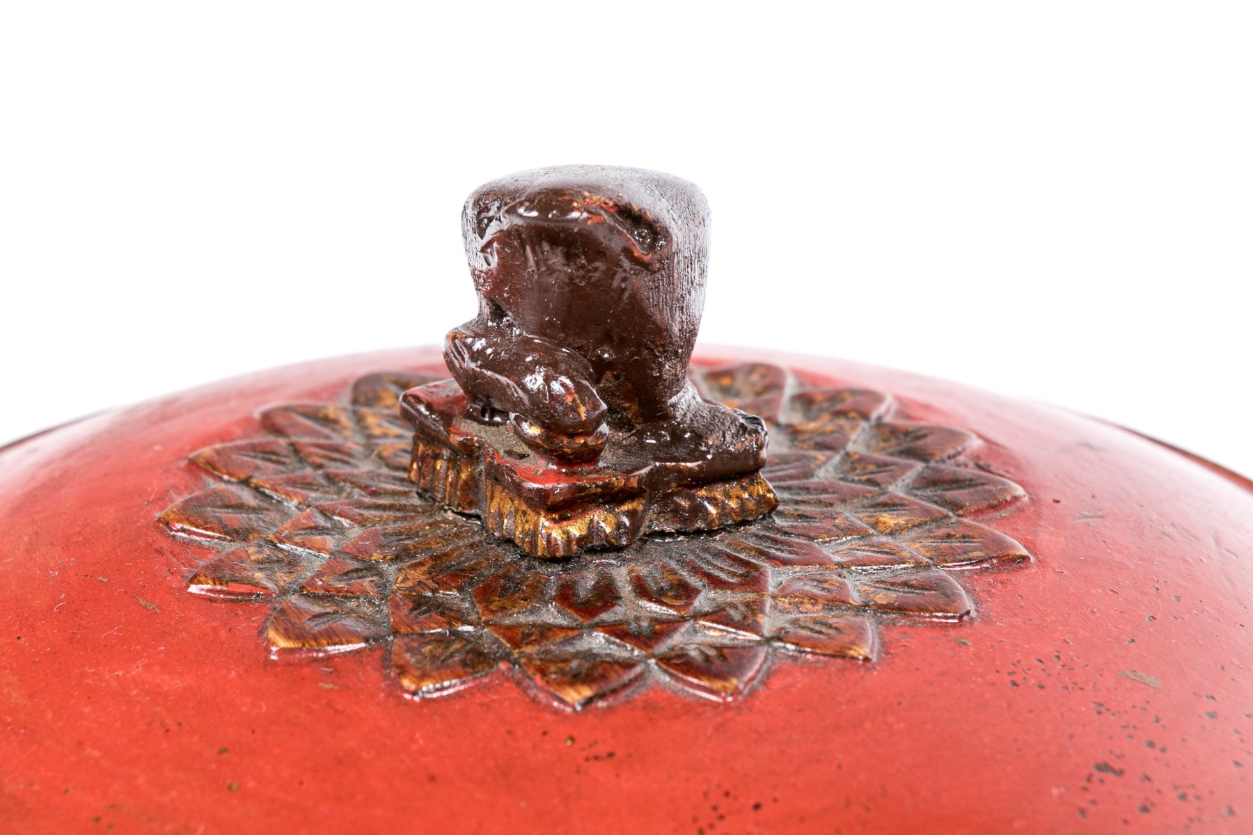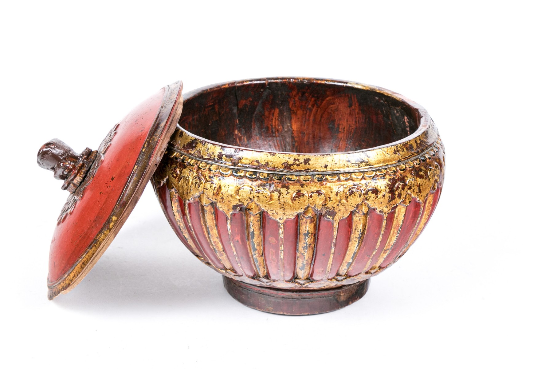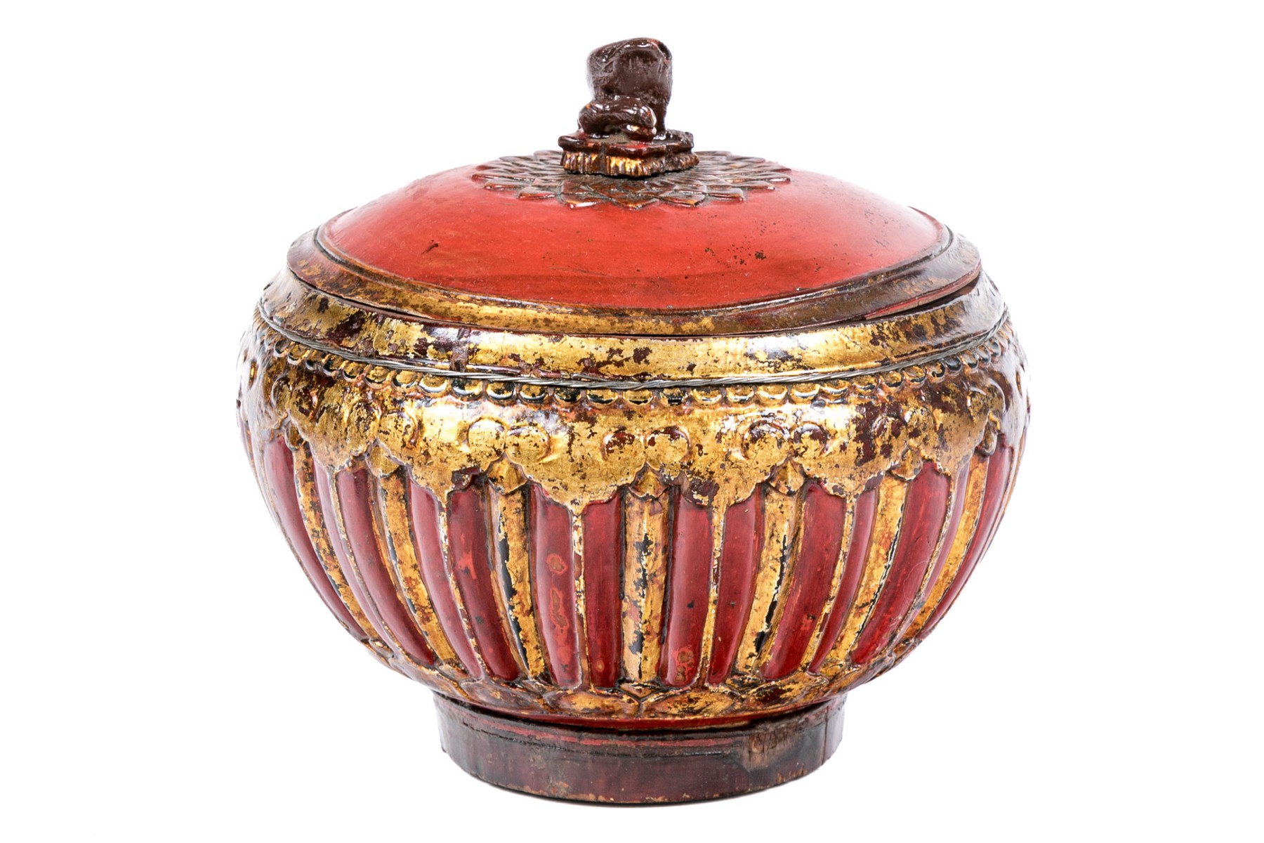 A circular box with red and gilt fluted bowl with gilt leafy top band. Raised on a ring base along with a lid with leafy motif and figural finial.