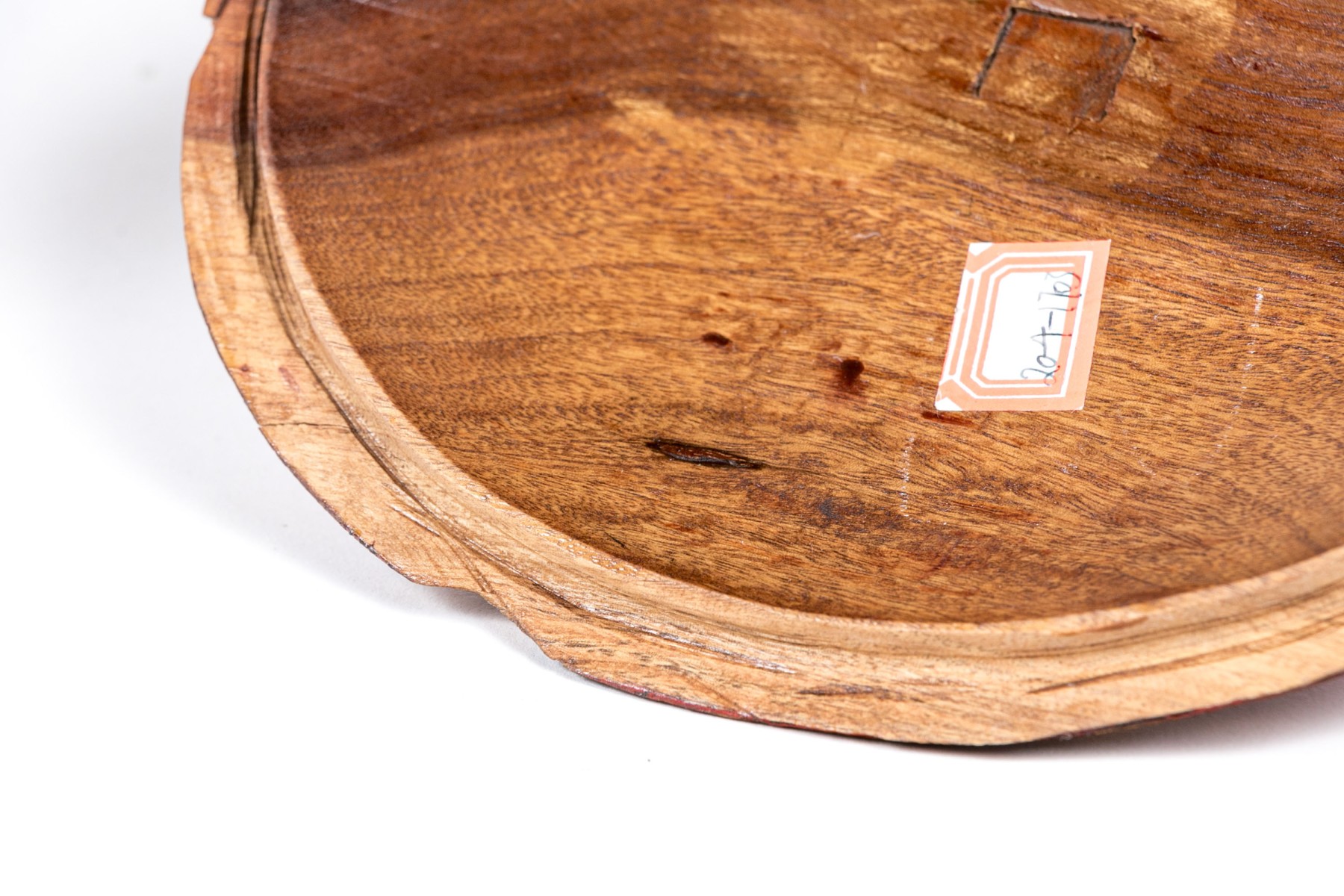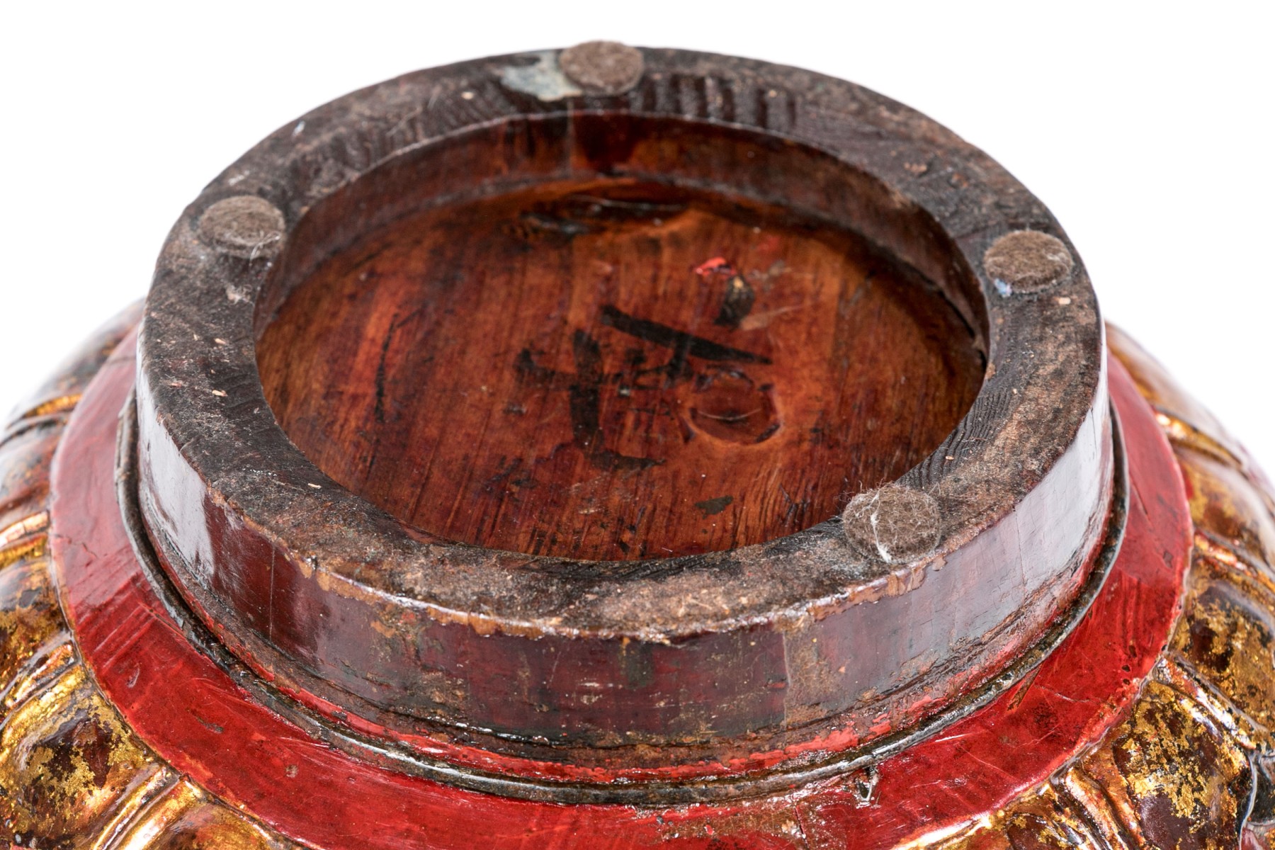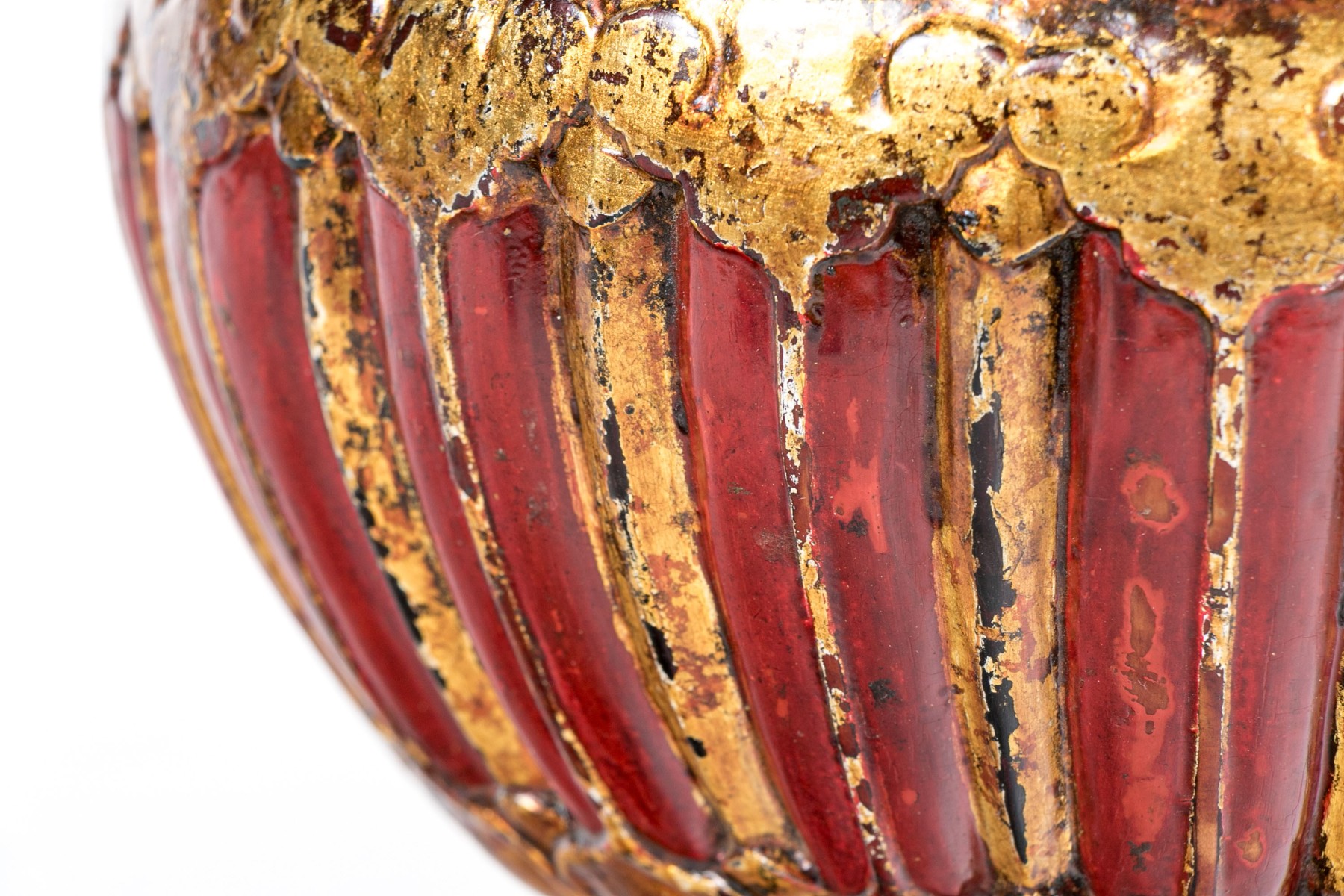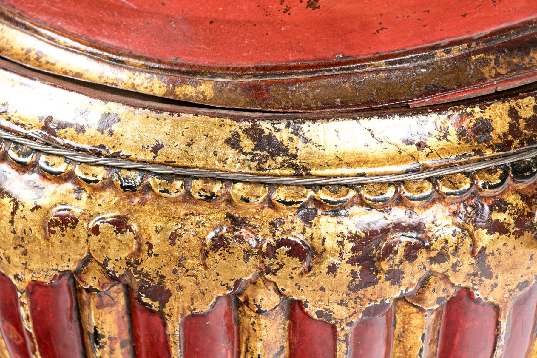 A circular box with red and gilt fluted bowl with gilt leafy top band. Raised on a ring base along with a lid with leafy motif and figural finial.