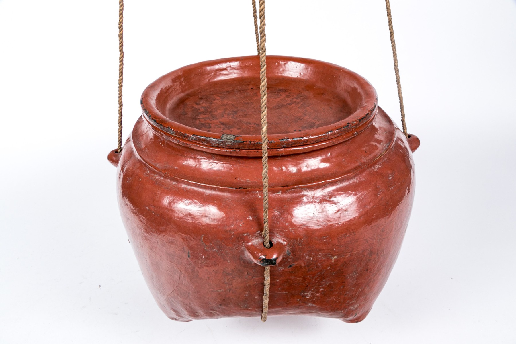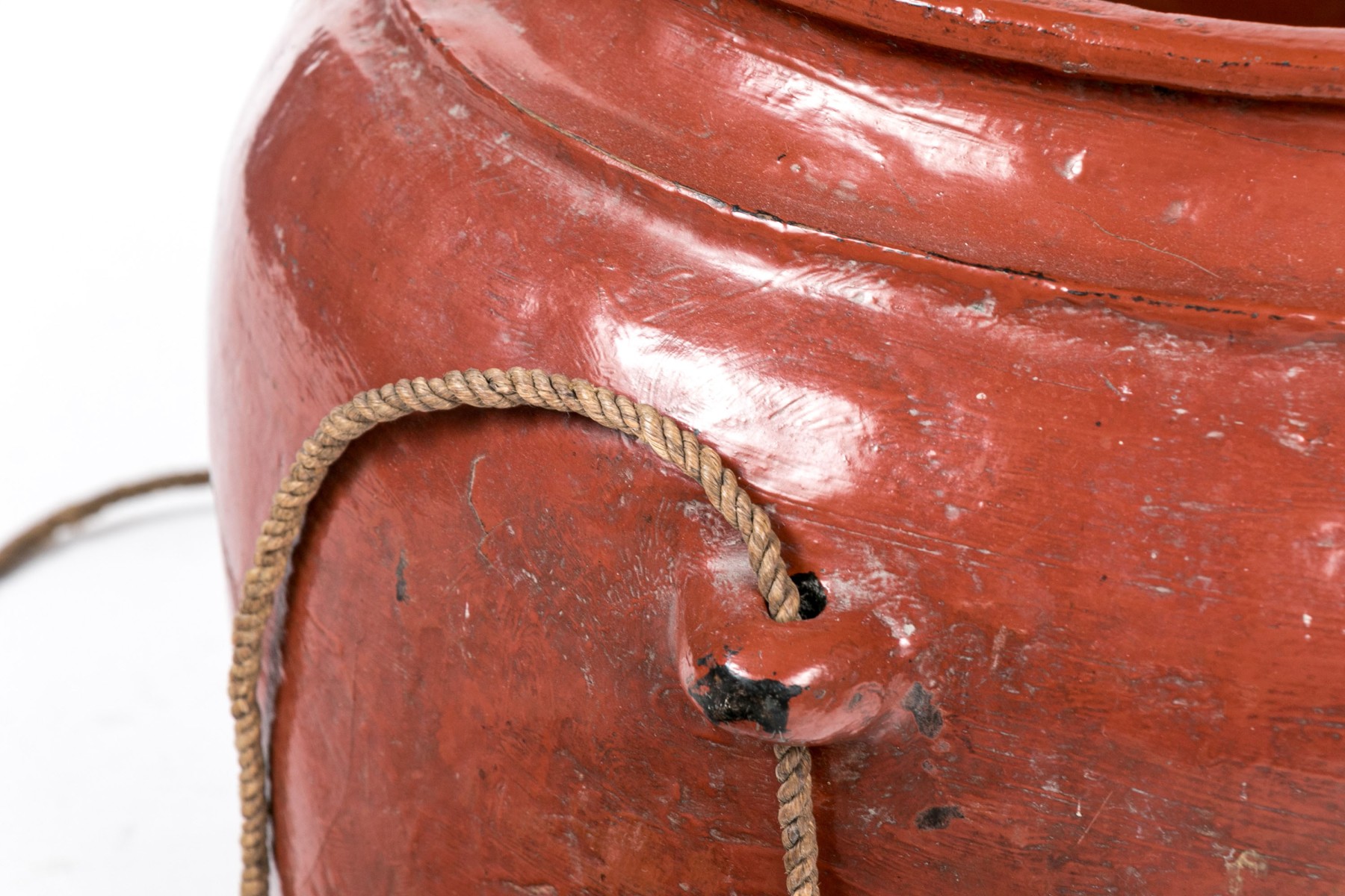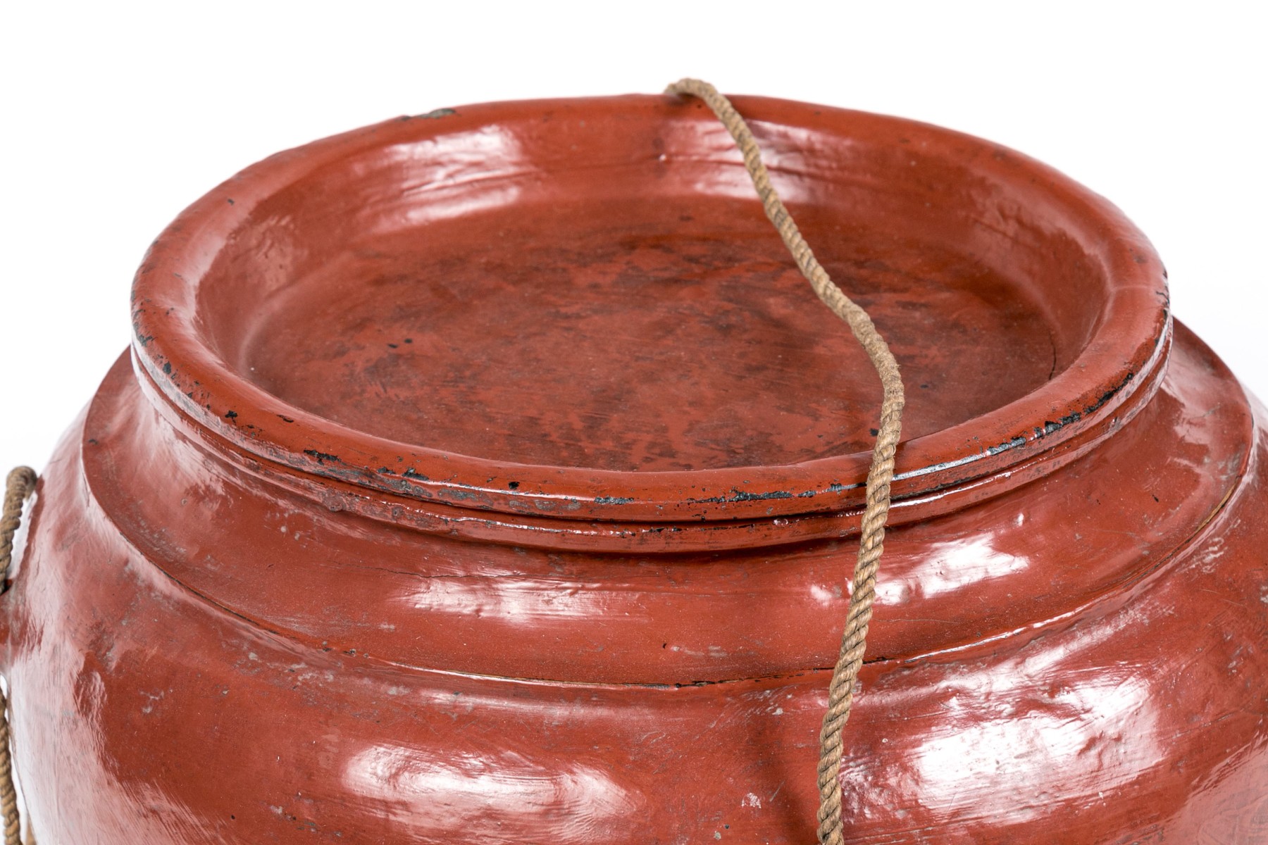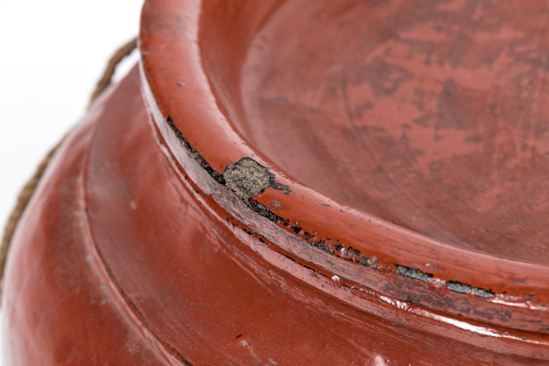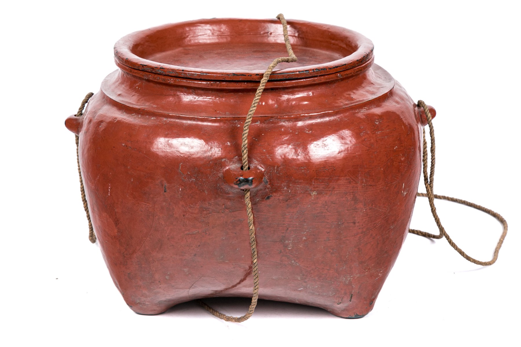 A round footed bowl in reddish brown lacquer, the four lug handles with ropes. With a lid that can be used as a bowl.