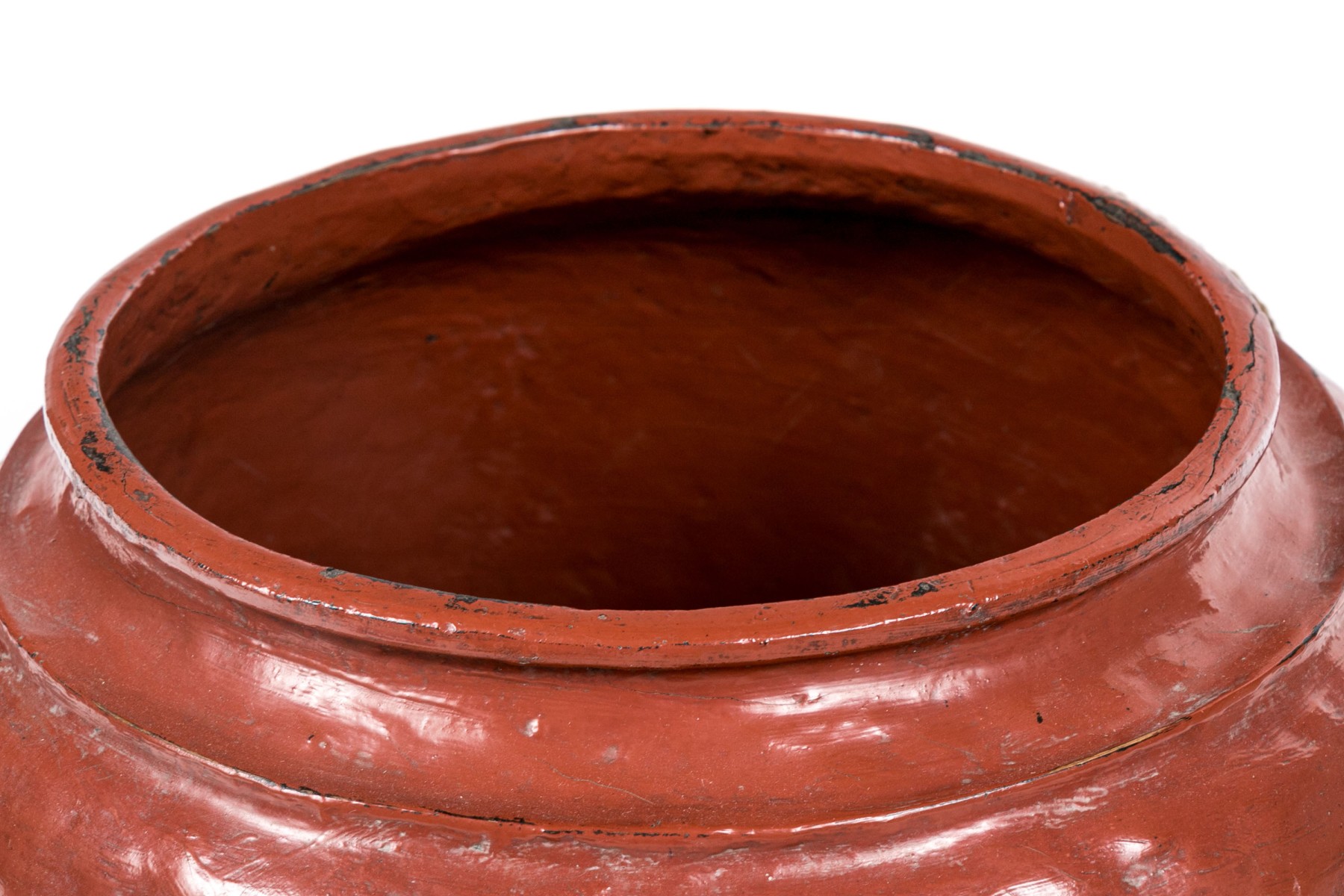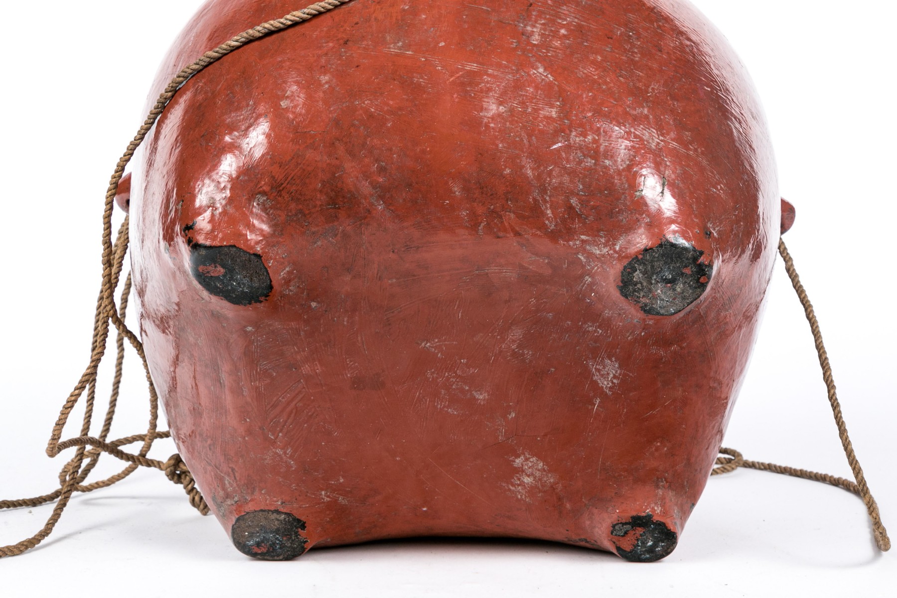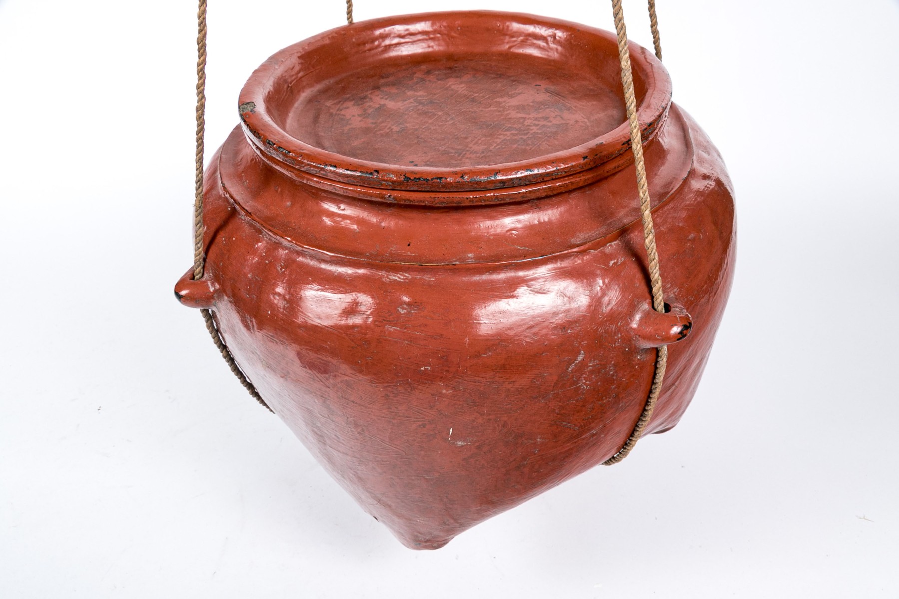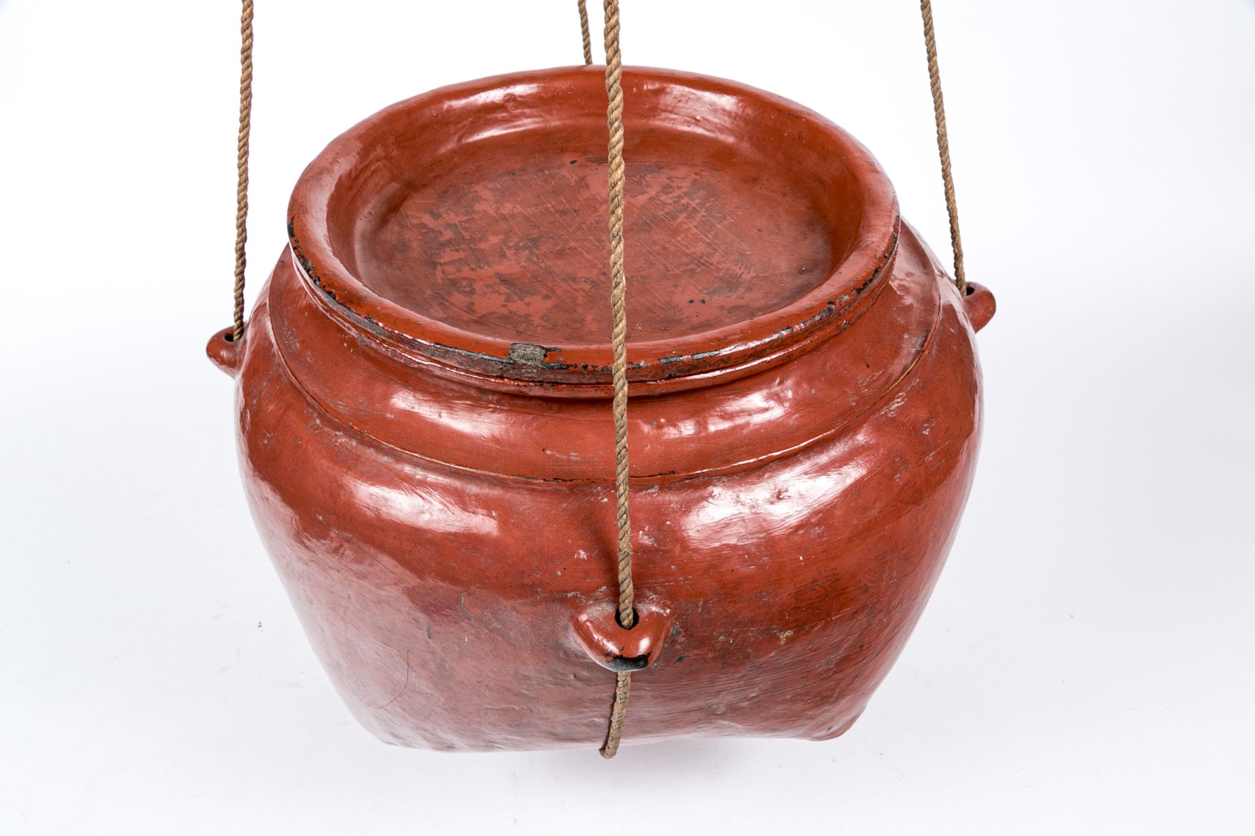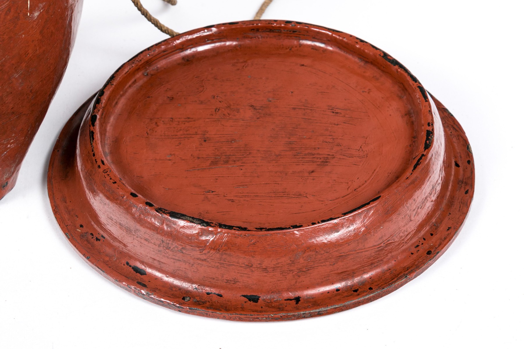 A round footed bowl in reddish brown lacquer, the four lug handles with ropes. With a lid that can be used as a bowl.