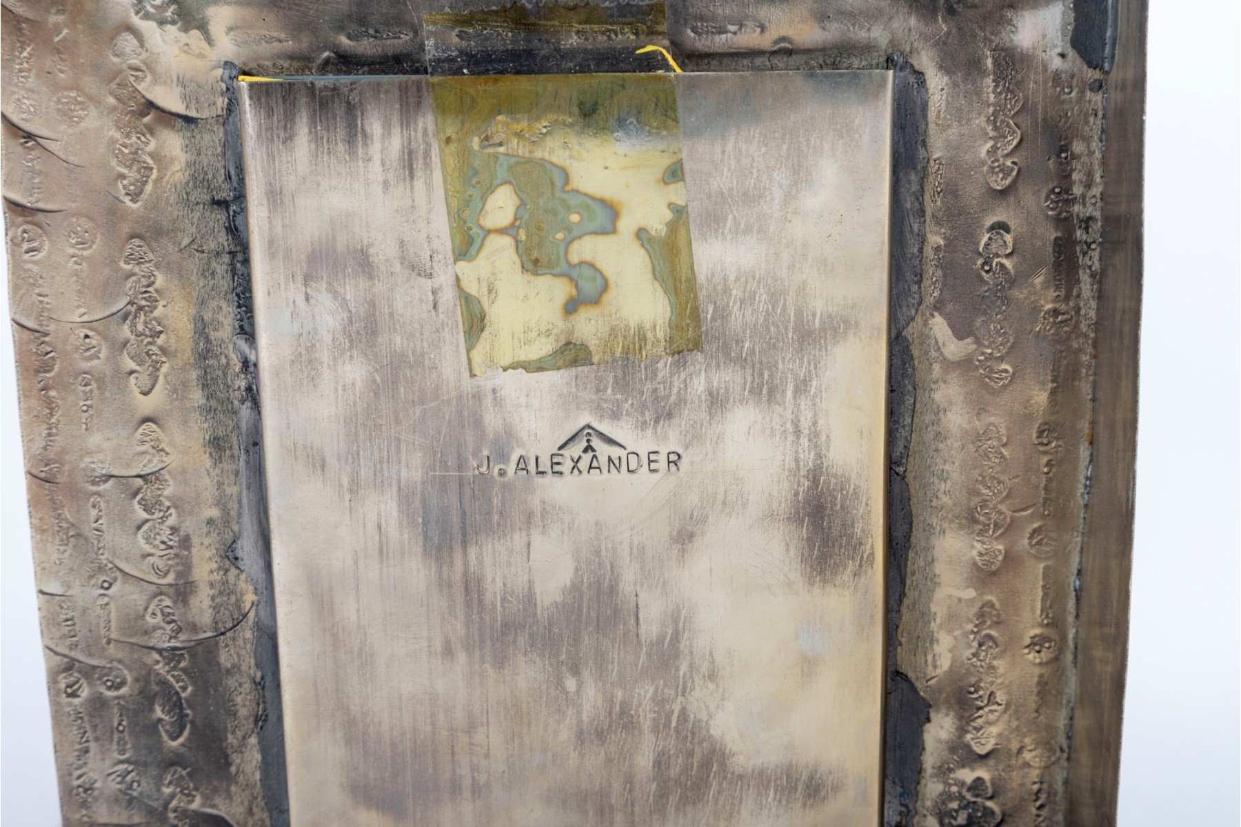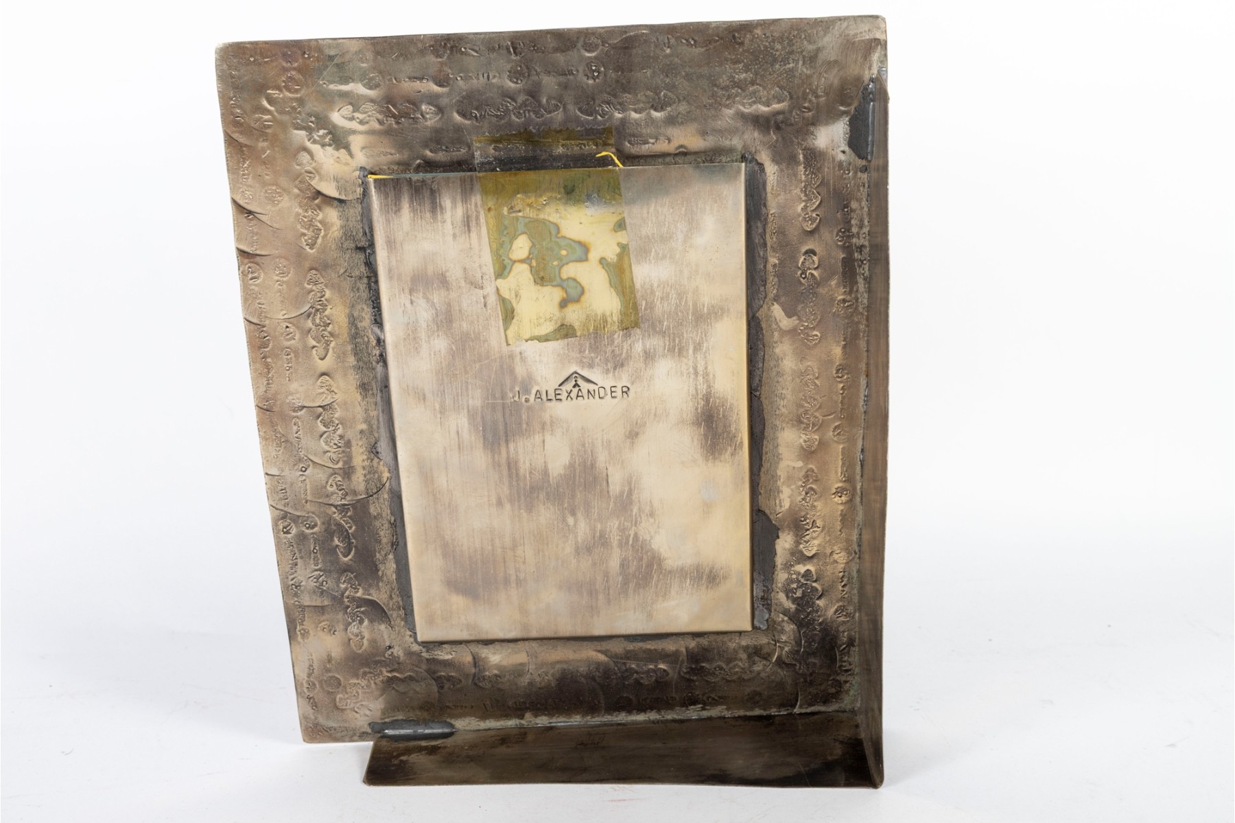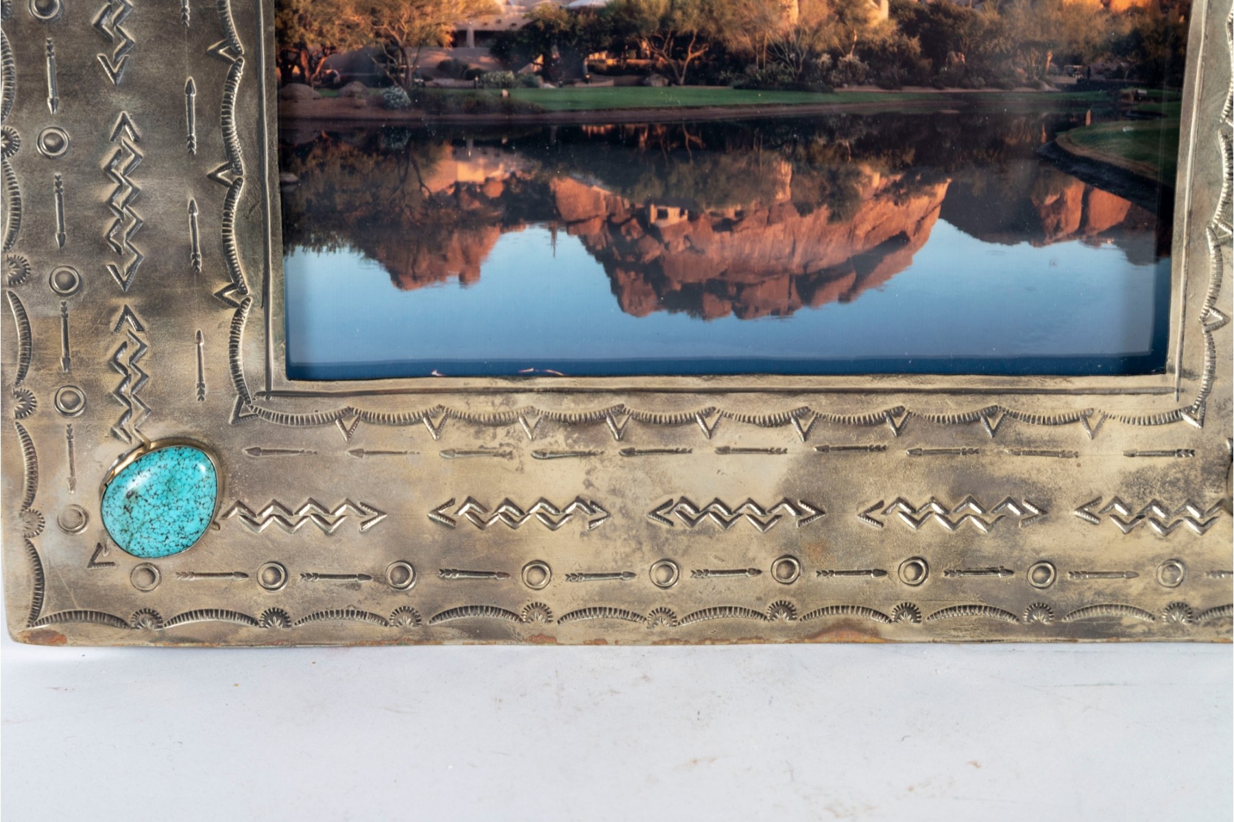 Decorative brass picture frame featuring hand-stamped Southwestern-style geometric patterns and four inset turquoise cabochons, one at each corner. Marked "Alexander" on backside.