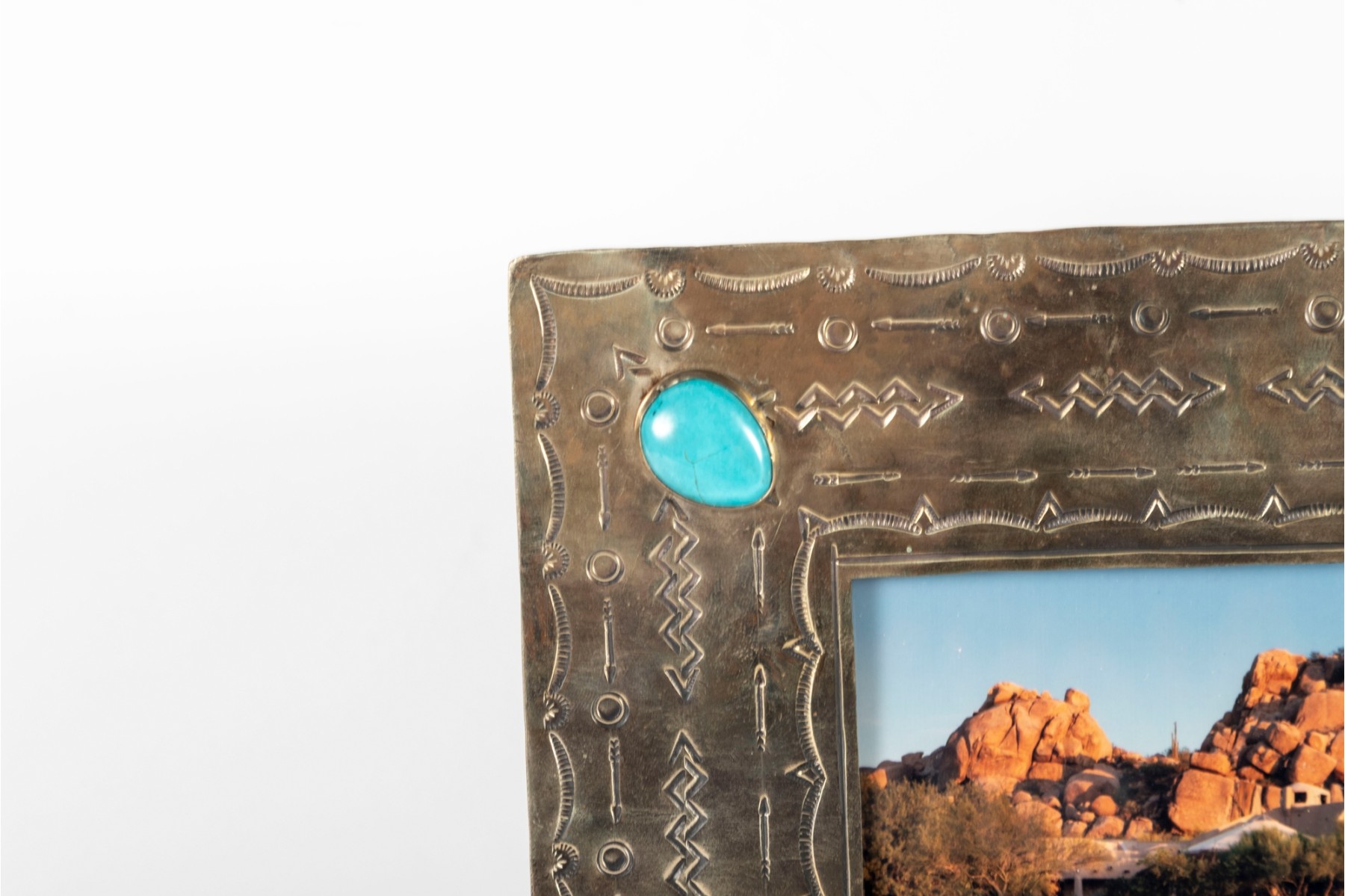 Southwestern Stamped Brass Picture Frame With Turquoise Cabochons