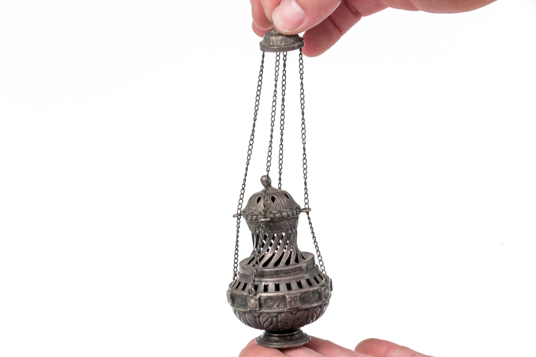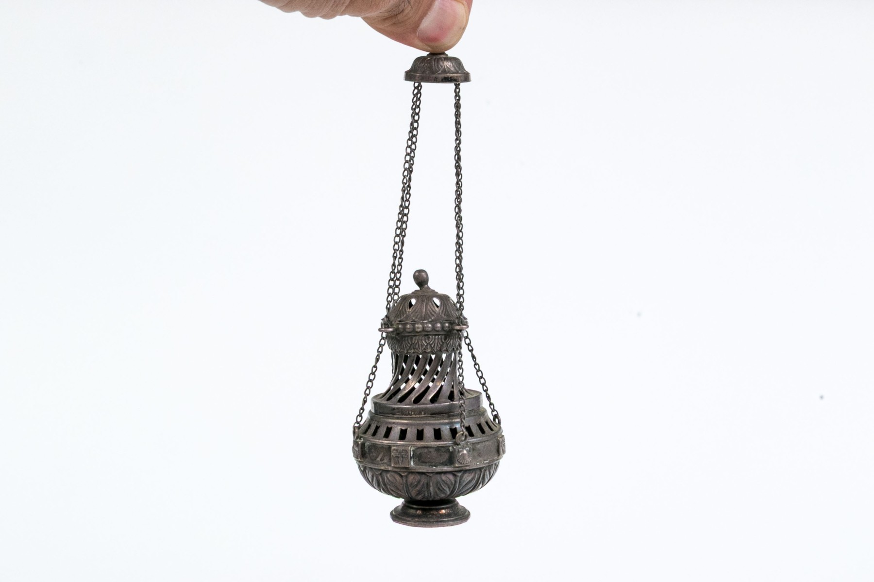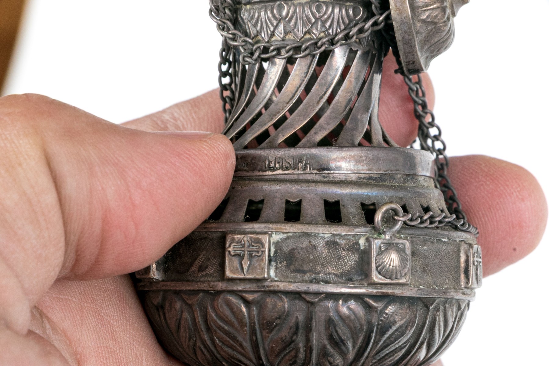 A beautifully detailed Spanish Santiago de Compostela silver souvenir hanging incense burner with a pierced lid on chains atop a bun-shaped lower body with a raise foot. Decoratively pierced throughout and detailed with beautiful foliate repousse. Marked underfoot and around the neck of the body.