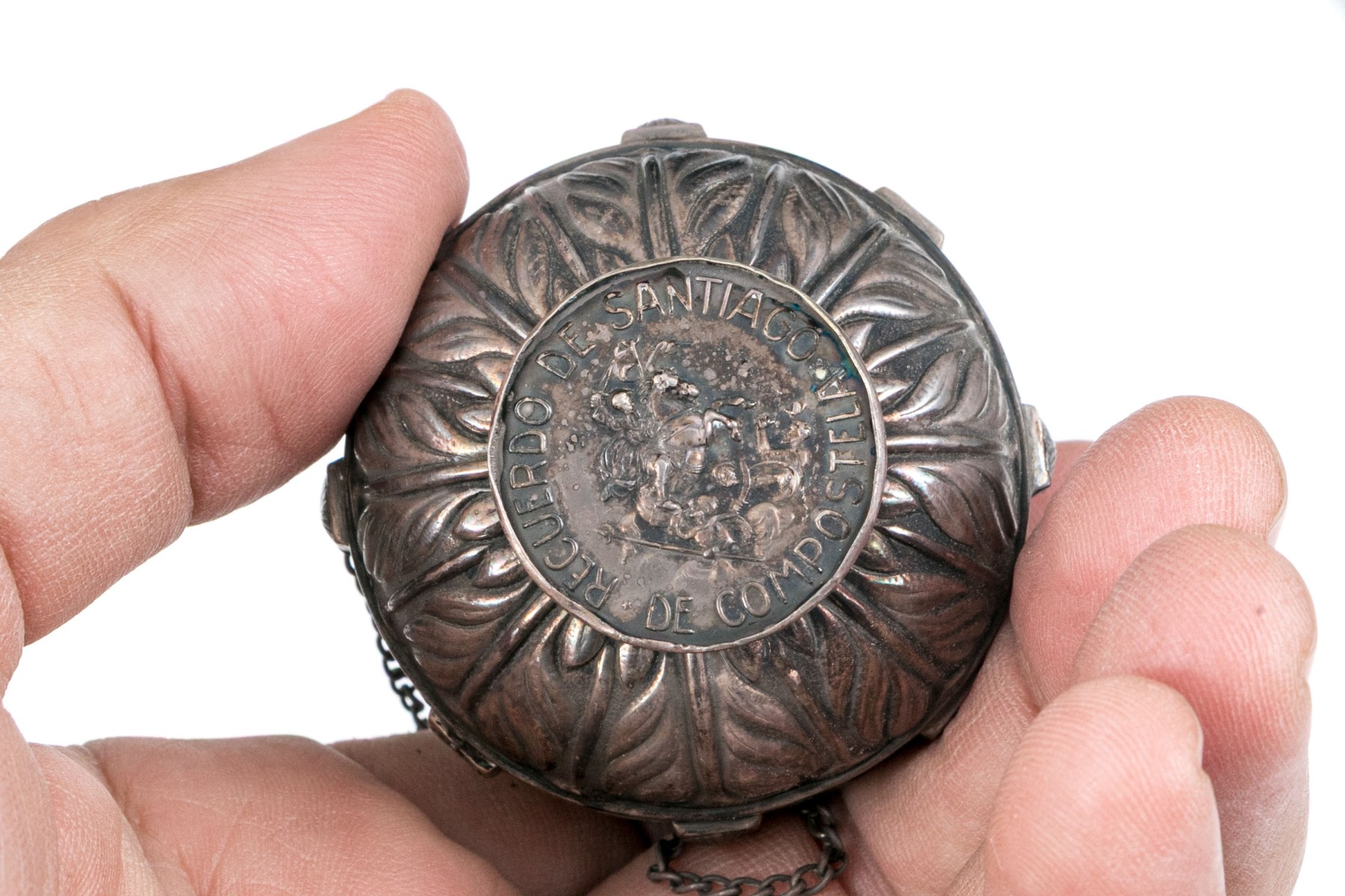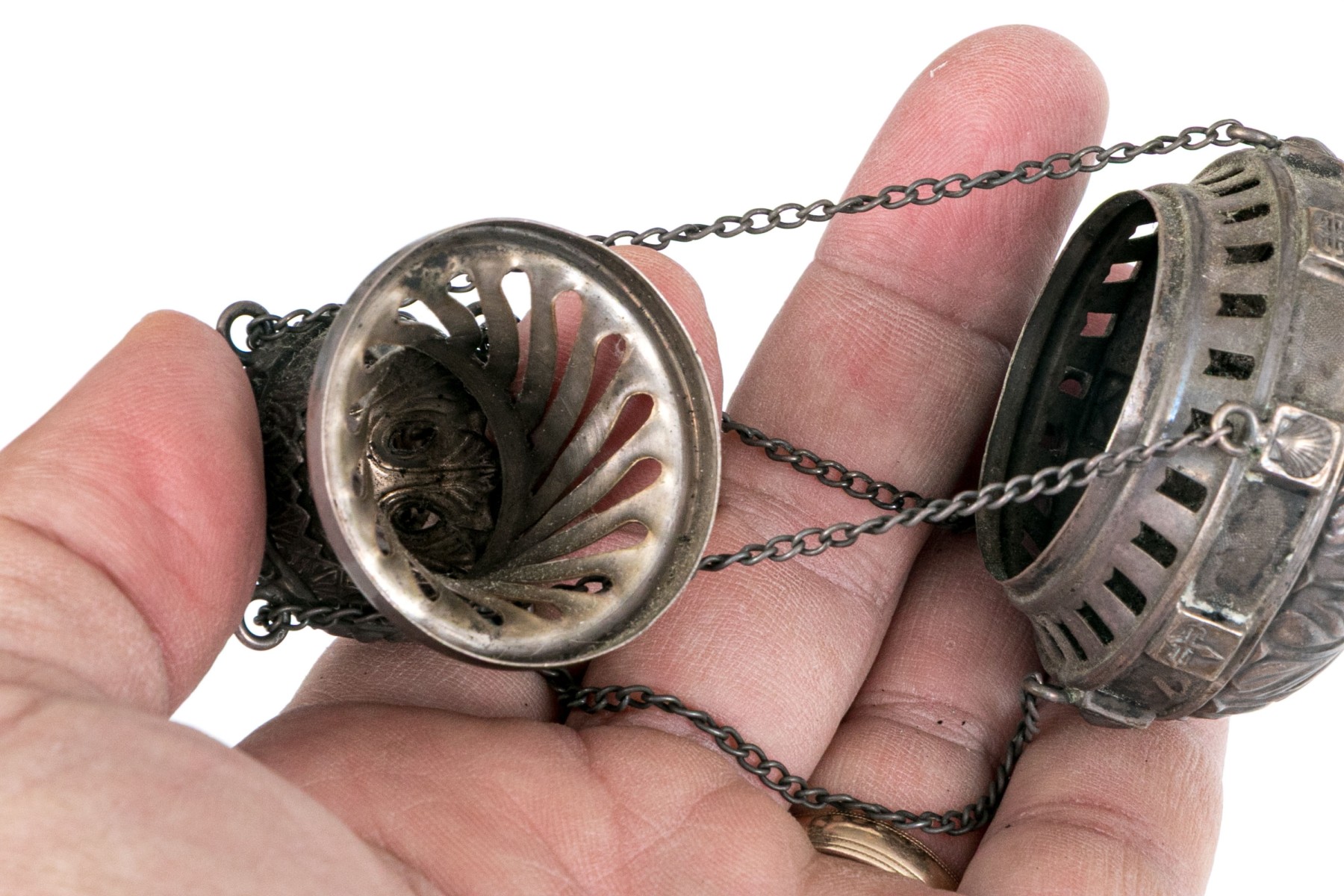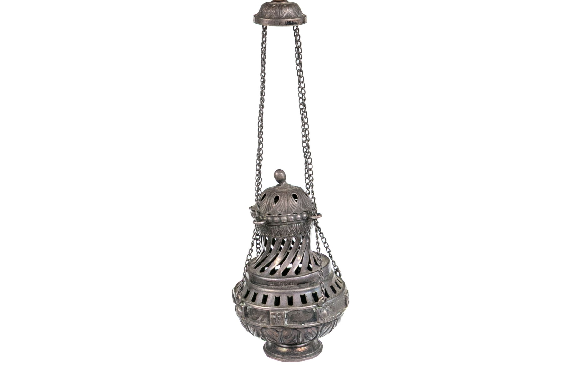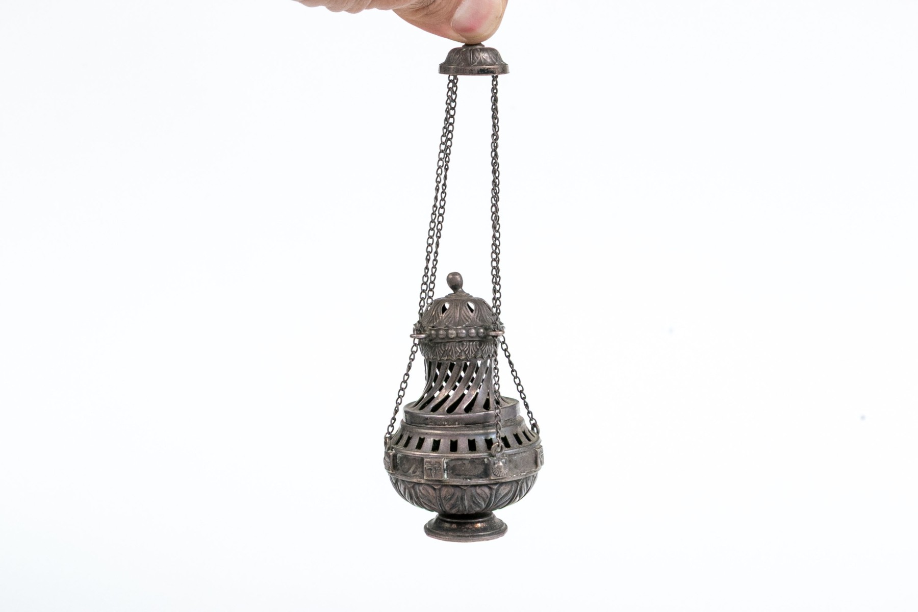 A beautifully detailed Spanish Santiago de Compostela silver souvenir hanging incense burner with a pierced lid on chains atop a bun-shaped lower body with a raise foot. Decoratively pierced throughout and detailed with beautiful foliate repousse. Marked underfoot and around the neck of the body.