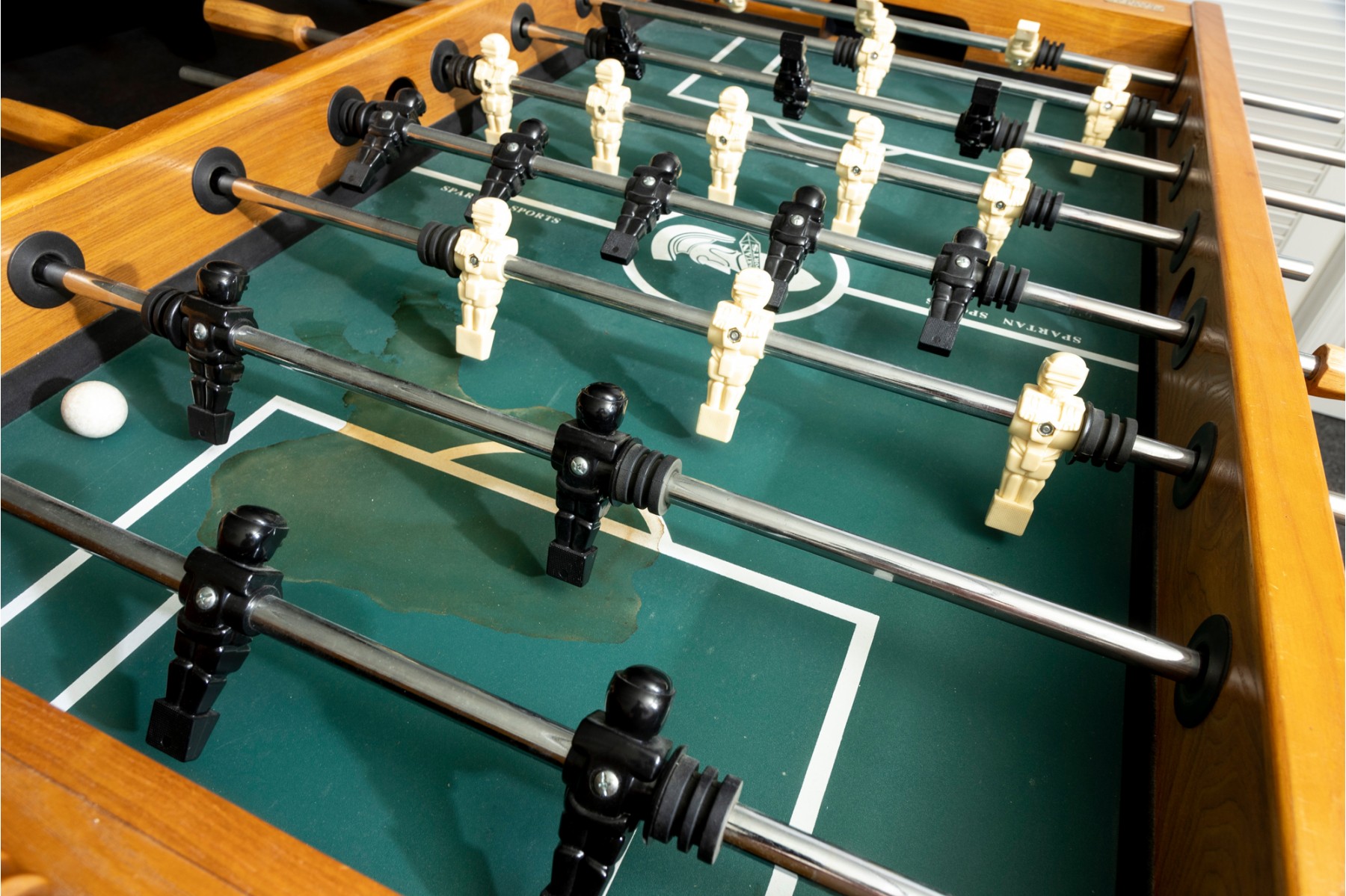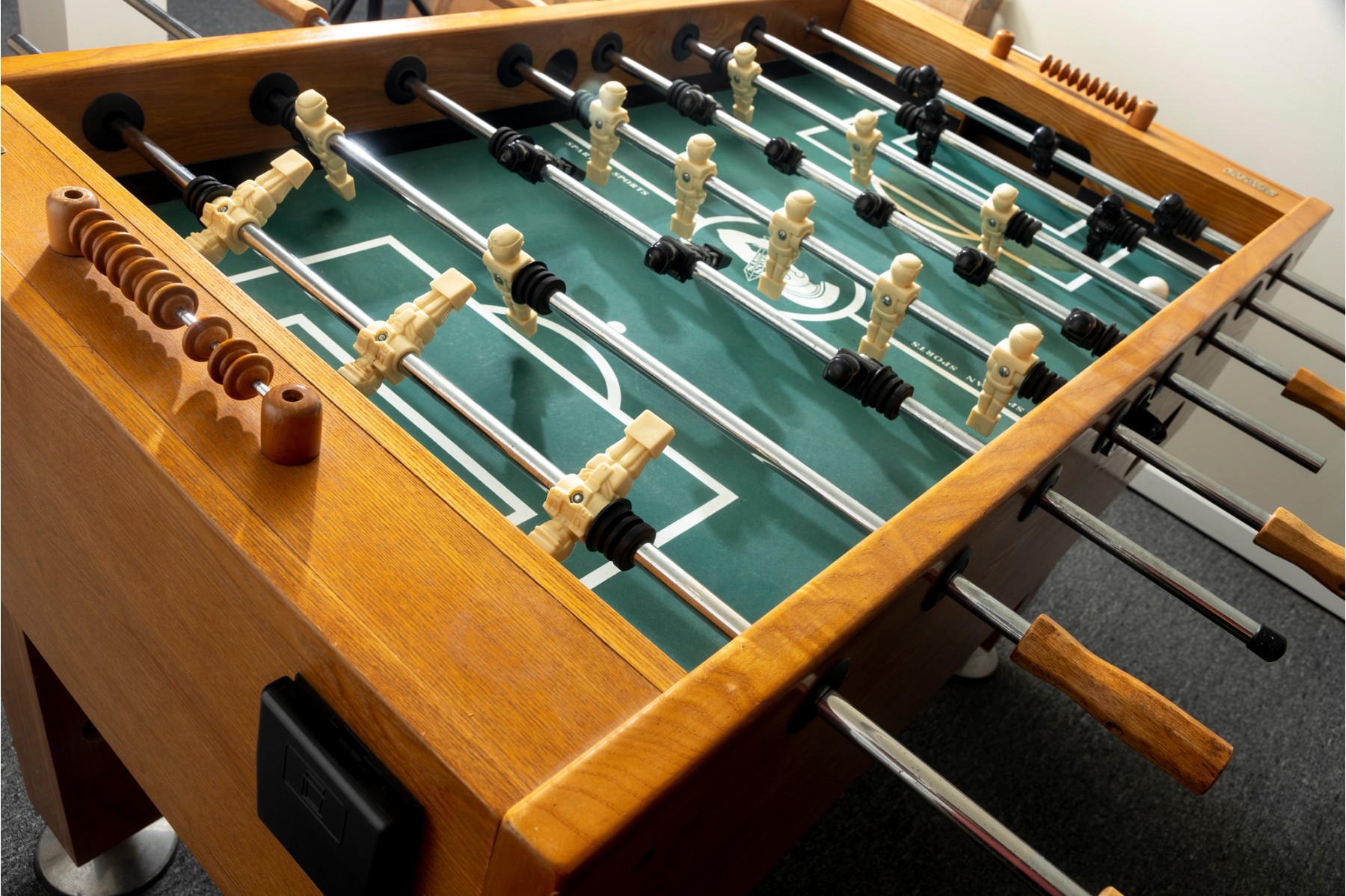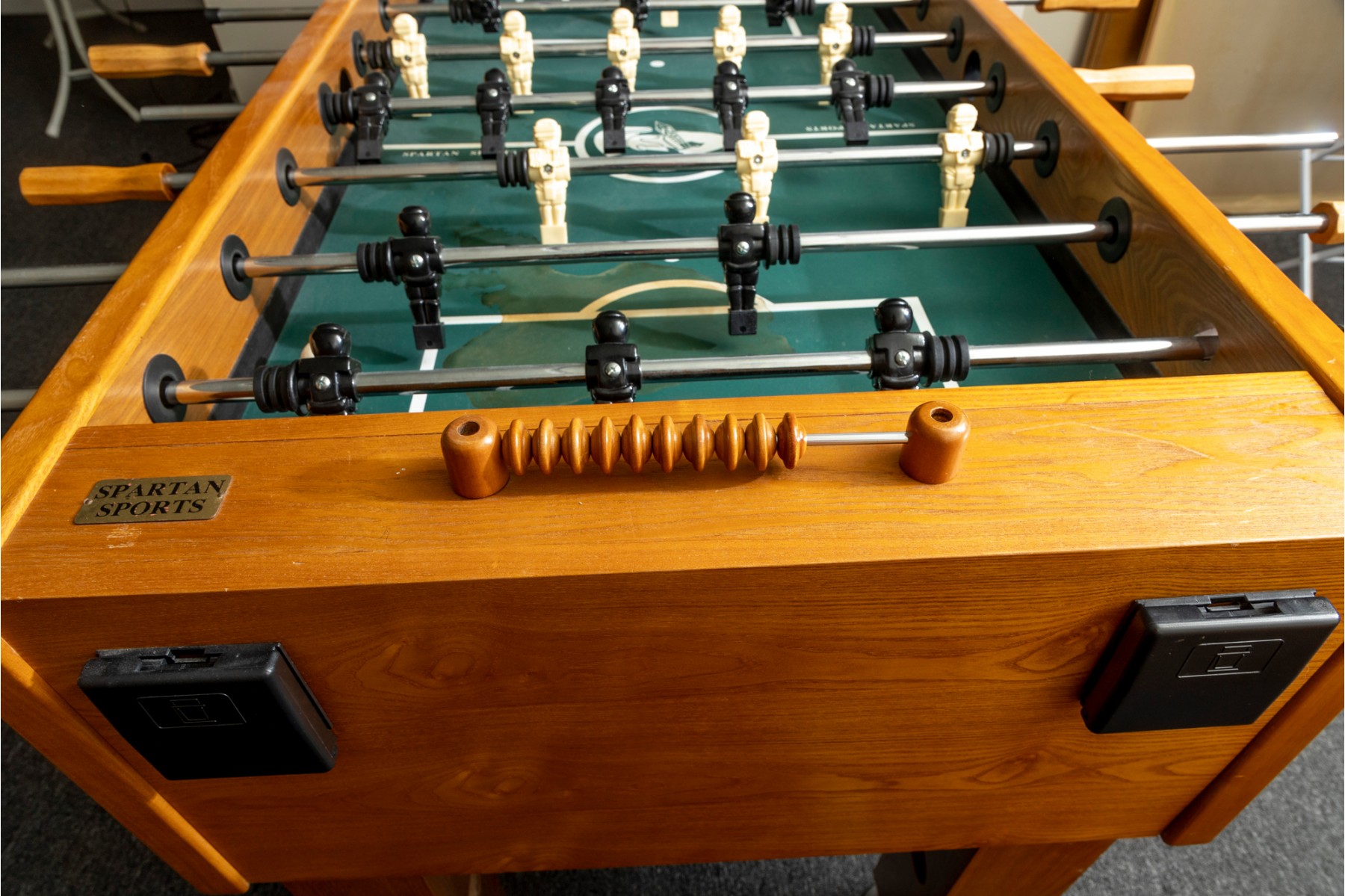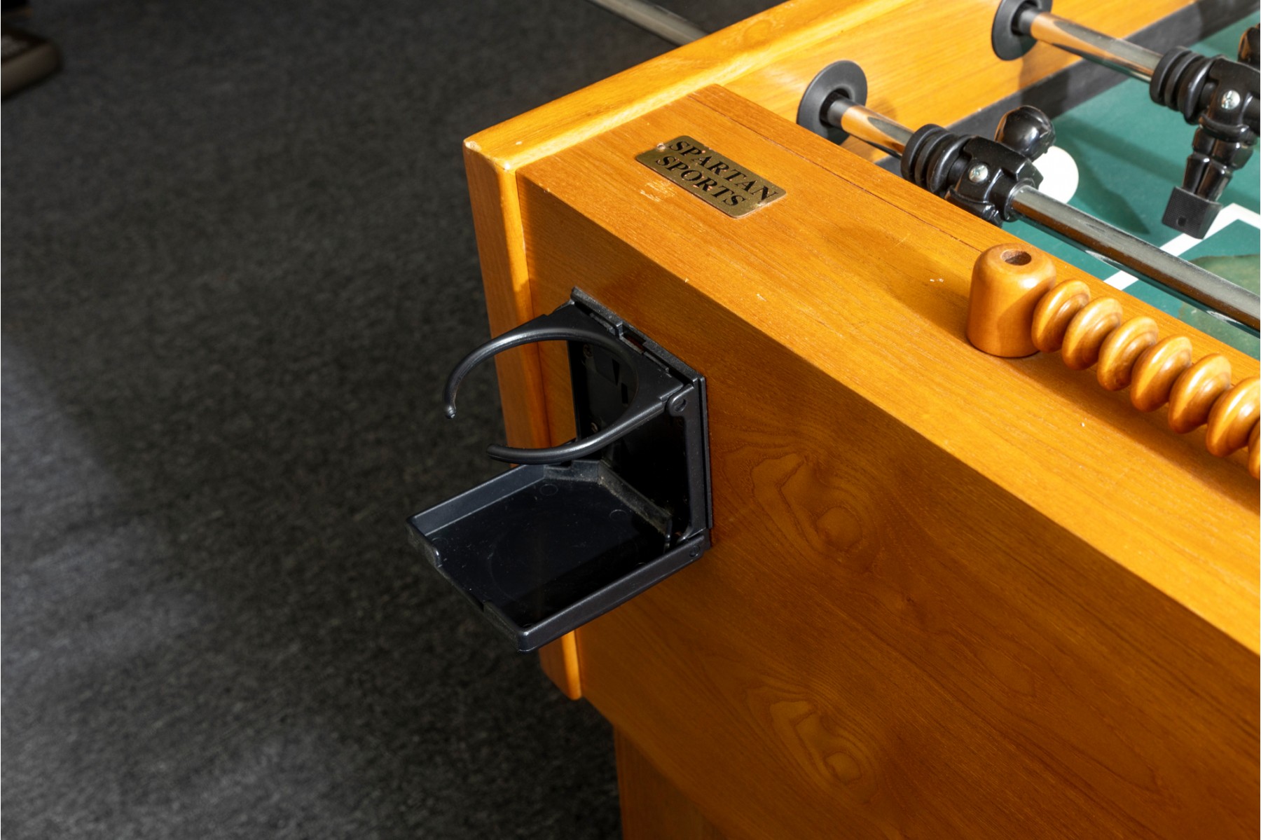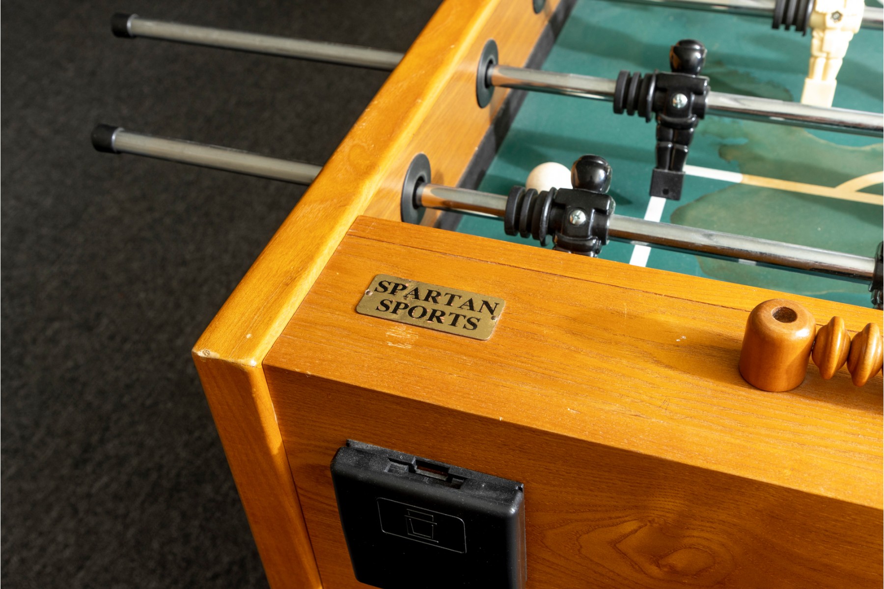 This Spartan Sport foosball table offers hours of family fun. It has a wooden case, black and white men and adjustable feet so that you can balance the table.