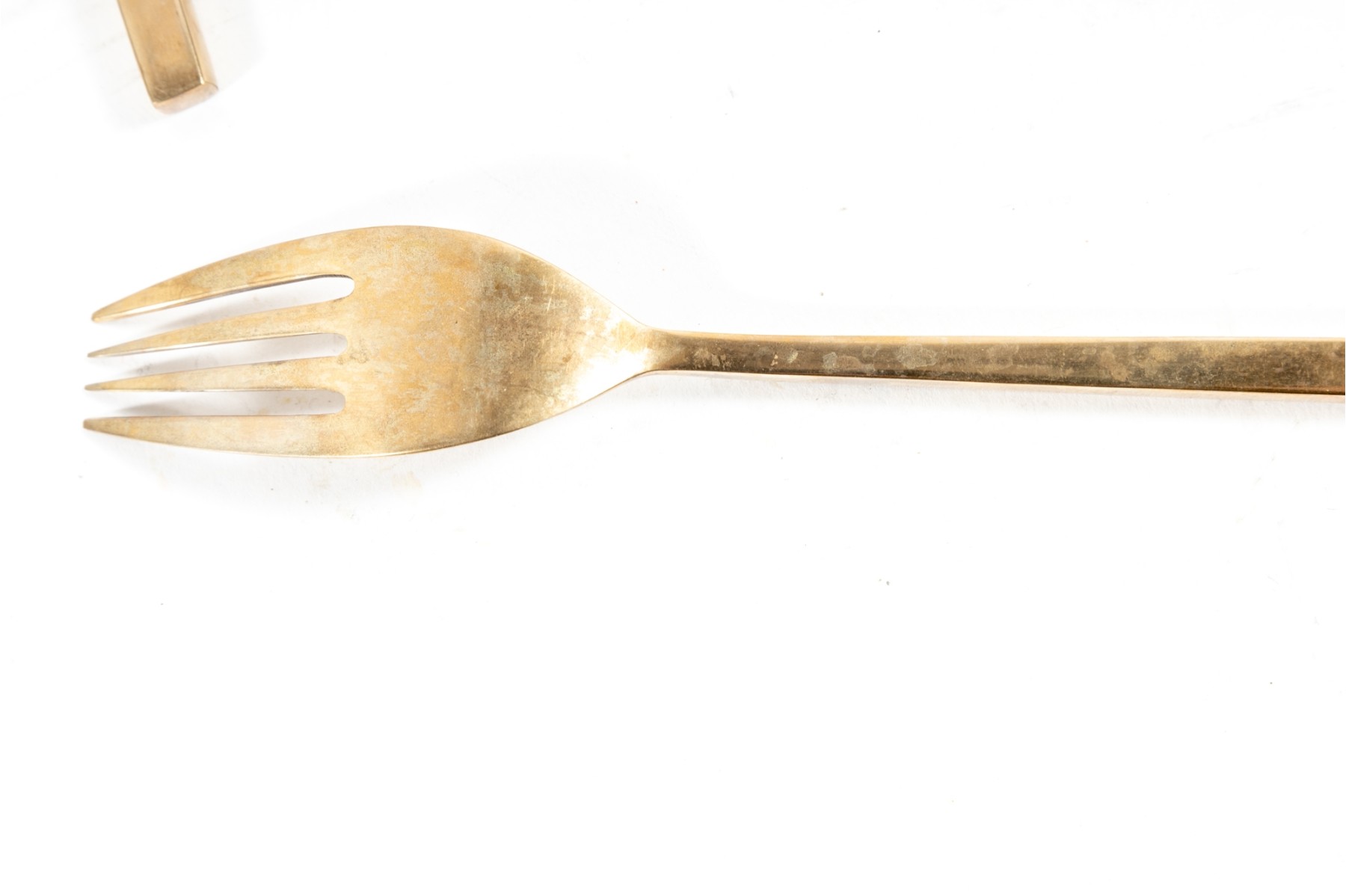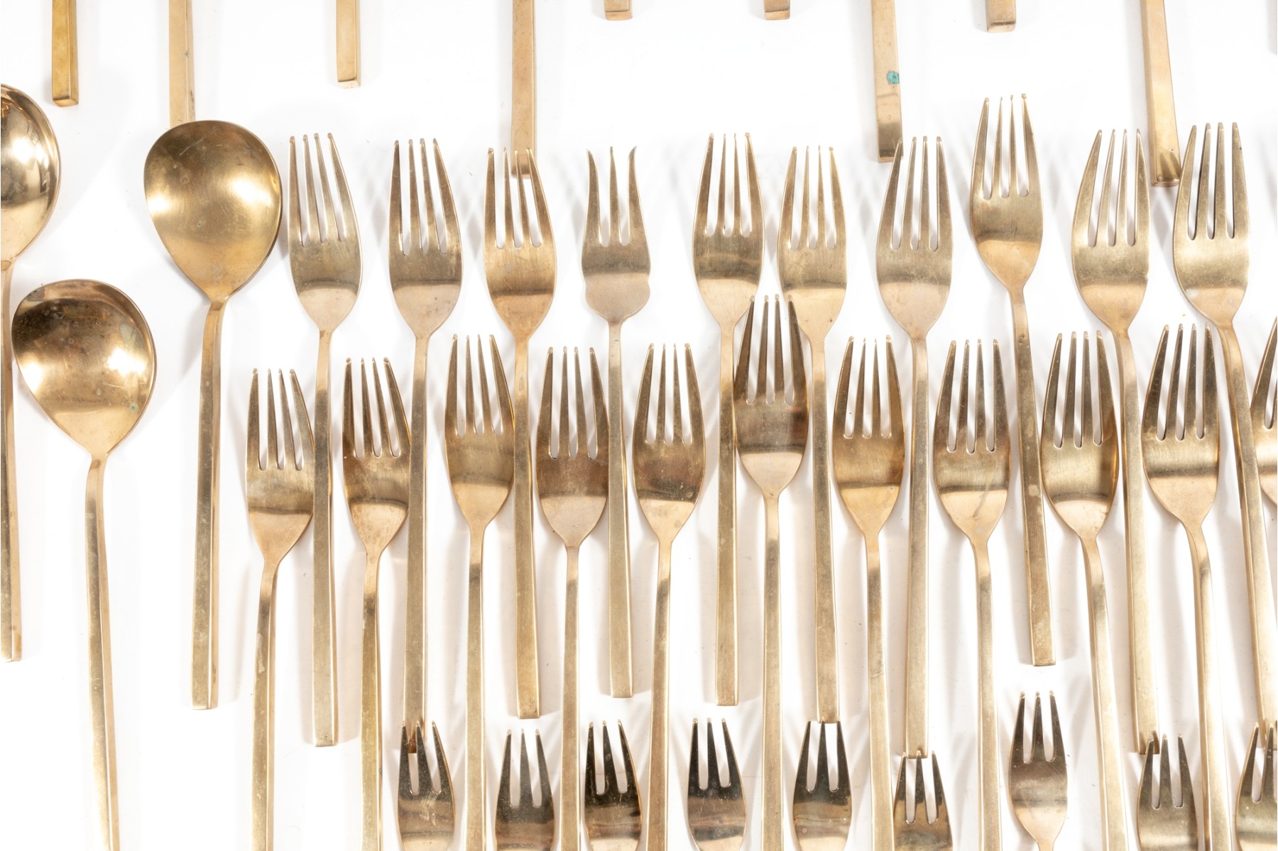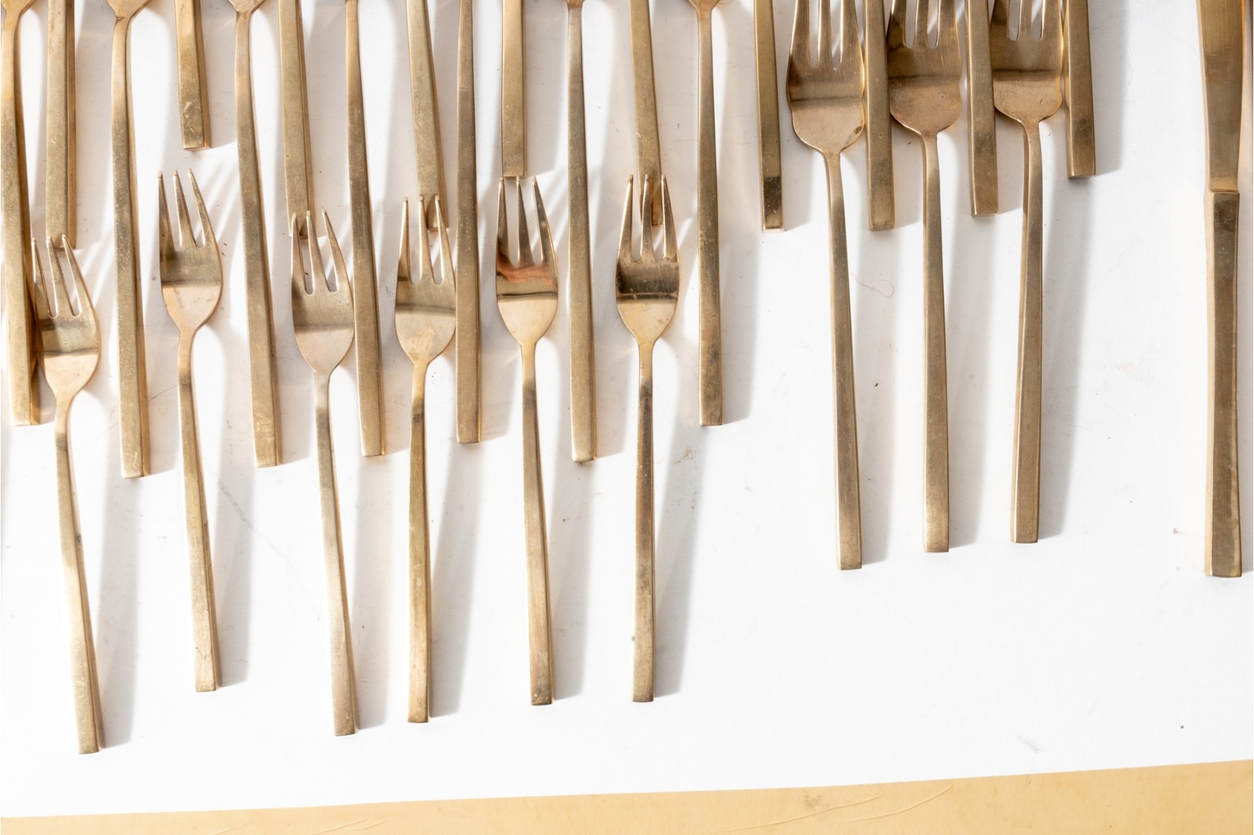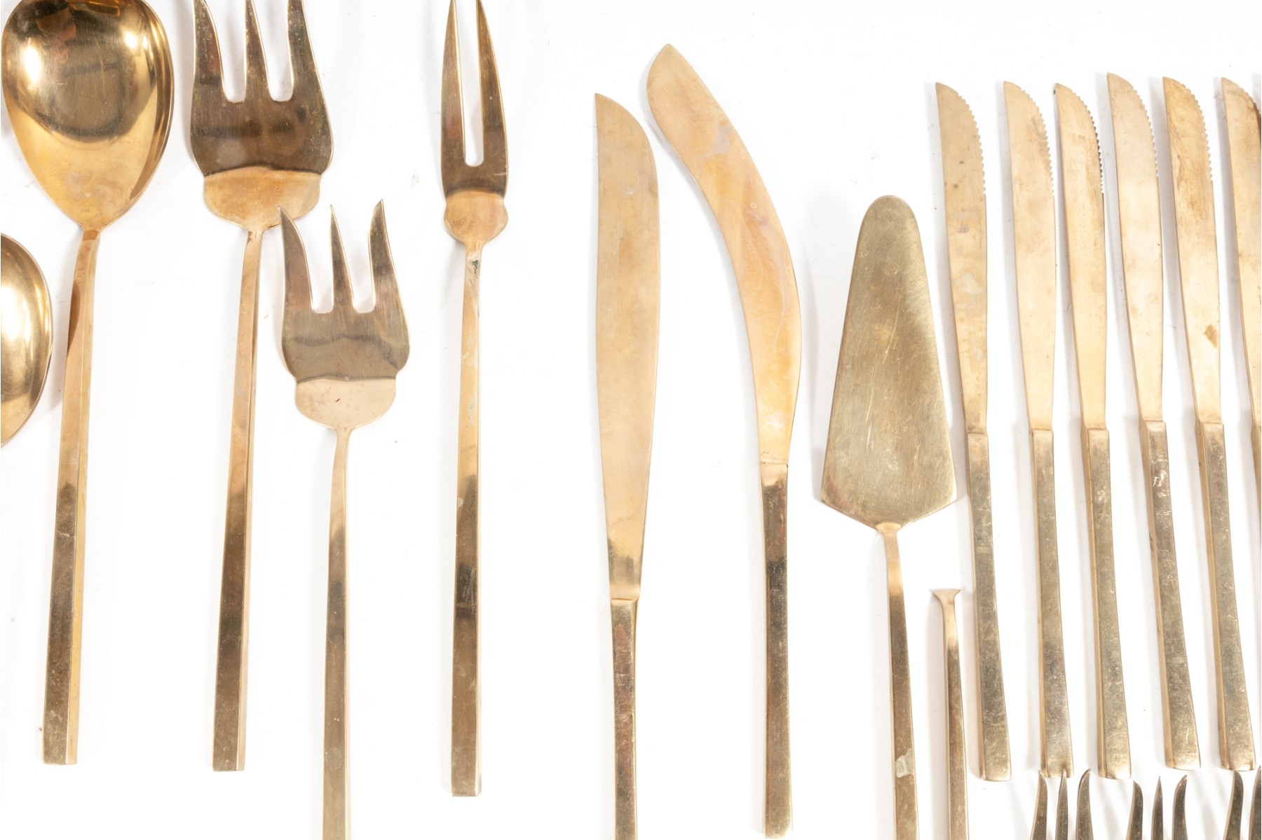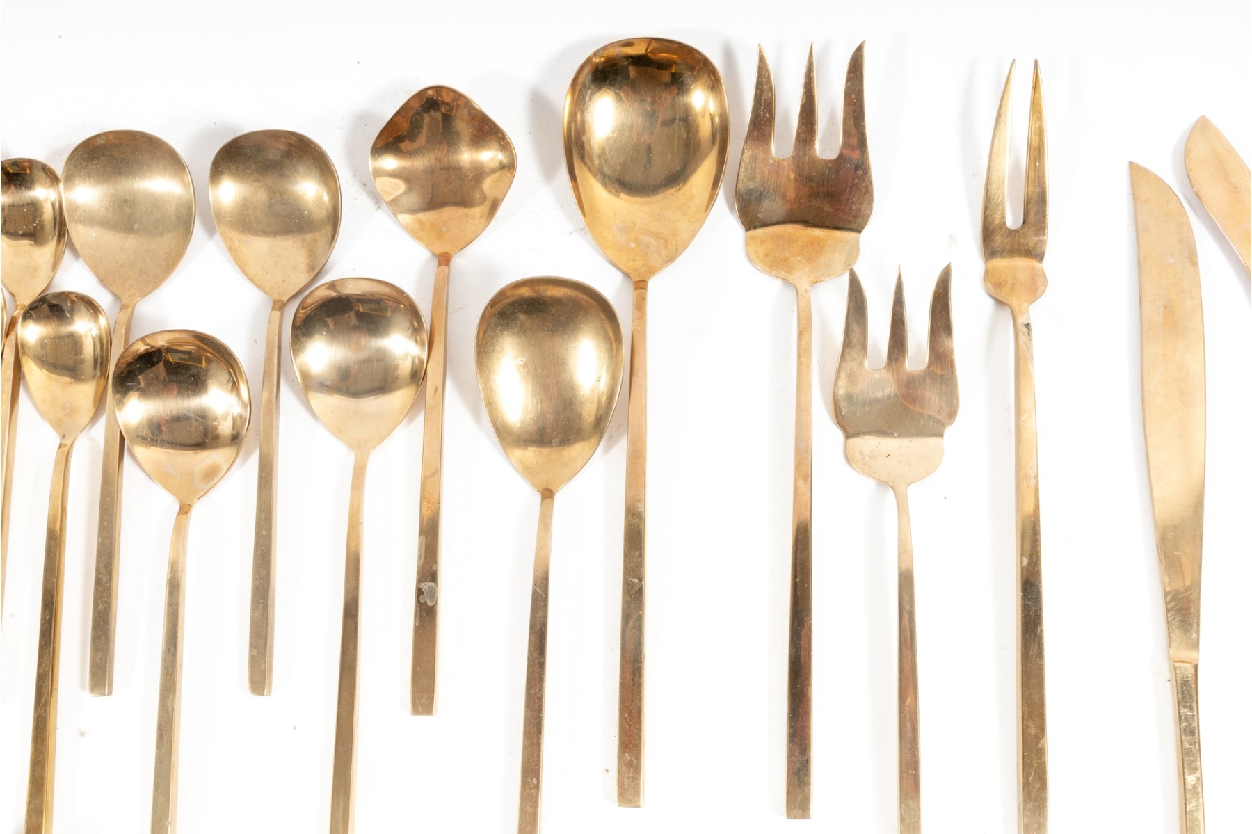 A collection of solid brass flatware ranging from cheese knives, spoons, forks and more. Please refer to photos for details and contents.