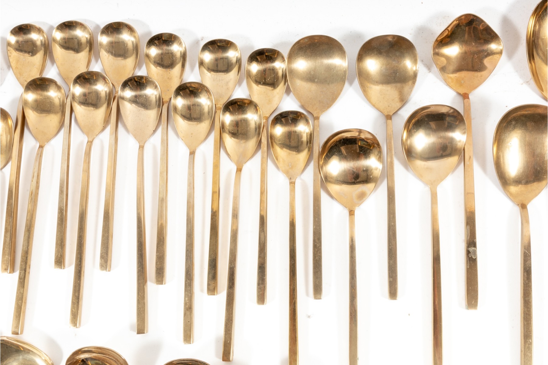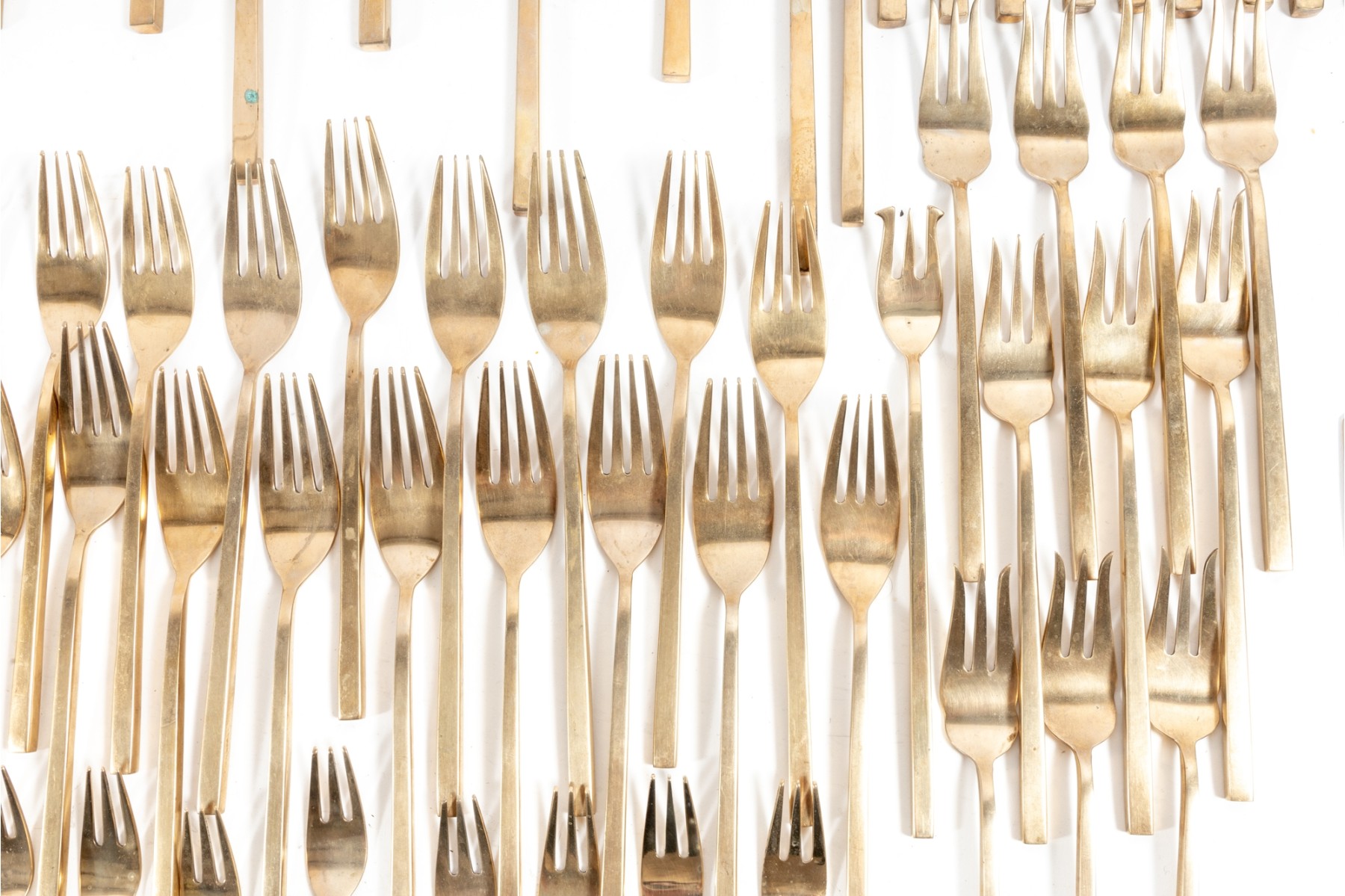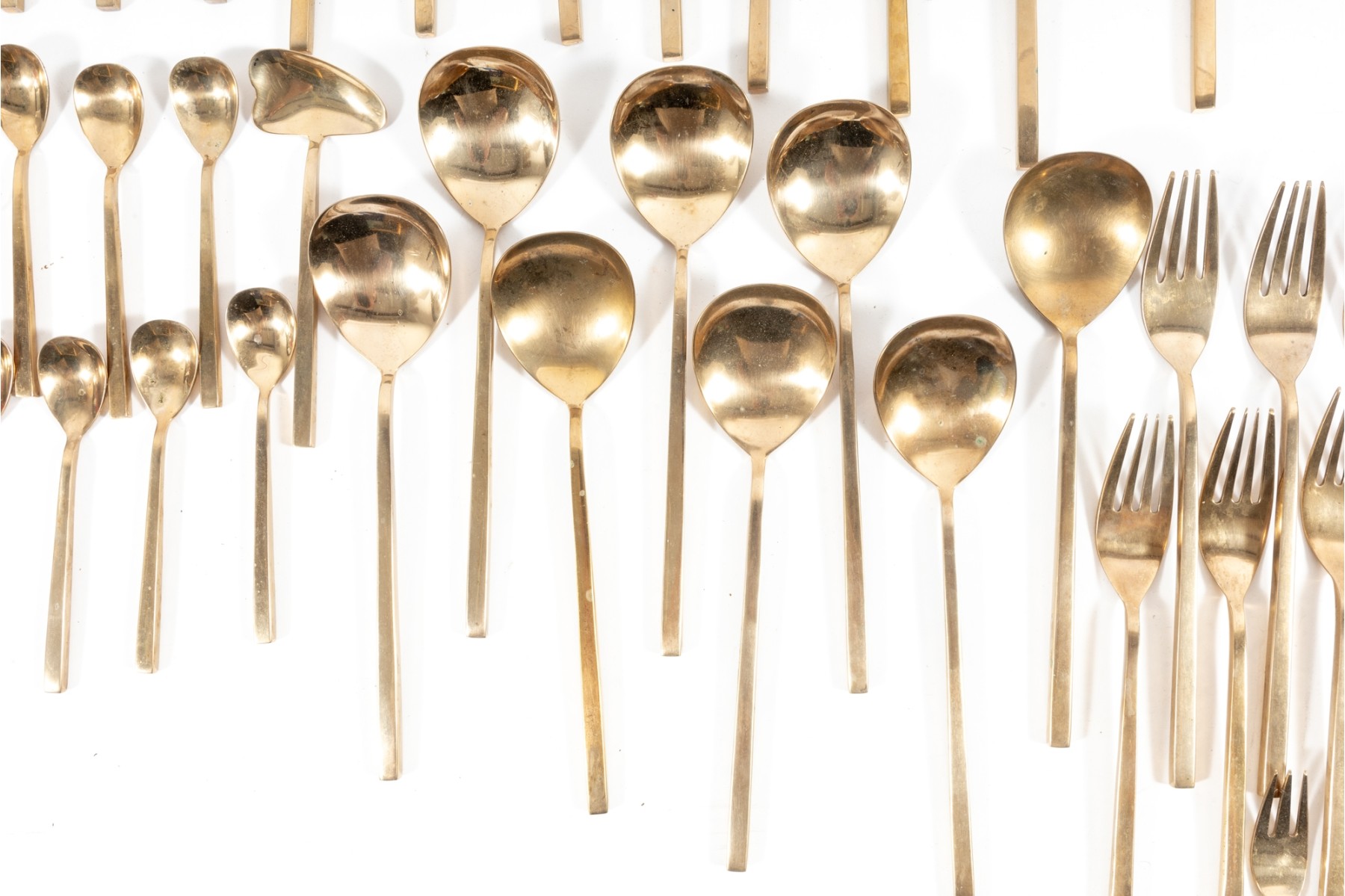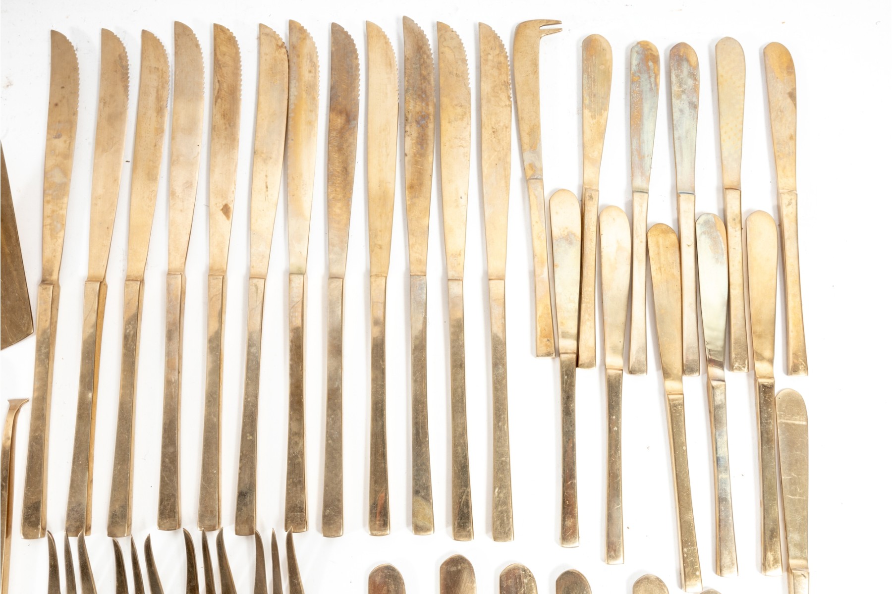 A collection of solid brass flatware ranging from cheese knives, spoons, forks and more. Please refer to photos for details and contents.