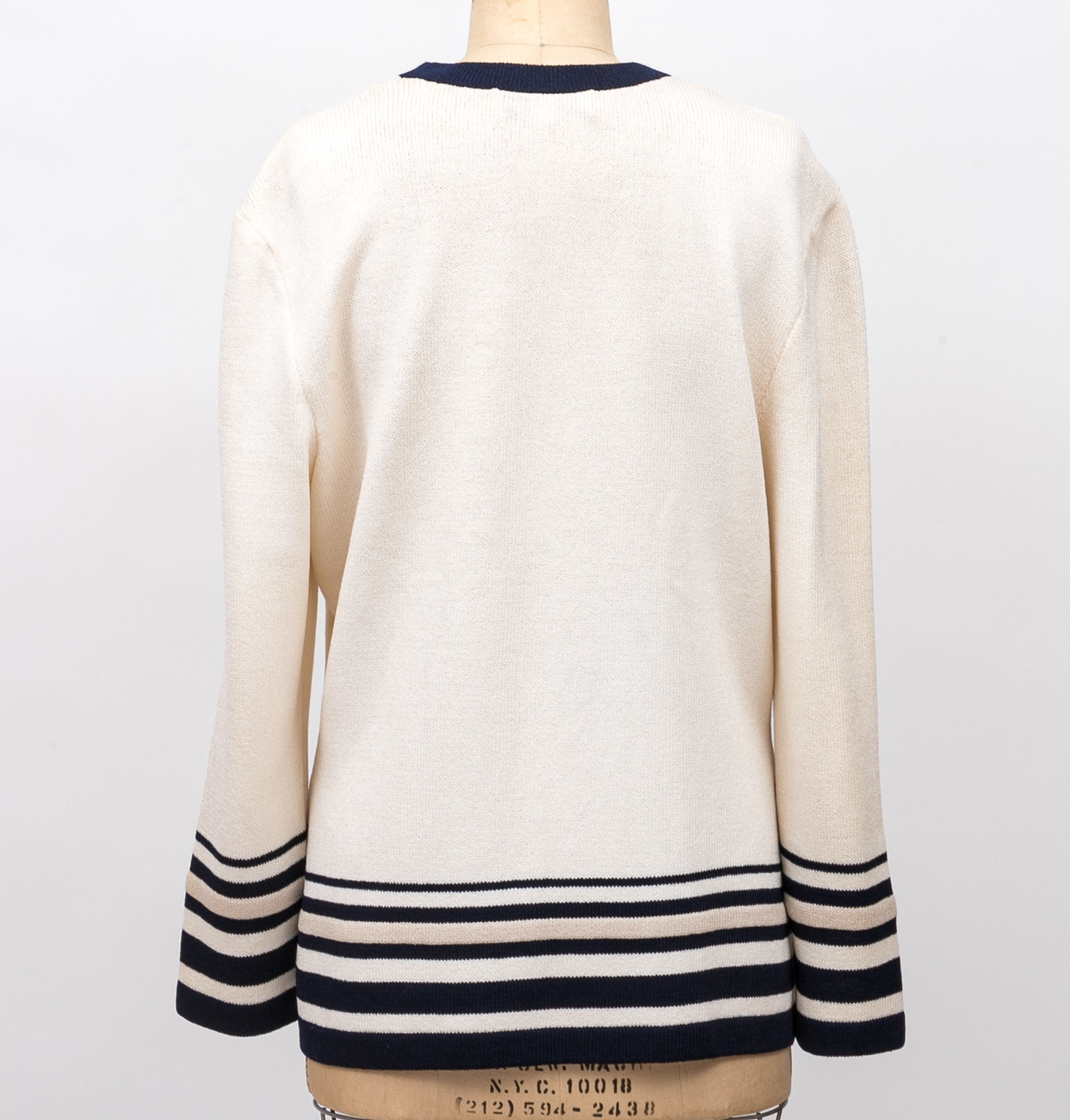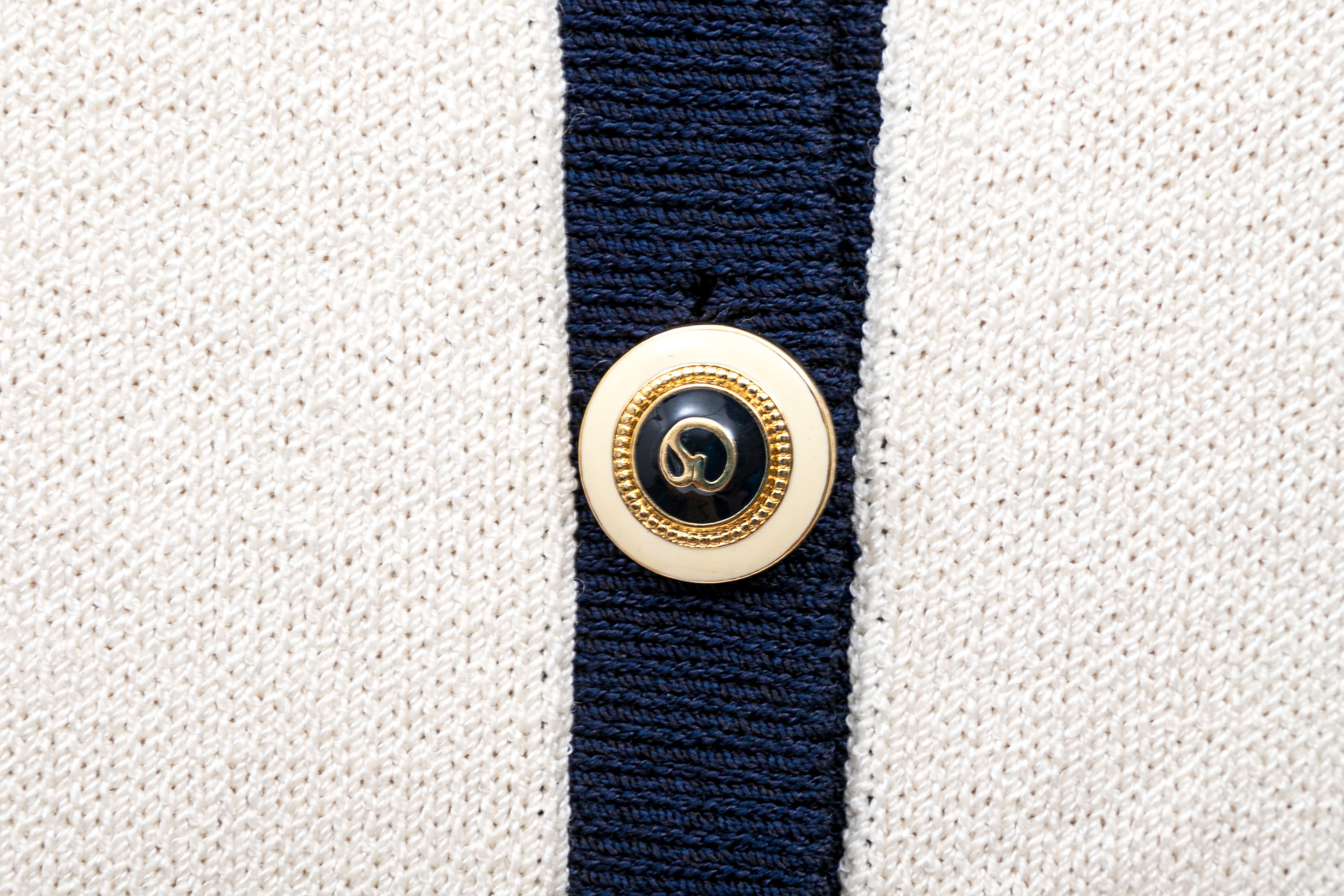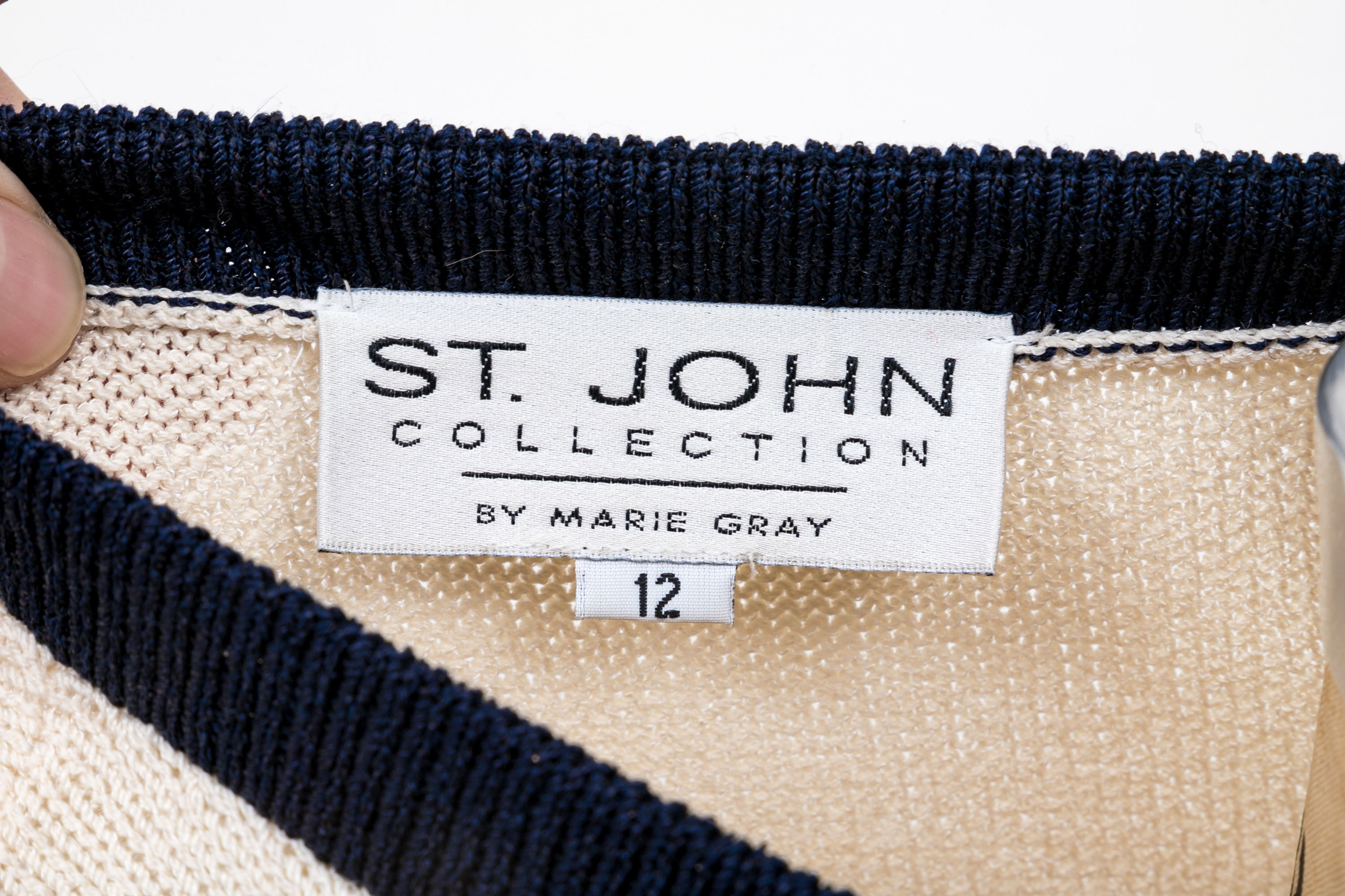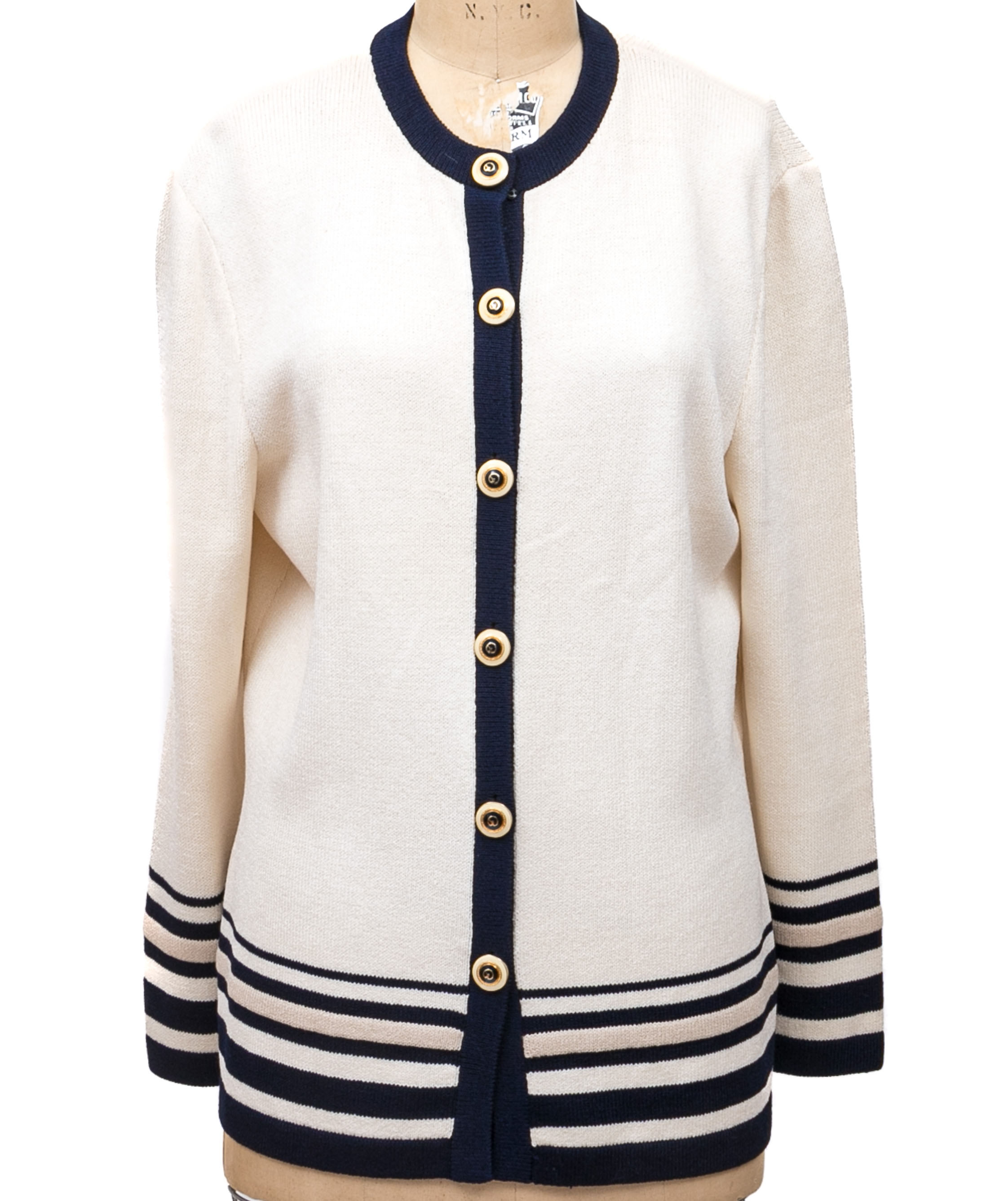 St. John ivory white cardigan with black trimming along the cuffs, collar and front. Gold-toned enamel buttons, mock pockets.
