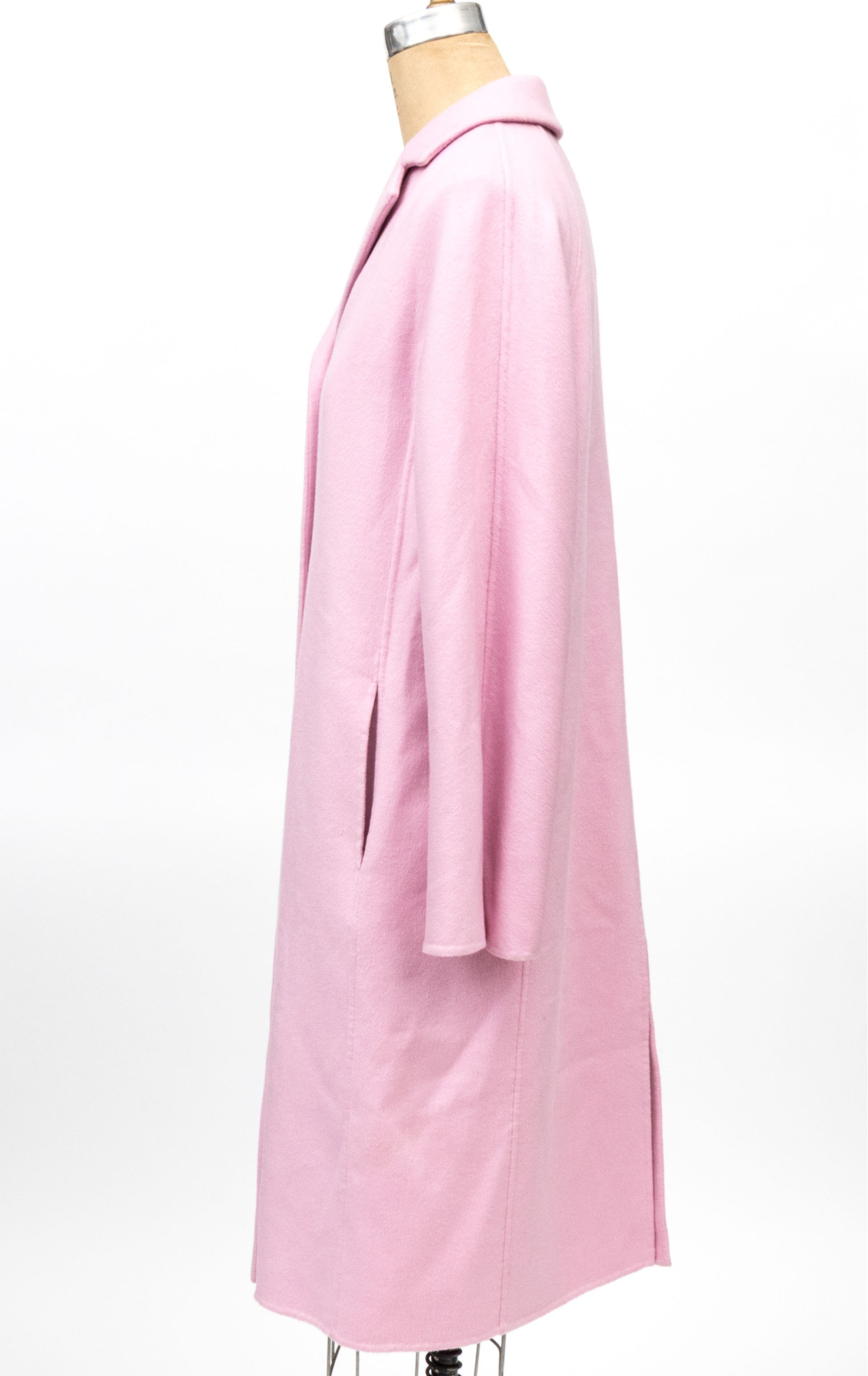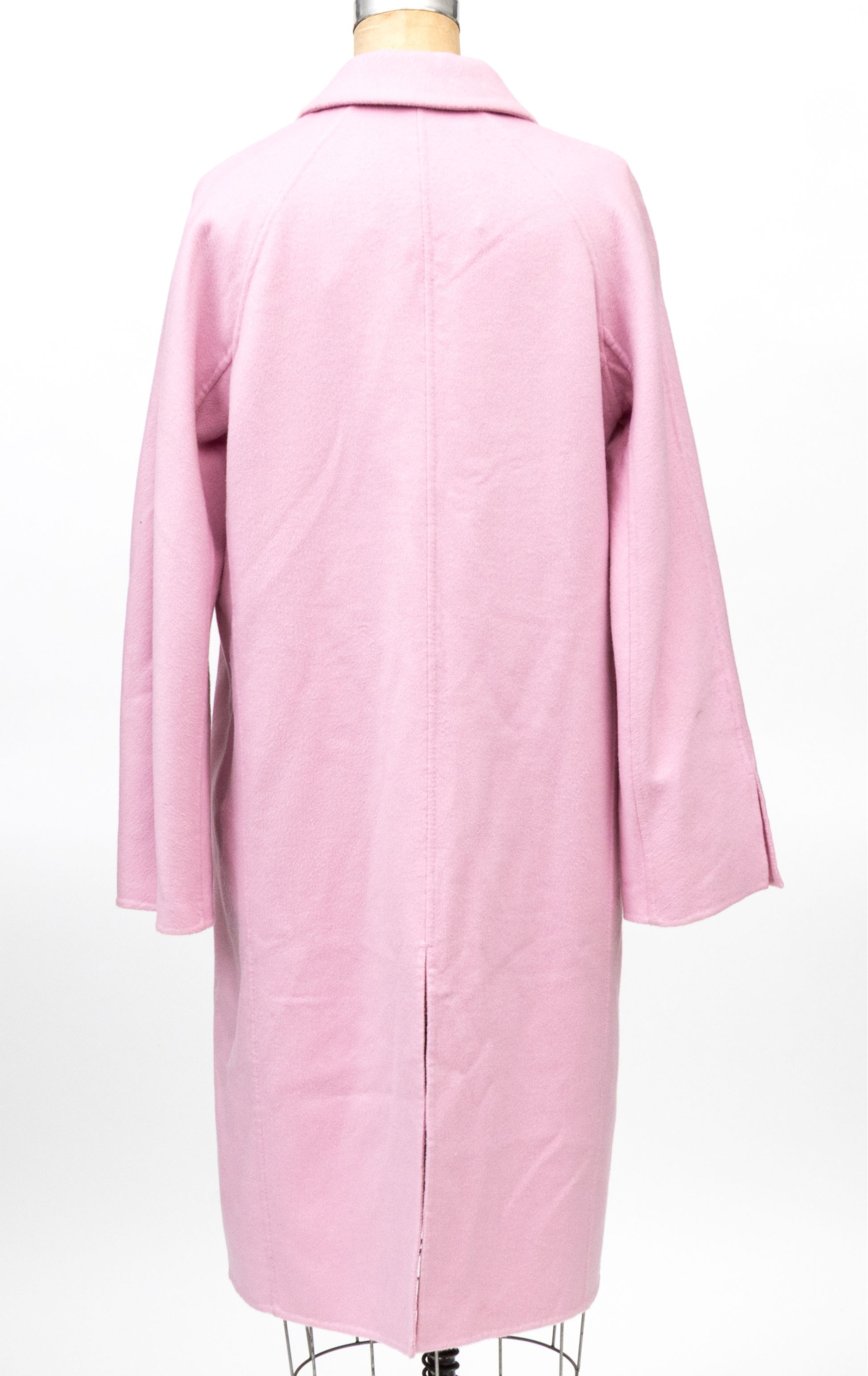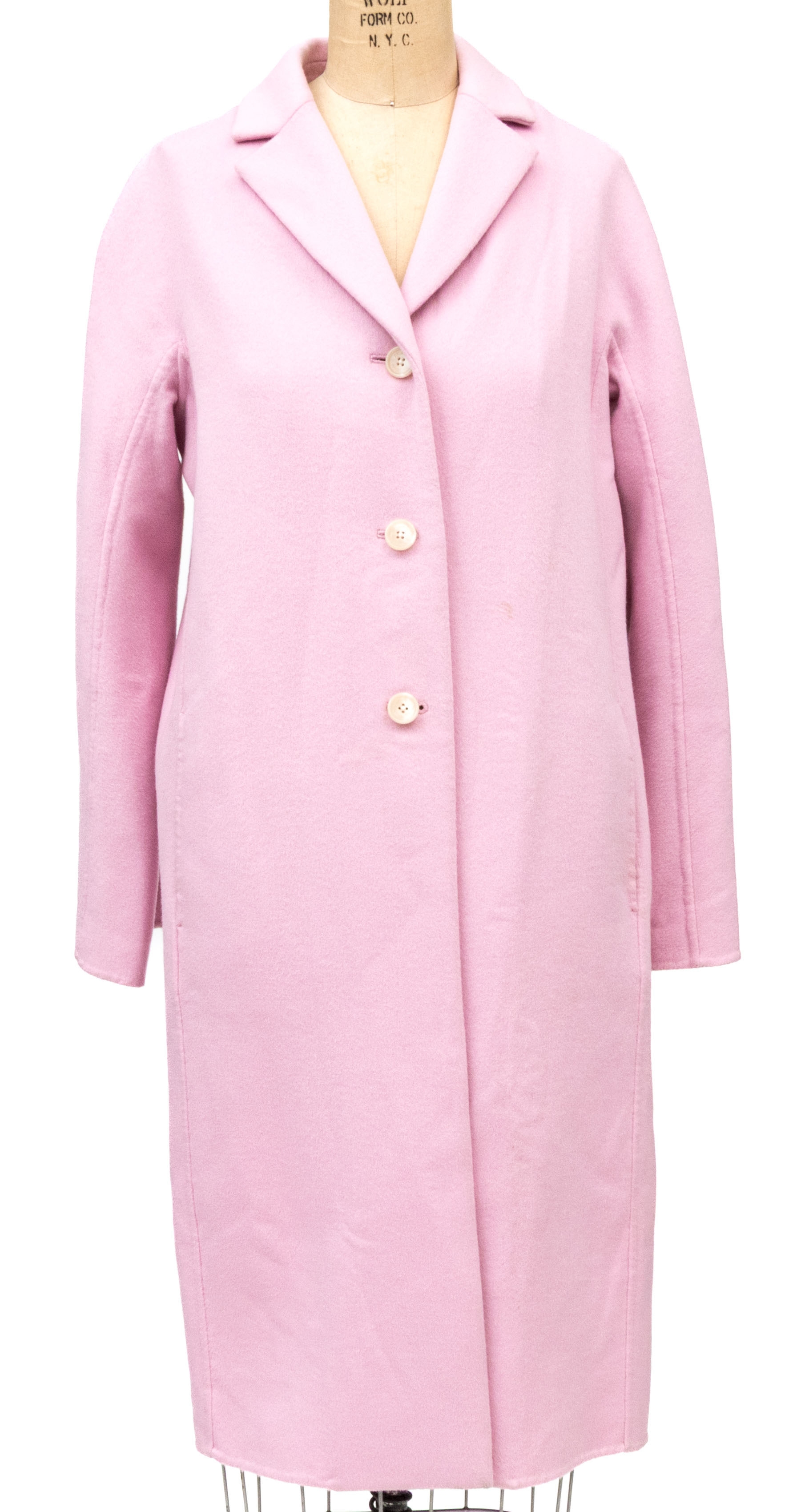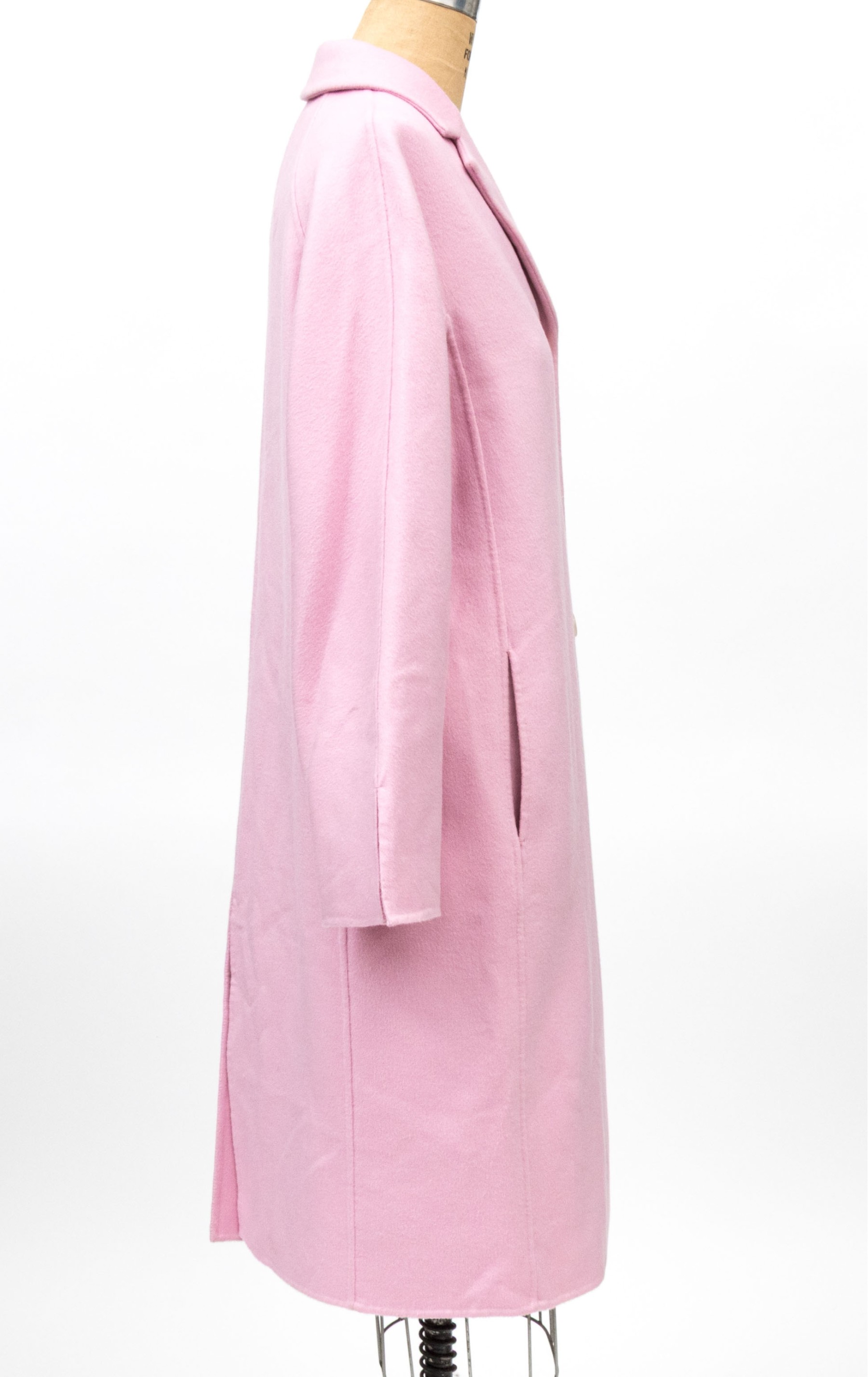St. John pink wool coat featuring a single-breasted silhouette with notched lapels and tonal button closures. Designed with long sleeves, a straight cut, and side slit pockets, the coat is finished with clean tailoring and a knee-length hem.