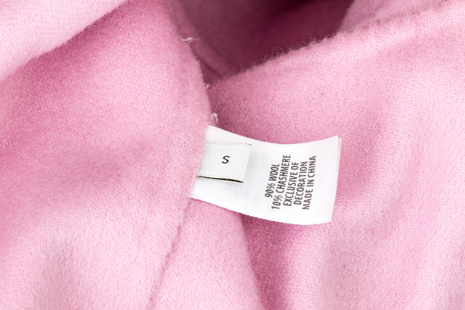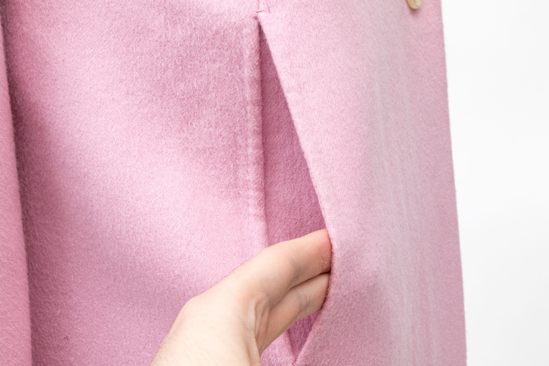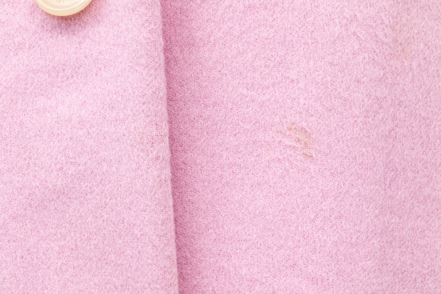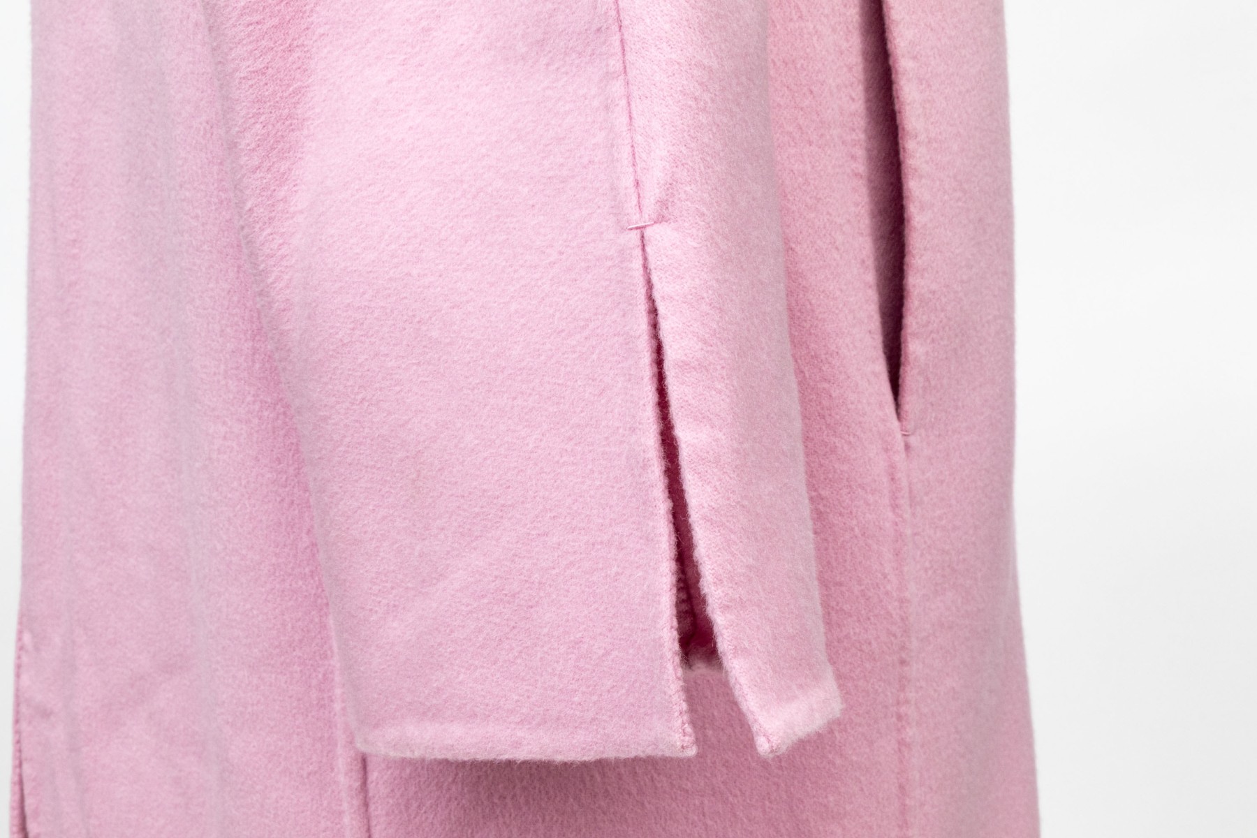 St. John pink wool coat featuring a single-breasted silhouette with notched lapels and tonal button closures. Designed with long sleeves, a straight cut, and side slit pockets, the coat is finished with clean tailoring and a knee-length hem.