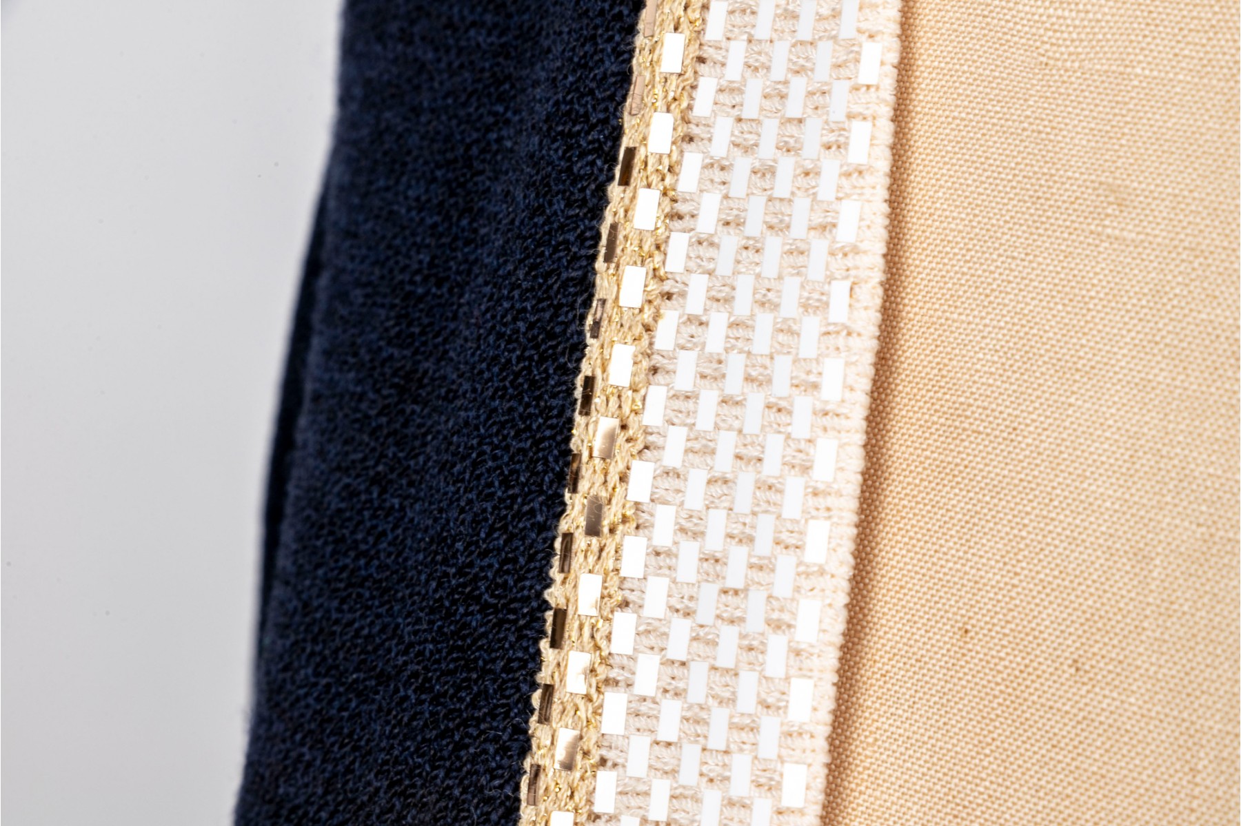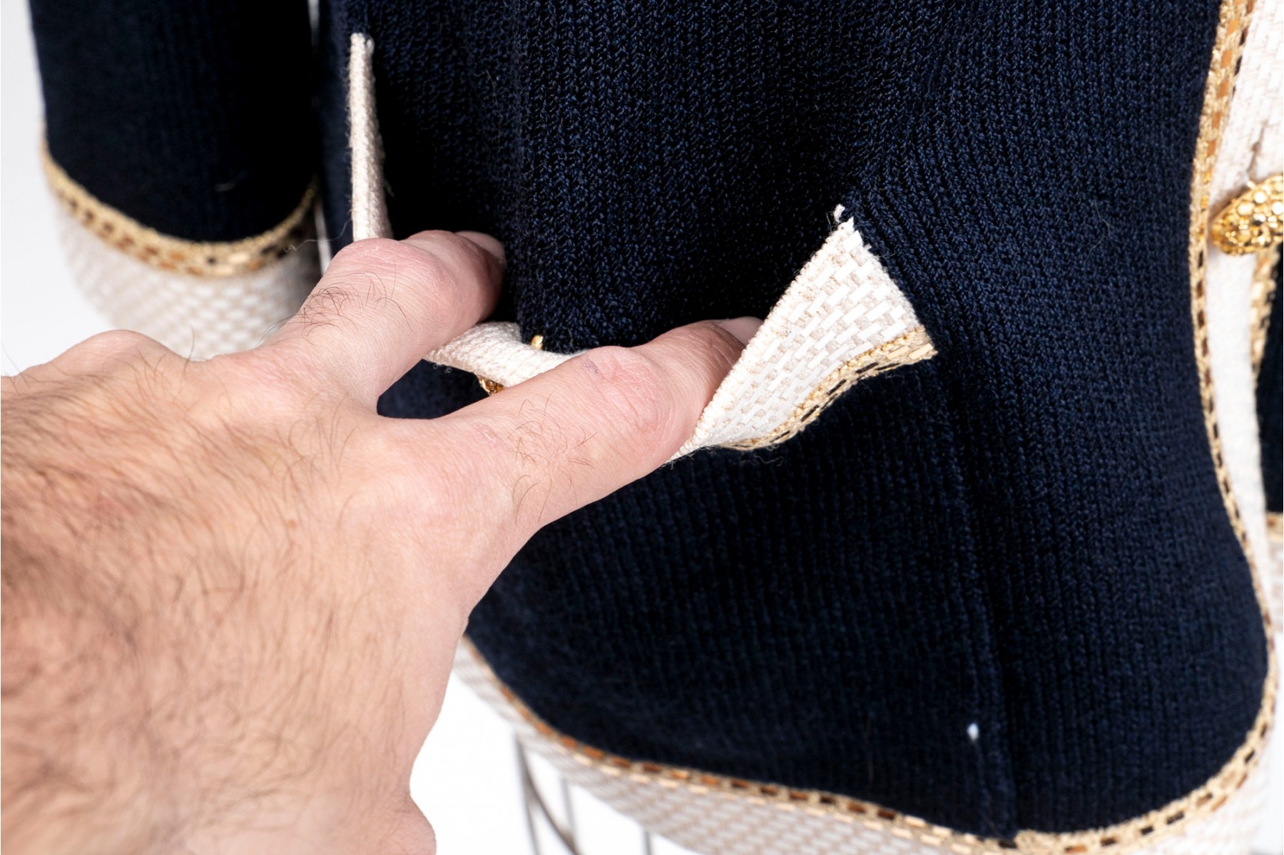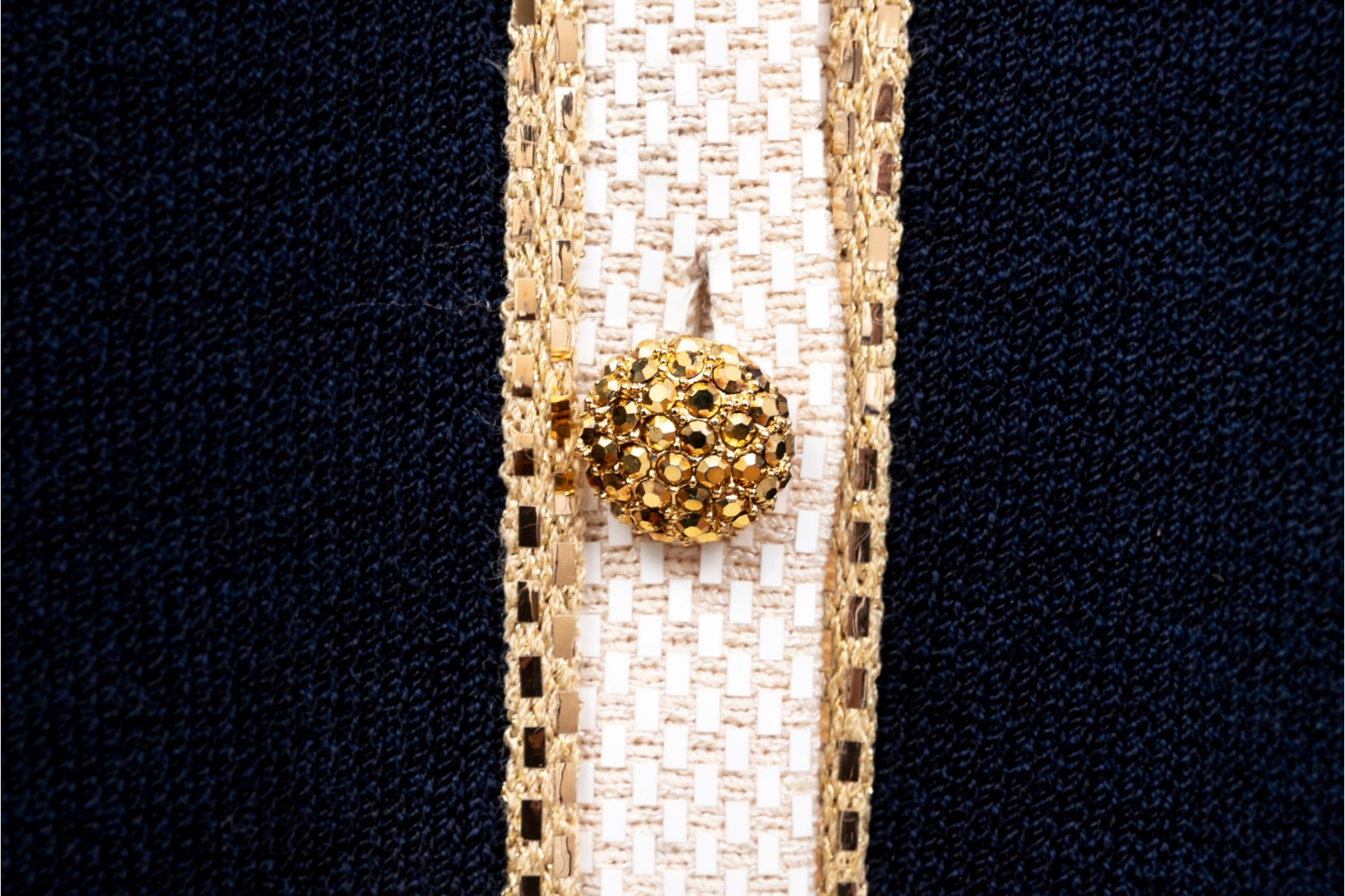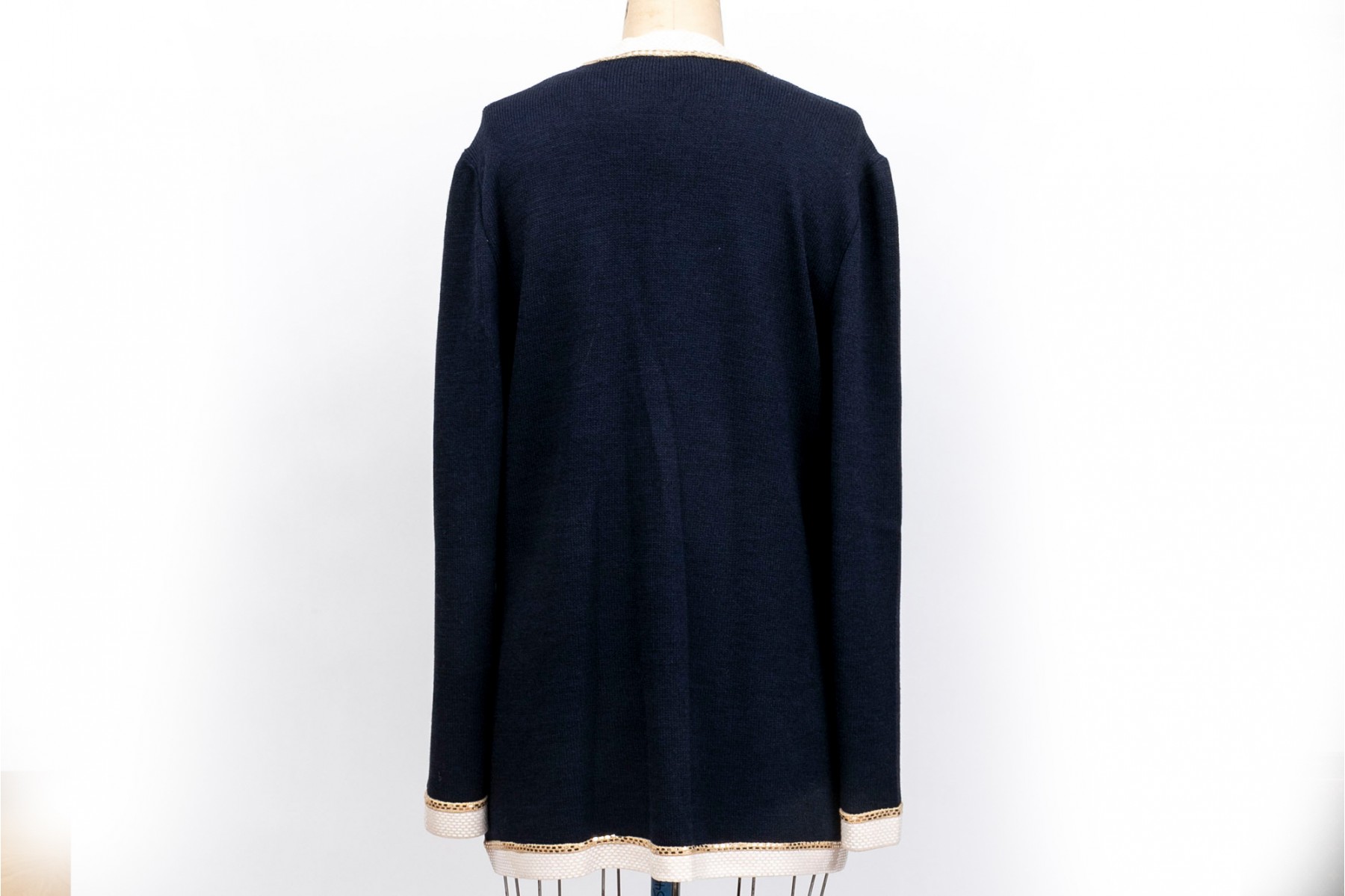 St. John navy blue cardigan. White and gold-toned trim with sequins. Button up front.
