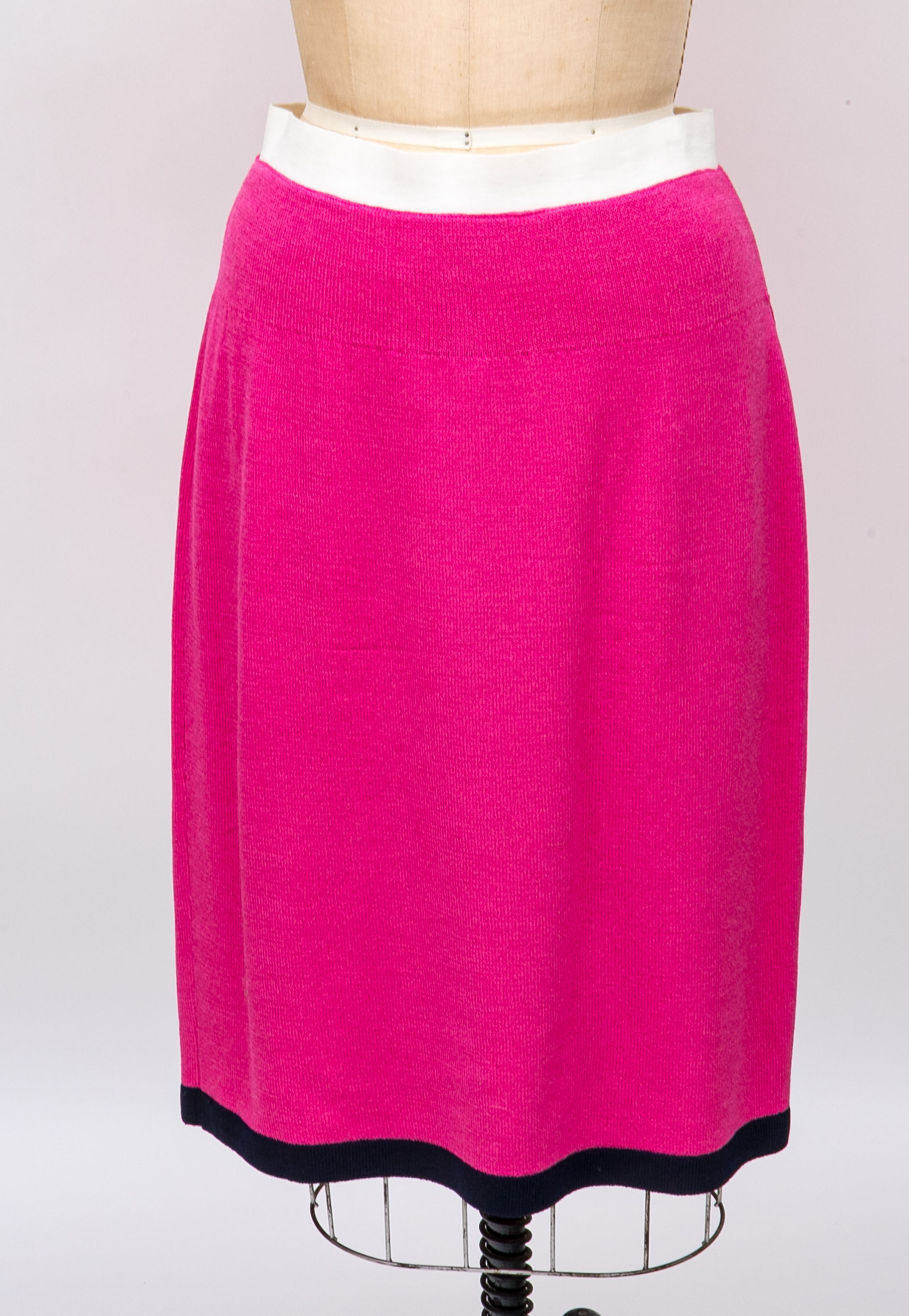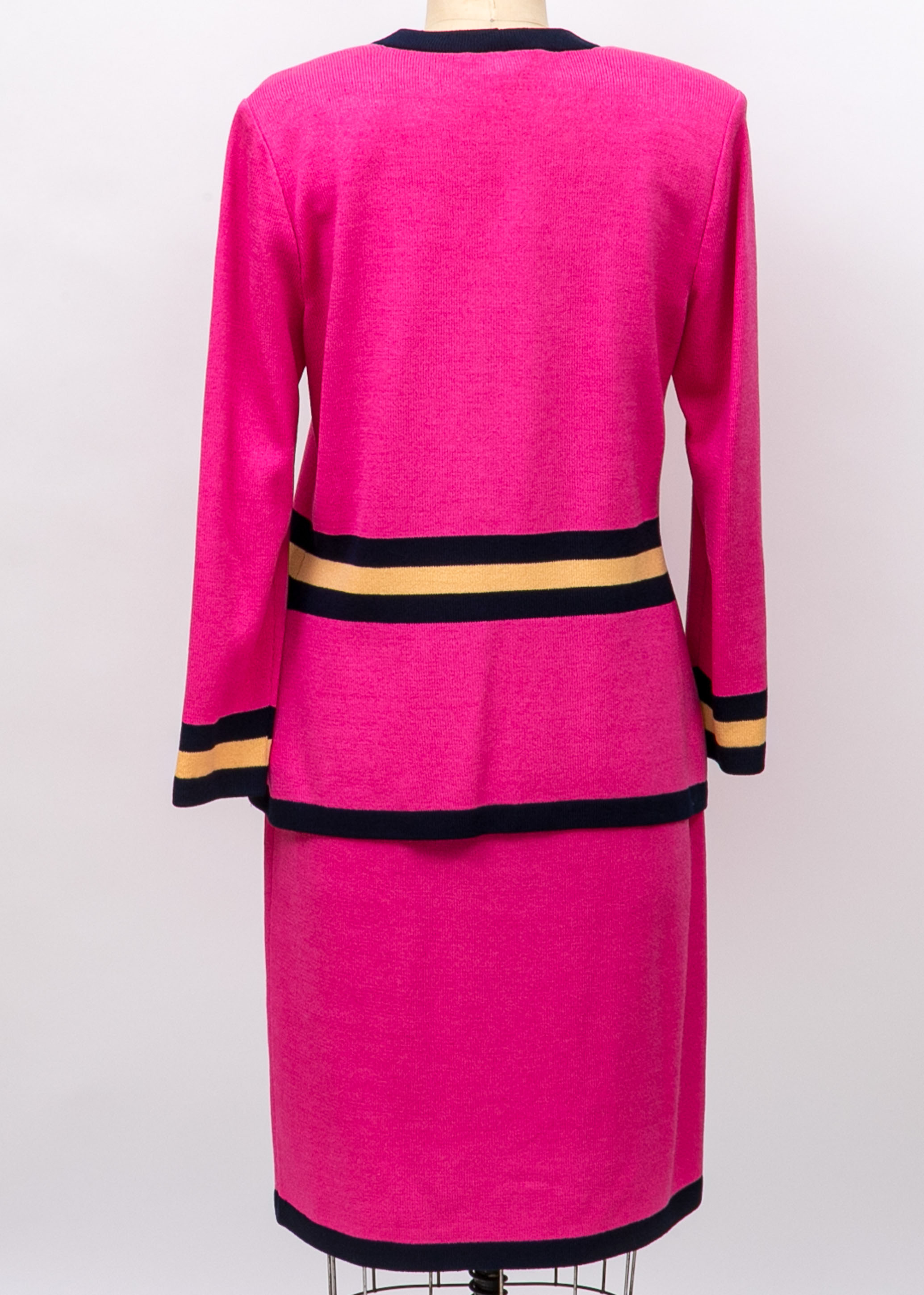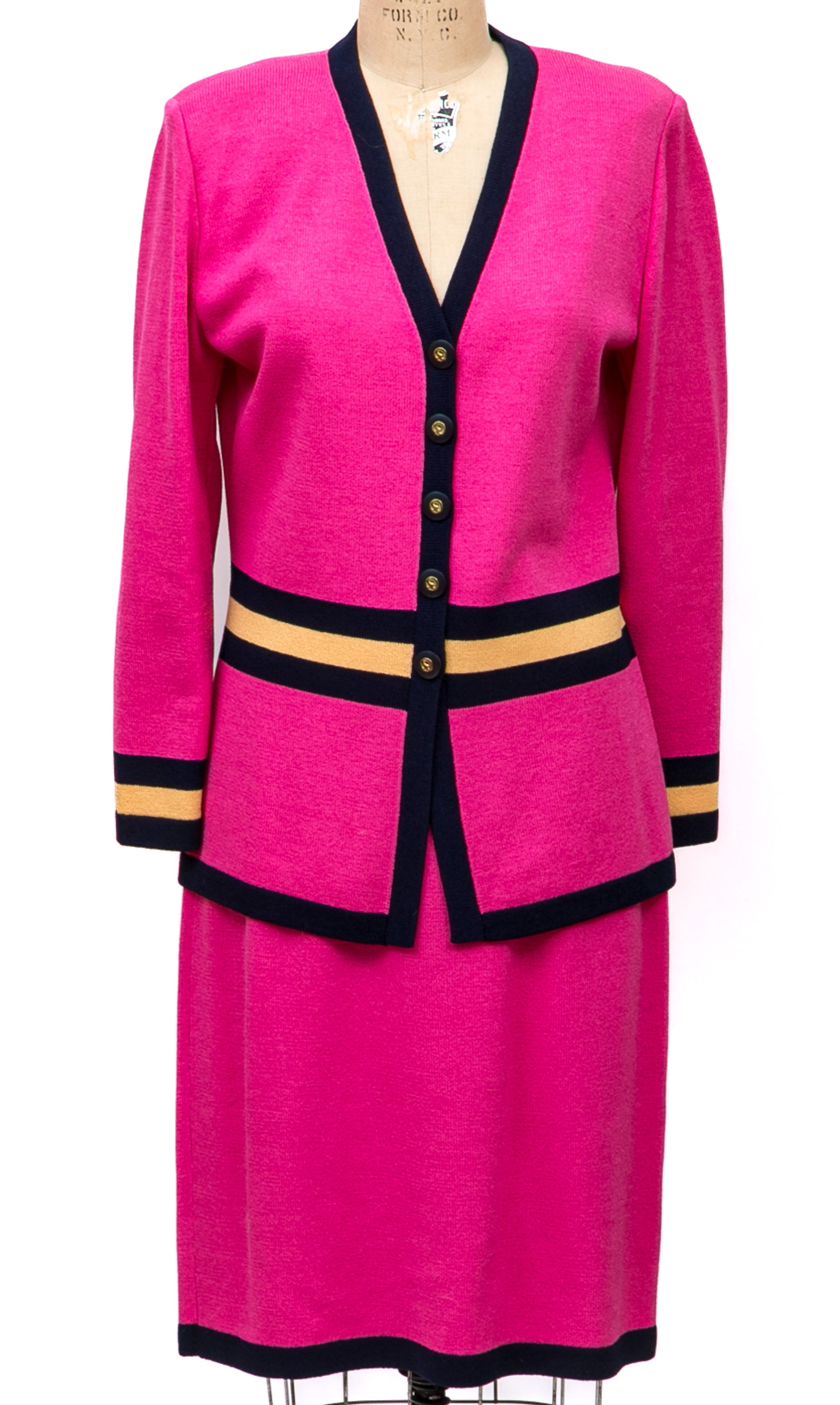 St. John cardigan and skirt suit. Pink with navy blue trimming the base of the jacket and skirt. Beige accents the cardigan. Button up cardigan, elastic waist on skirt.