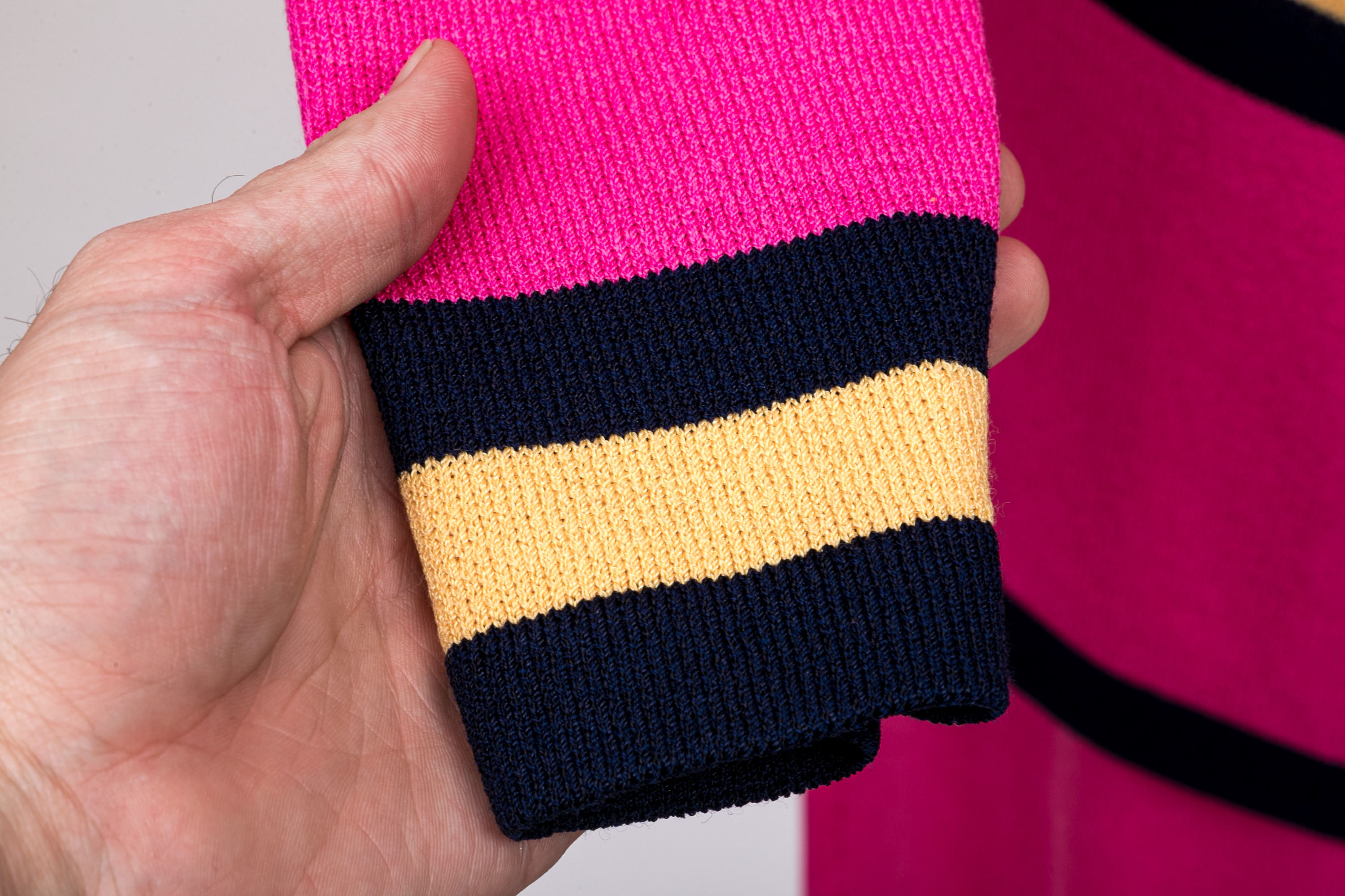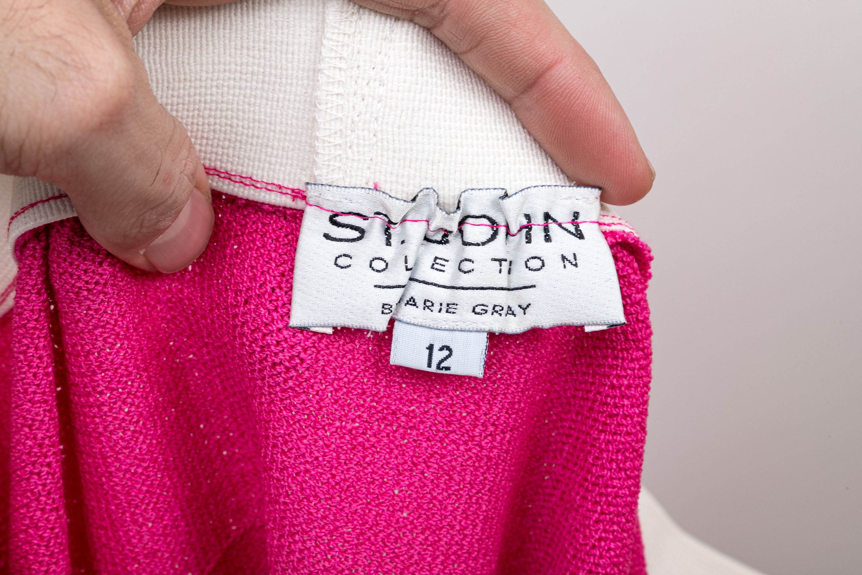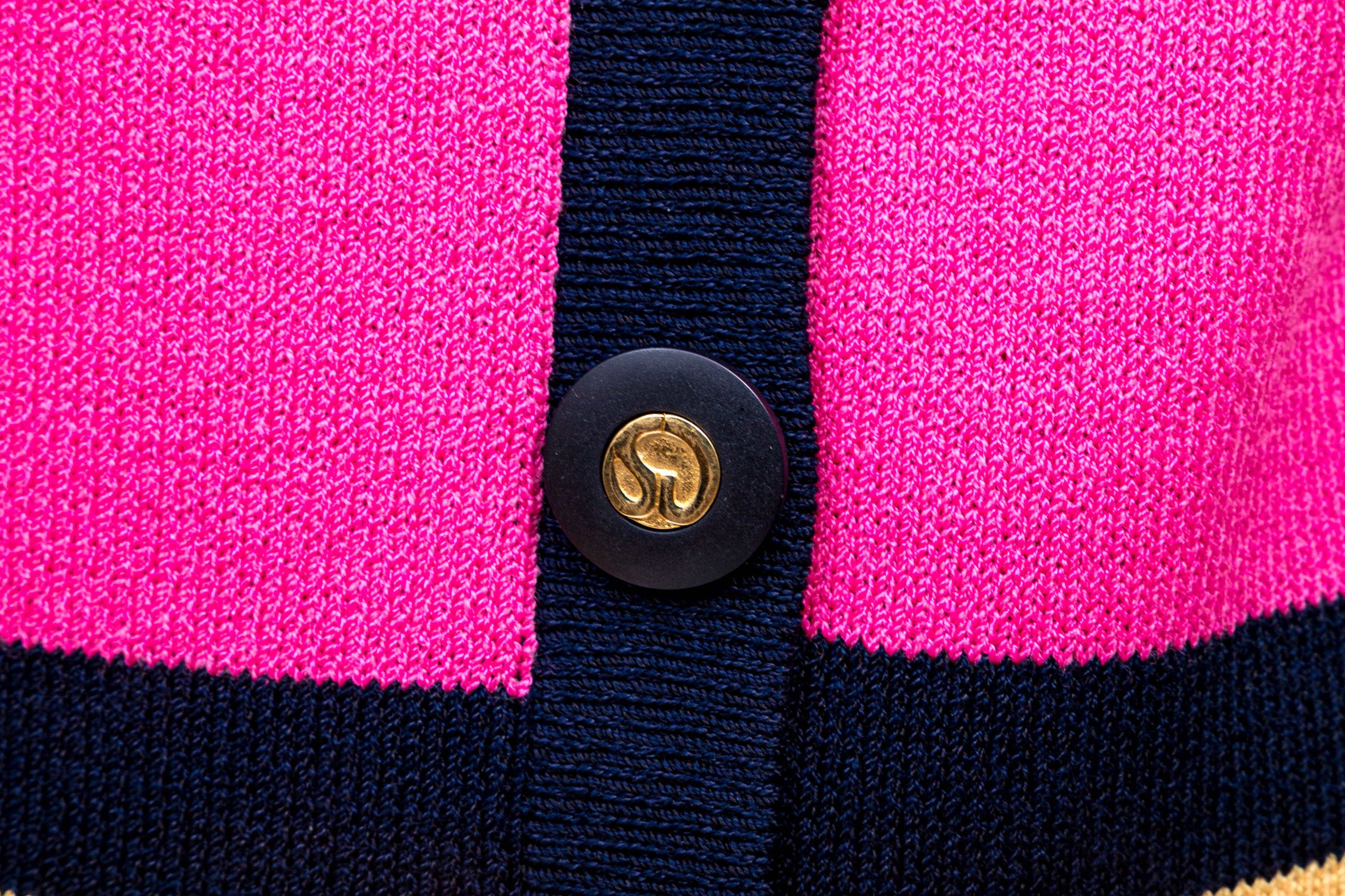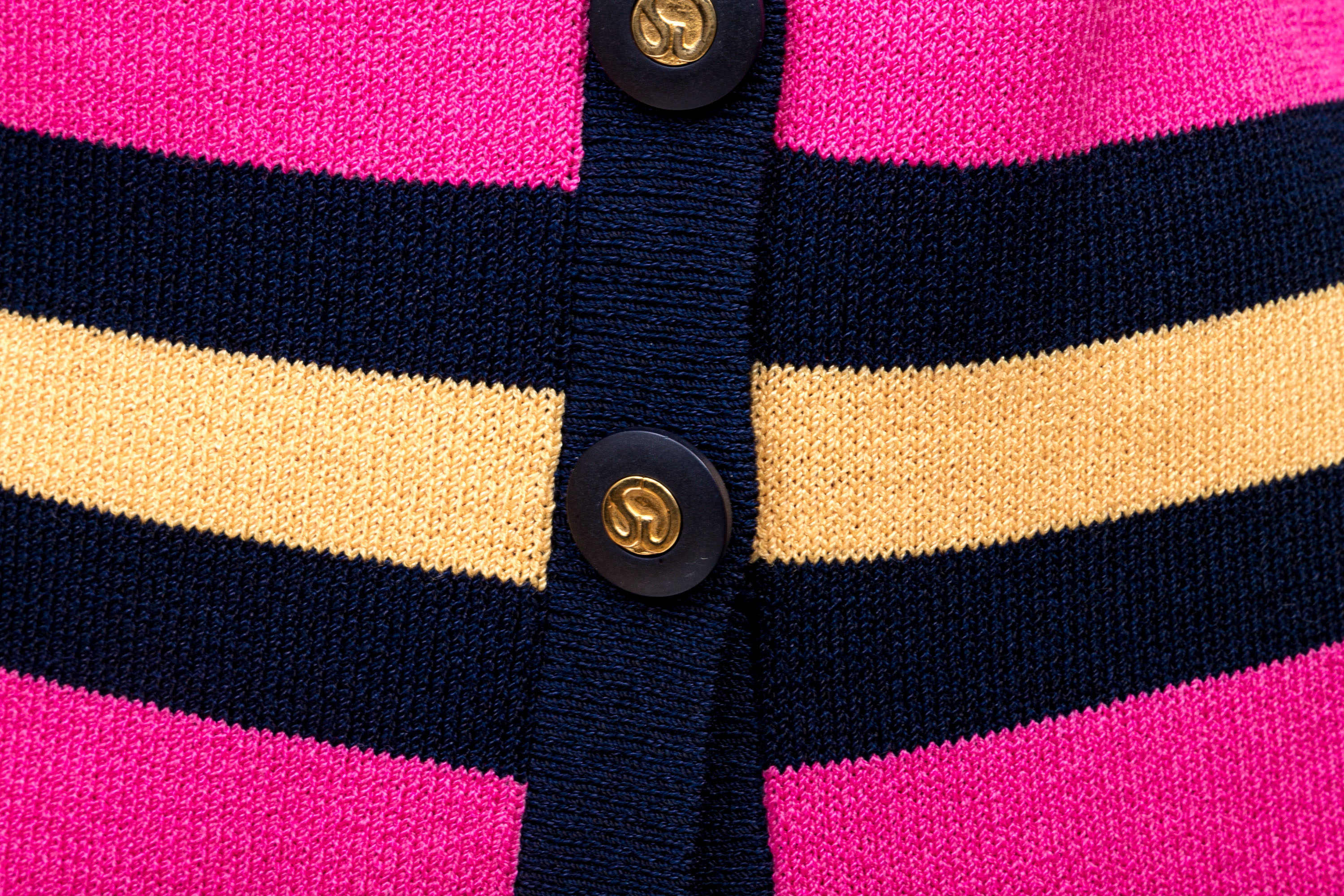 St. John cardigan and skirt suit. Pink with navy blue trimming the base of the jacket and skirt. Beige accents the cardigan. Button up cardigan, elastic waist on skirt.