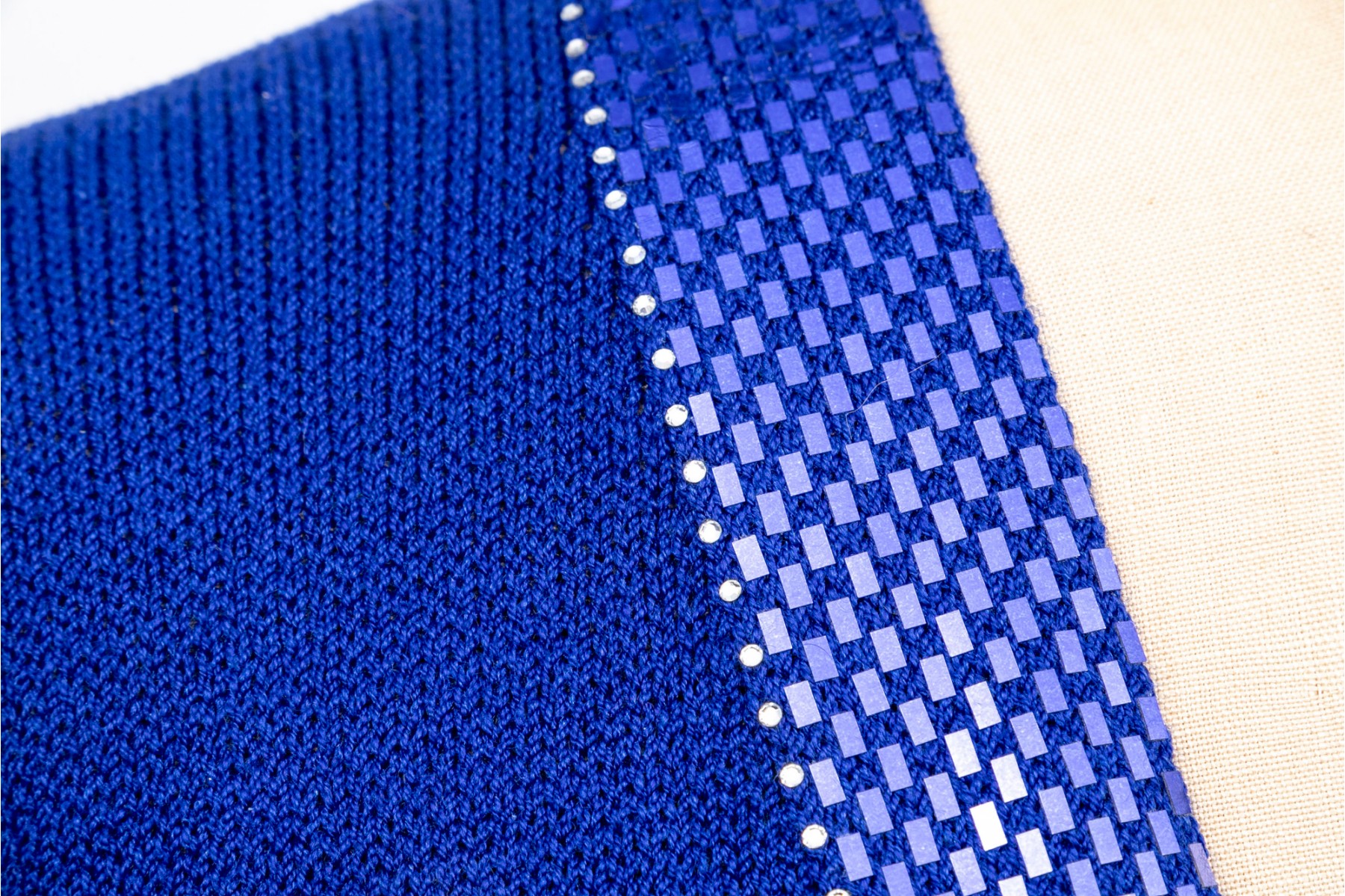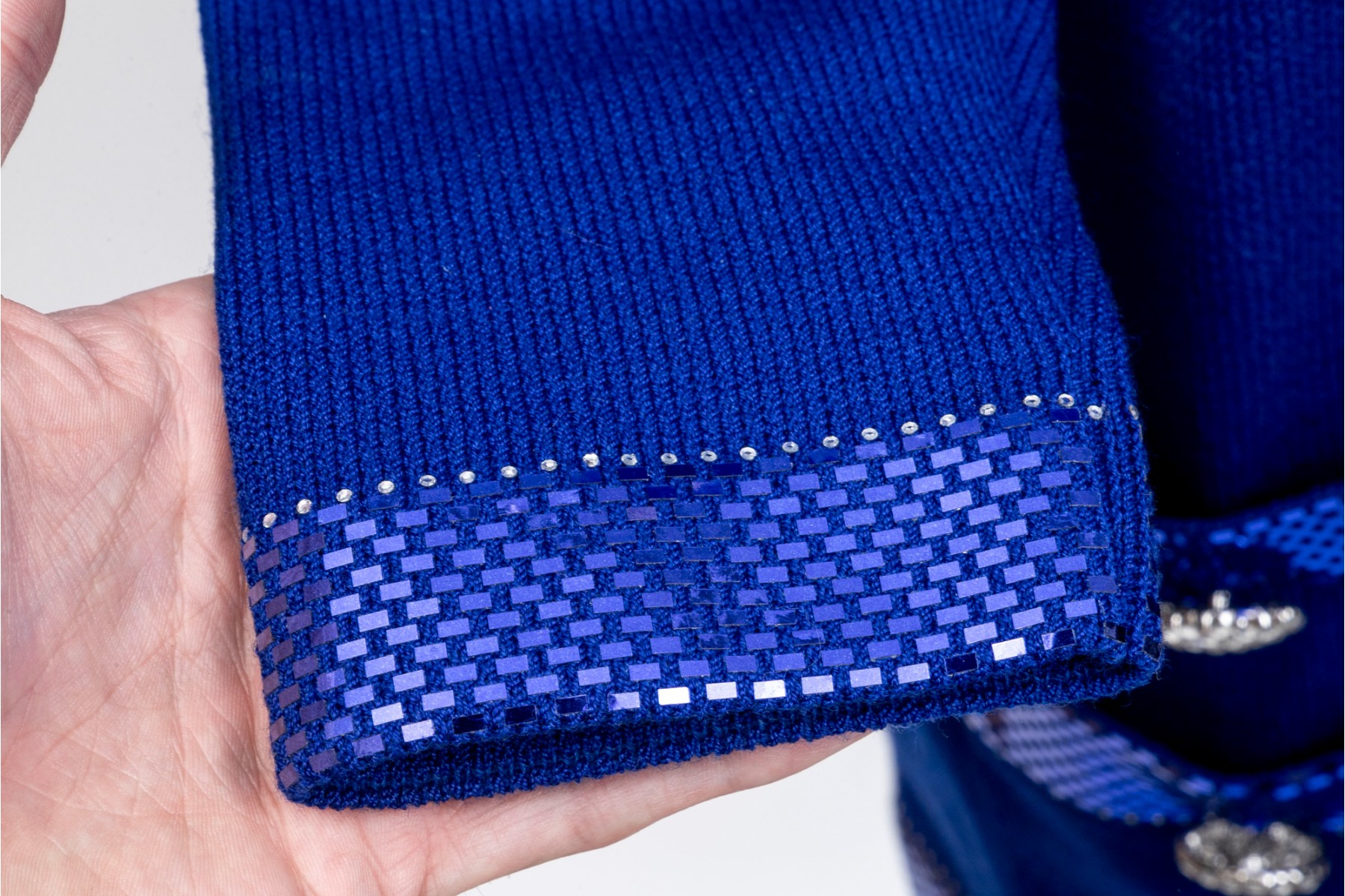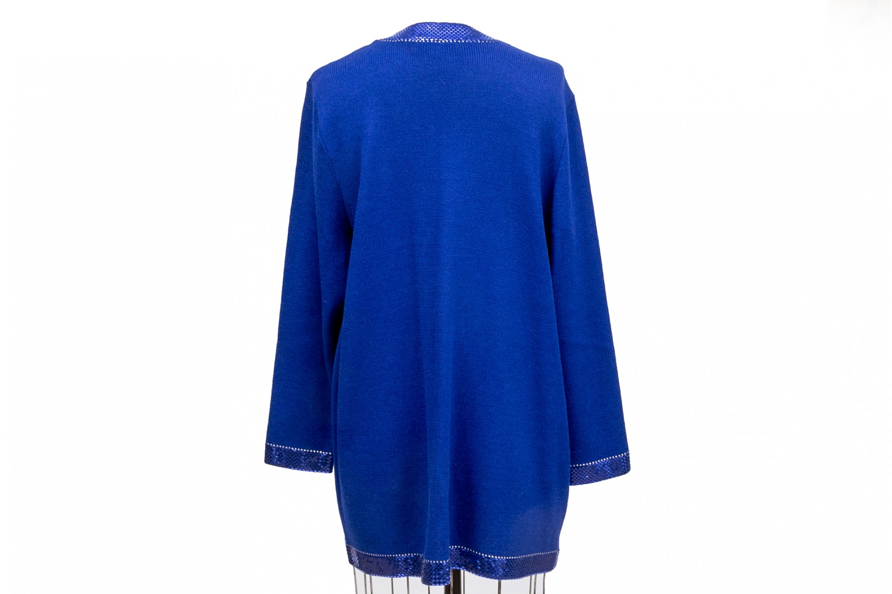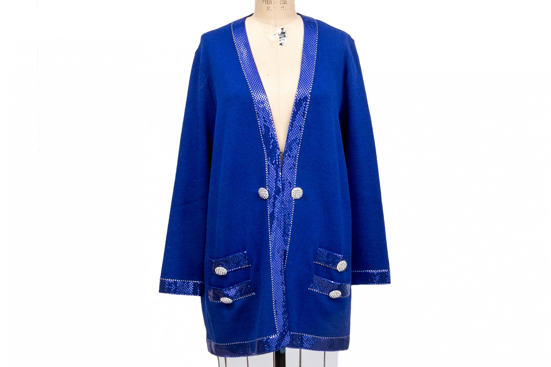 St. John bright blue long cardigan. Blue sequinned trim with button closure and pockets.