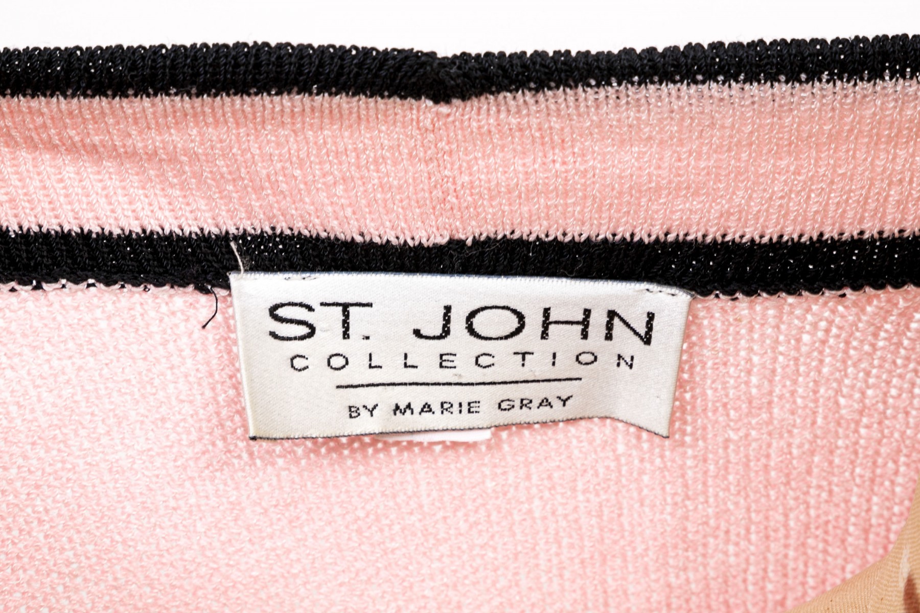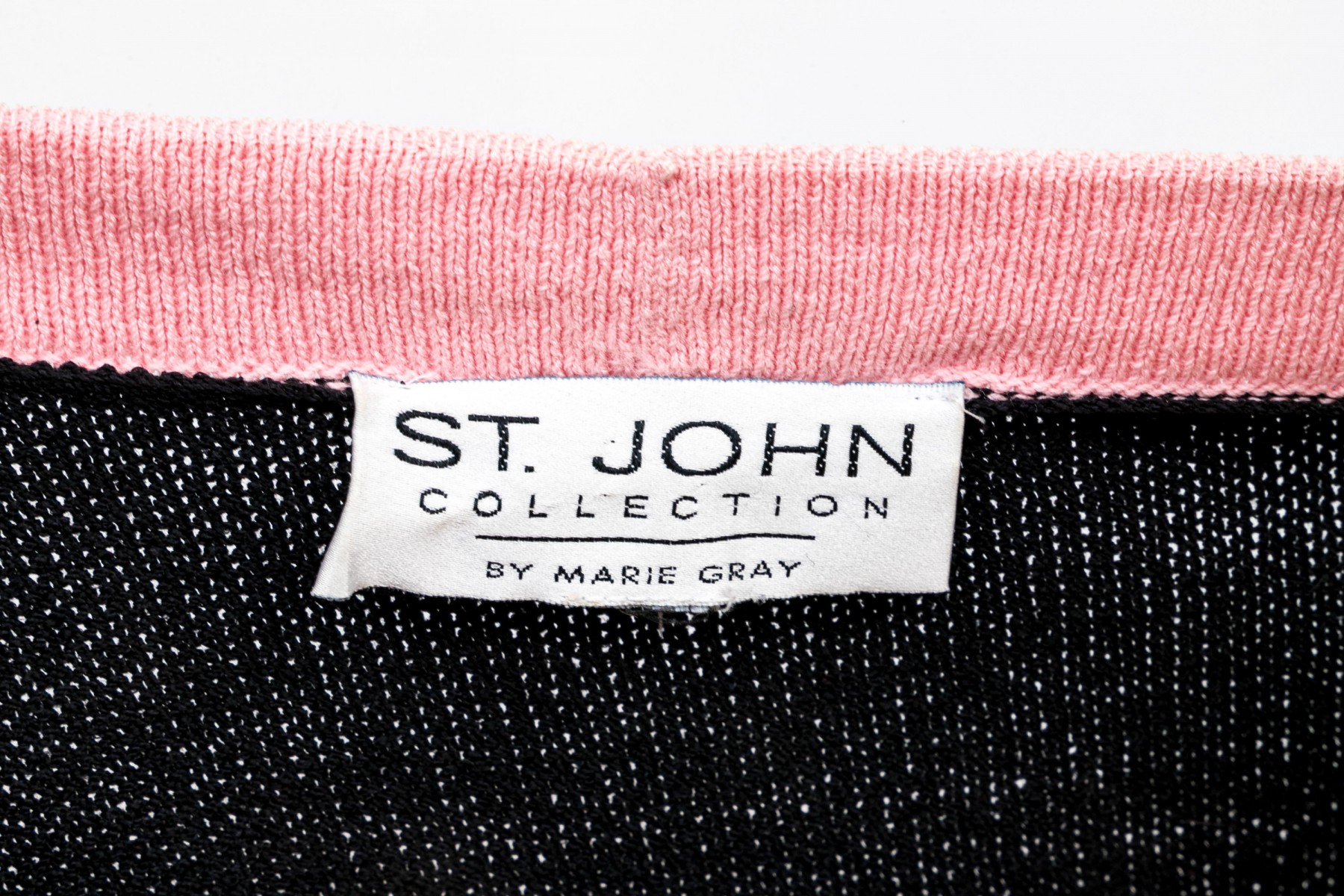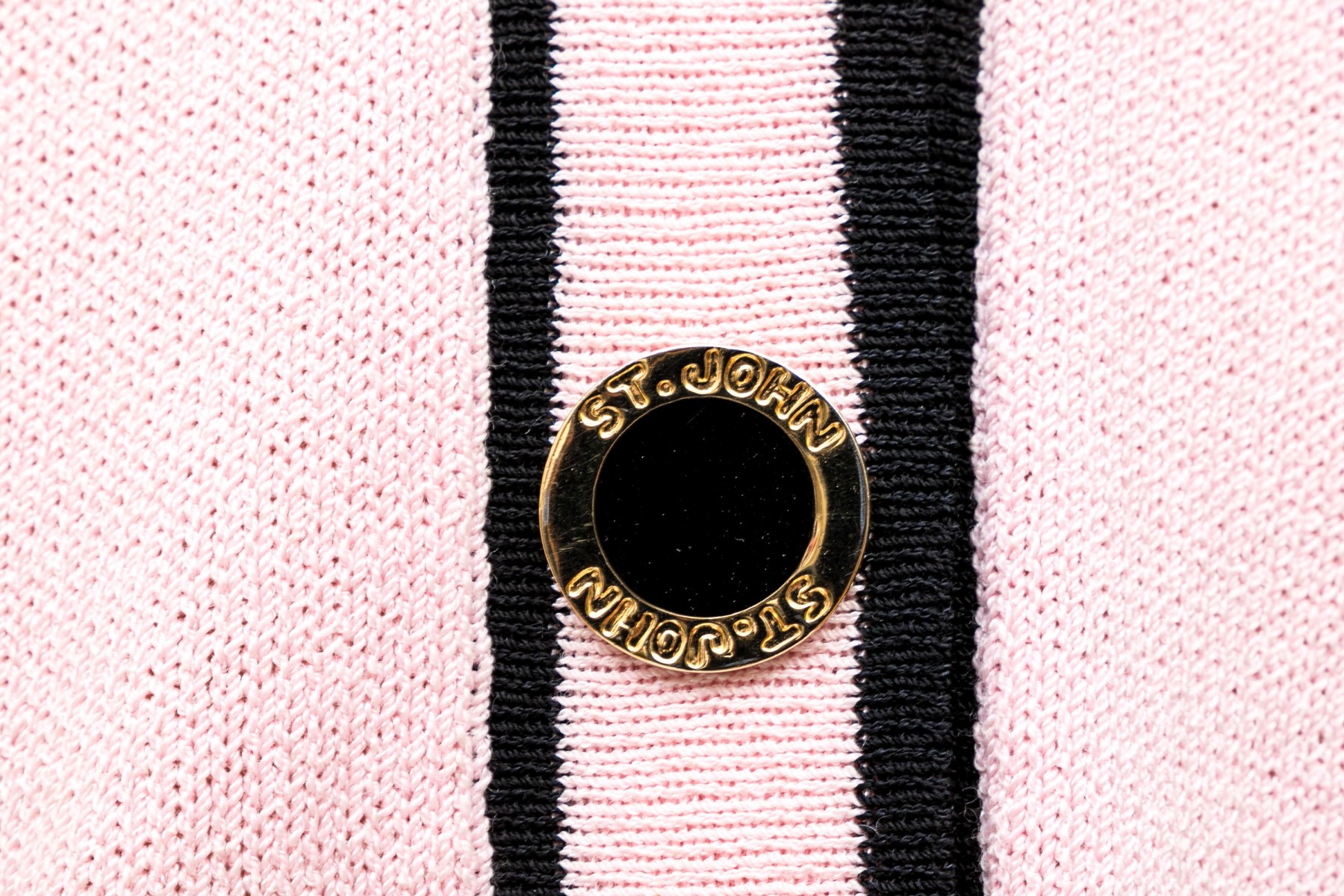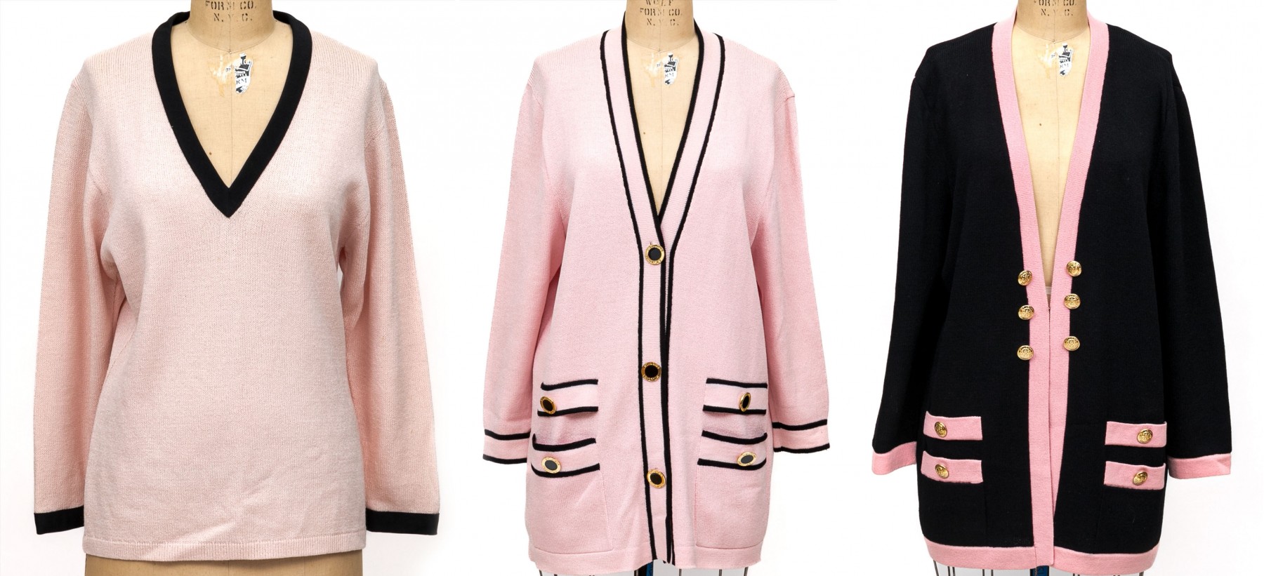 Two St. John pink and black cardigans and one pink 'V' neck sweater.
