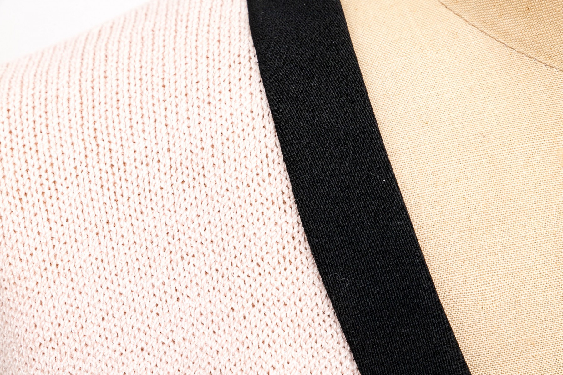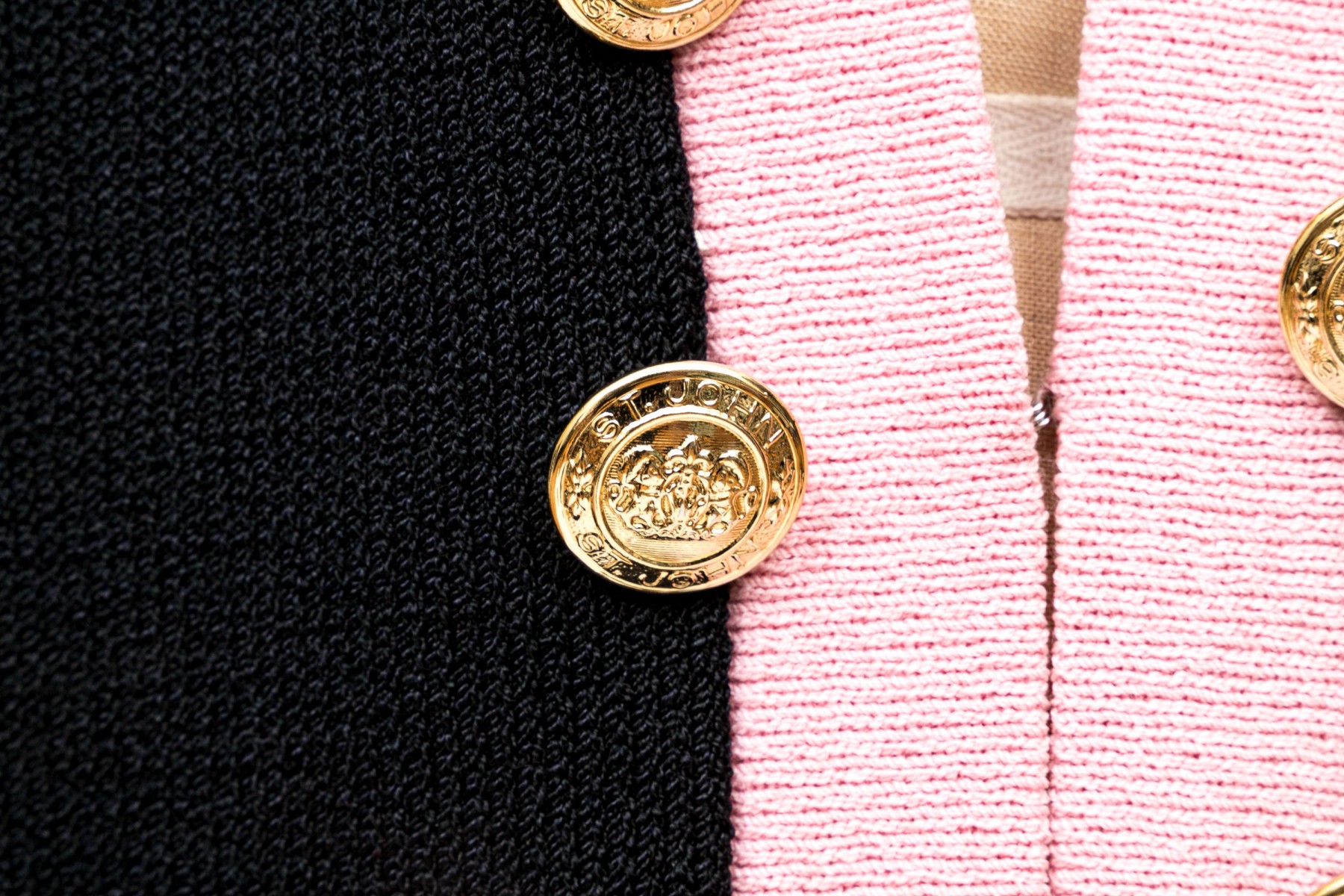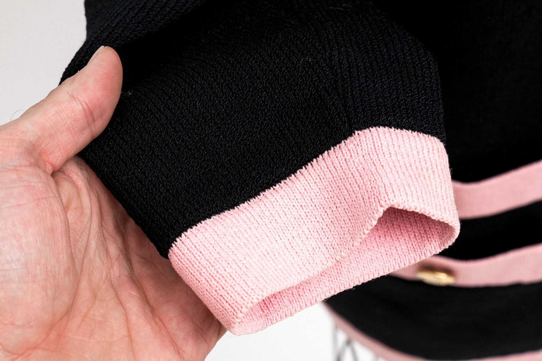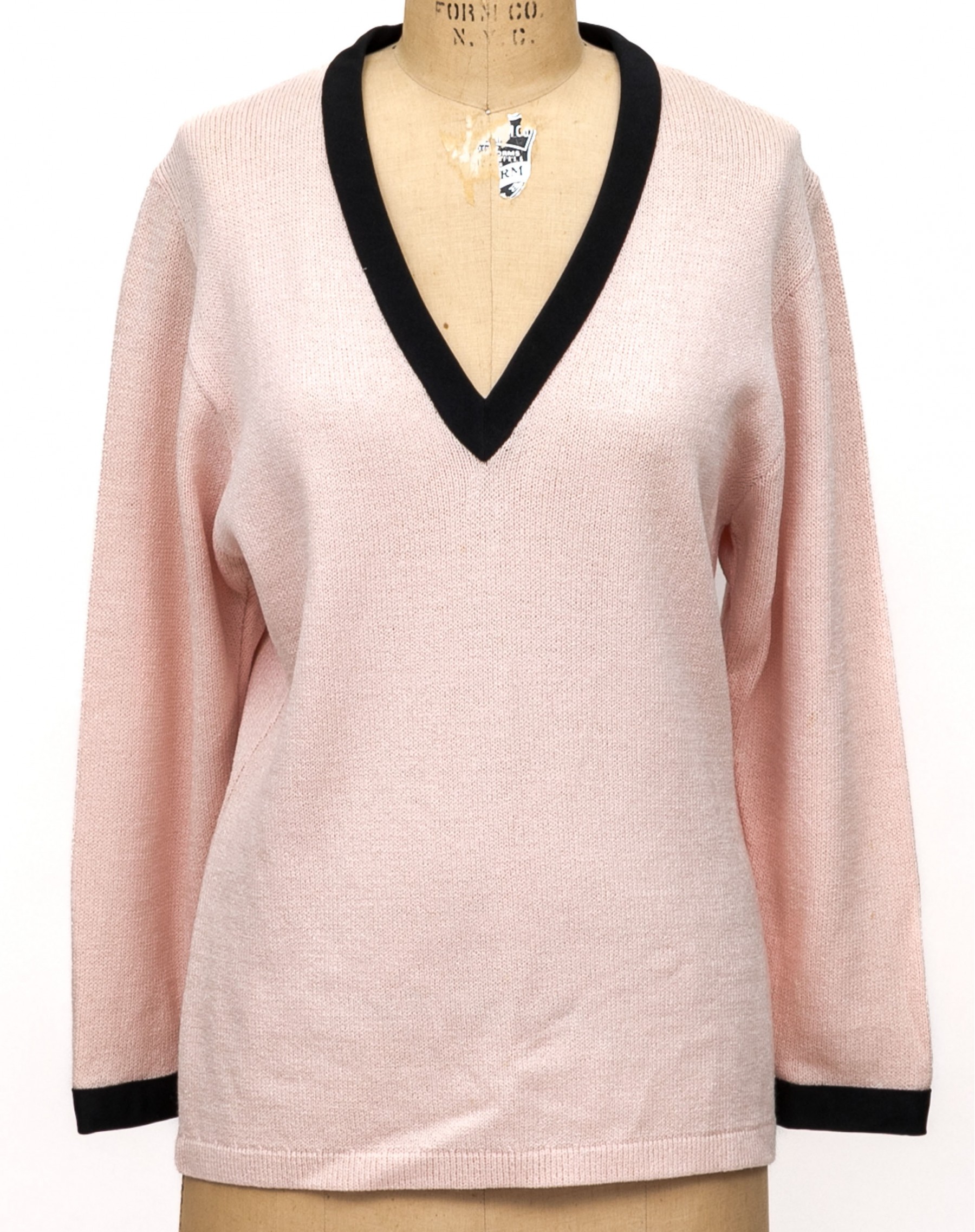 Two St. John pink and black cardigans and one pink 'V' neck sweater.