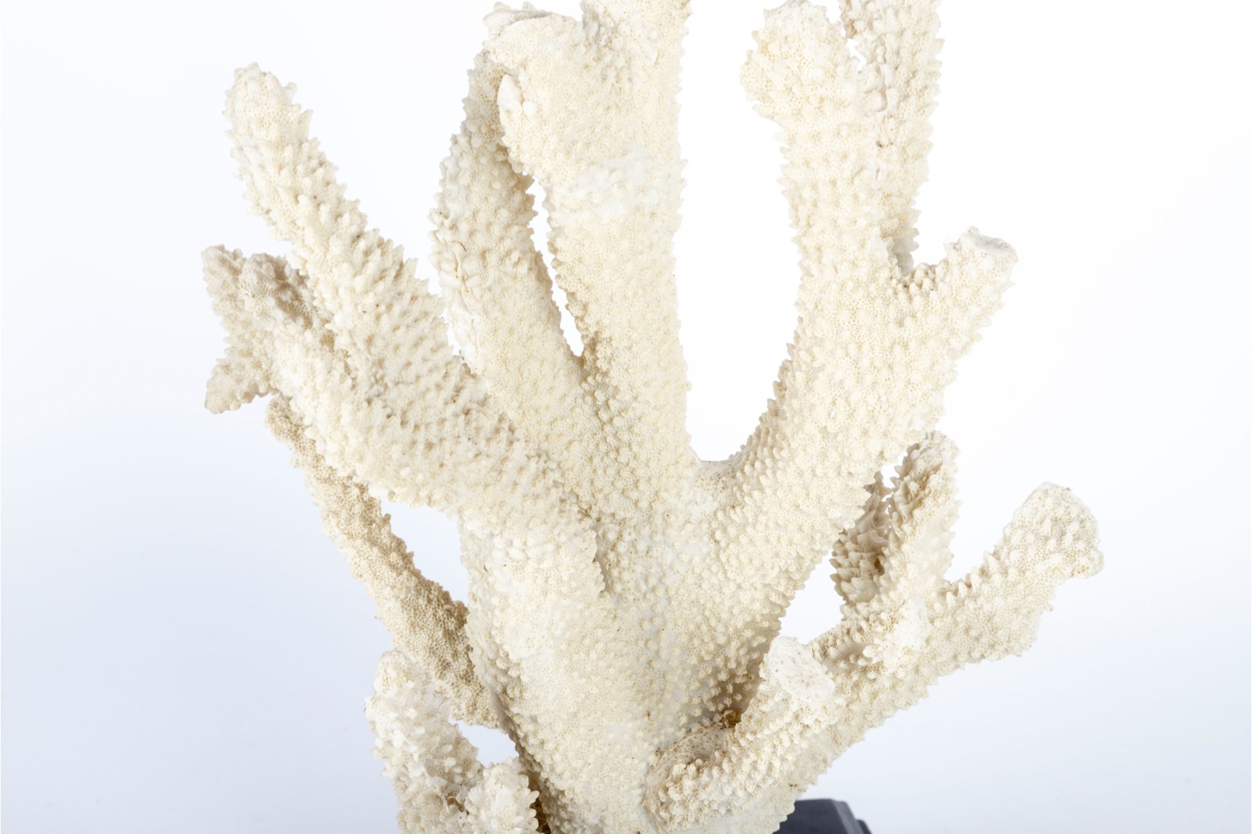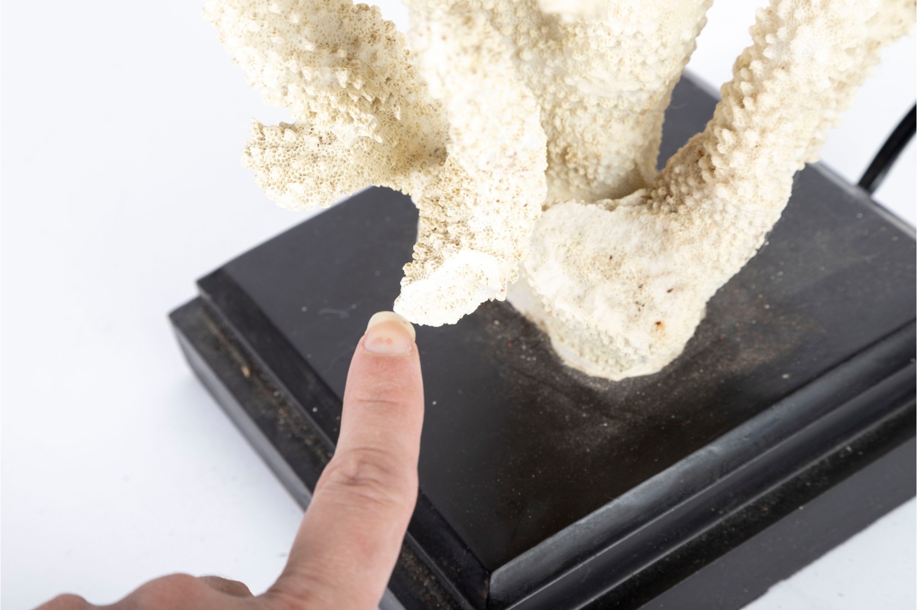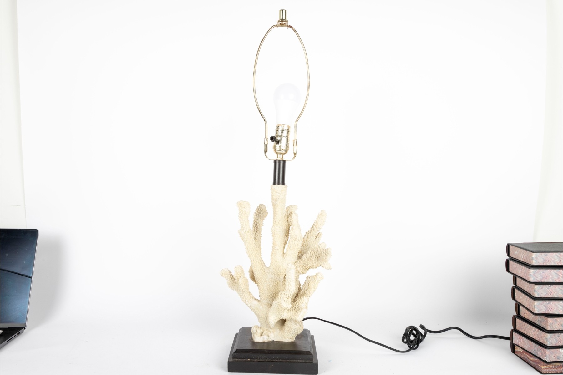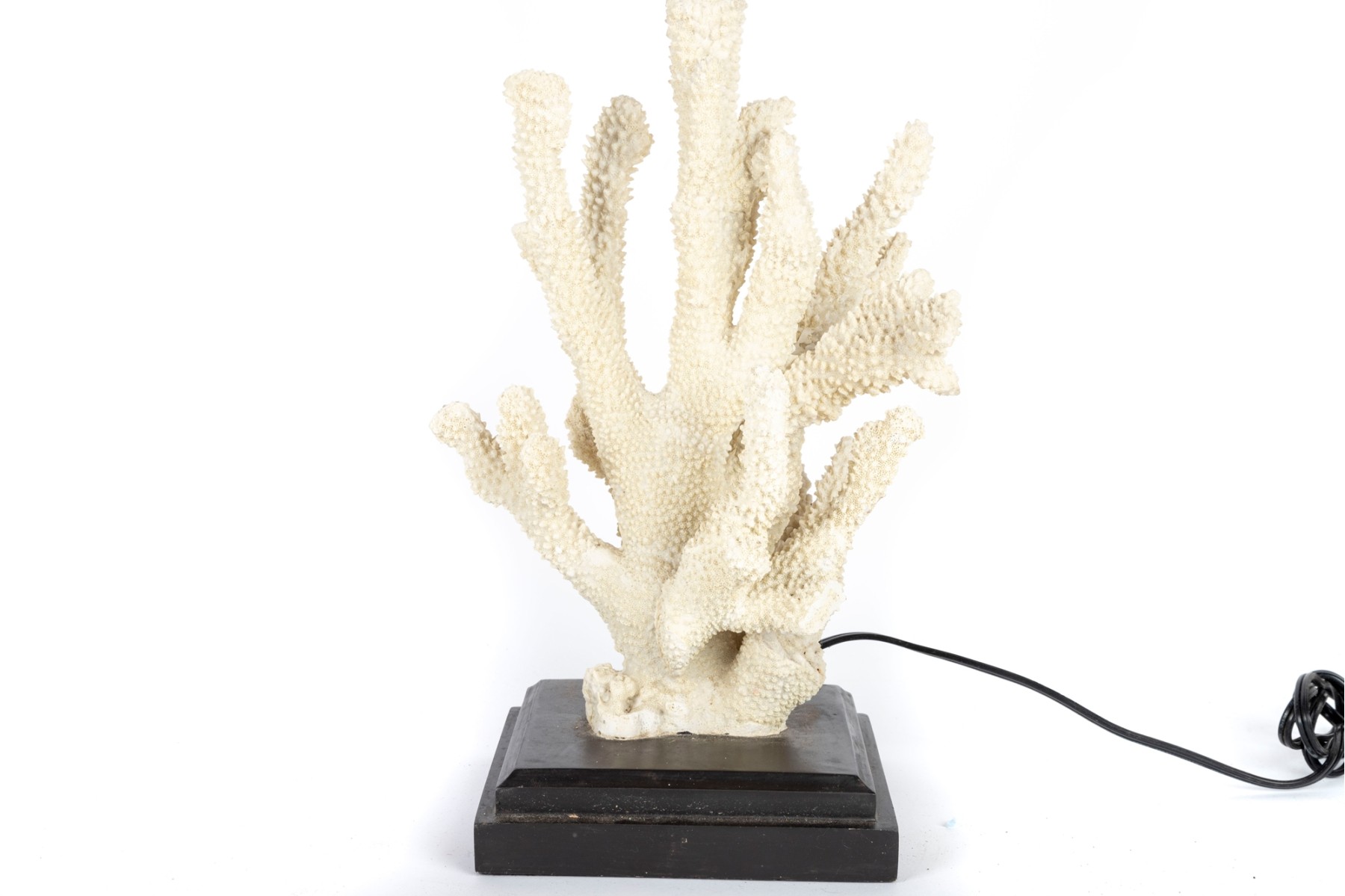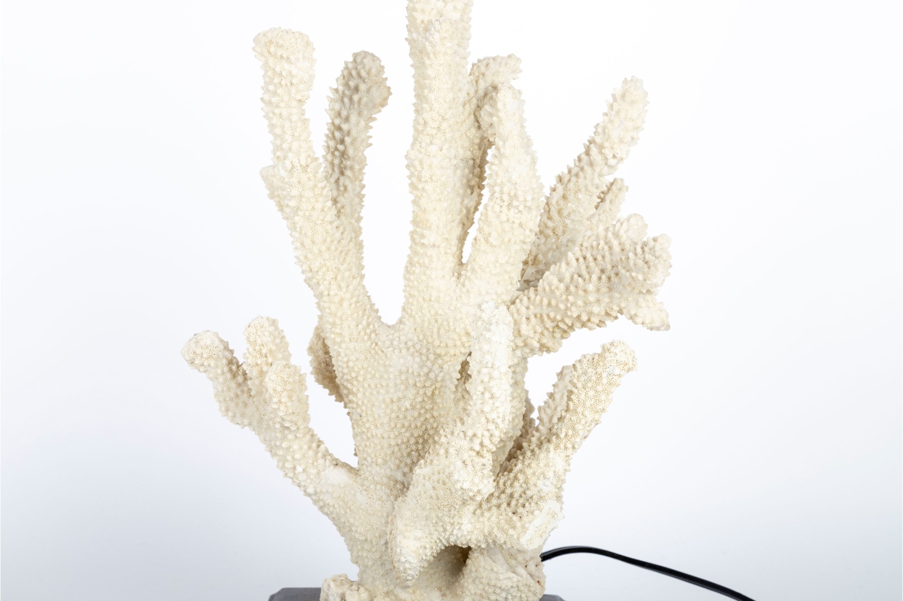 A stag horn coral table lamp featuring a base designed to mimic the intricate, branching structure of coral. The lamp combines a natural, coastal aesthetic with functional lighting. Harp and finial included. No lampshade included.