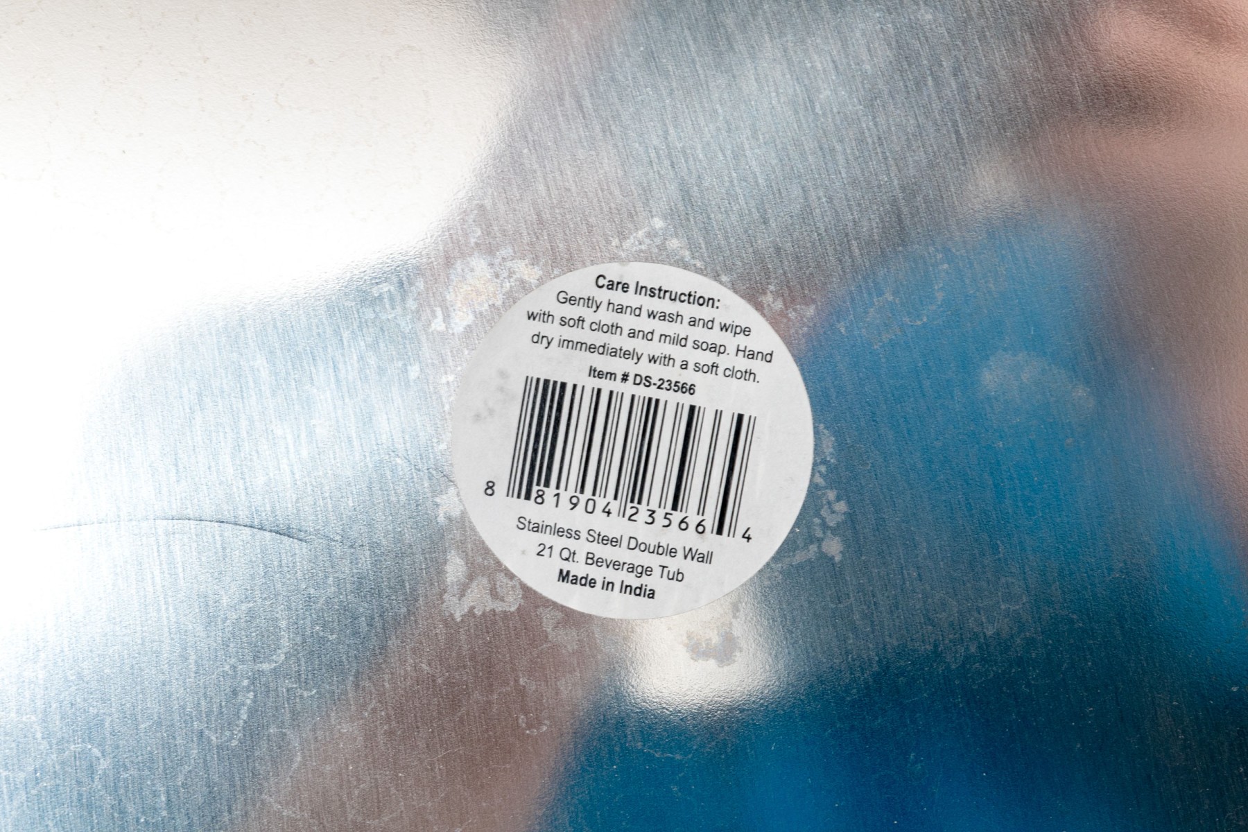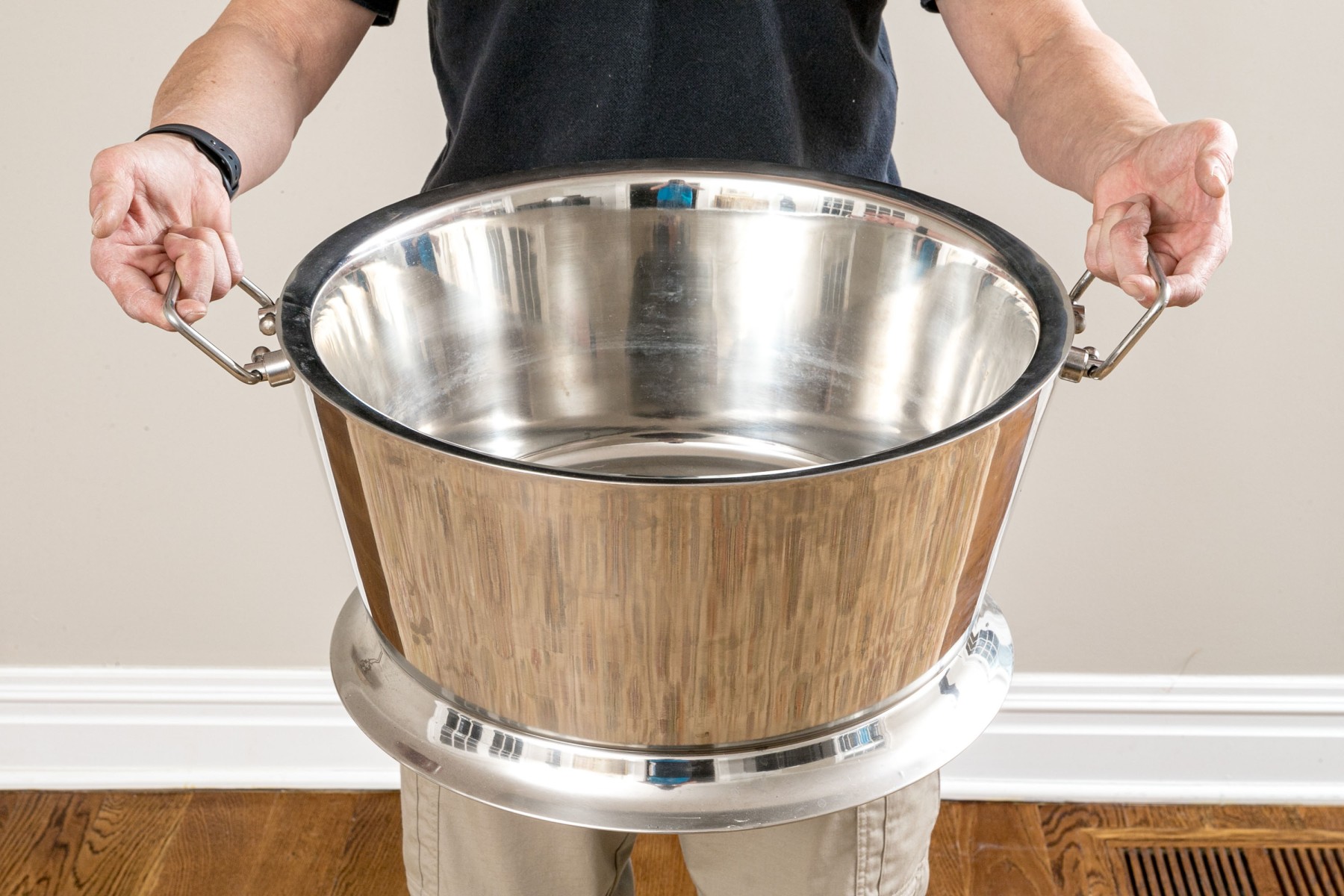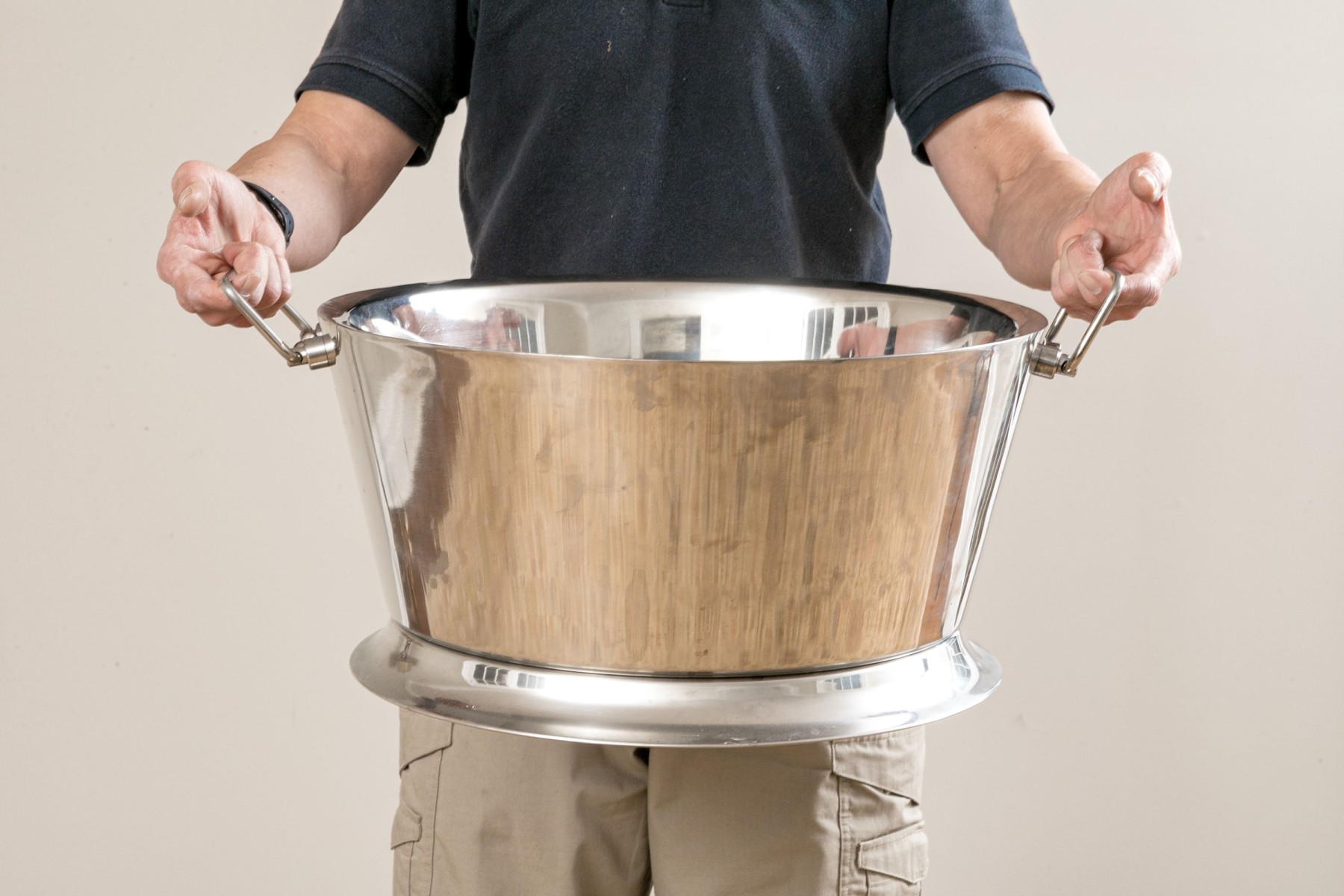 A beverage cooler that is perfect for parties with twin handles and a beveled base.