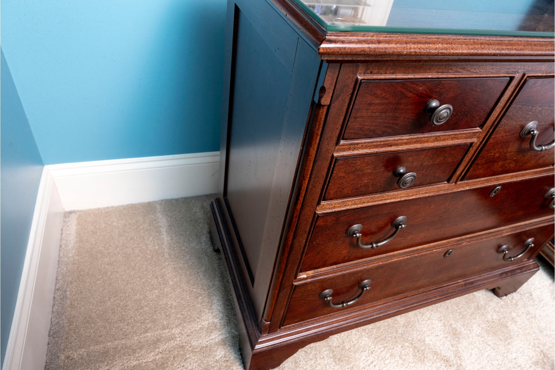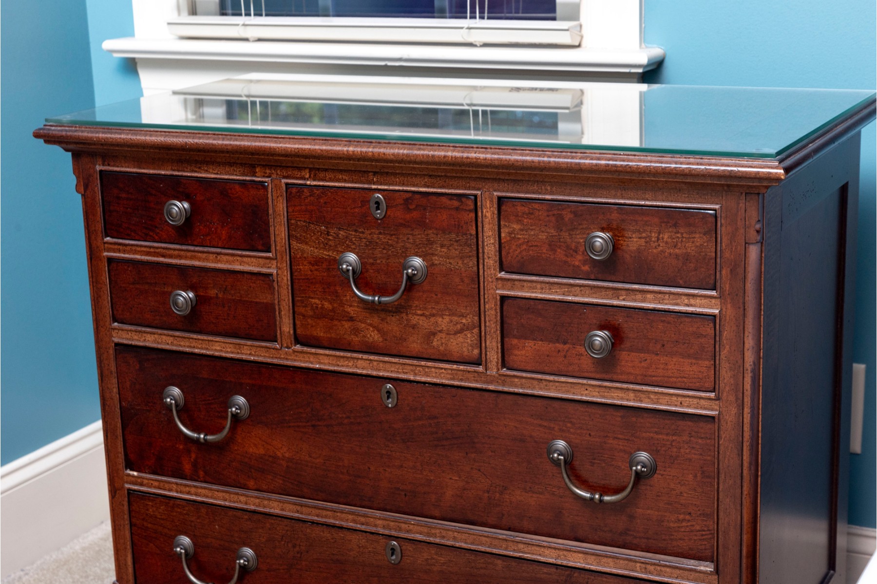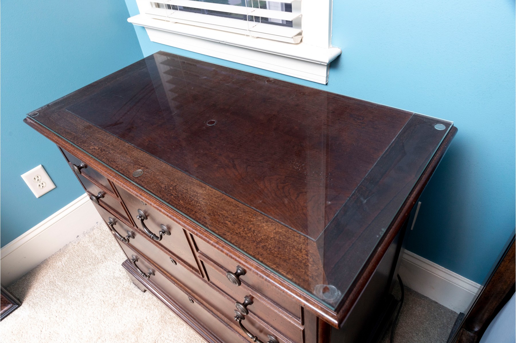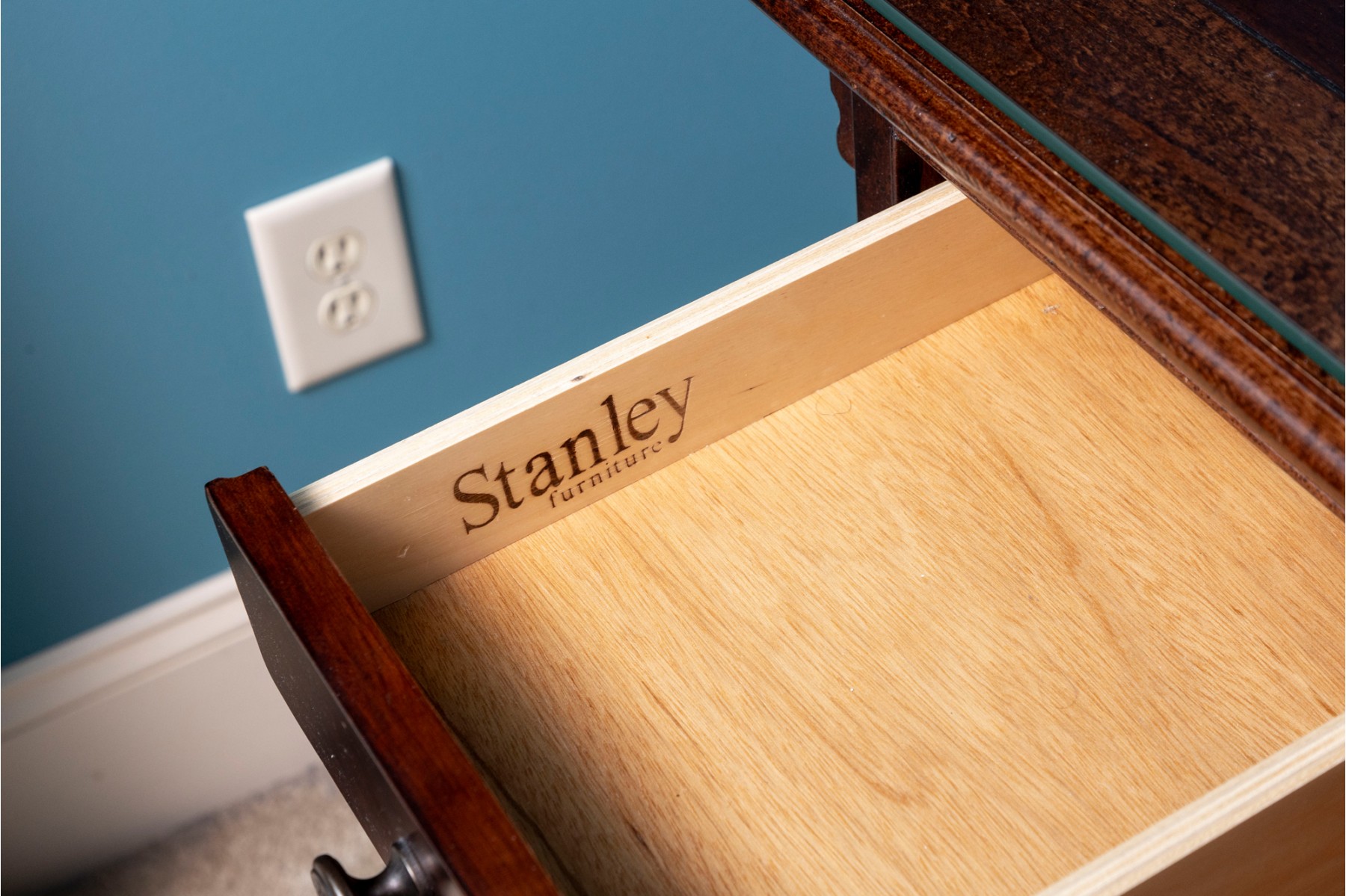 Produced by Stanley Furniture, this handsome chest showcases a rich walnut finish, scrolled apron legs, and seven dovetailed drawers adorned with black nickel hardware. Glass top included.