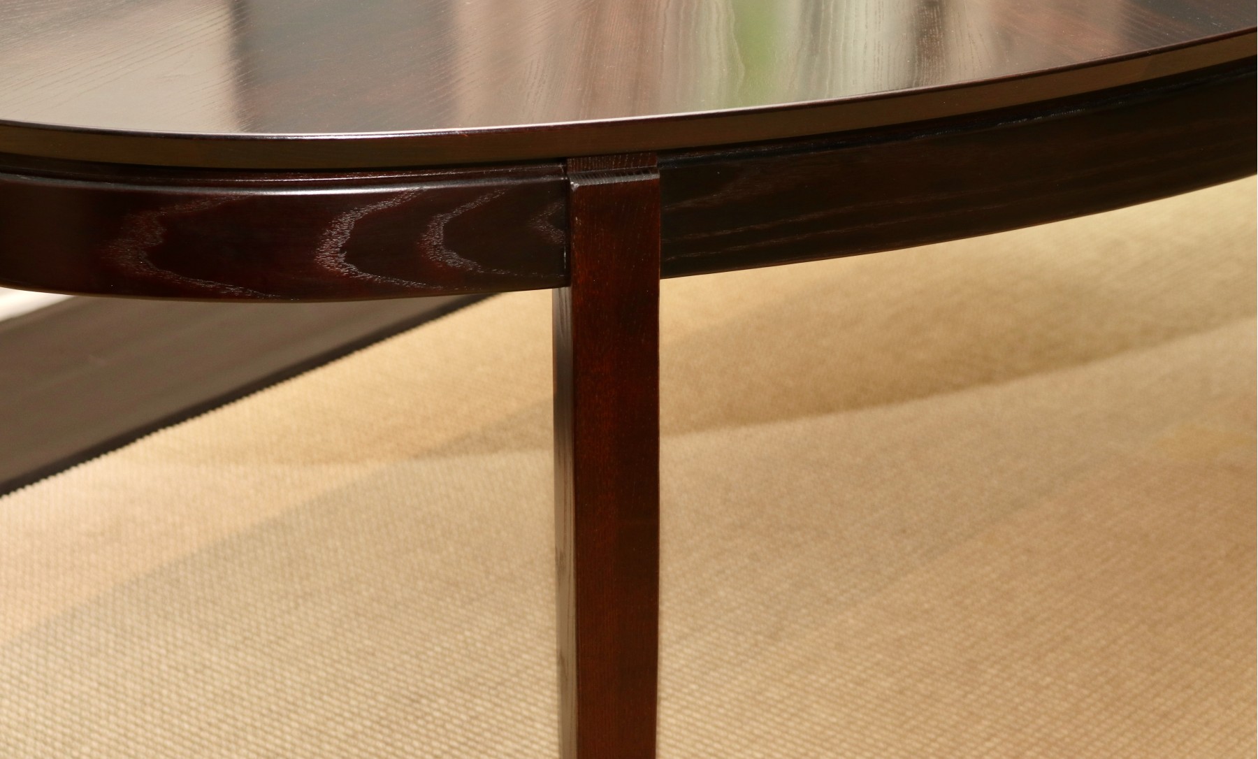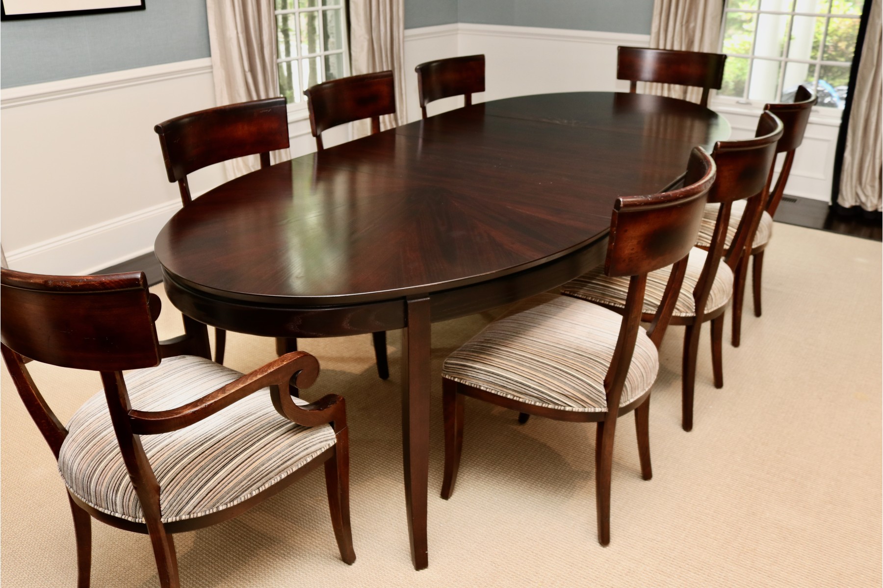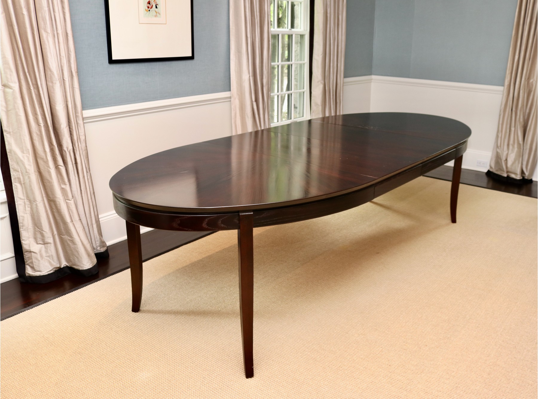 An elegant oval extension dining table in Dark Expresso by Stanley Furniture Company. The table features a dramatic starburst veneer top and gracefully tapered legs. It includes two extension leaves, making it ideal for both intimate dinners and formal entertaining. Coordinating chairs are offered separately in this auction.