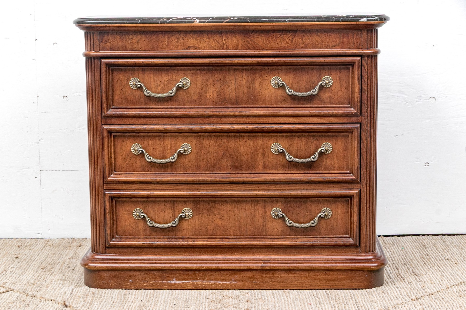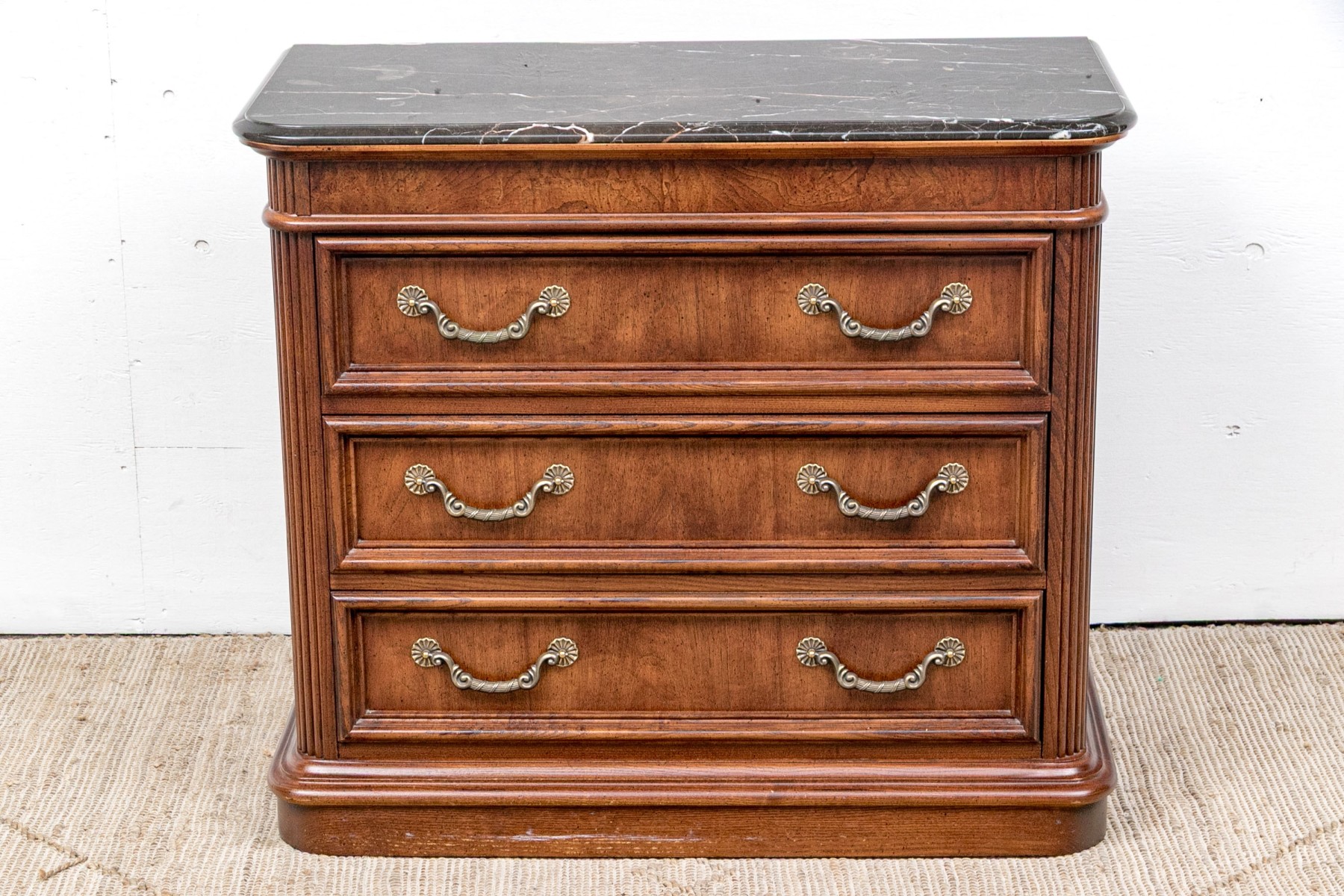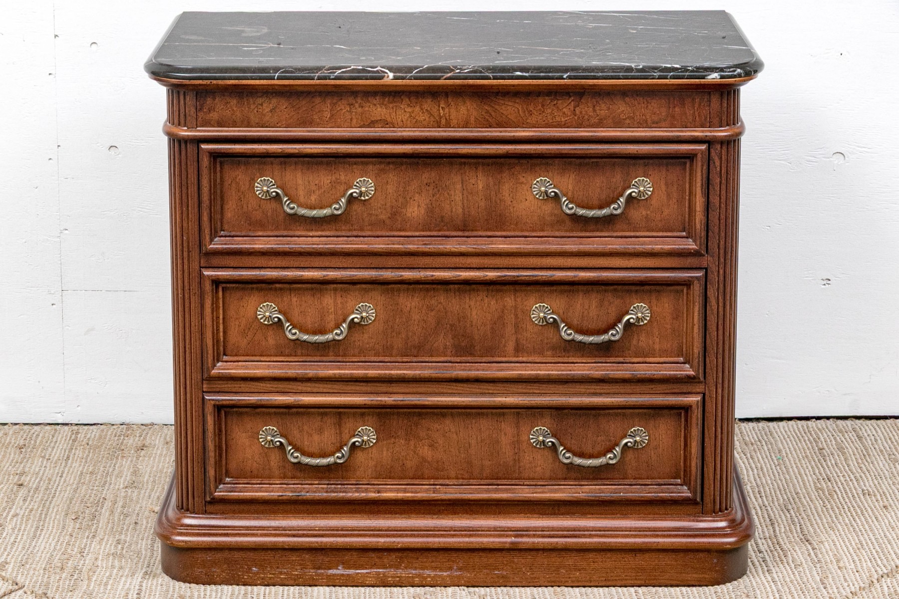 An elegant design with three drawers with decorative brass bales. With a dark marble top, reeded supports and raised on a carved base.