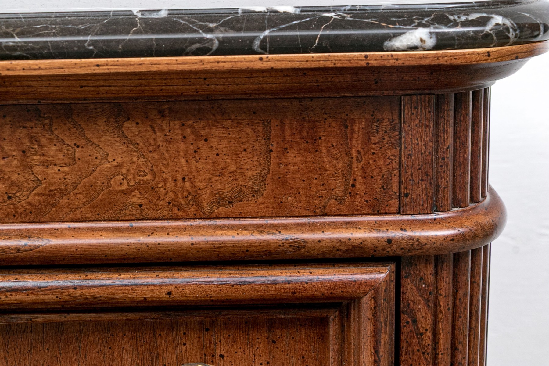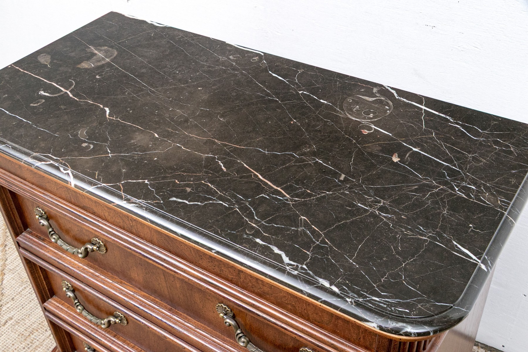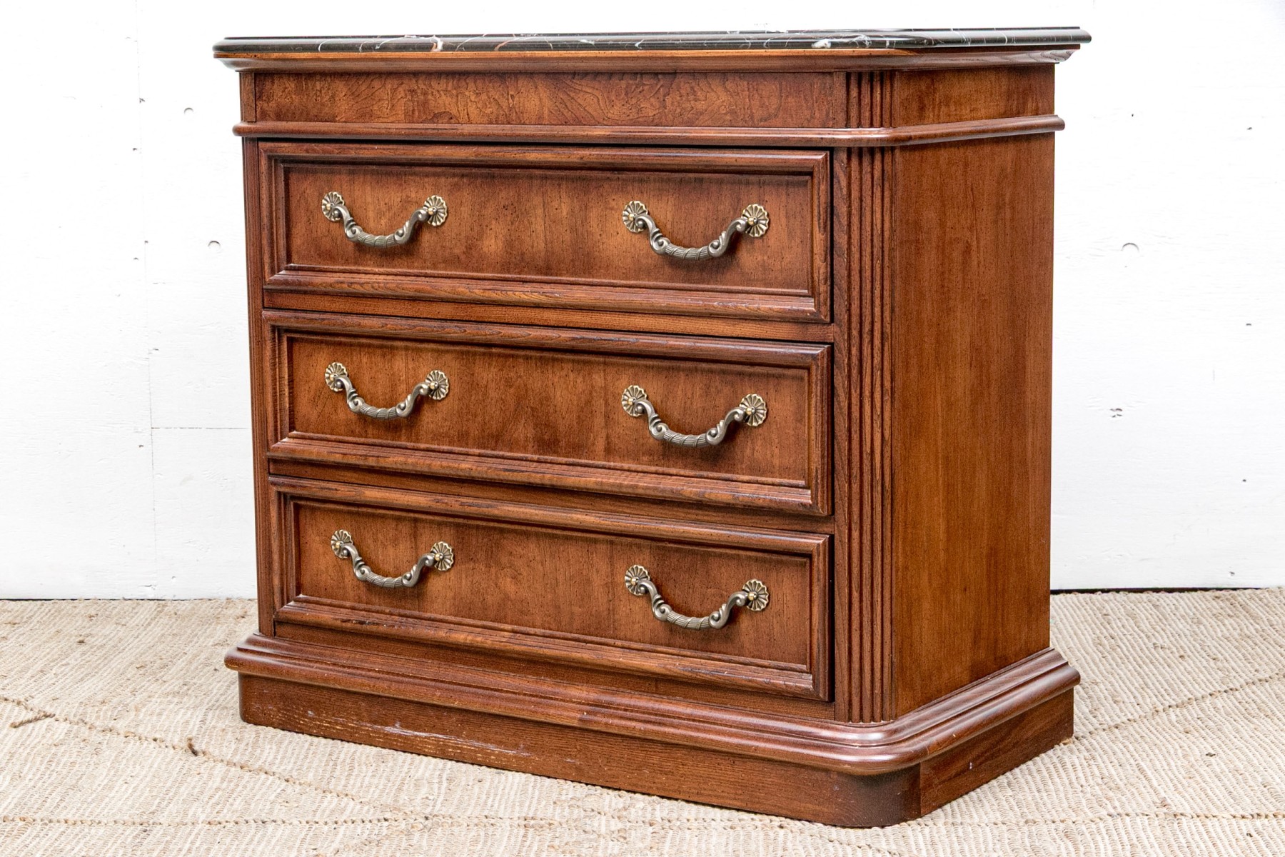 An elegant design with three drawers with decorative brass bales. With a dark marble top, reeded supports and raised on a carved base.