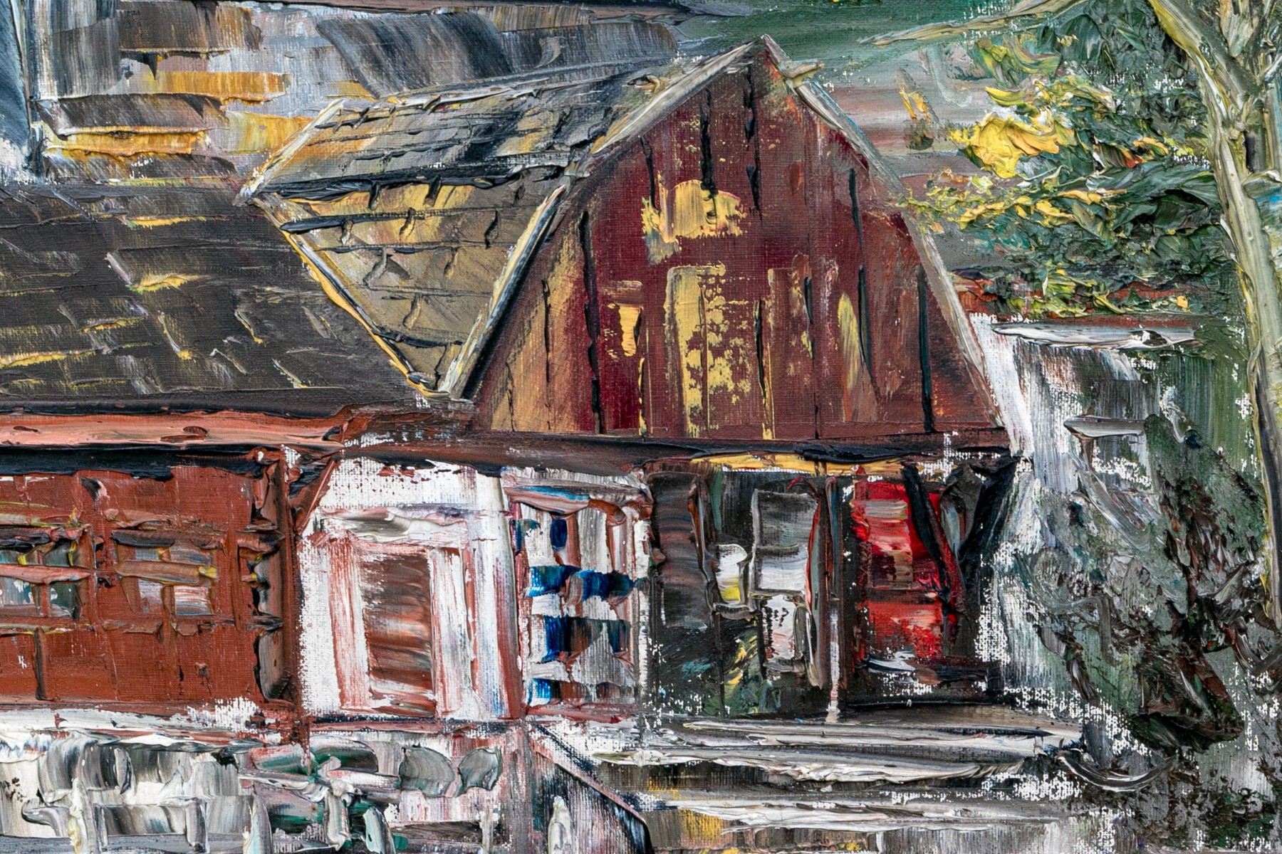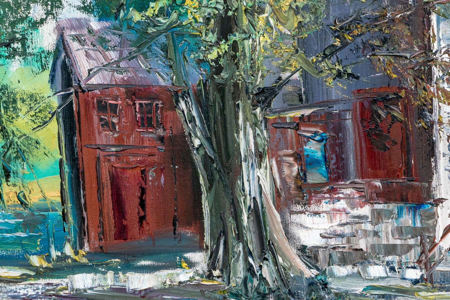 Stanley Sobossek (American, 1918-1996) oil on canvas depicting a wonderful, impressionistic rustic building in white, red, and yellow along a white plaza dotted with autumnal trees. Signed lower right.