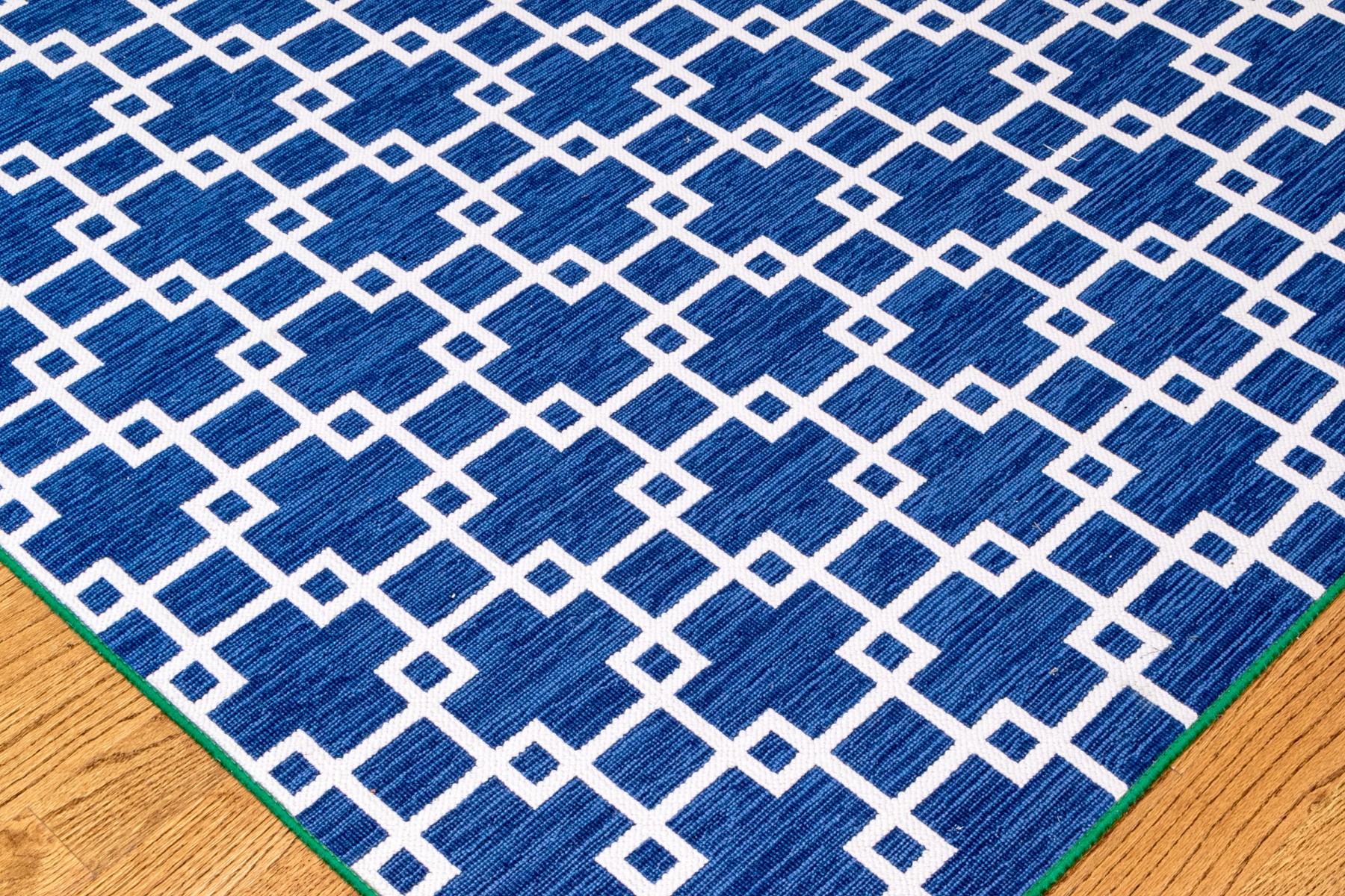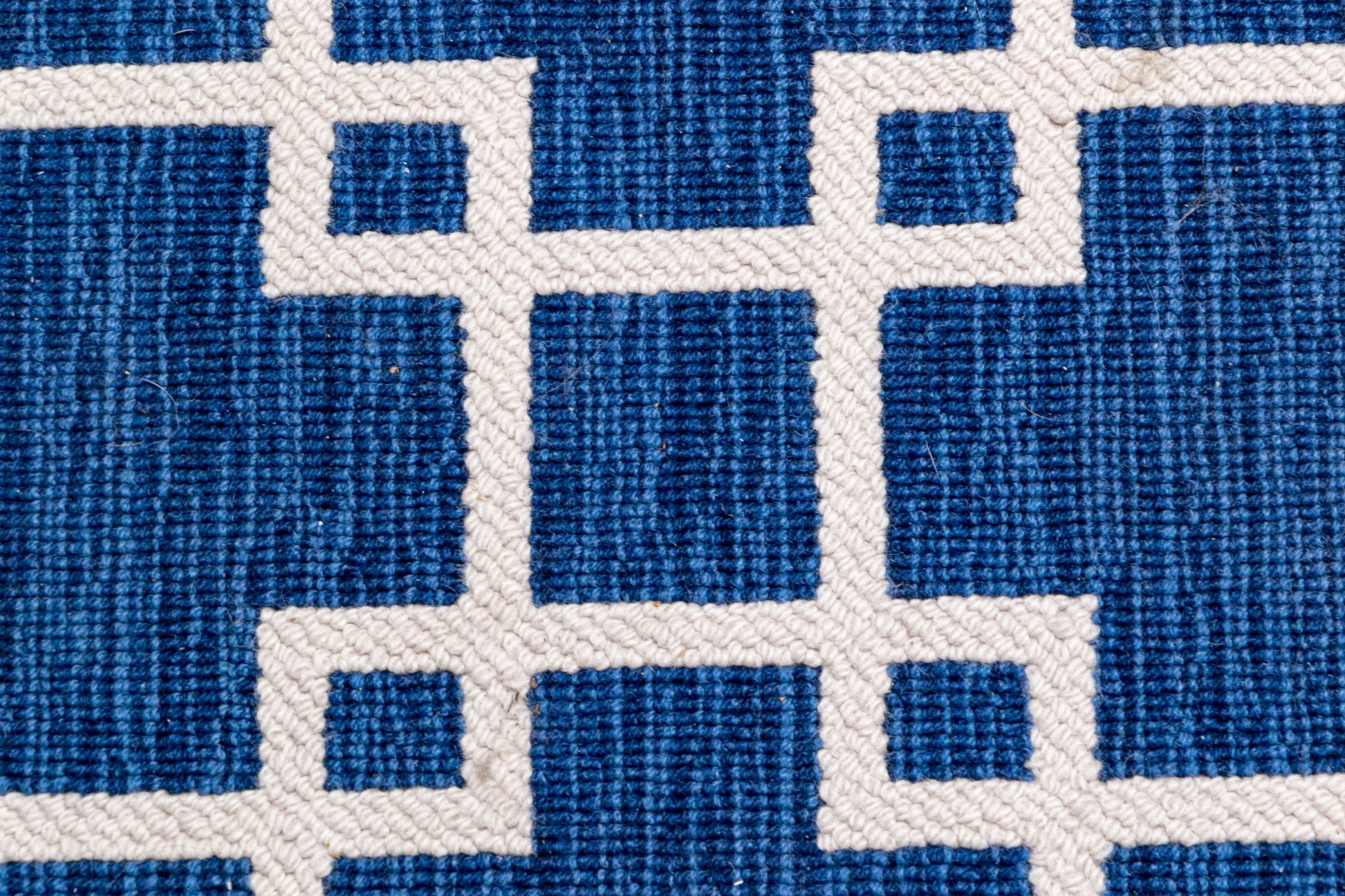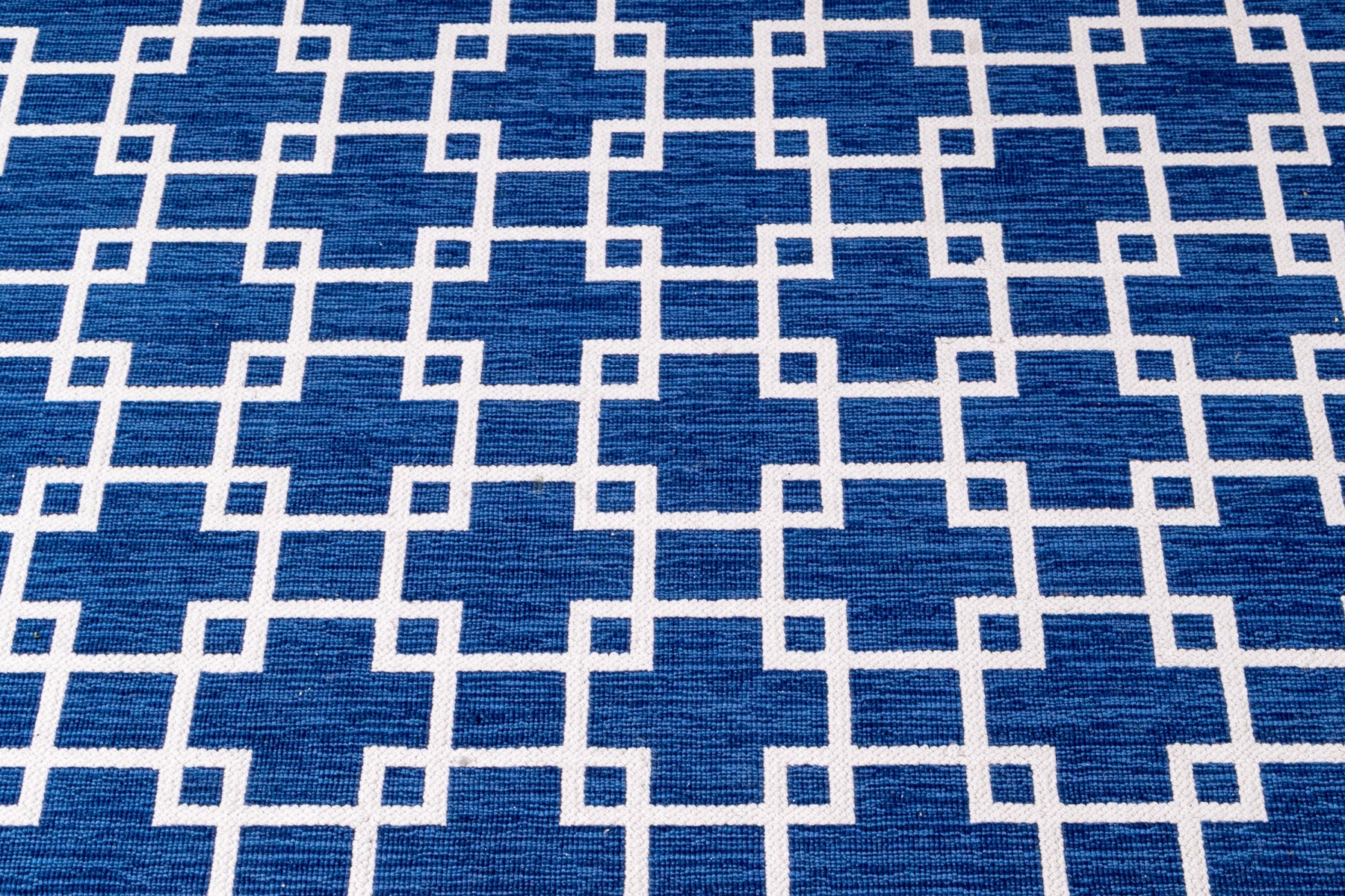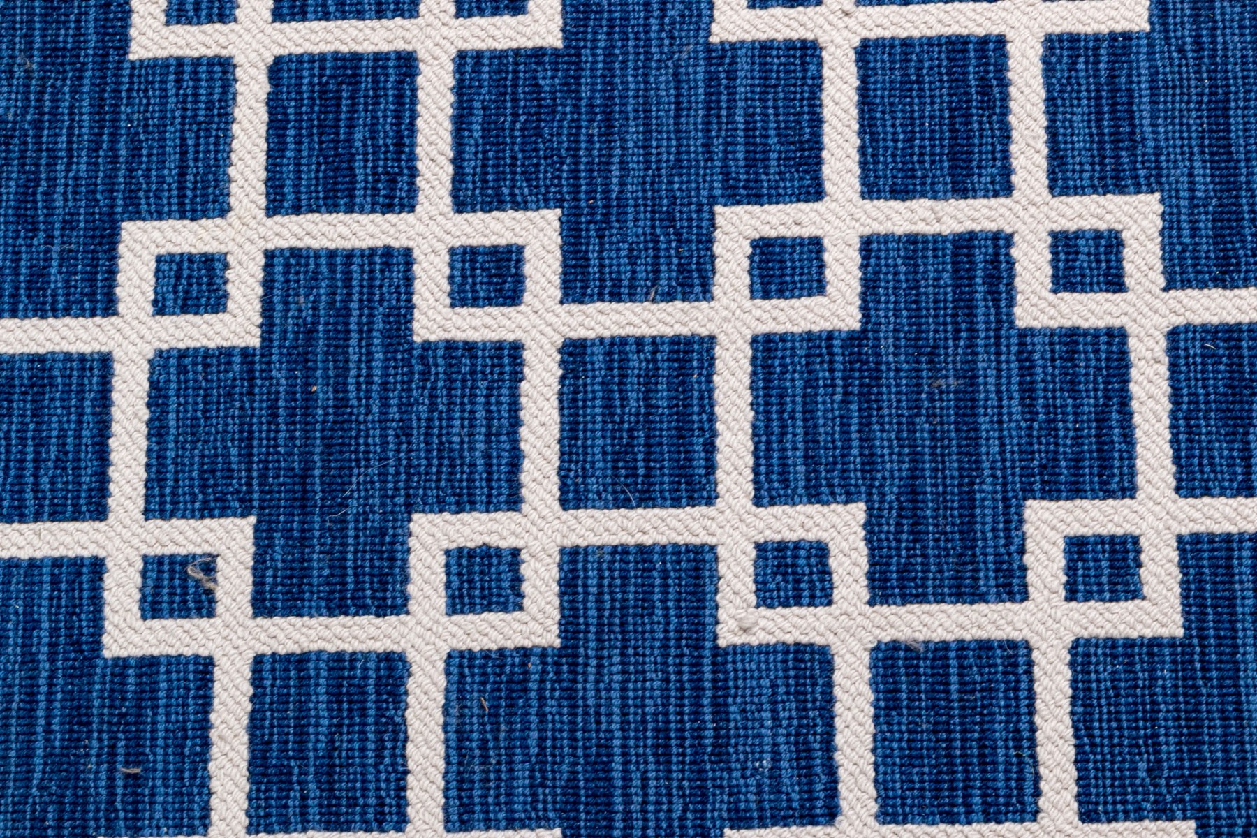 Chic geometric decoration with interlocking white hued cubes over a deep blue ground.