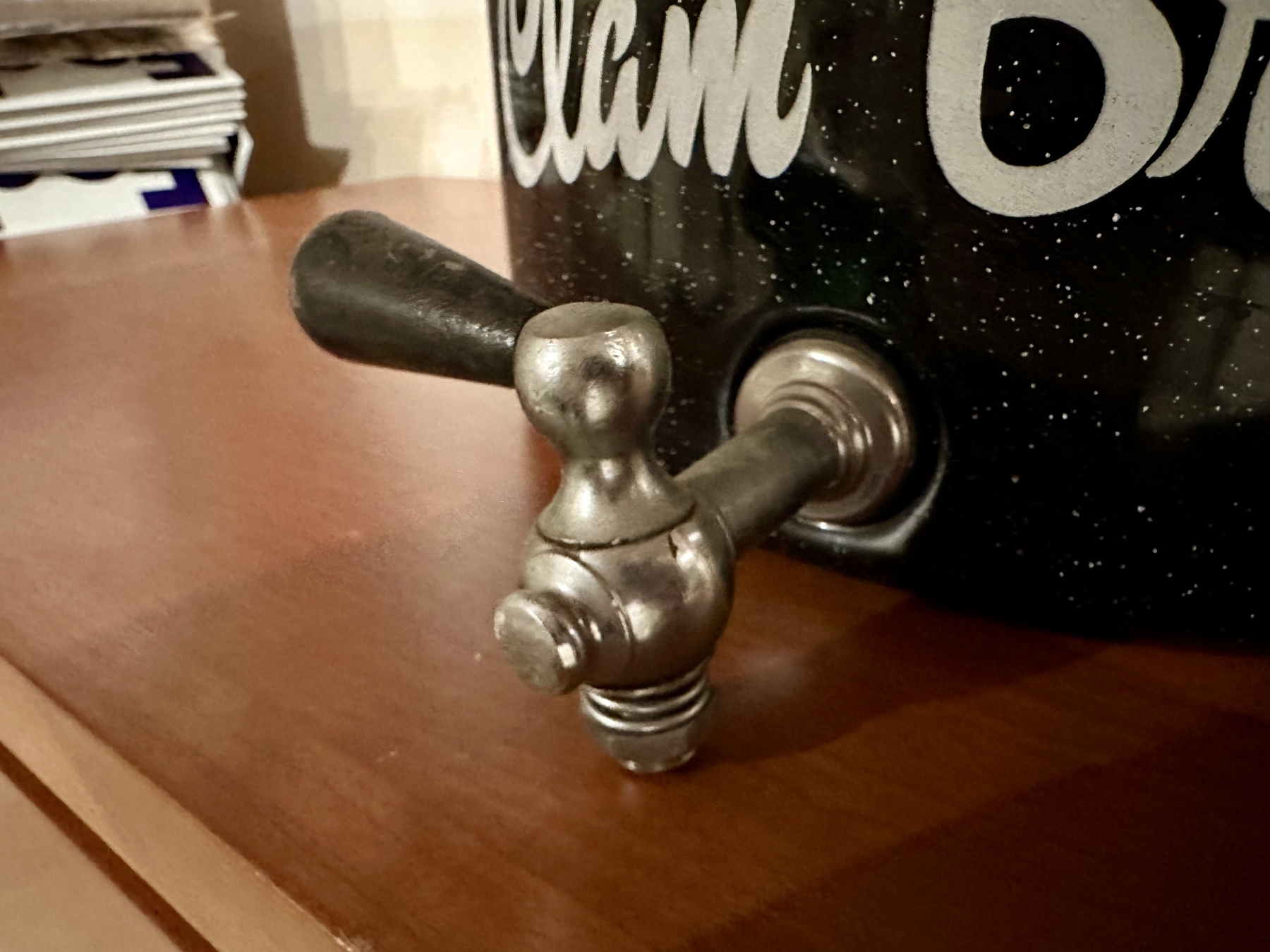 A delightful two-part clam pot featuring a lidded steamer top and a lower compartment with a spigot. Enameled classic black with fine white splatter patterns and labeled in a decorative typeface "steamed clams" and "clam broth."