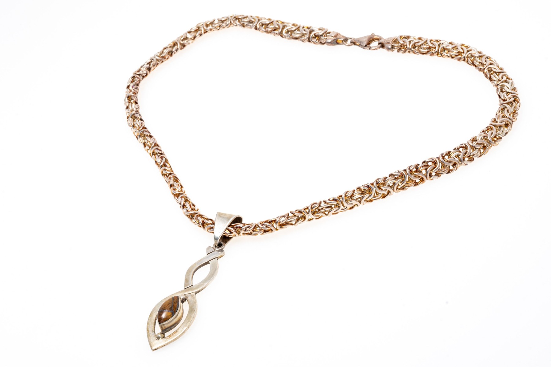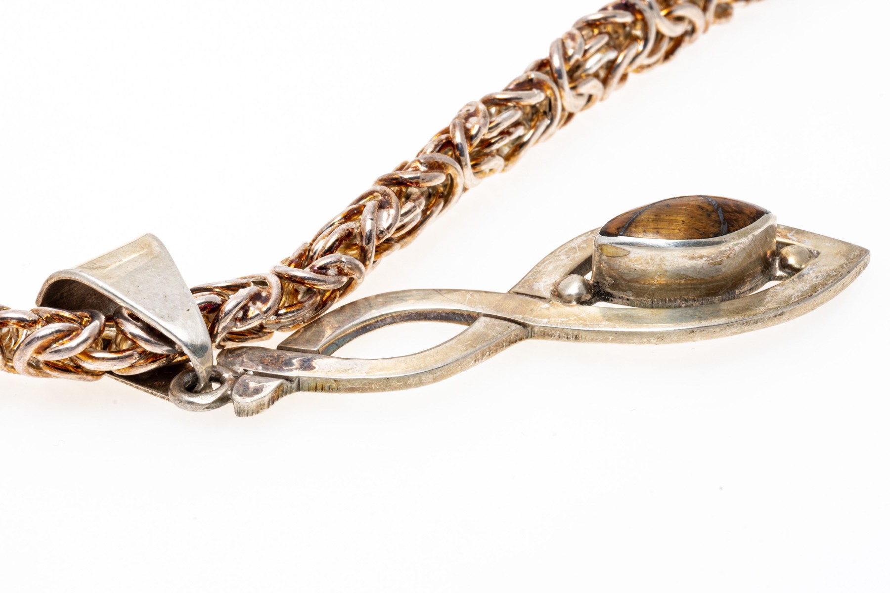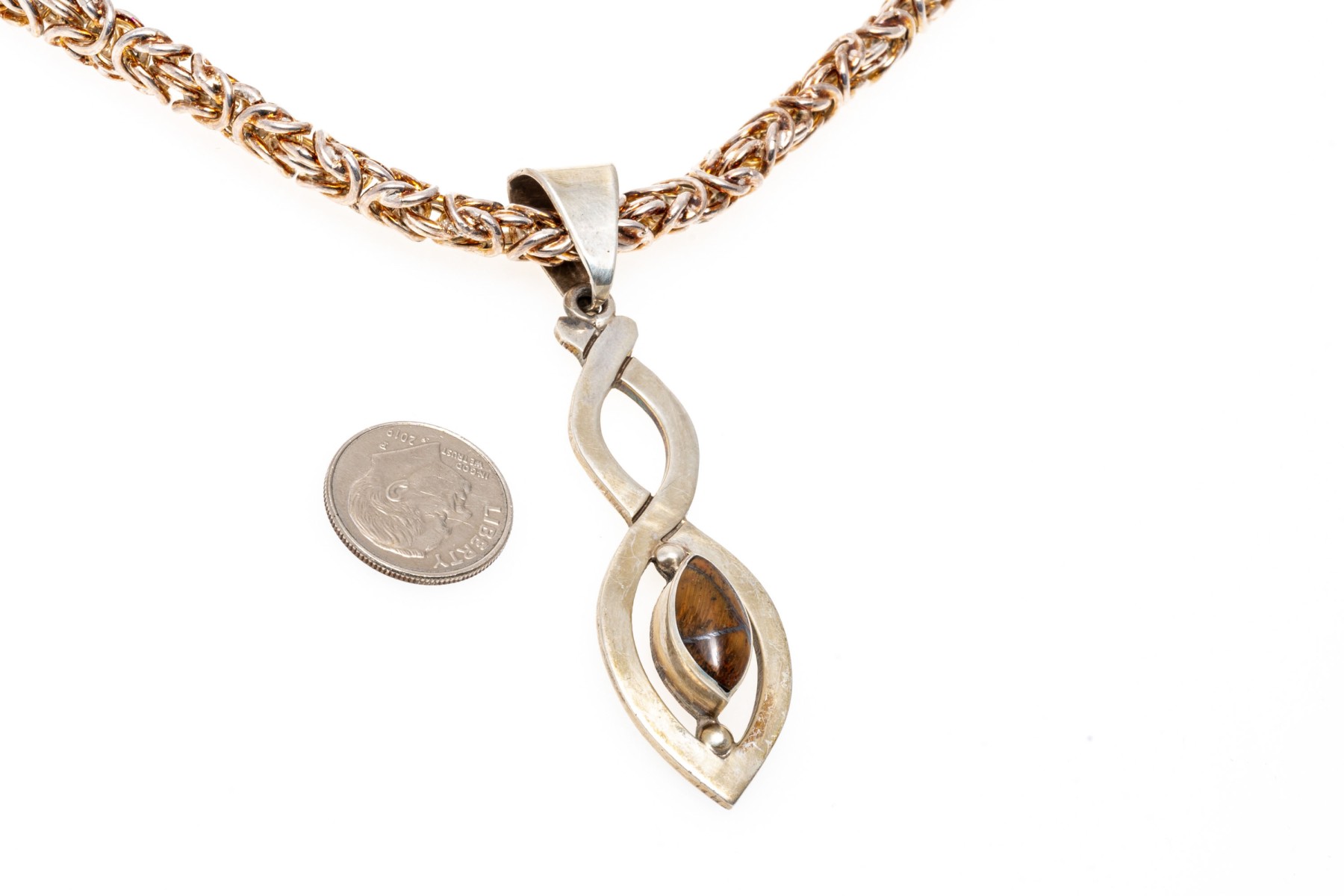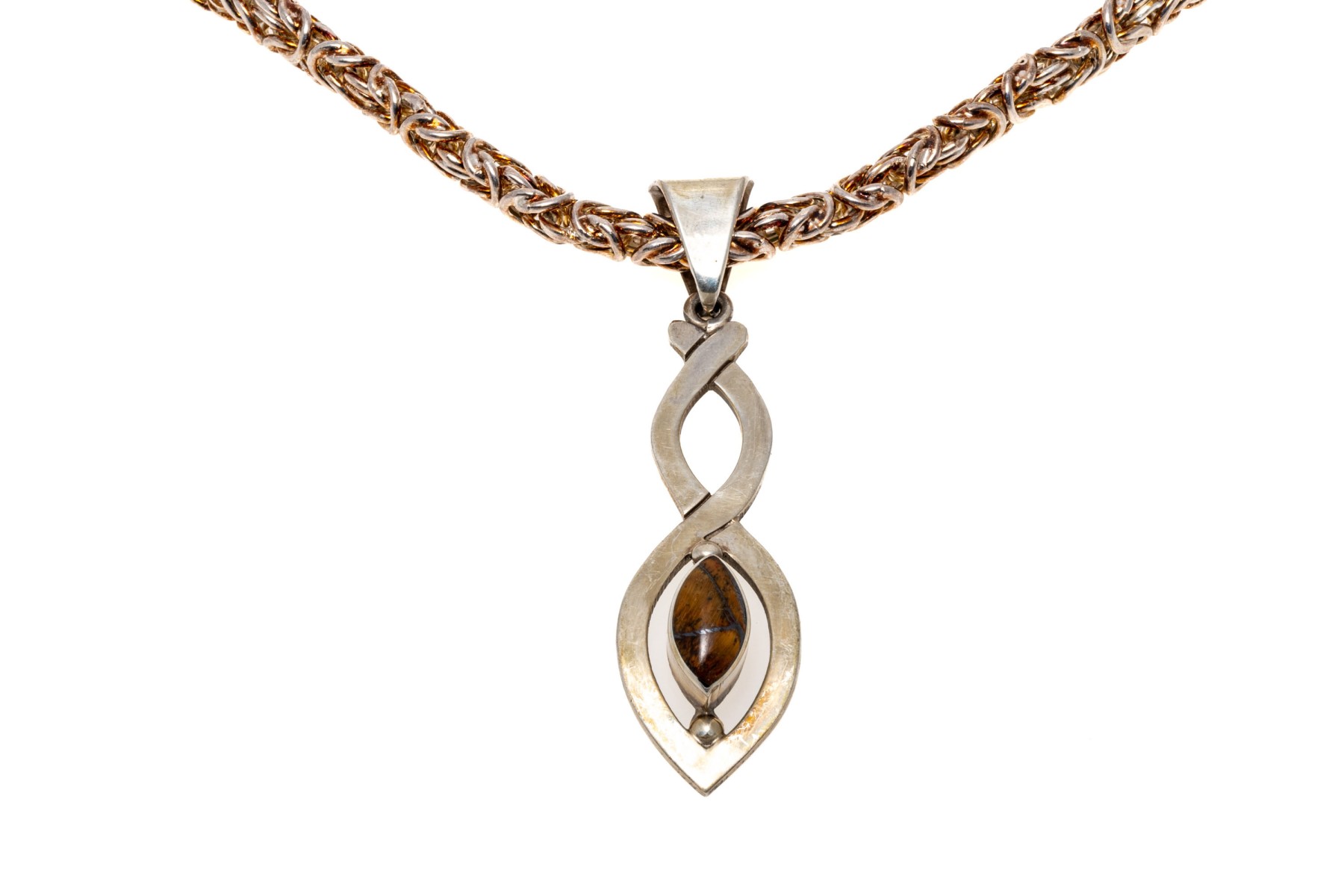 Handsome sterling silver pendant necklace. A Byzantine style chain necklace with a lobster claw clasp. Suspended from the chain is a drop style, twist pendant set with a single tigers eye stone.