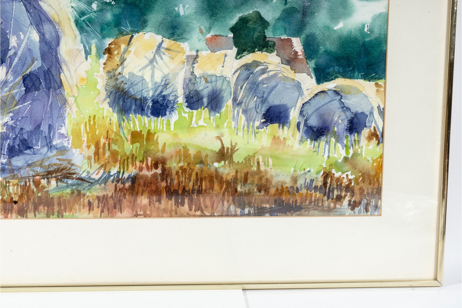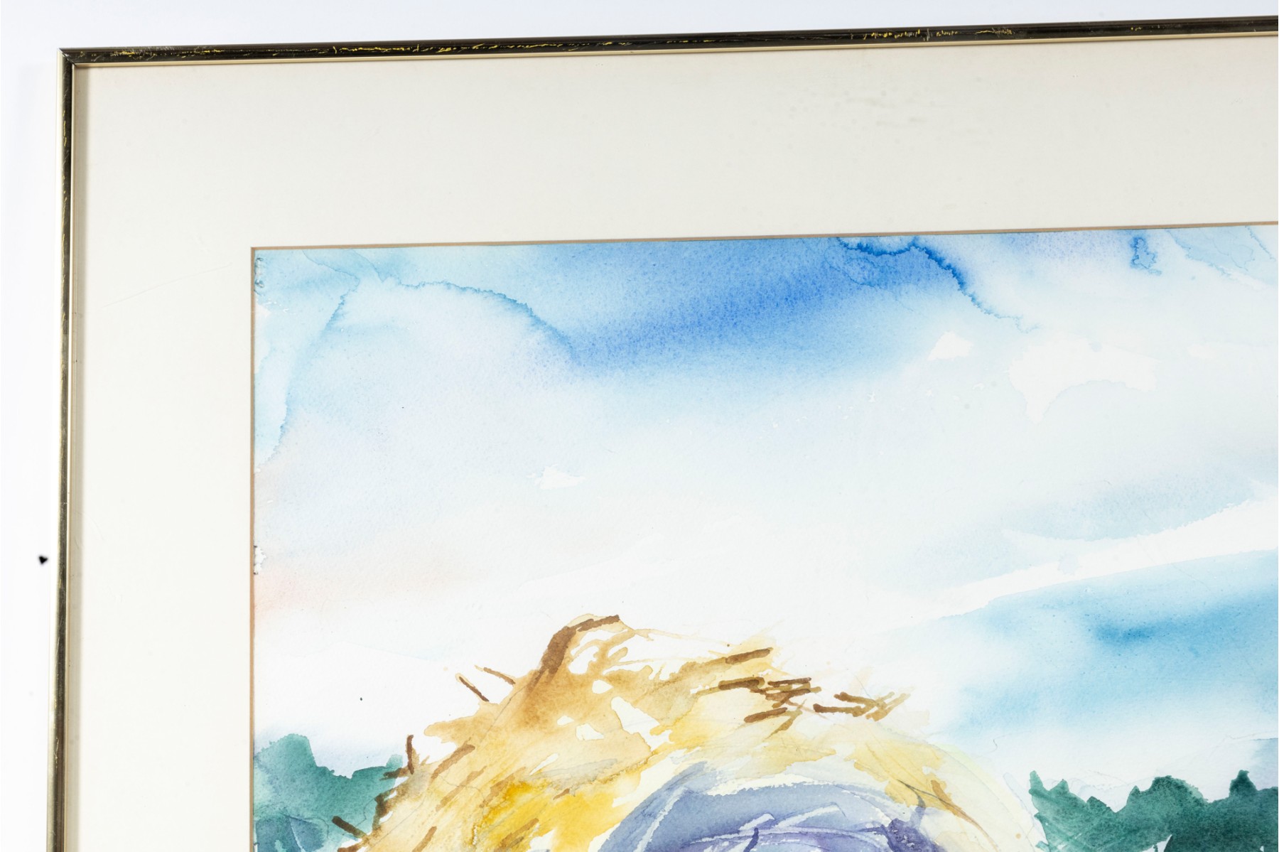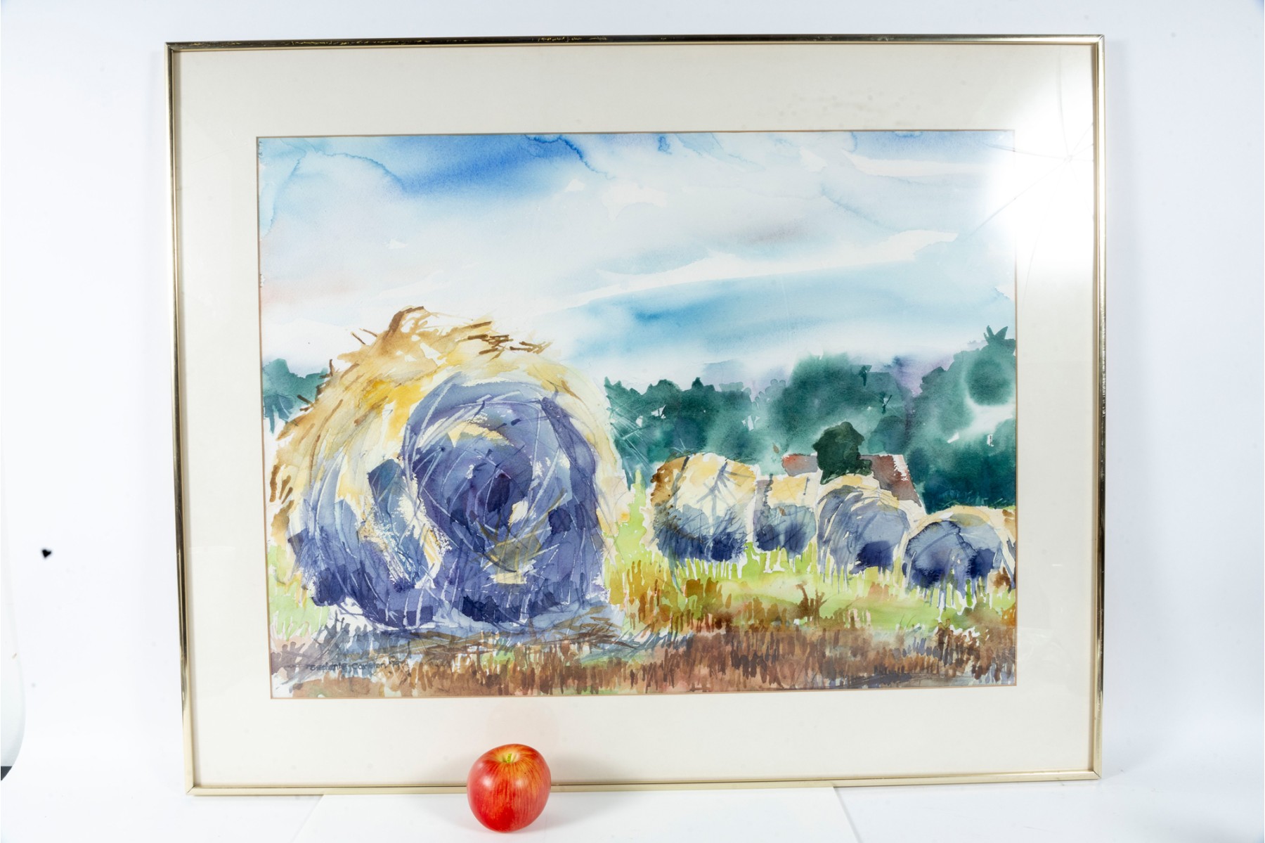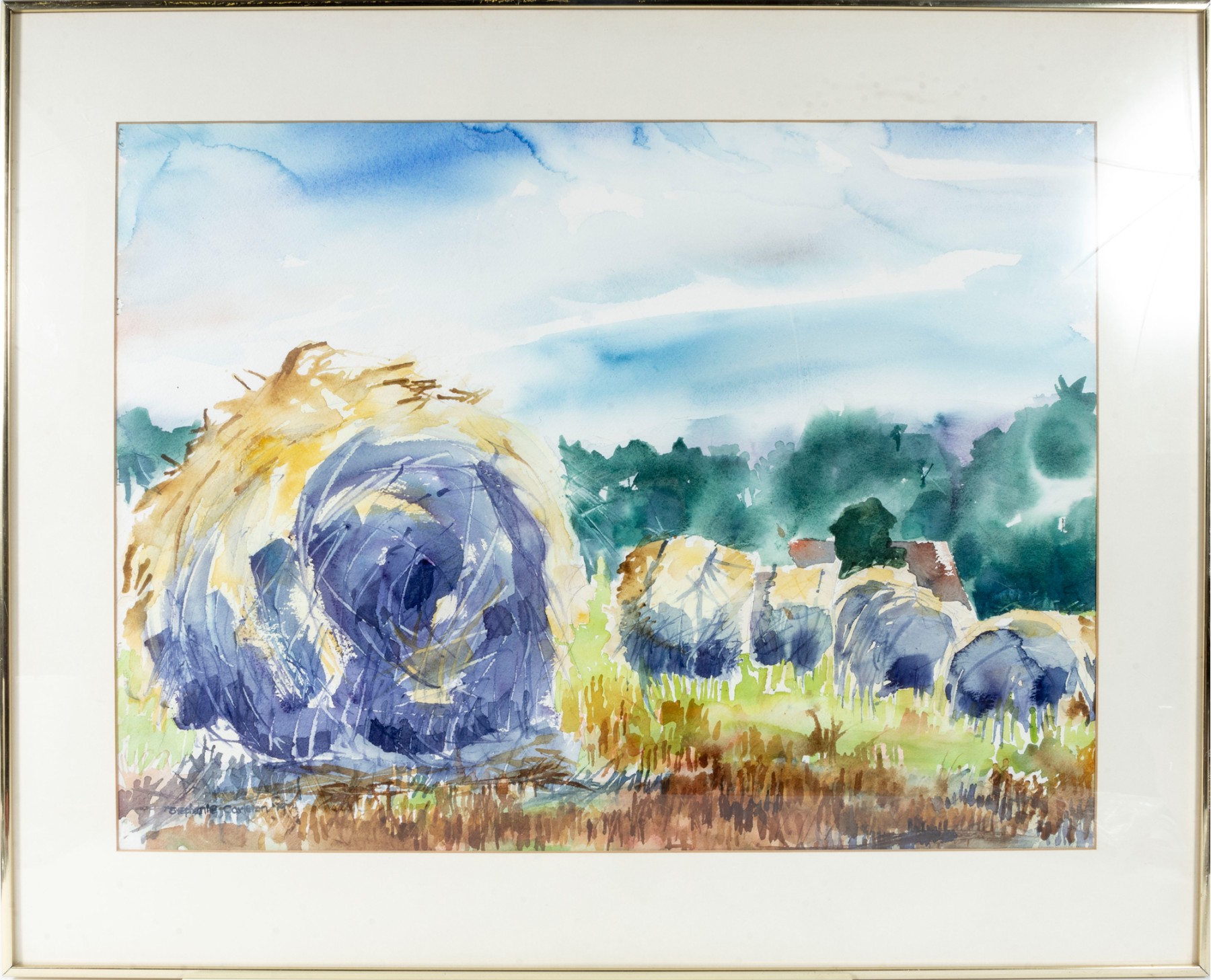 A vibrant painting entitled, "Hay" by Stephanie Carleton. Stephanie's works are heavily influenced by the rural cultures of the southwest and Mexico, specializing in landscapes and figural paintings in watercolor. Depicted here is farmland rich with large hay bales -- colors loosely blended for rich contrast between rich pigments and the plain white paper background.