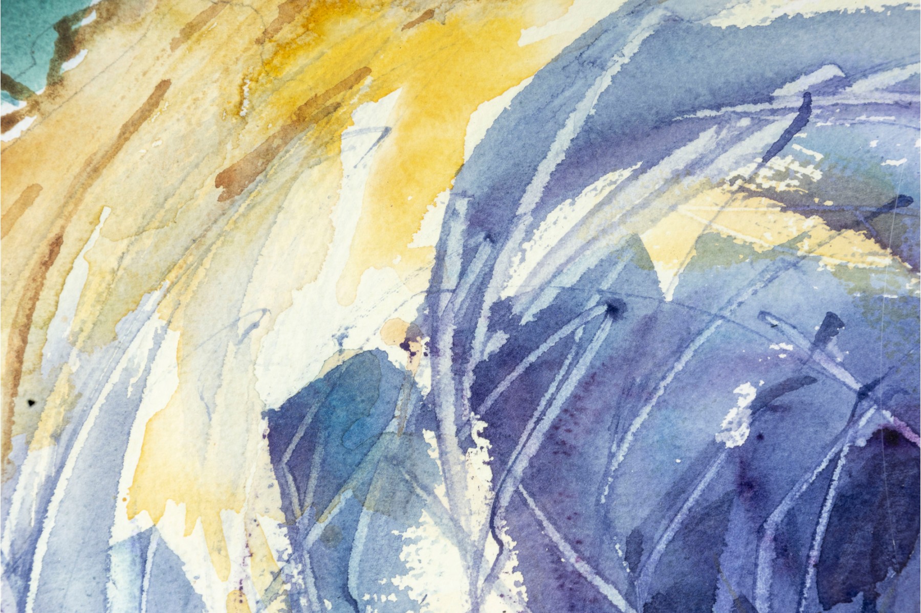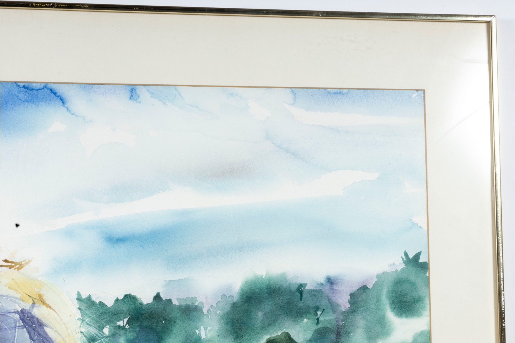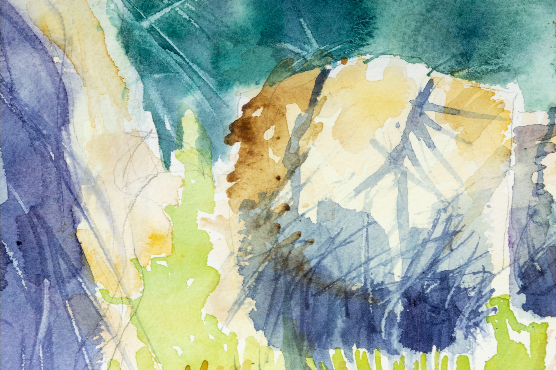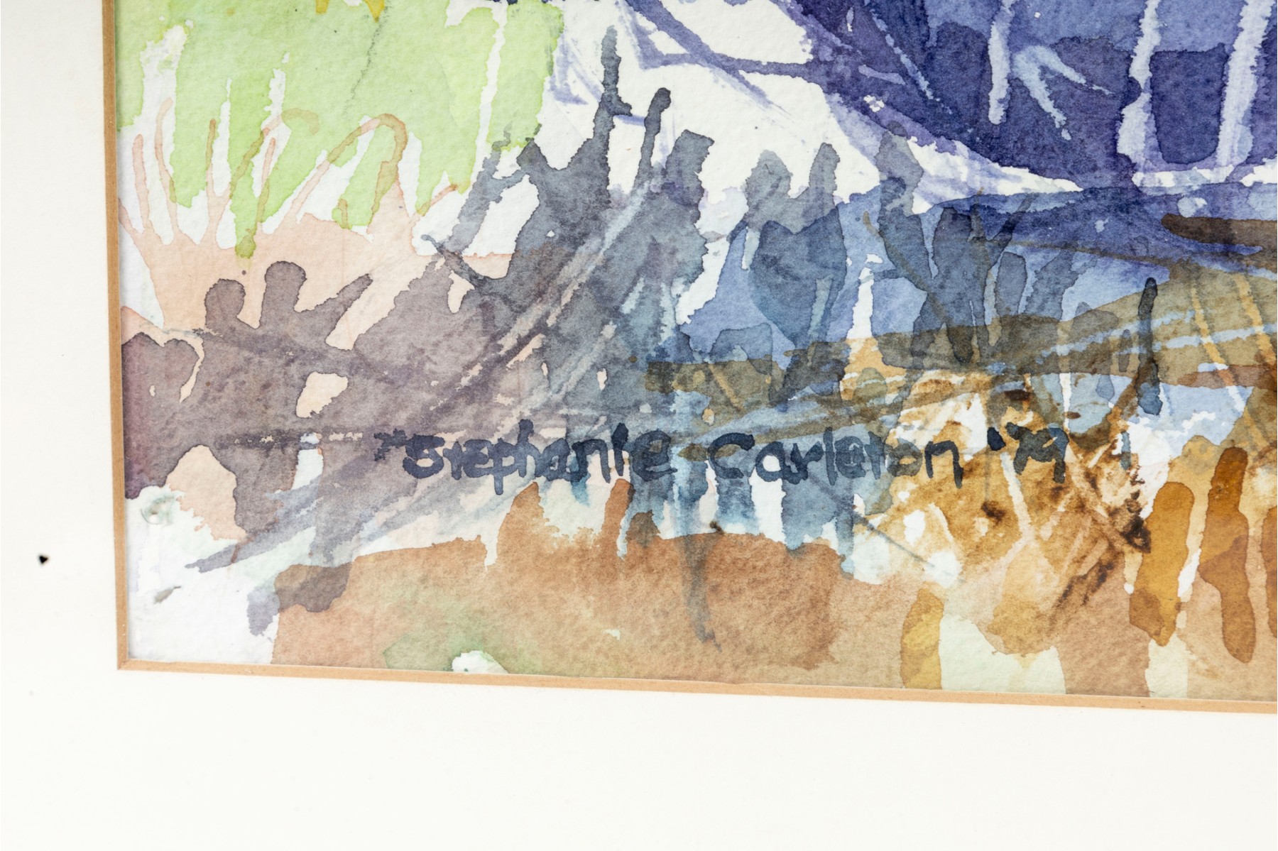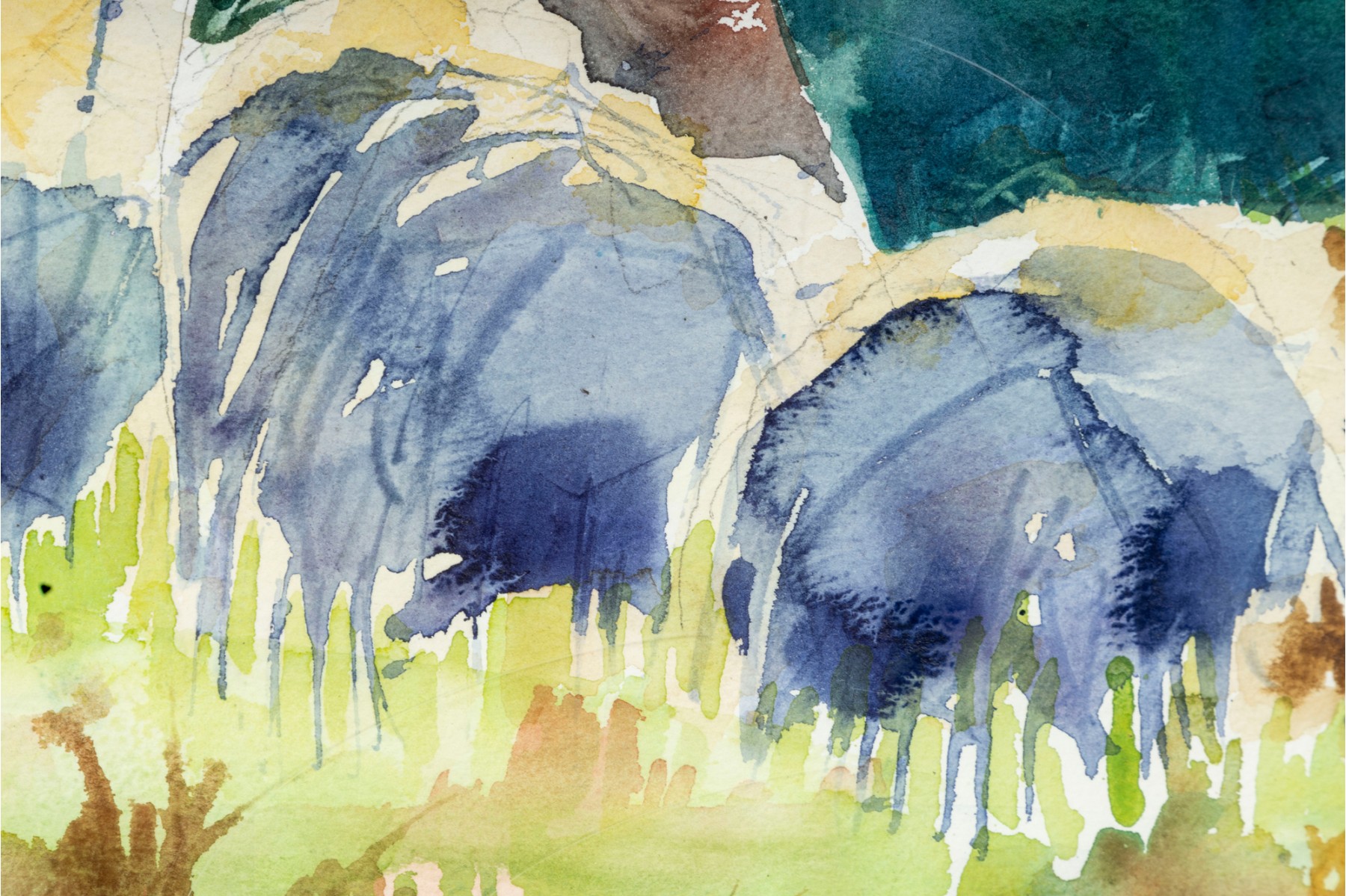 A vibrant painting entitled, "Hay" by Stephanie Carleton. Stephanie's works are heavily influenced by the rural cultures of the southwest and Mexico, specializing in landscapes and figural paintings in watercolor. Depicted here is farmland rich with large hay bales -- colors loosely blended for rich contrast between rich pigments and the plain white paper background.