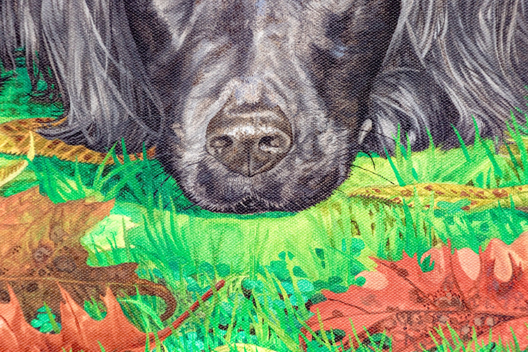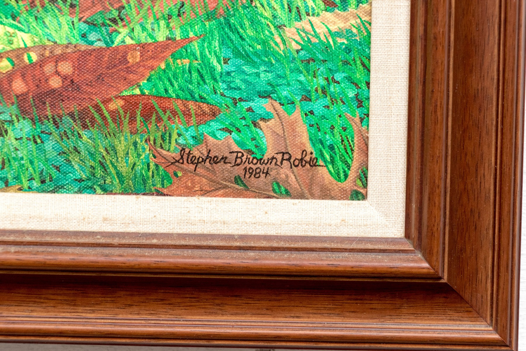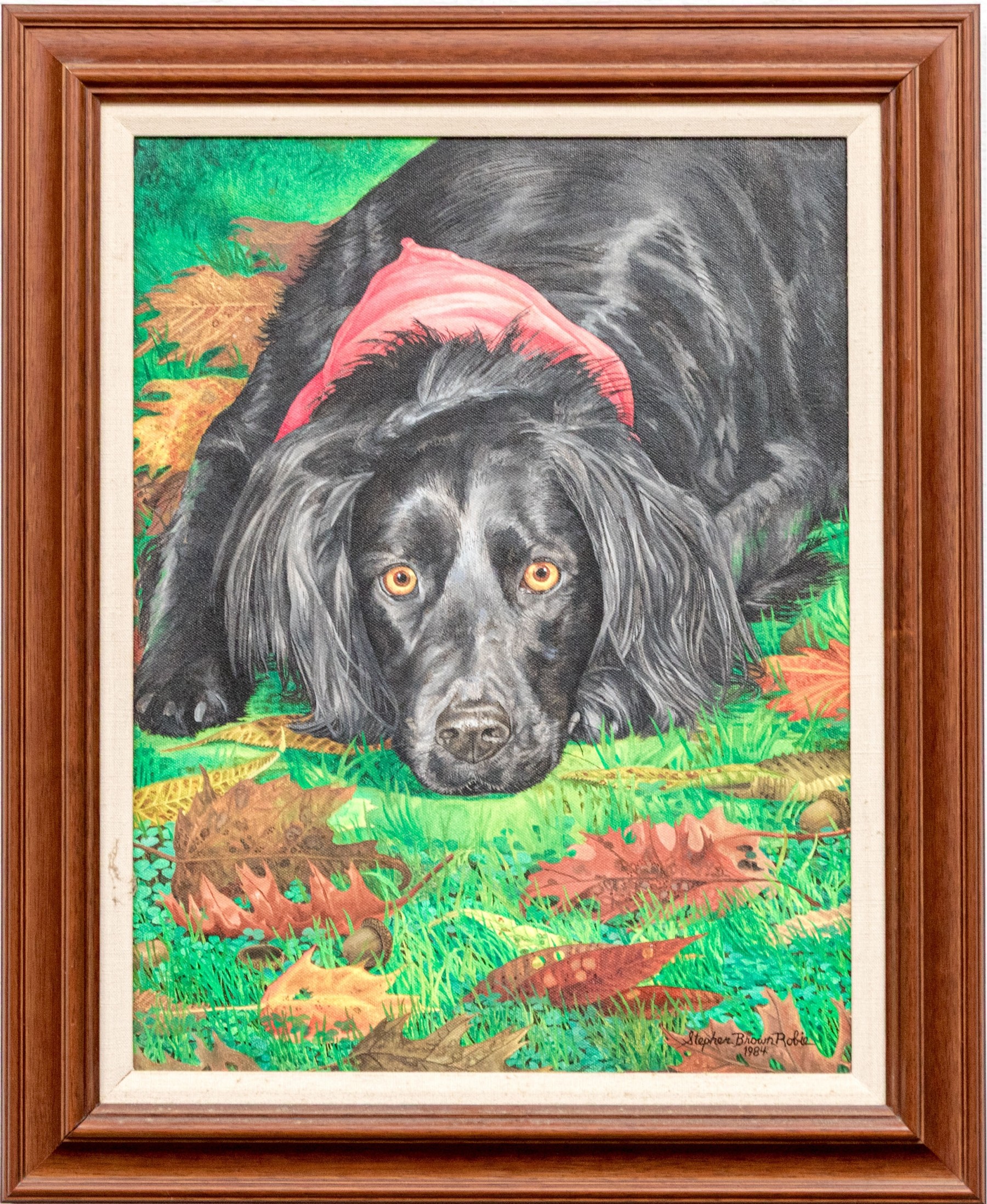 Stephen Brown Robie (American [MA], b. 19534) oil painting on canvas depicting a portrait of a dog with shiny black fur, long floppy ears, and striking amber eyes wearing a red bandana while resting on a vibrant green grassy field dotted with autumnal red and orange foliage with acorns. Signed and dated 1984 lower right.