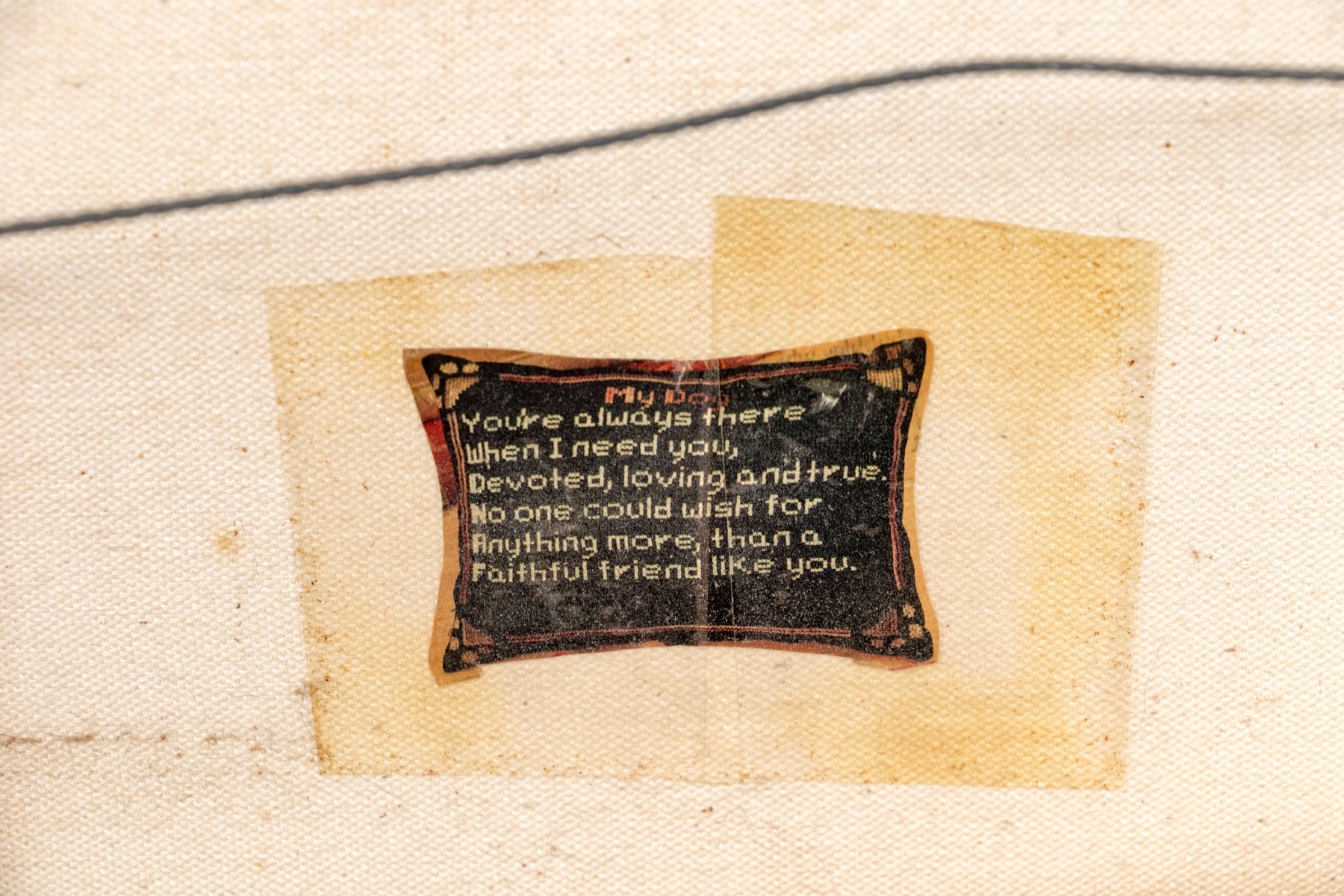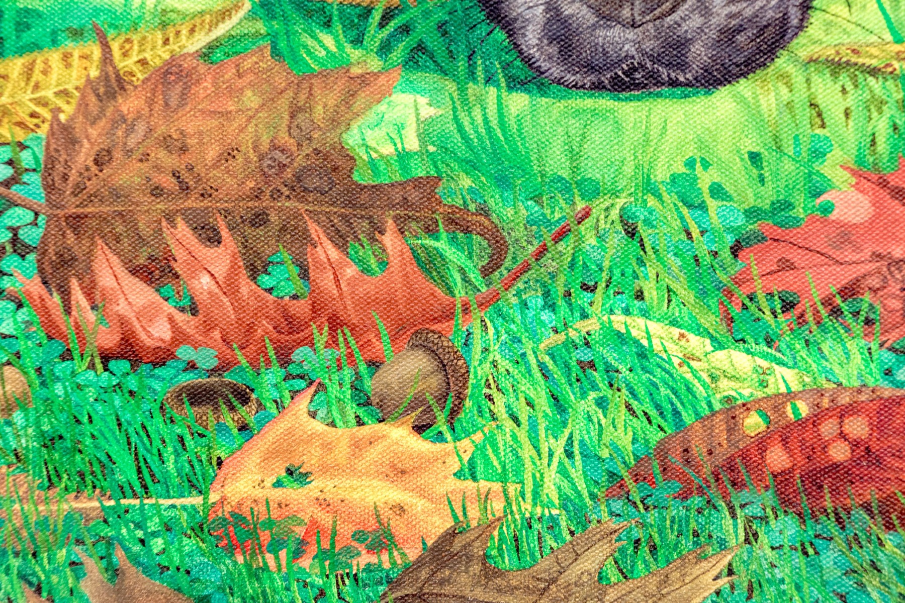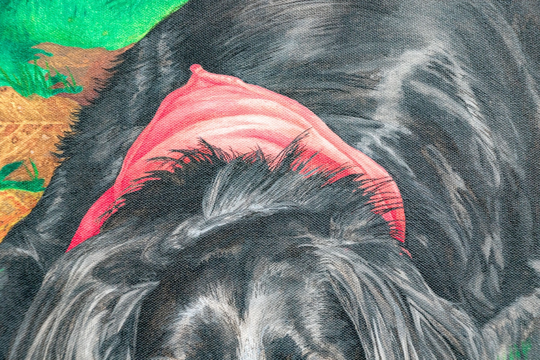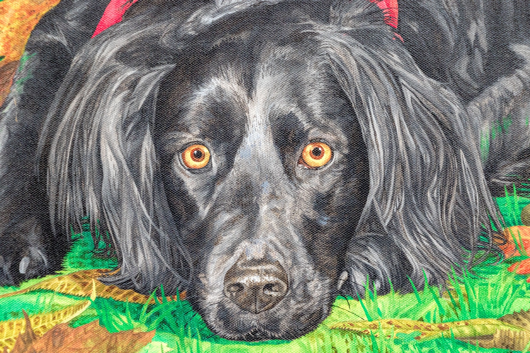 Stephen Brown Robie (American [MA], b. 19534) oil painting on canvas depicting a portrait of a dog with shiny black fur, long floppy ears, and striking amber eyes wearing a red bandana while resting on a vibrant green grassy field dotted with autumnal red and orange foliage with acorns. Signed and dated 1984 lower right.
