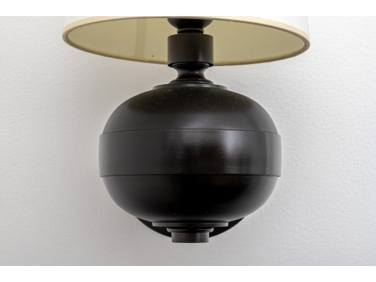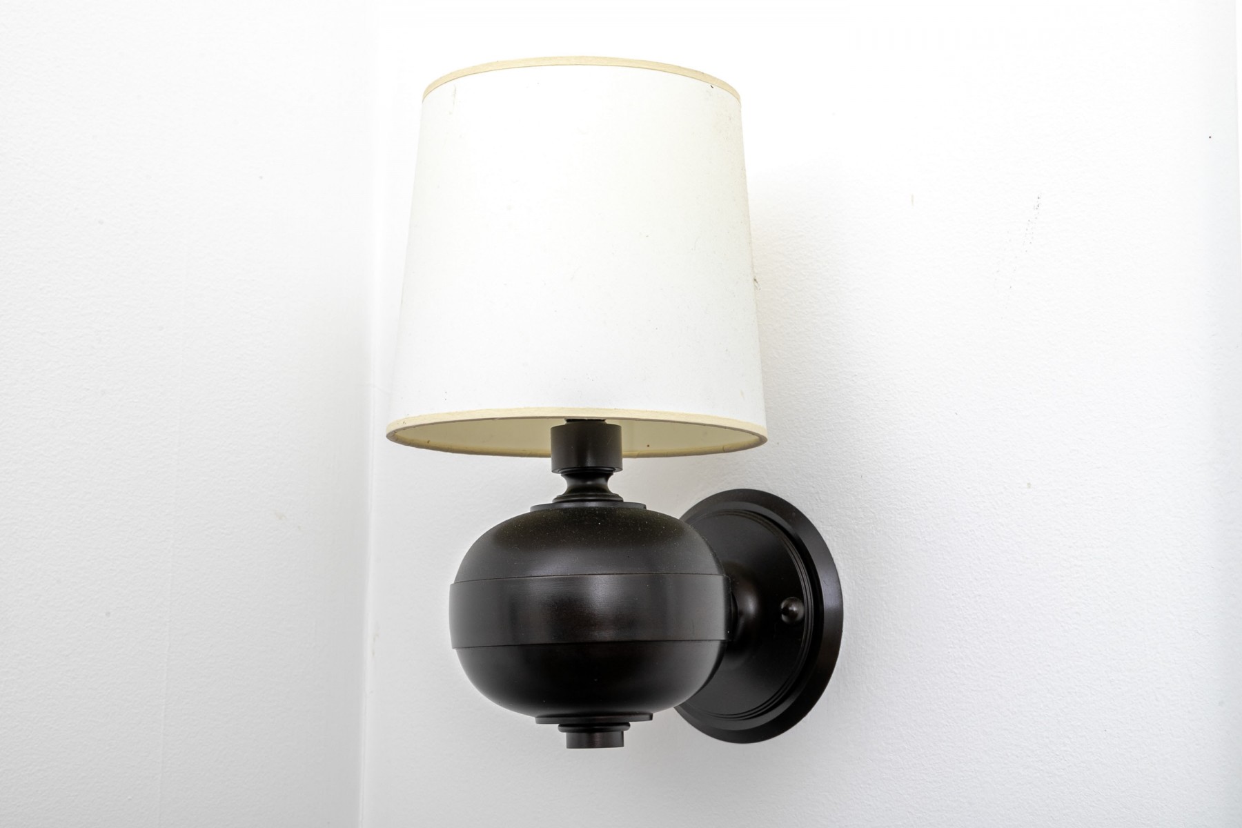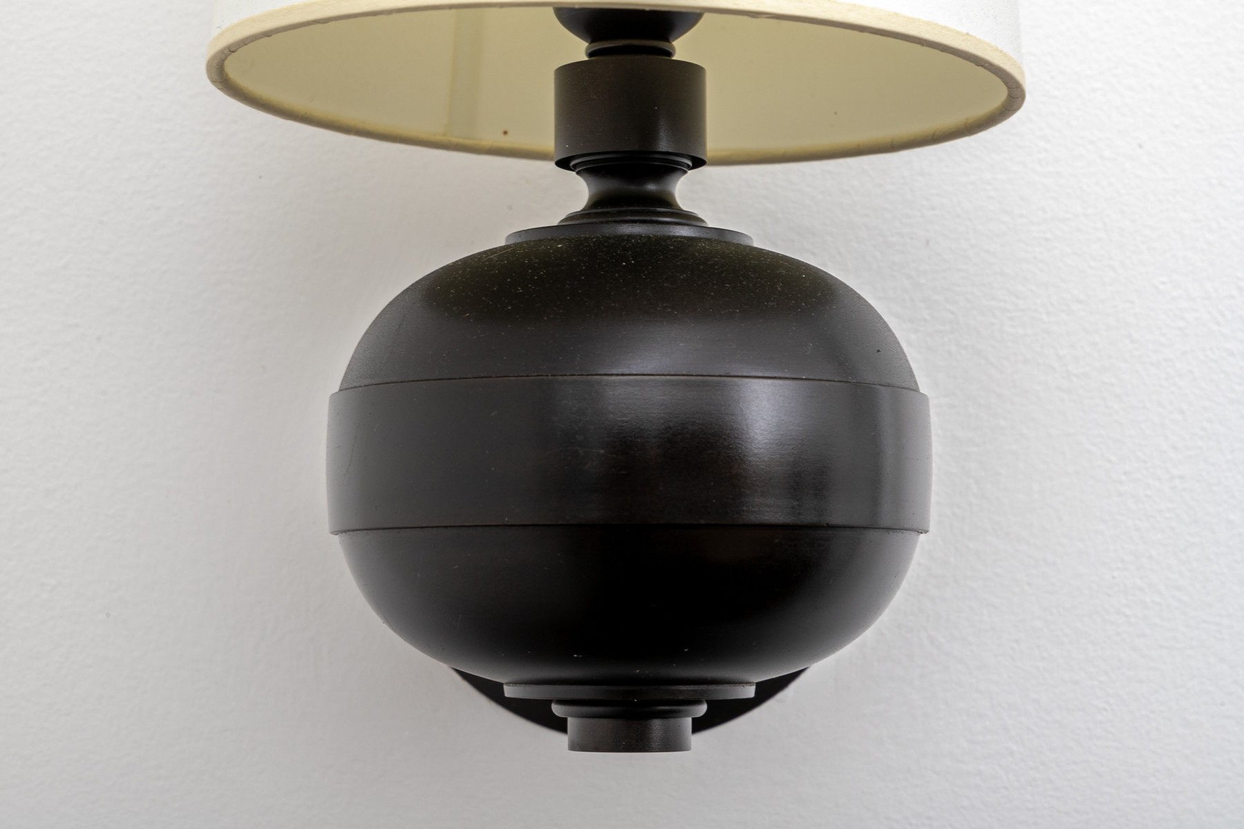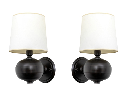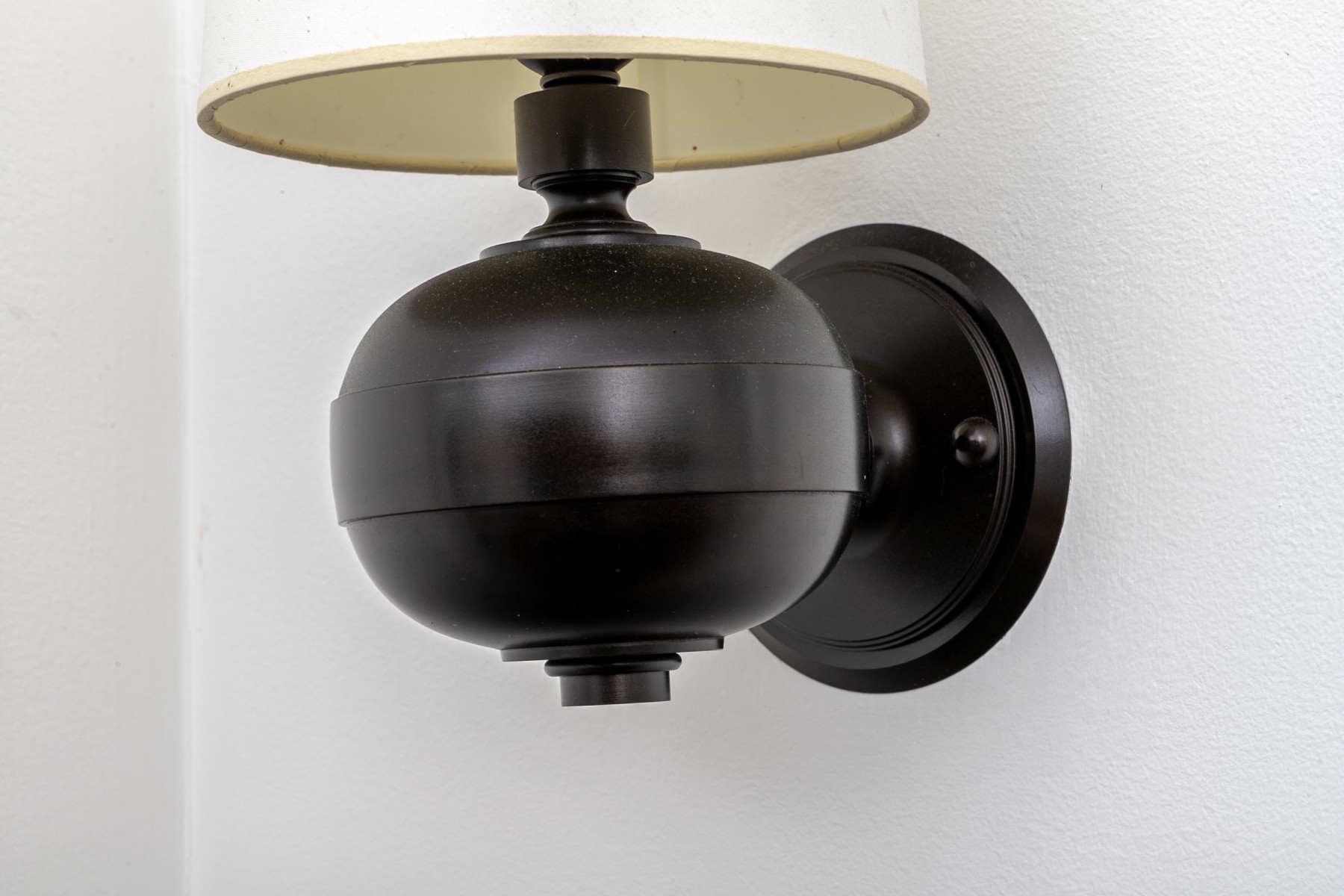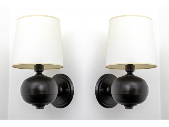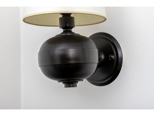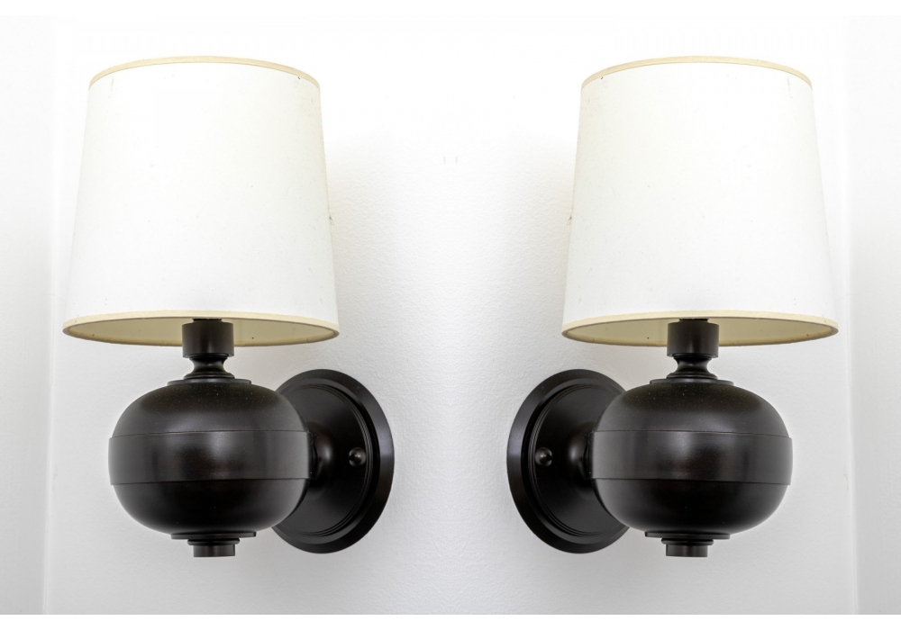 These sconces by Stephen Mc Kay have a substantial round lamp in a bronze finish. Each with an ecru shade to defuse the light. These cost $2400 new.