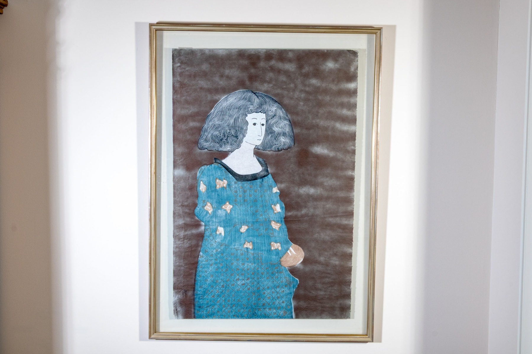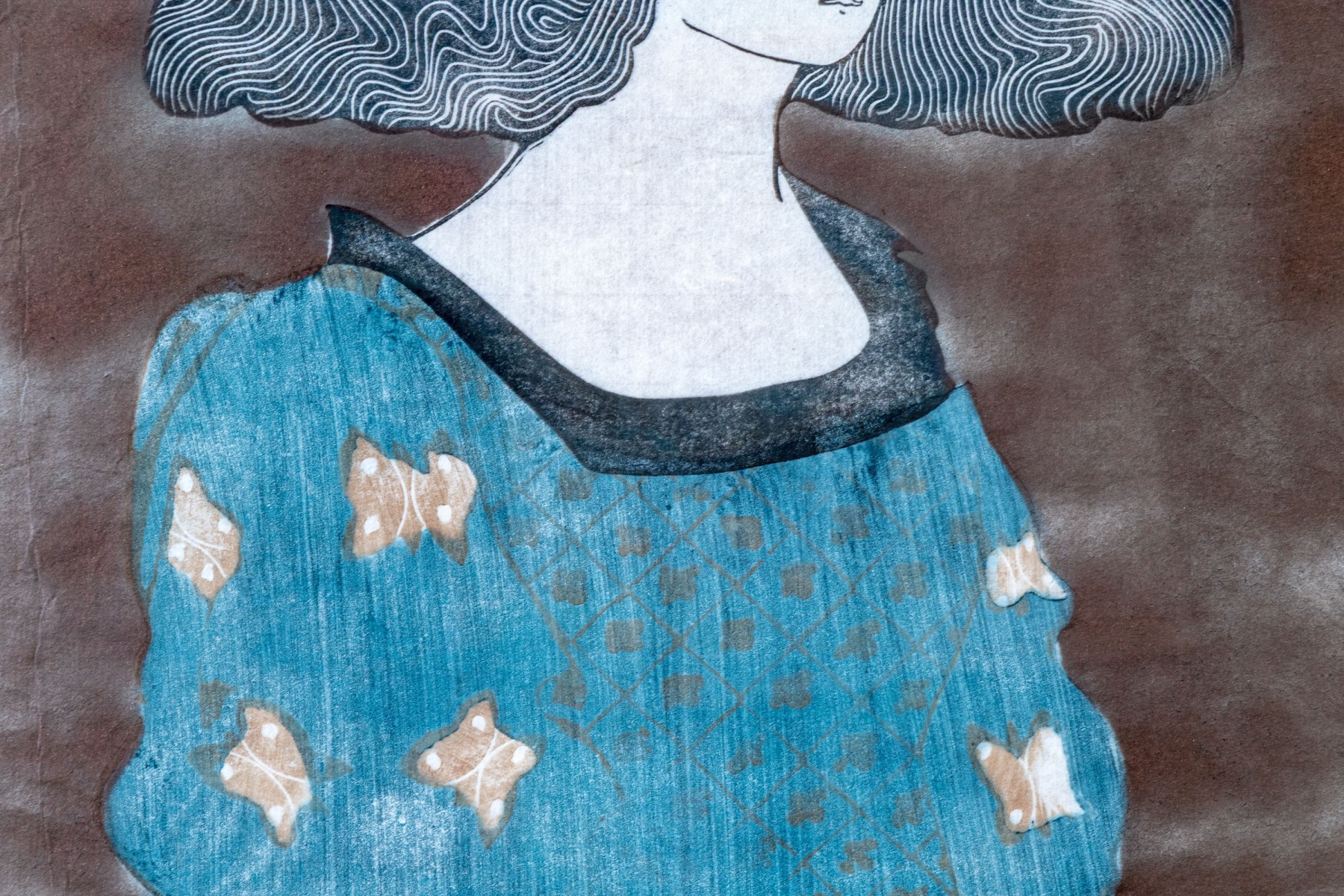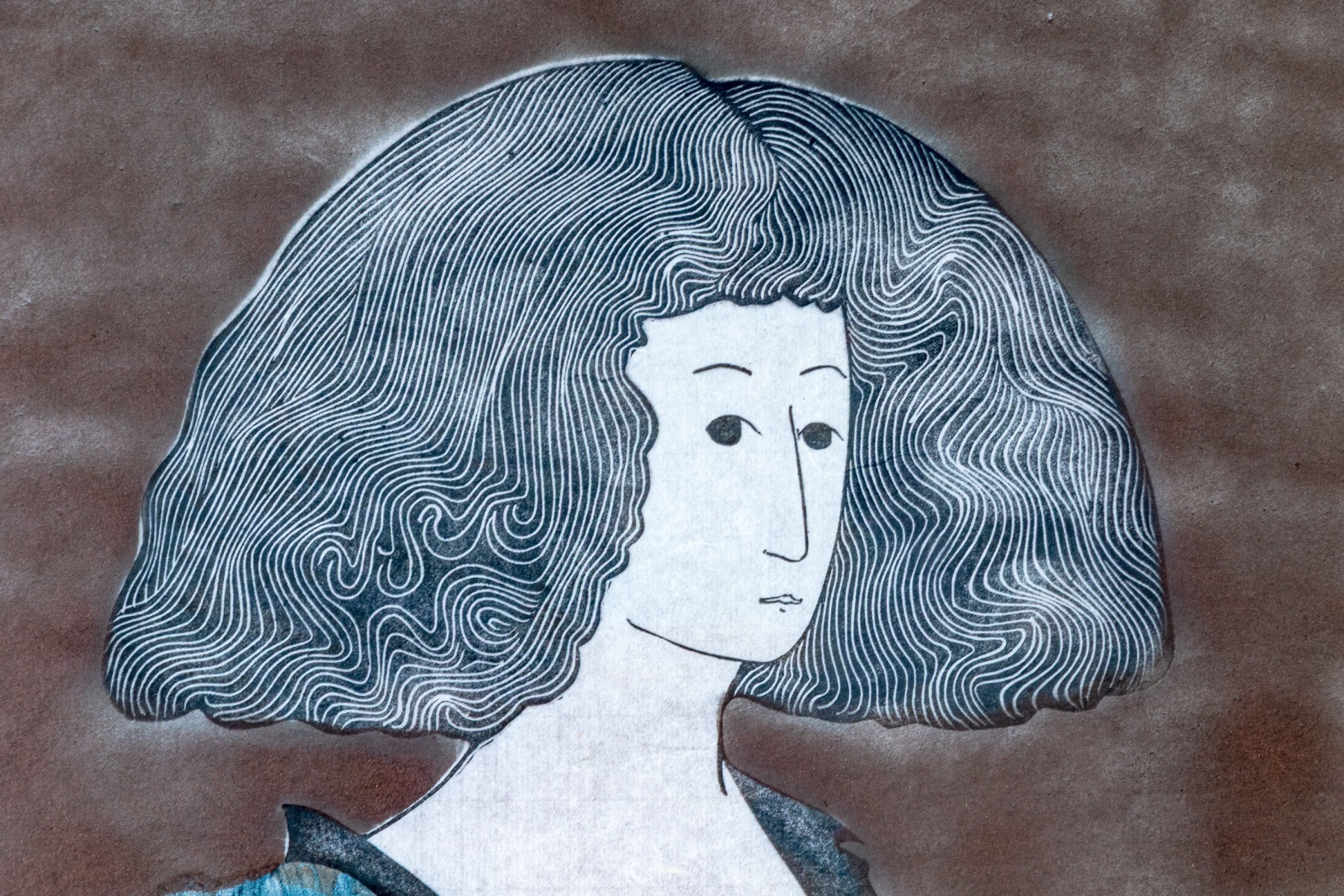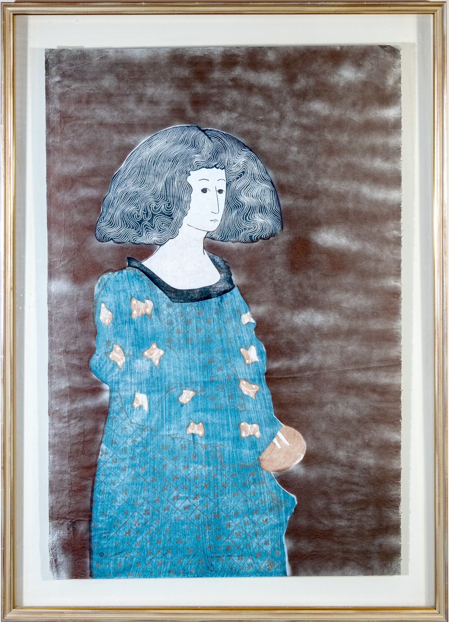 Stephen White (American [NC], B. 1939) "Rosanne" woodblock on paper depicting a portrait of a woman with large, finely detailed black hair cut straight at the neck, wearing a long blue robe with brown details along the sleeves and fine lattice patterns down the front. The woman stands in three-quarter profile against a striated brown ground. Stamped and signed lower left.