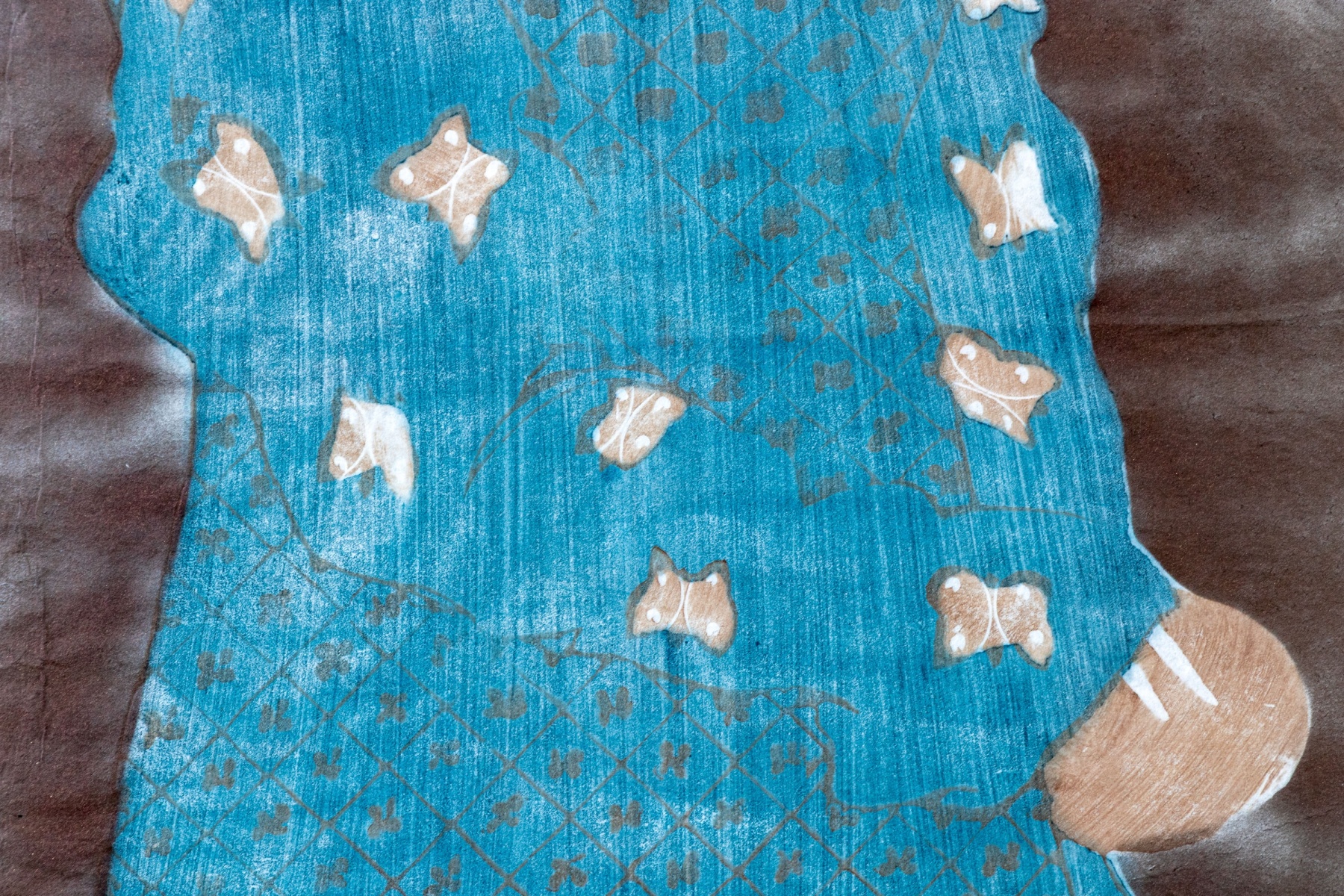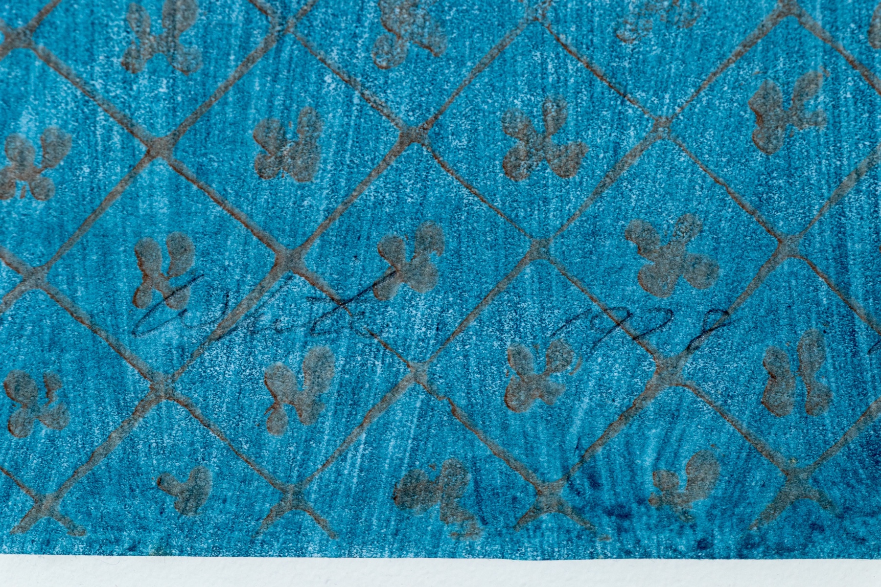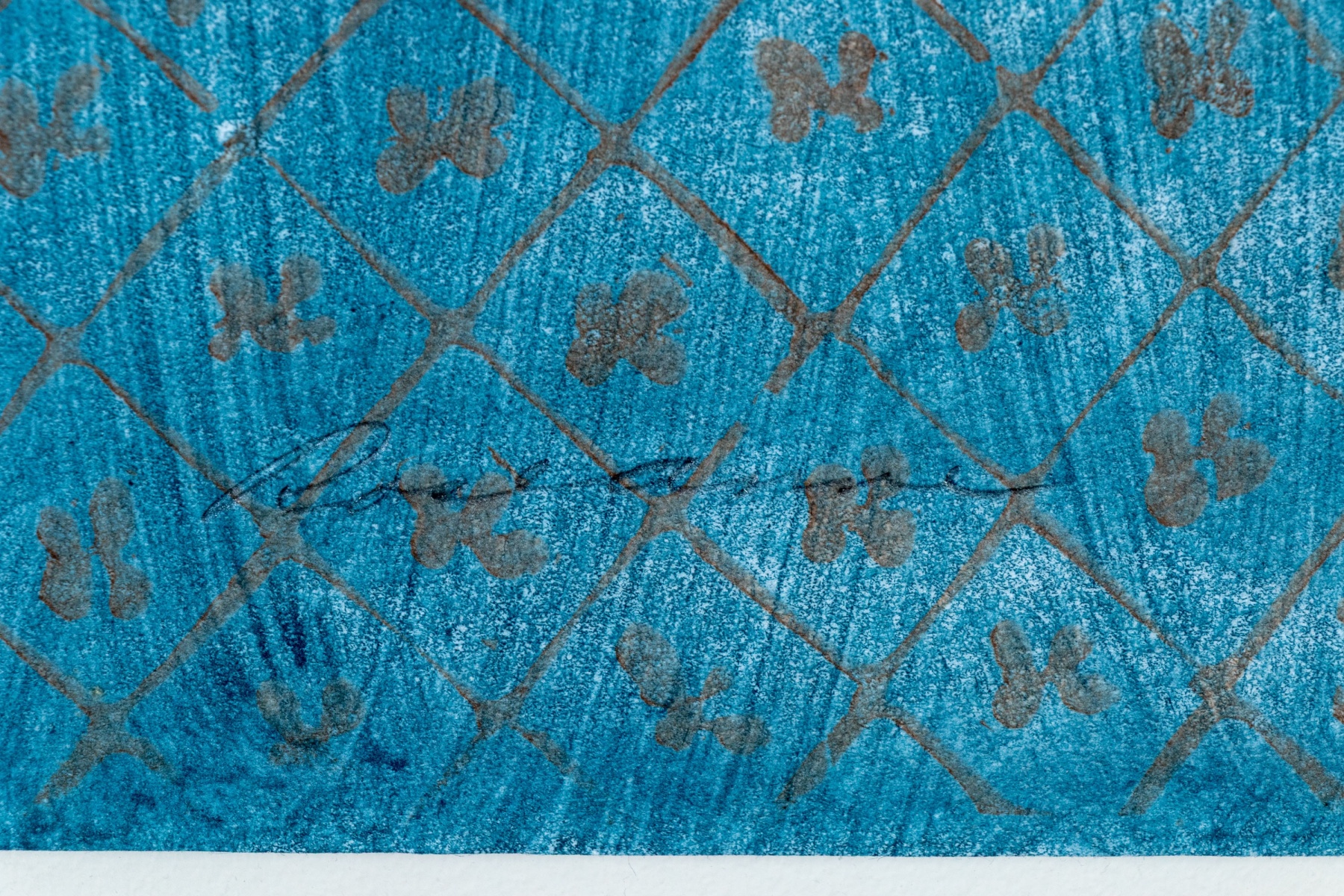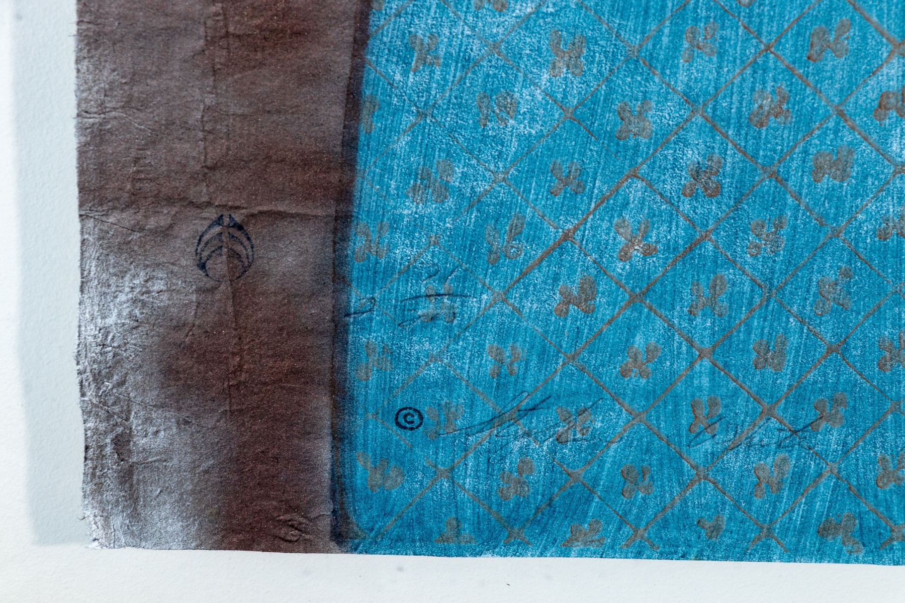 Stephen White (American [NC], B. 1939) "Rosanne" woodblock on paper depicting a portrait of a woman with large, finely detailed black hair cut straight at the neck, wearing a long blue robe with brown details along the sleeves and fine lattice patterns down the front. The woman stands in three-quarter profile against a striated brown ground. Stamped and signed lower left.