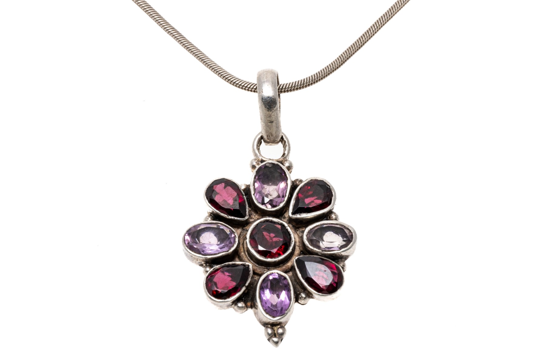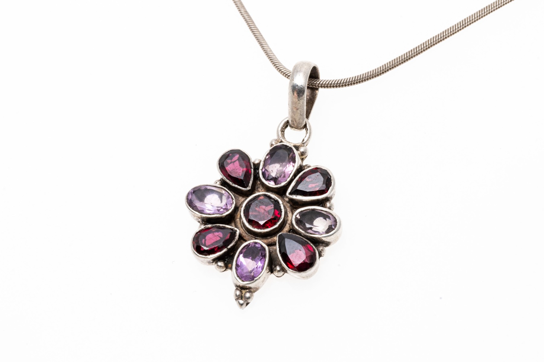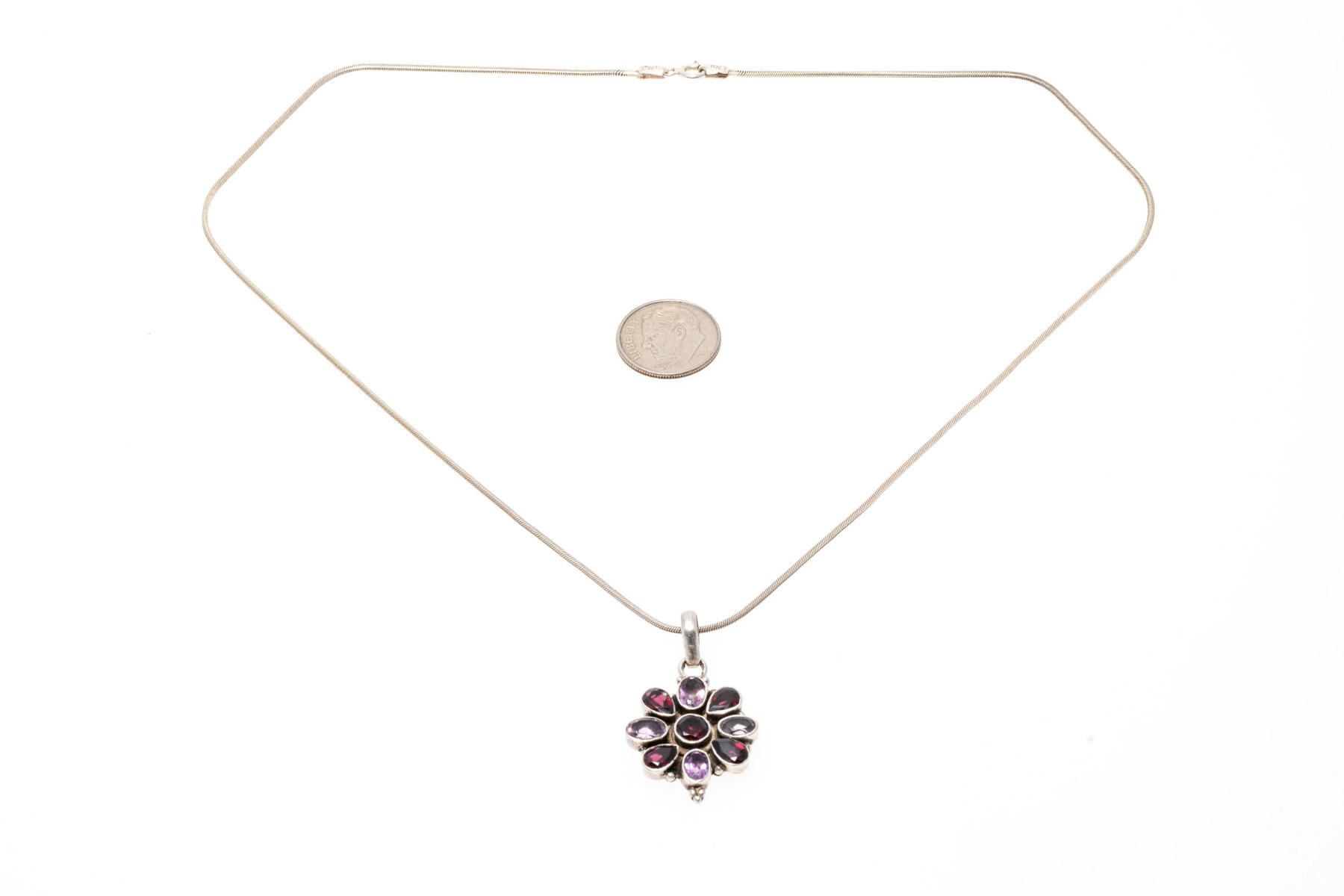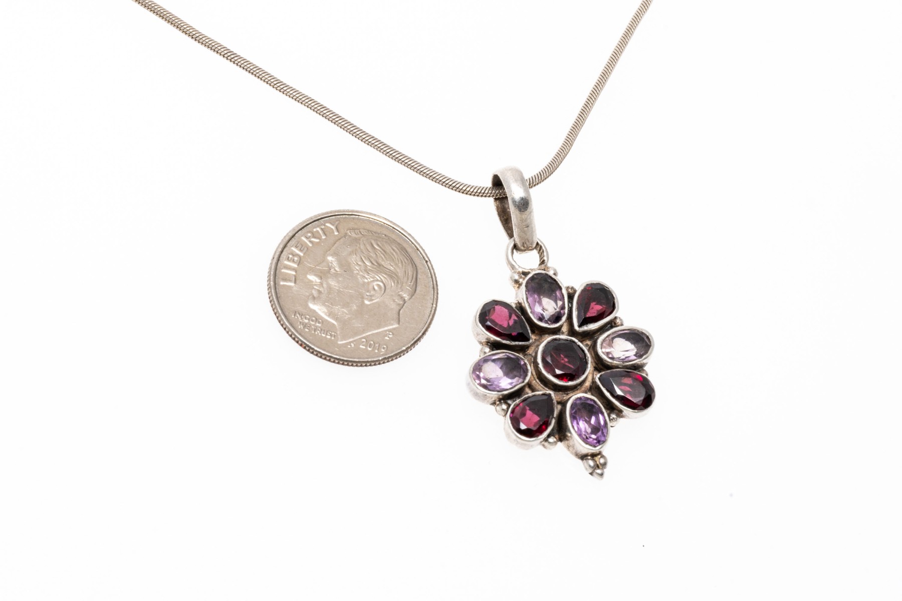 Sterling silver pendant necklace. Snake chain necklace showcasing a pendant set with oval cut amethyst and pear cut garnets, while a round cut garnet sits at the center. Spring ring clasp.