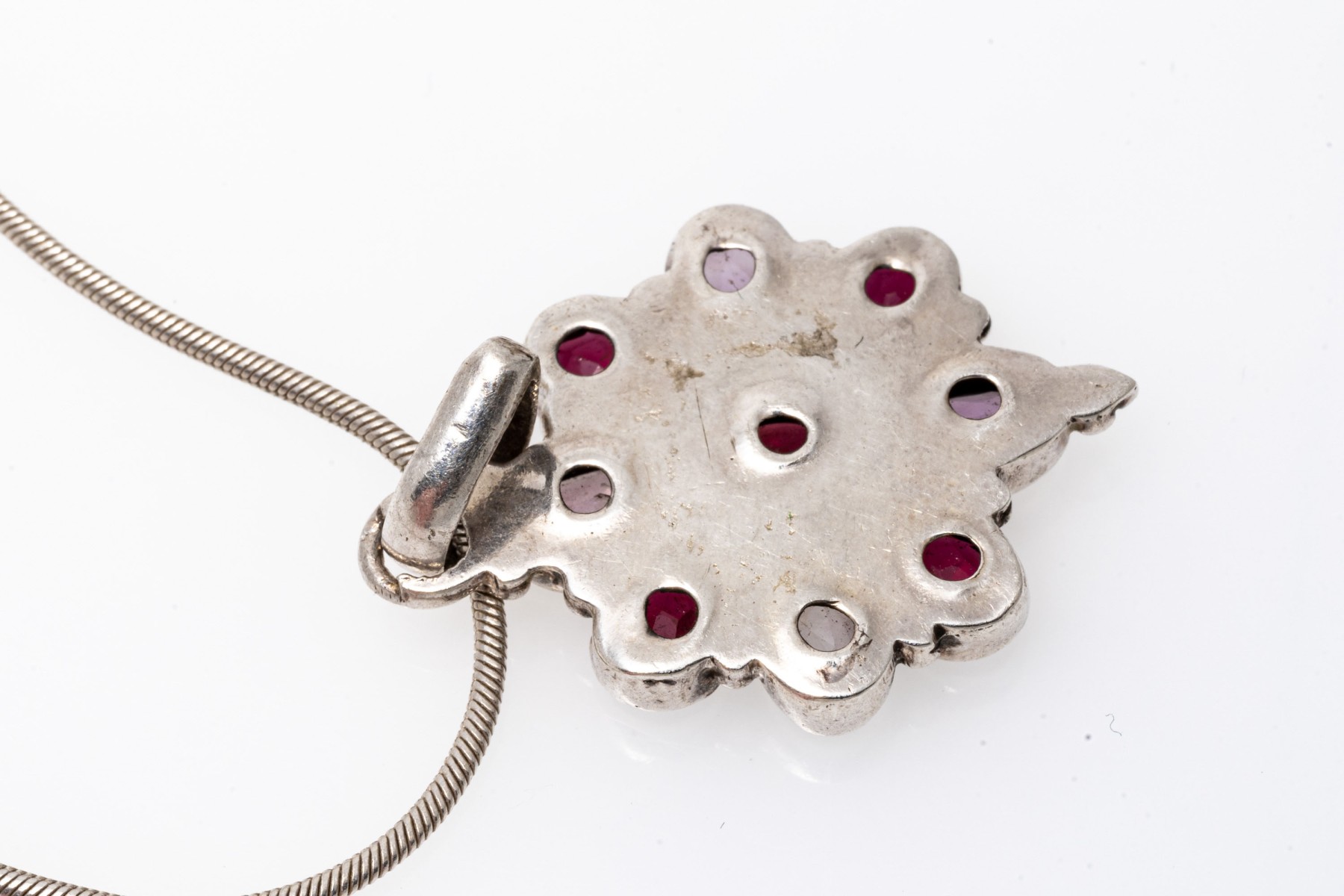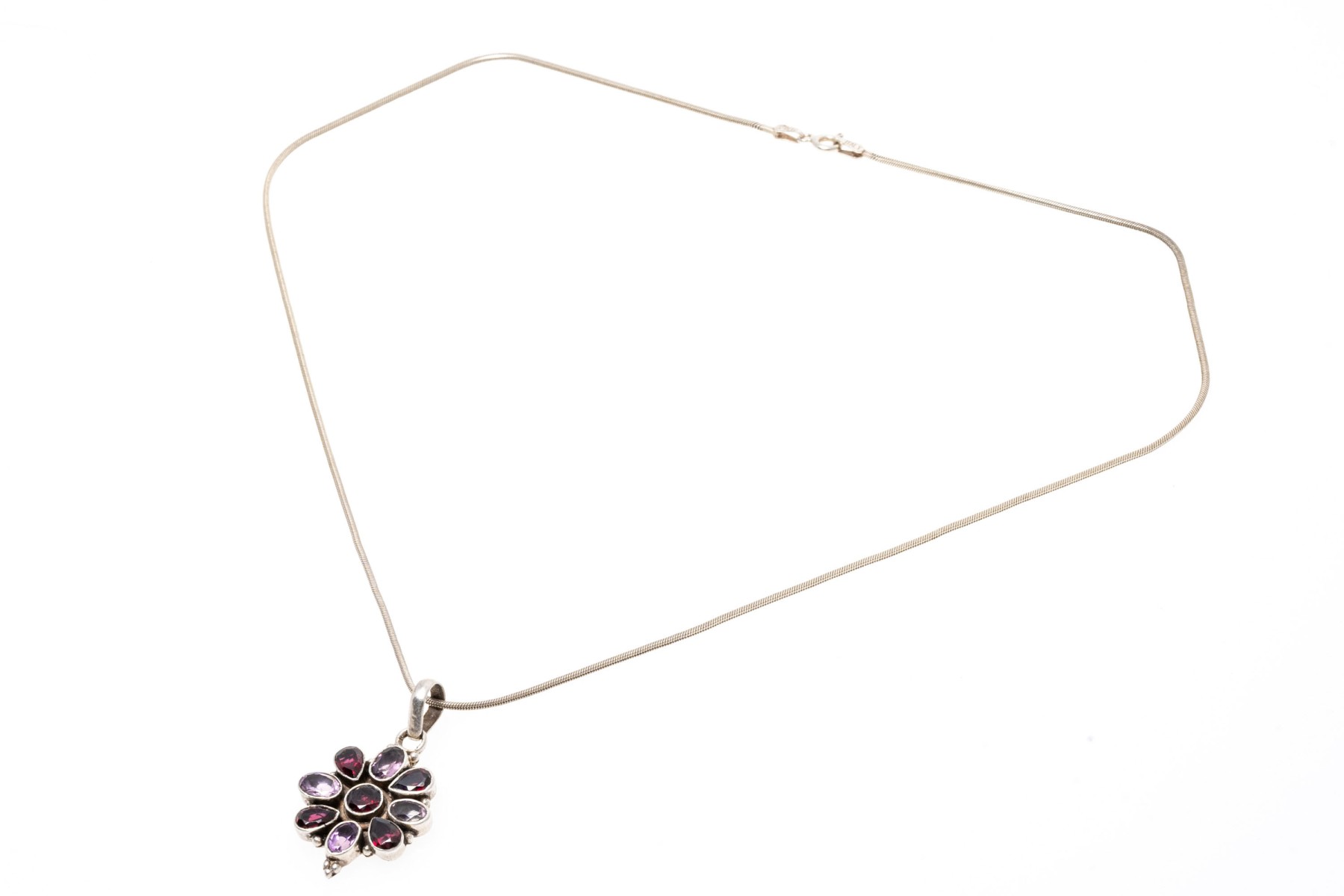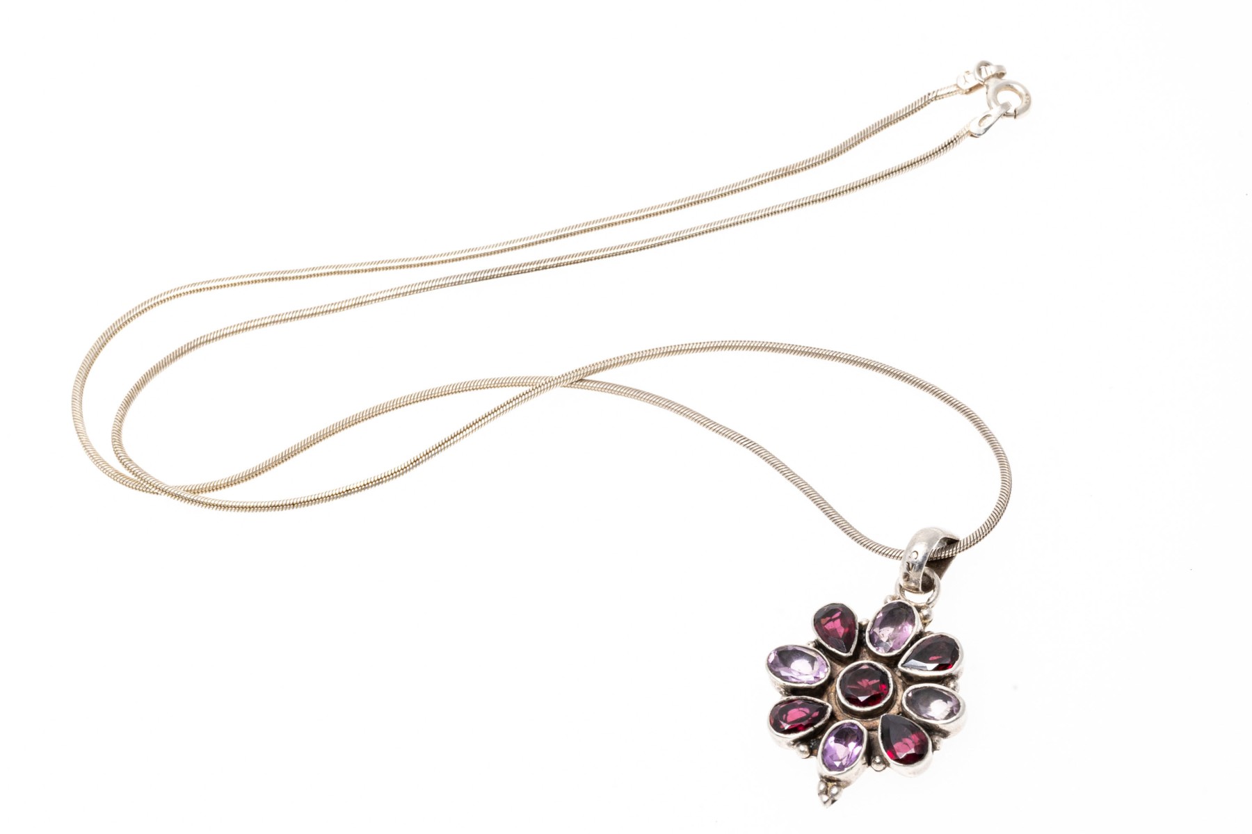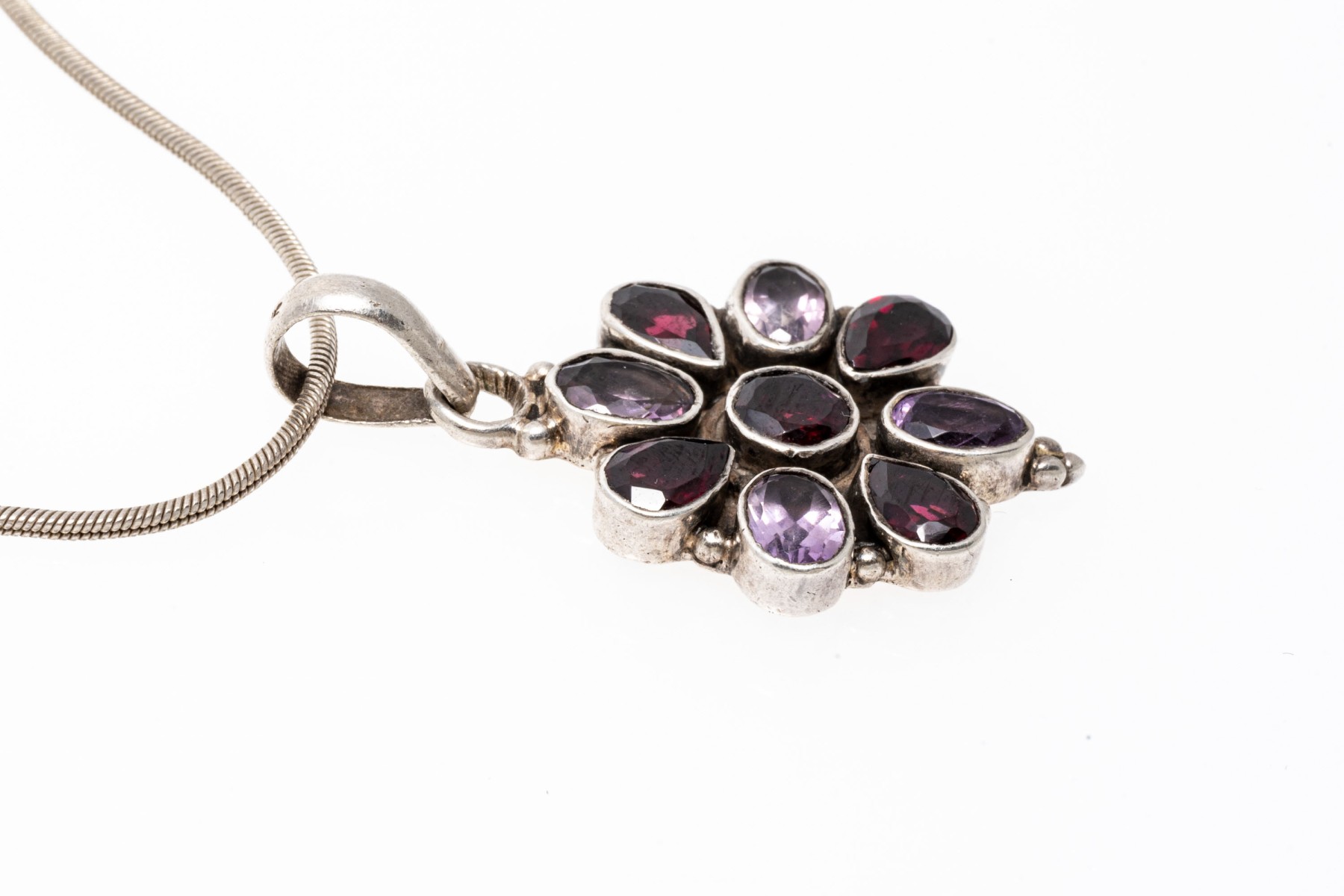 Sterling silver pendant necklace. Snake chain necklace showcasing a pendant set with oval cut amethyst and pear cut garnets, while a round cut garnet sits at the center. Spring ring clasp.
