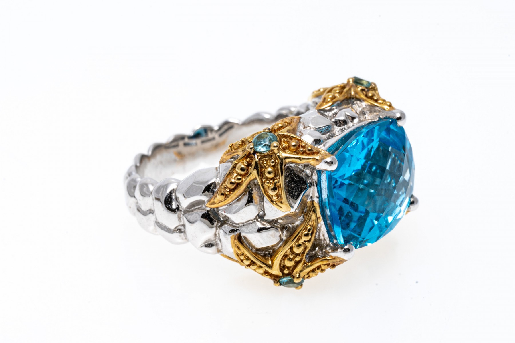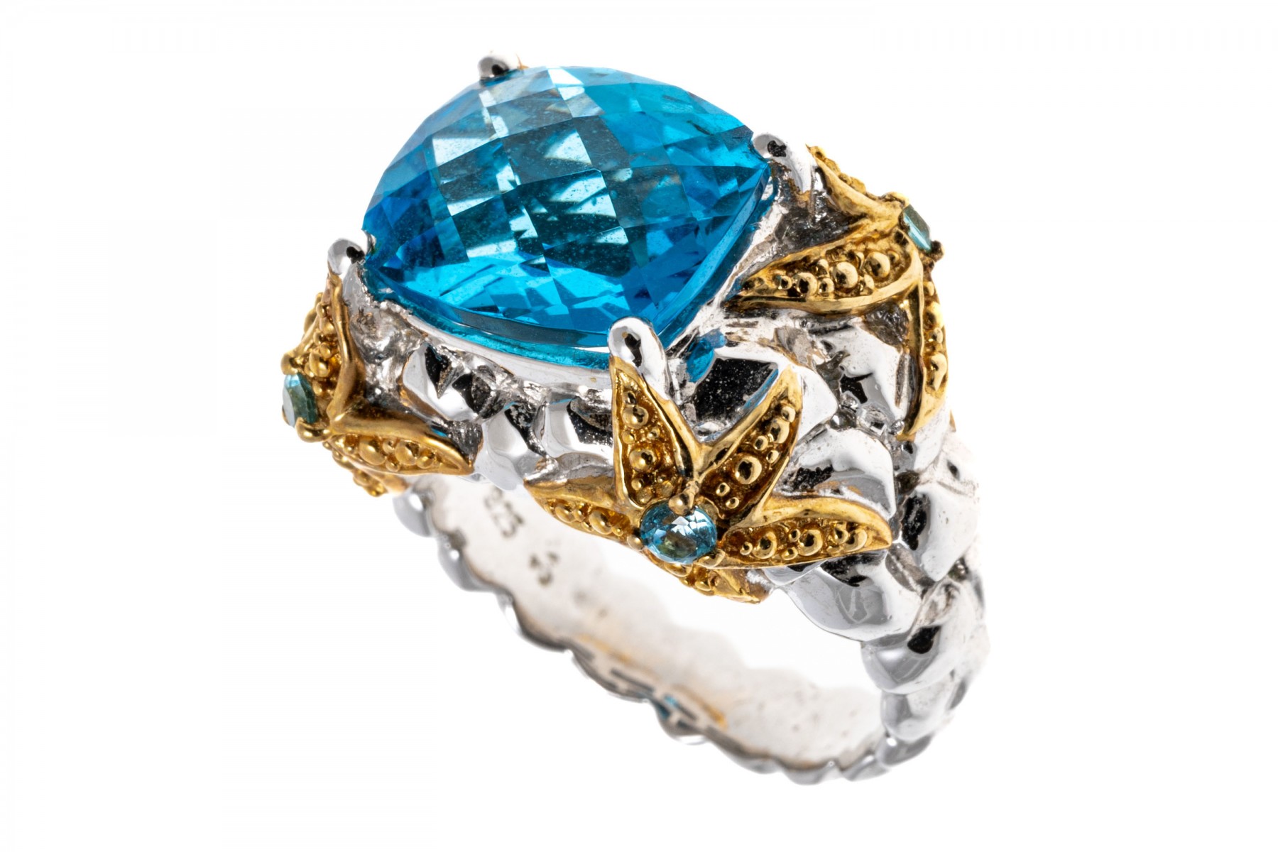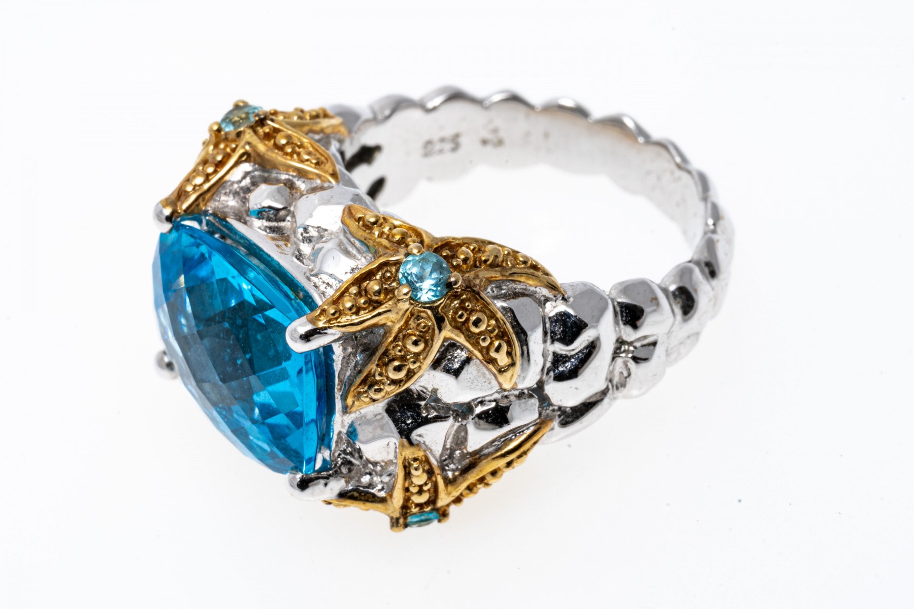 A sterling silver ring set with a single rich blue topaz. The shanks and galley feature vermeil starfish like design set with blue topaz. Ribbed band. Ring size .