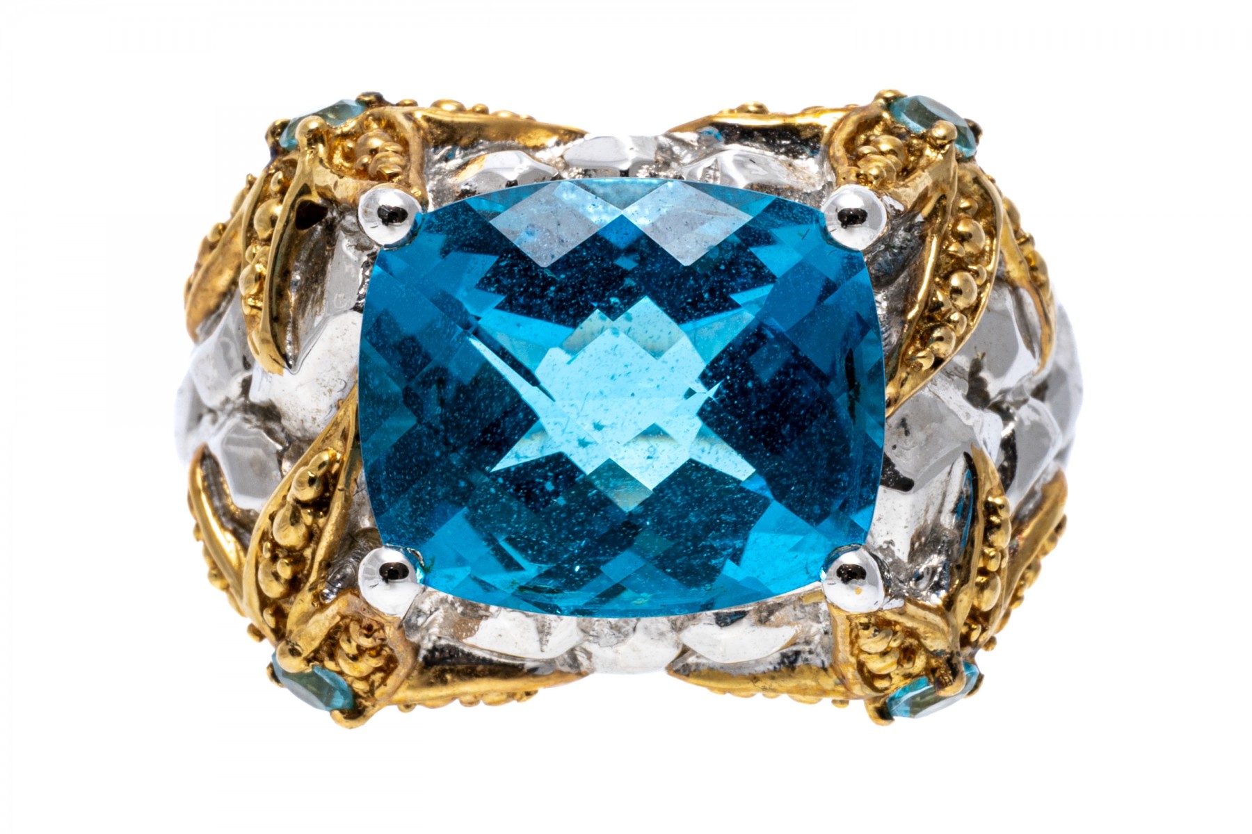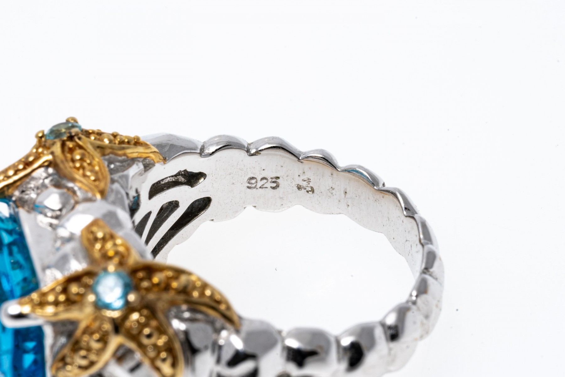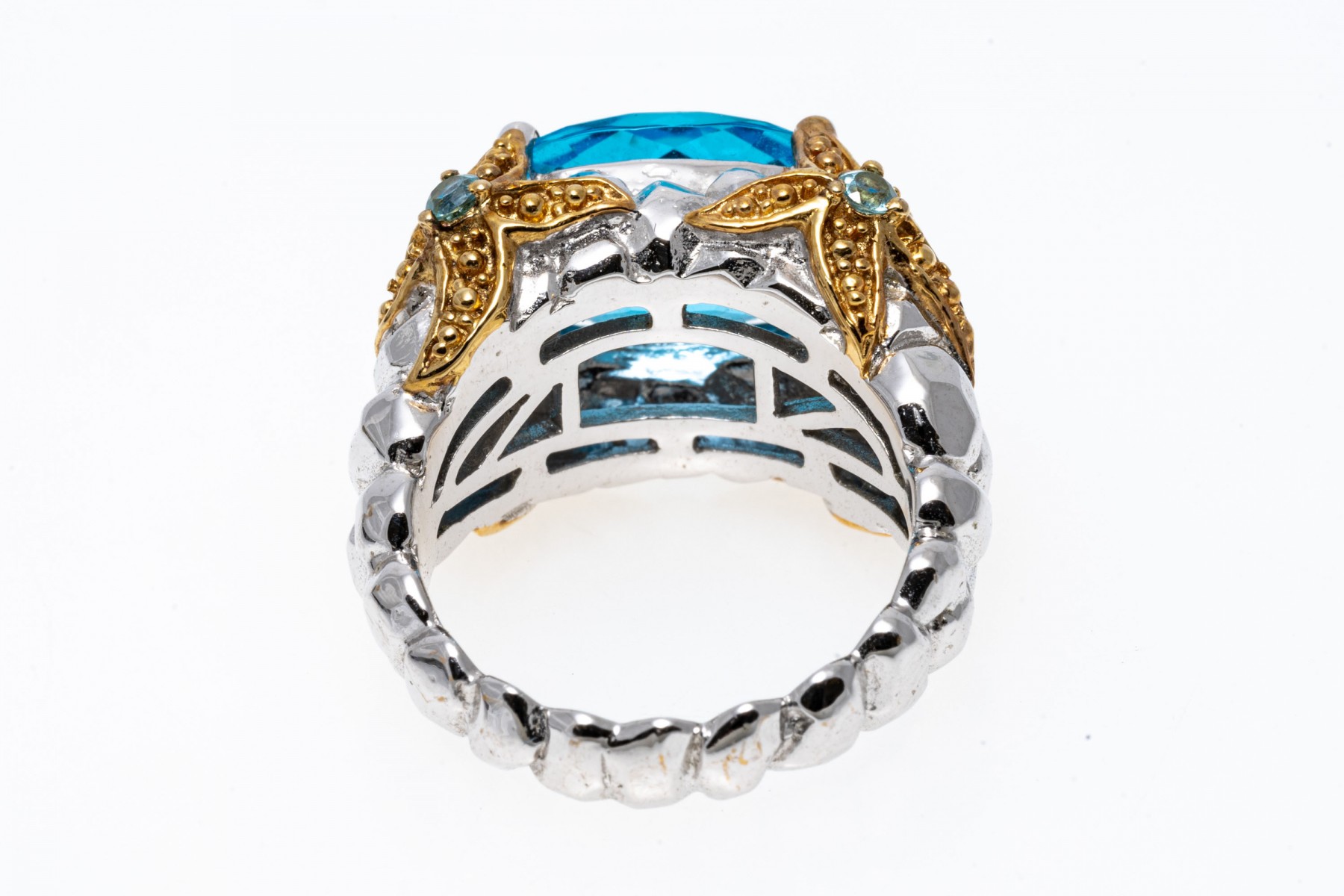A sterling silver ring set with a single rich blue topaz. The shanks and galley feature vermeil starfish like design set with blue topaz. Ribbed band. Ring size .