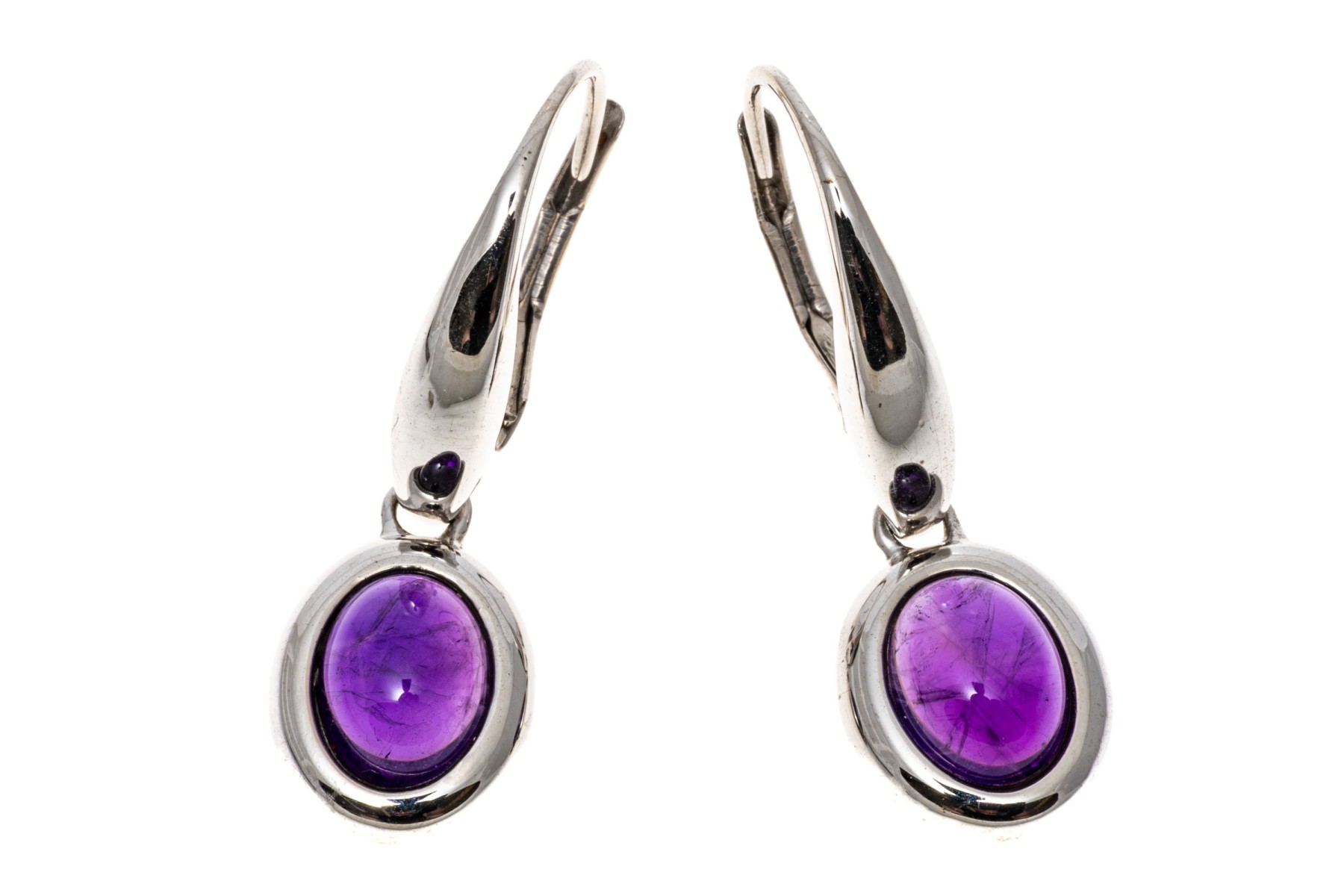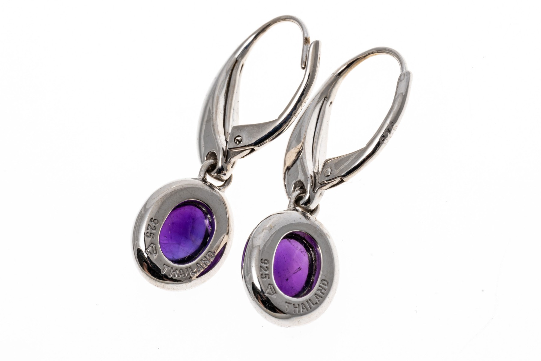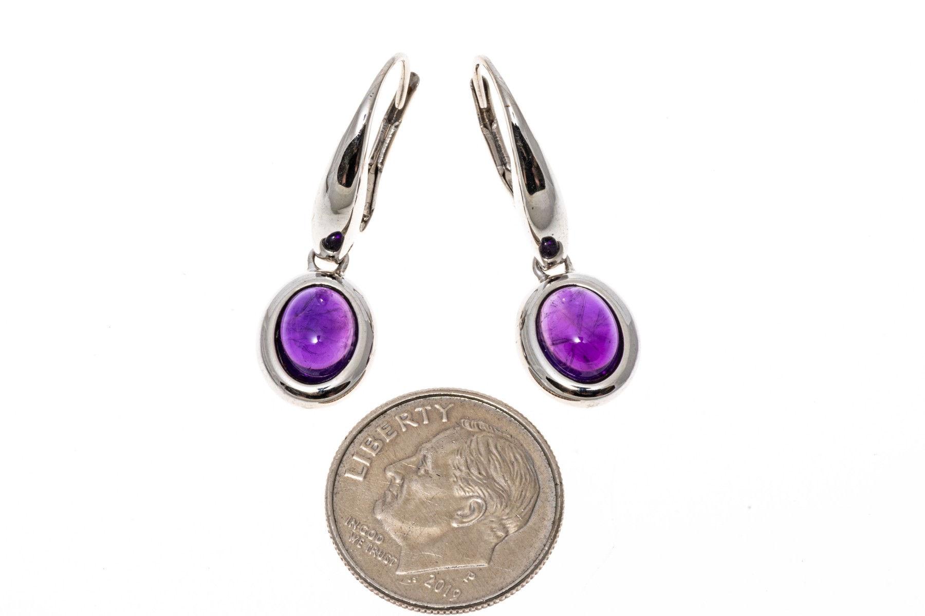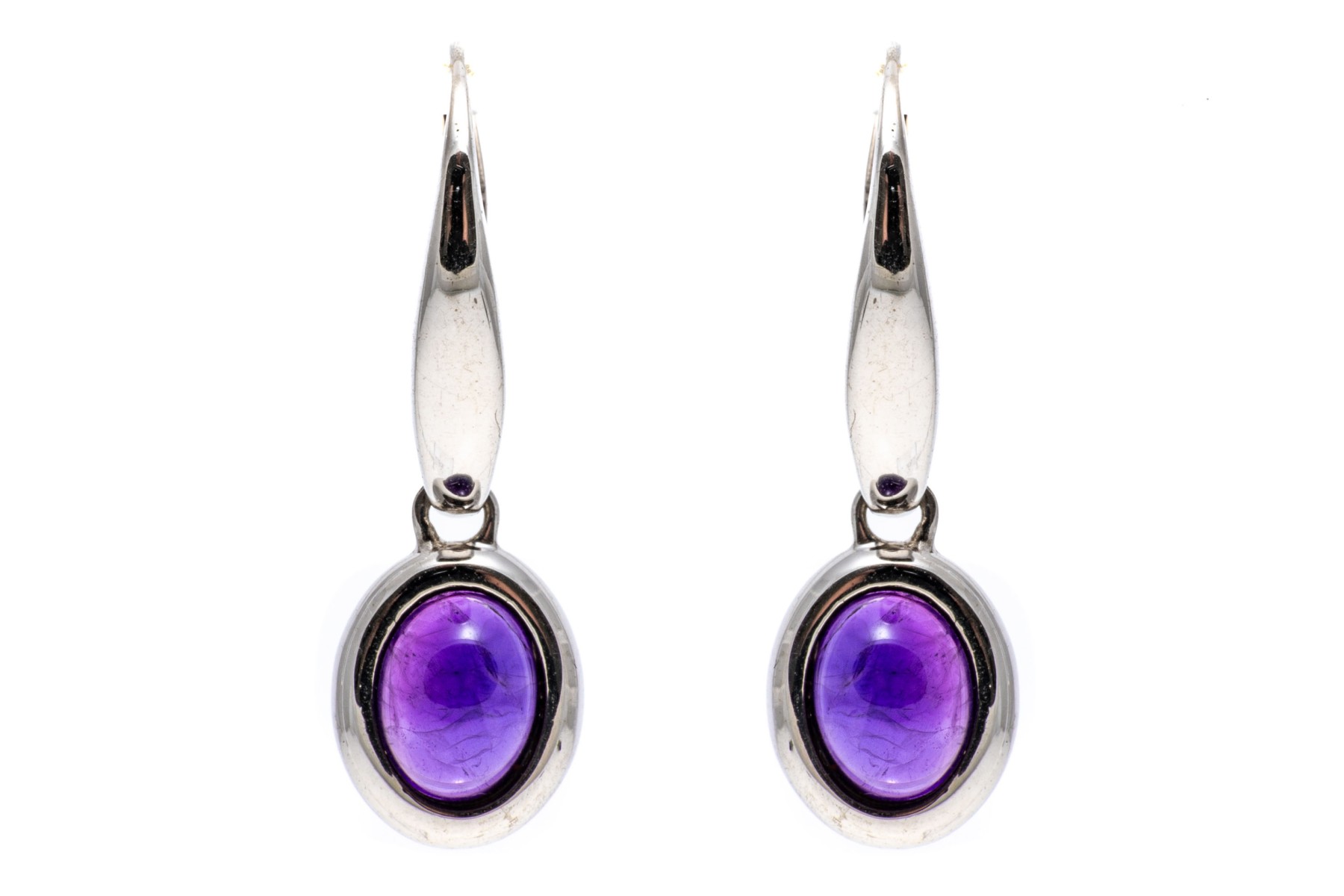 Sterling silver pendant earrings. The earrings are set with deep purple oval cabochon cut amethysts. Hook and leaver backings.