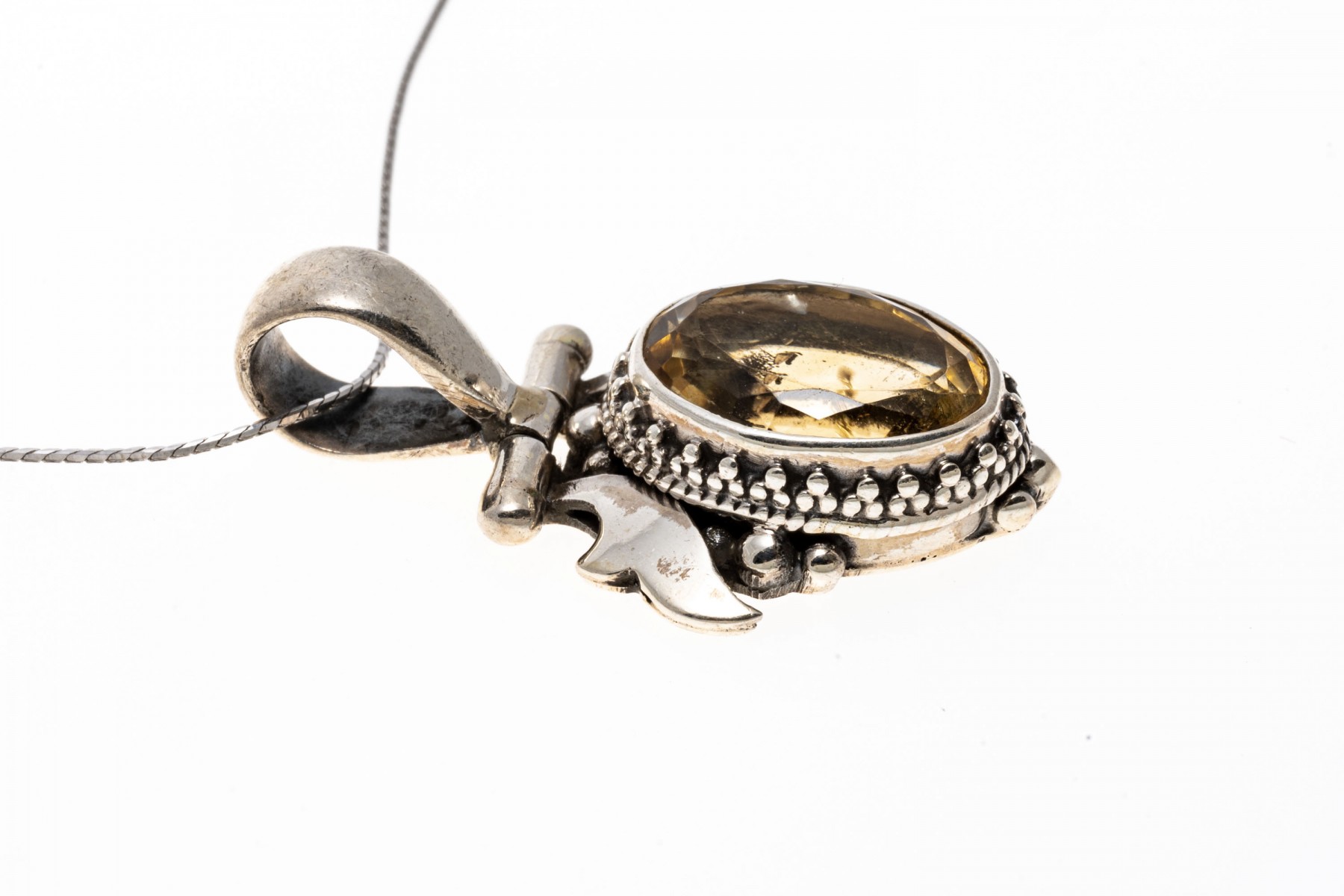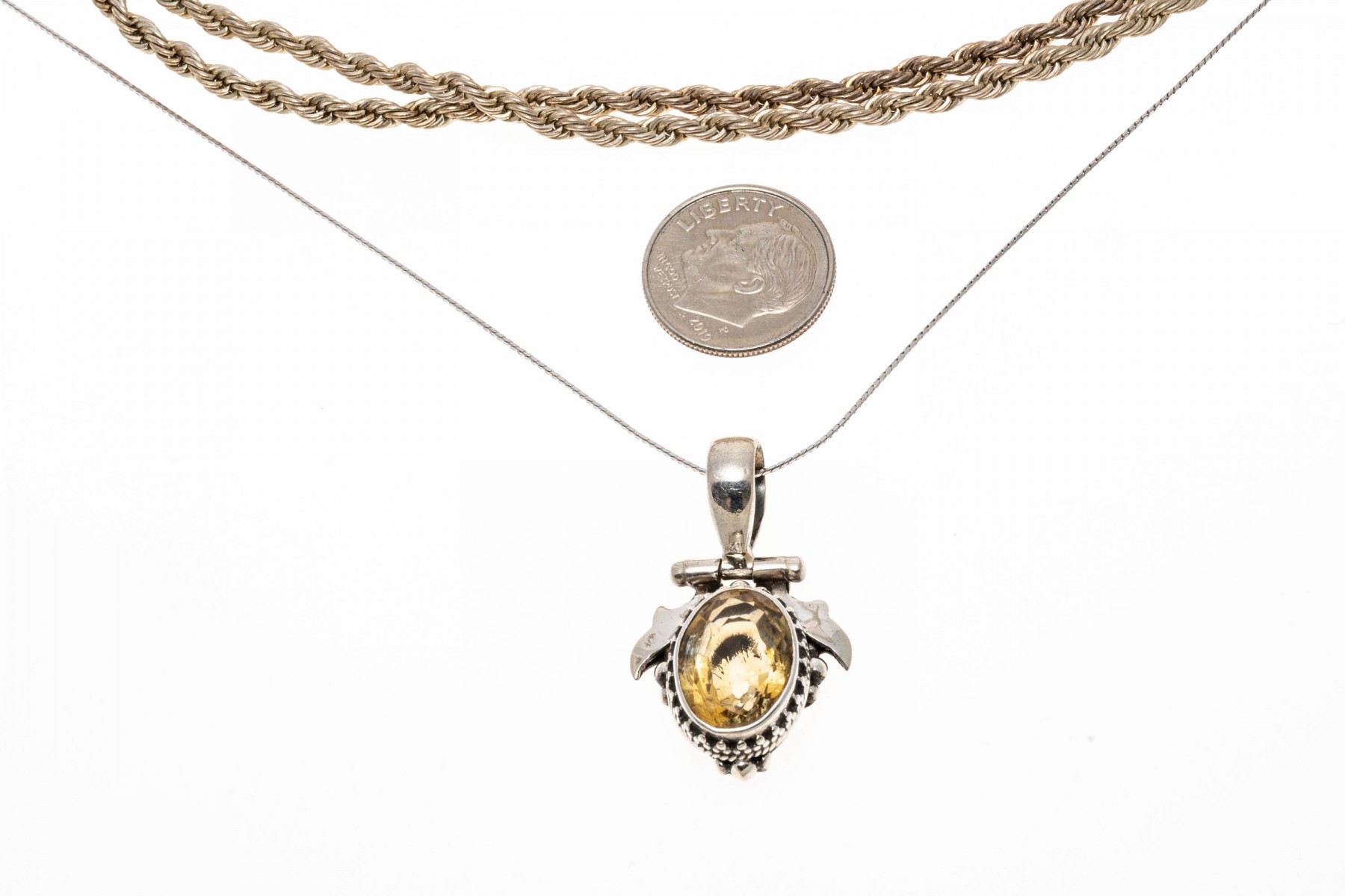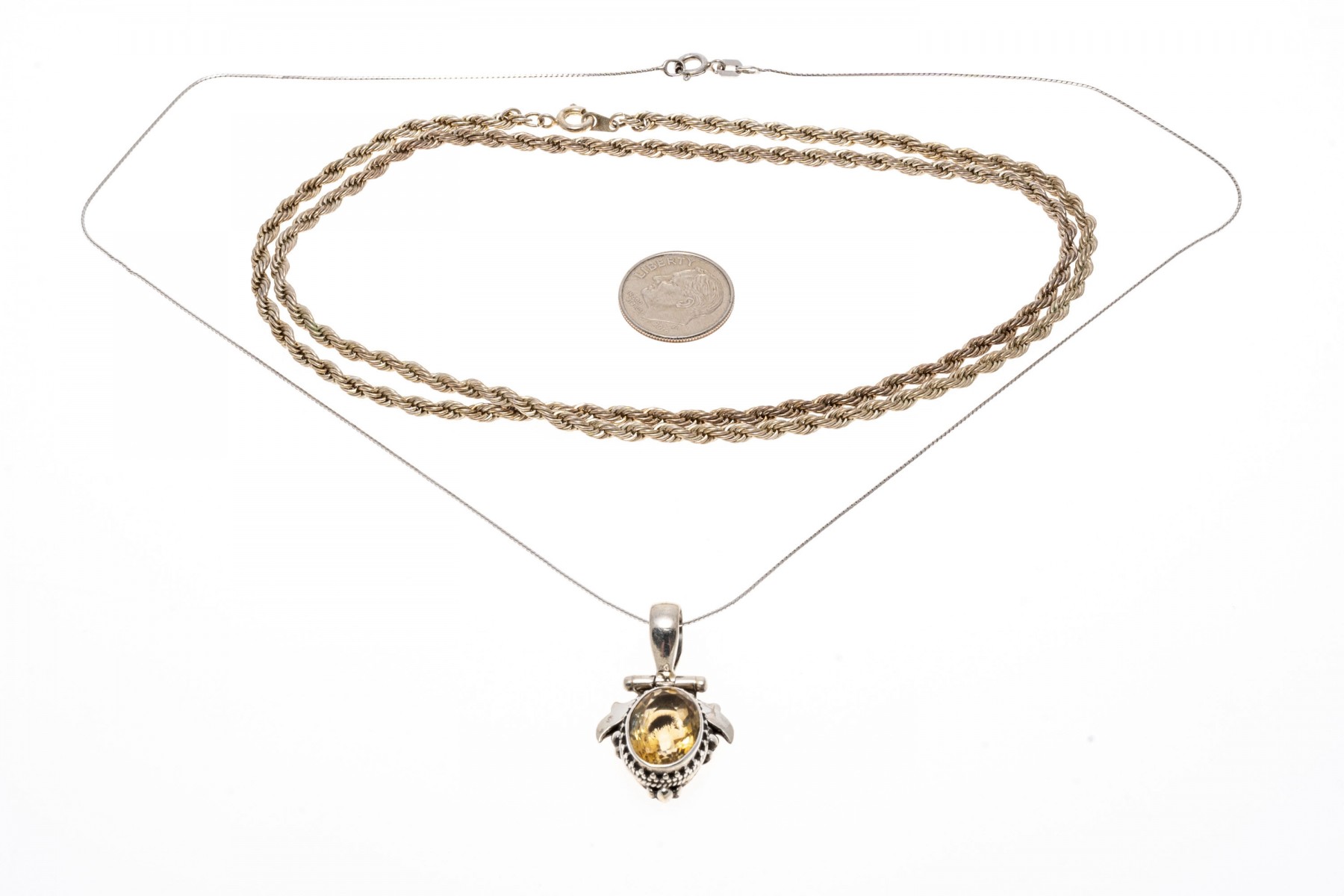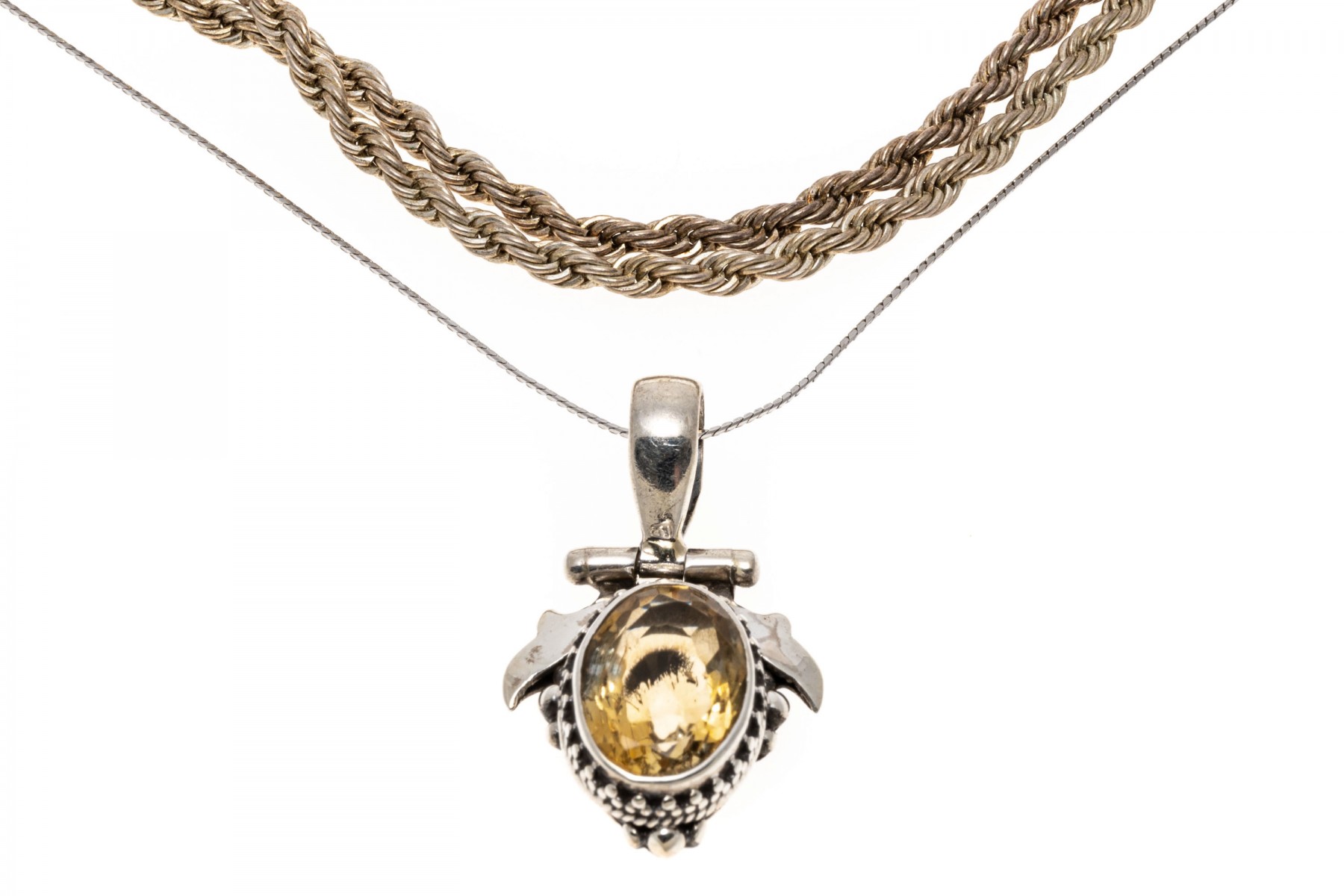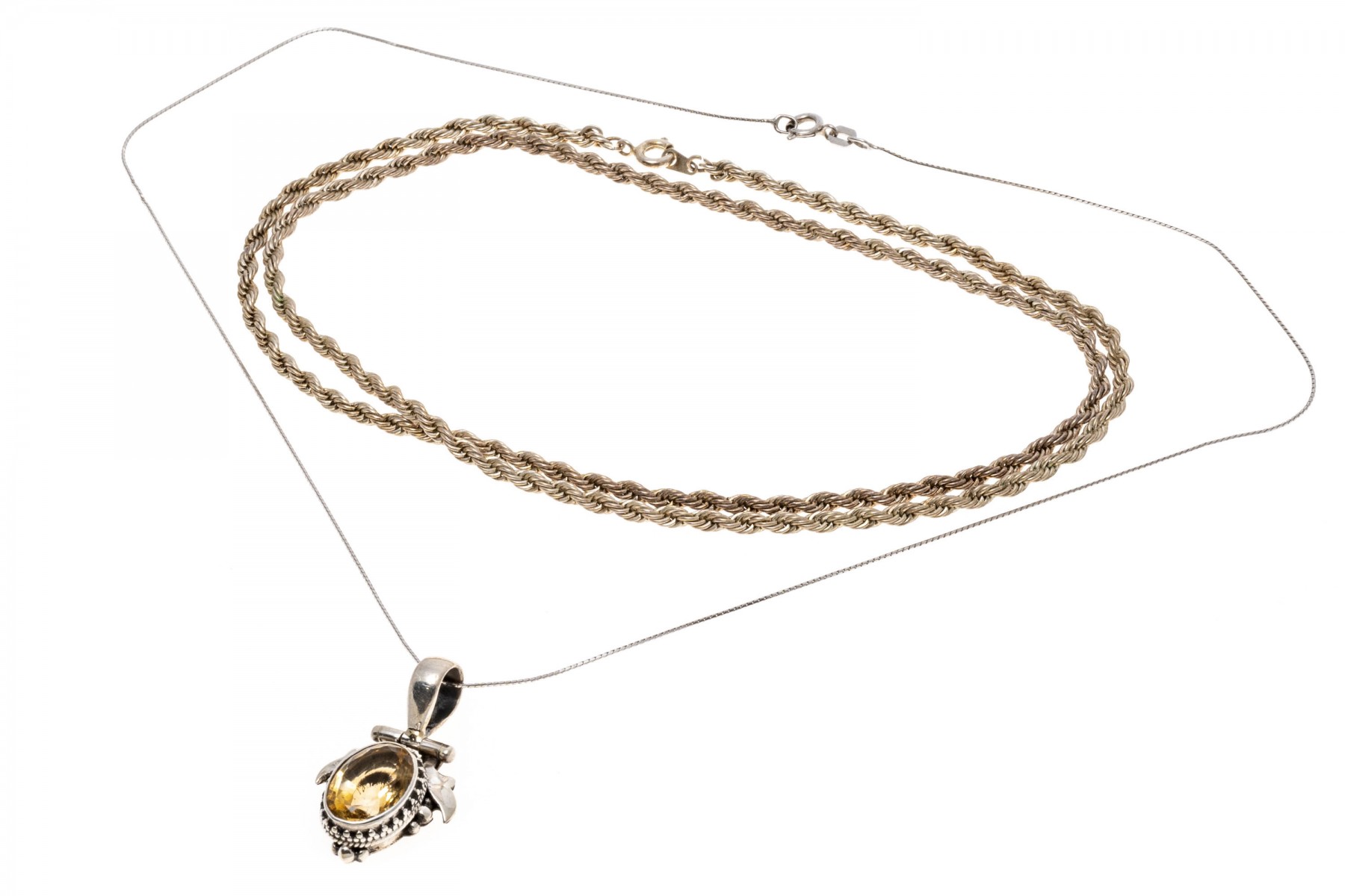 A sterling silver necklace with a citrine pendant. The second necklace is a fashion necklace and has a twist design. Spring ring clasps.