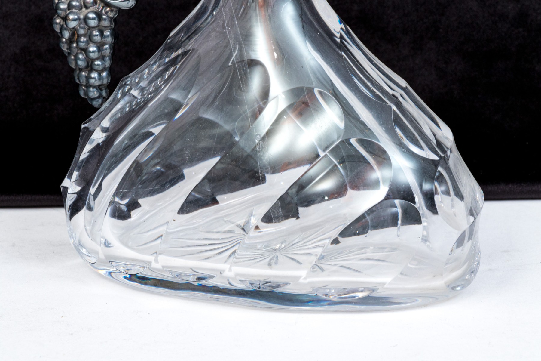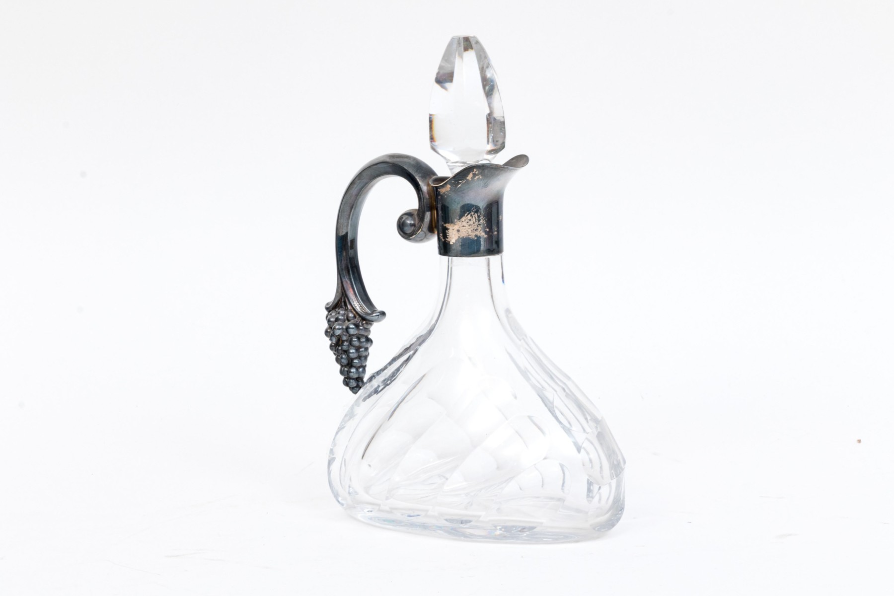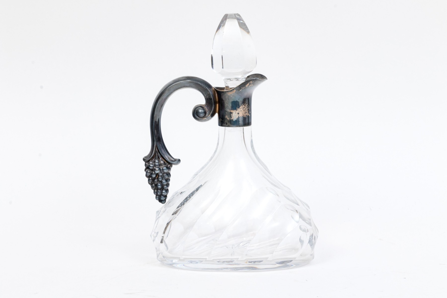 Classic glass pitcher or decanter with stopper. The neck and handle are sterling and the handle ends in a grape cluster.