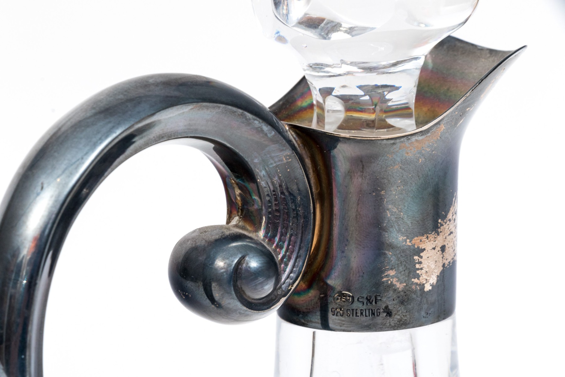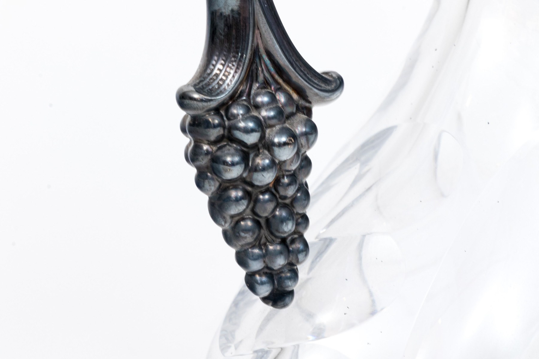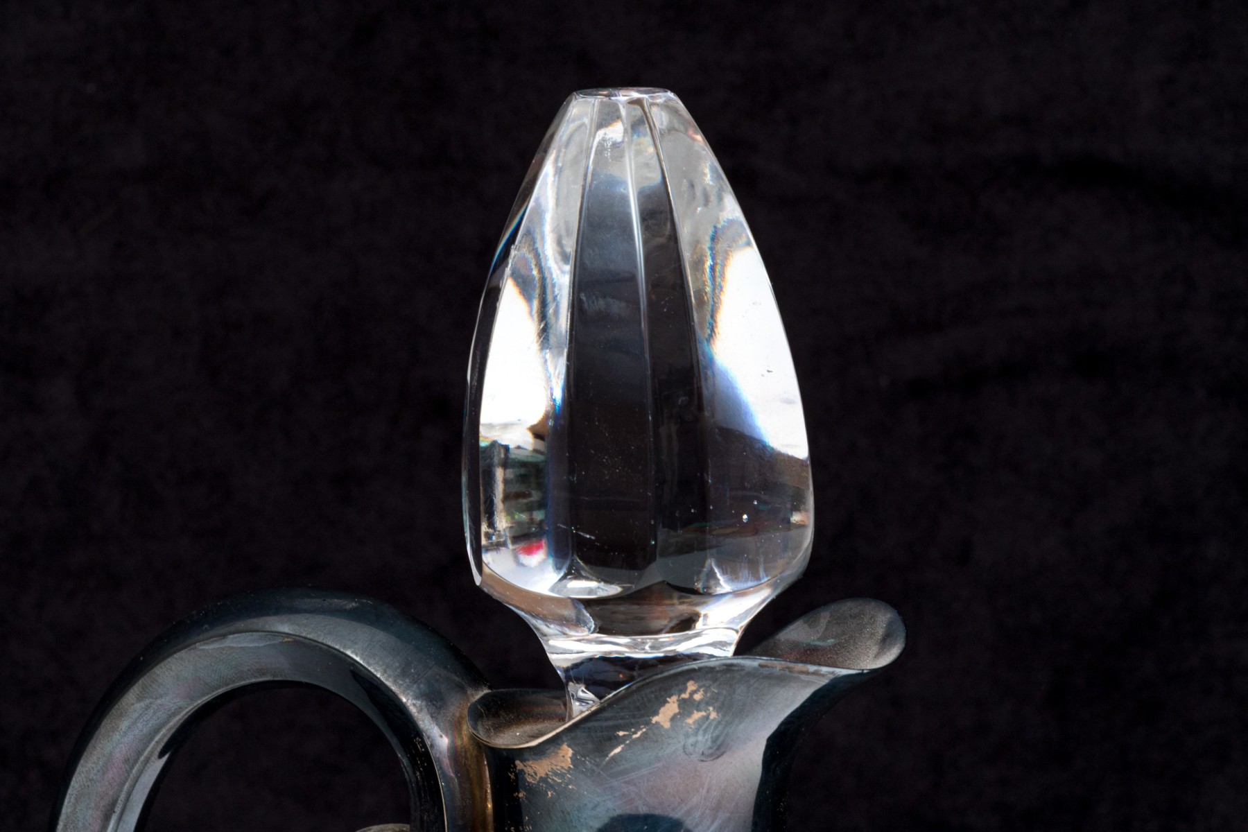 Classic glass pitcher or decanter with stopper. The neck and handle are sterling and the handle ends in a grape cluster.