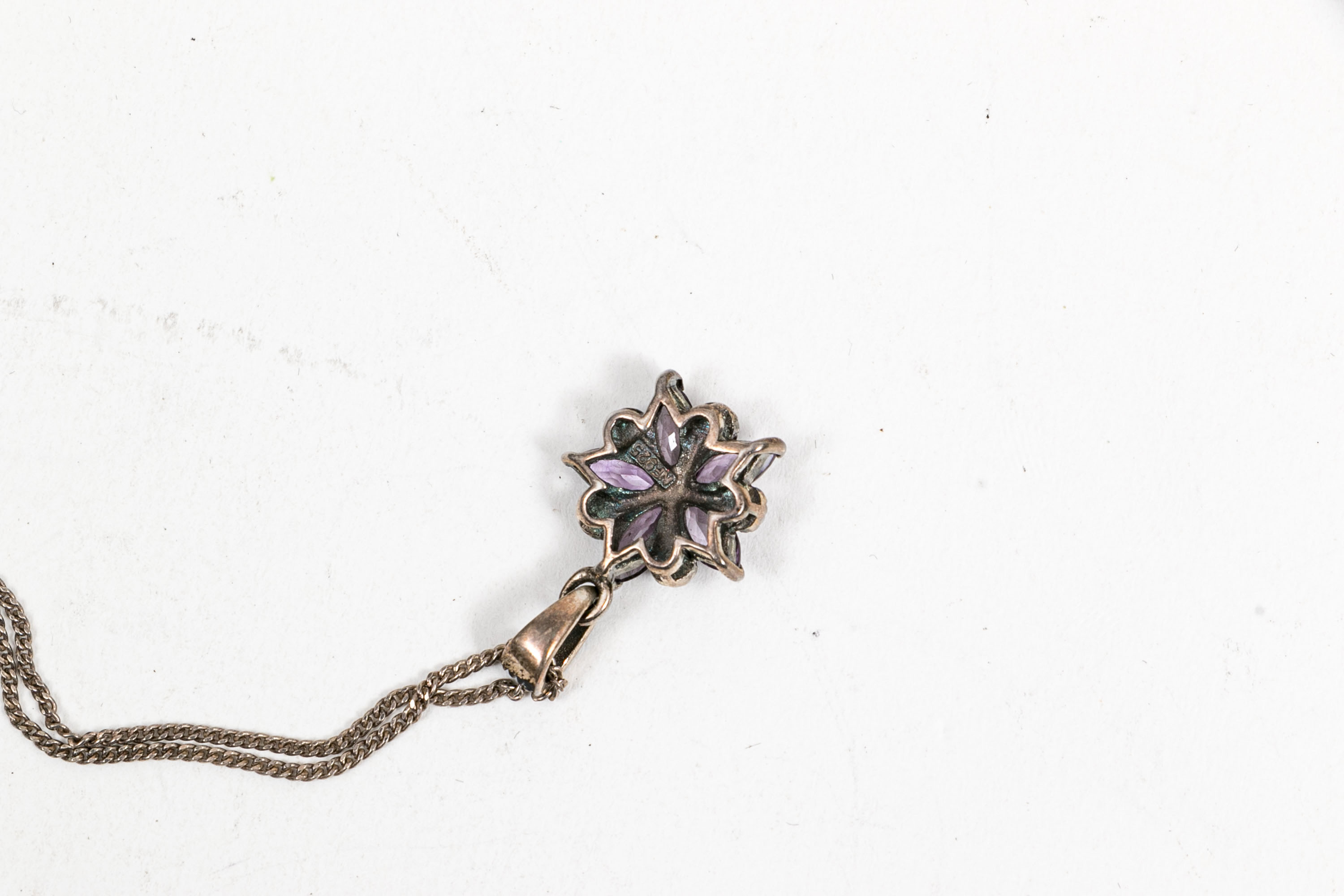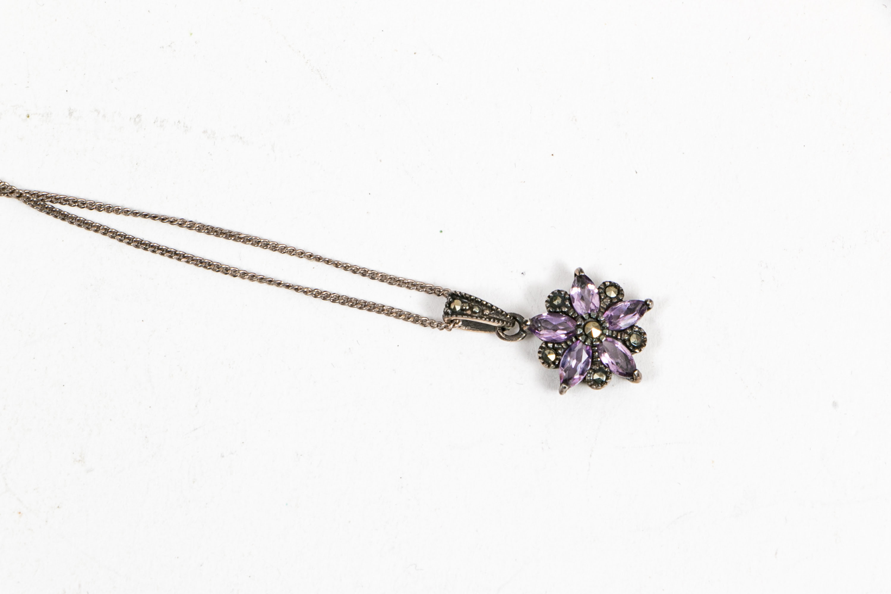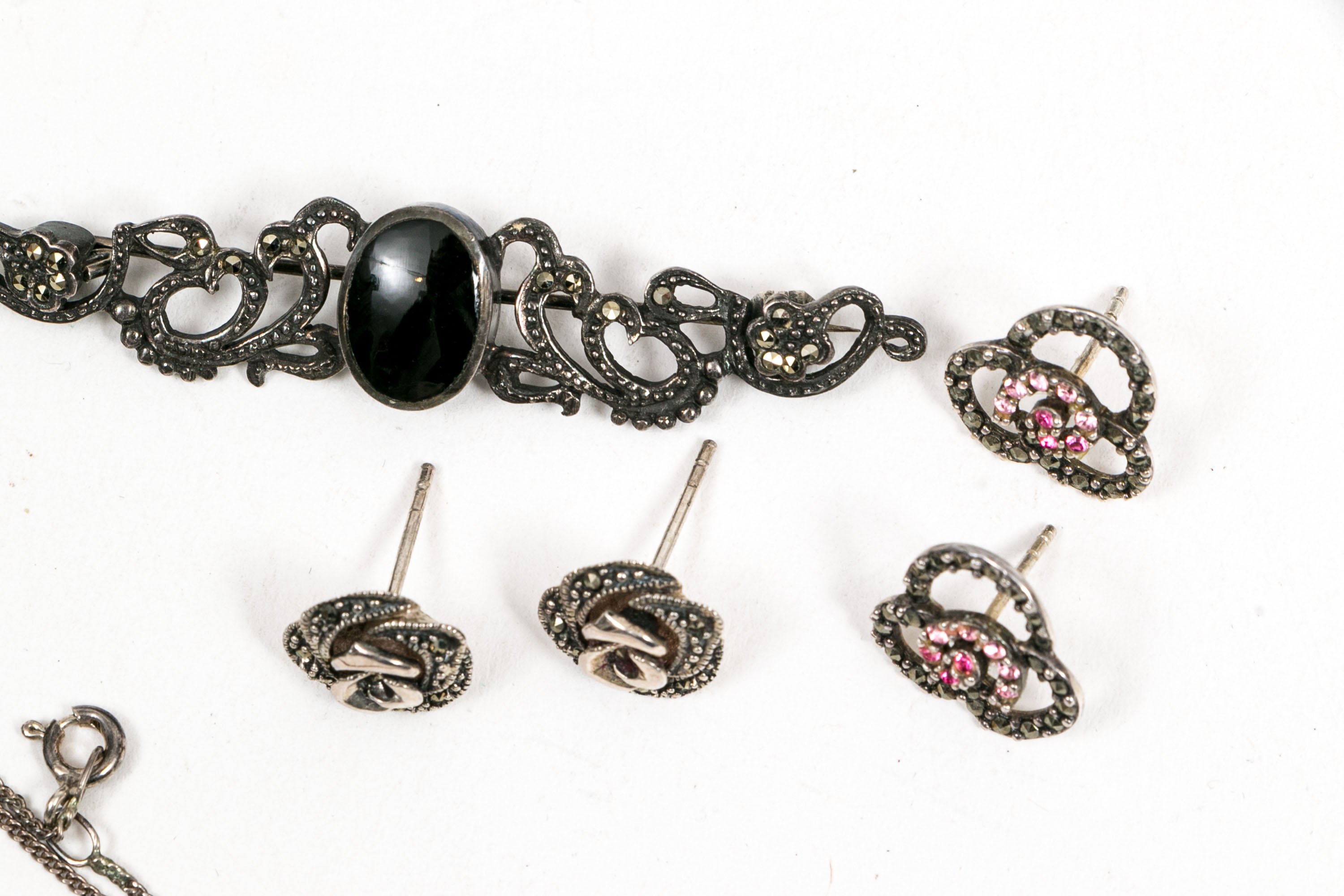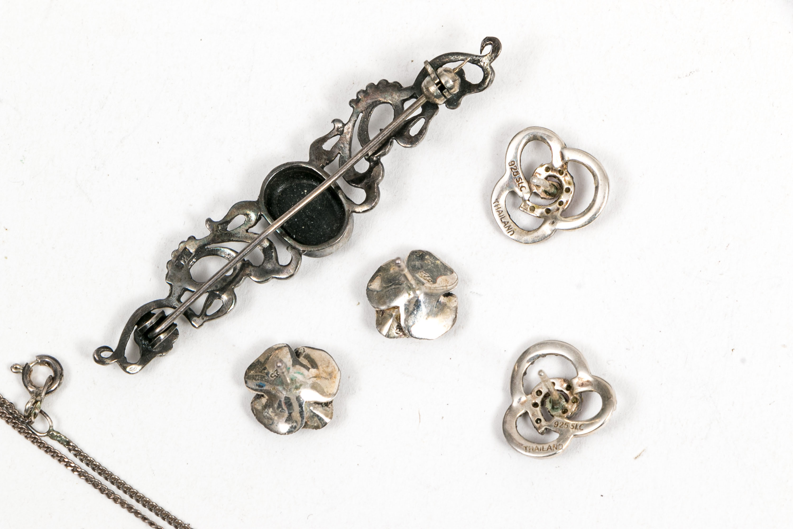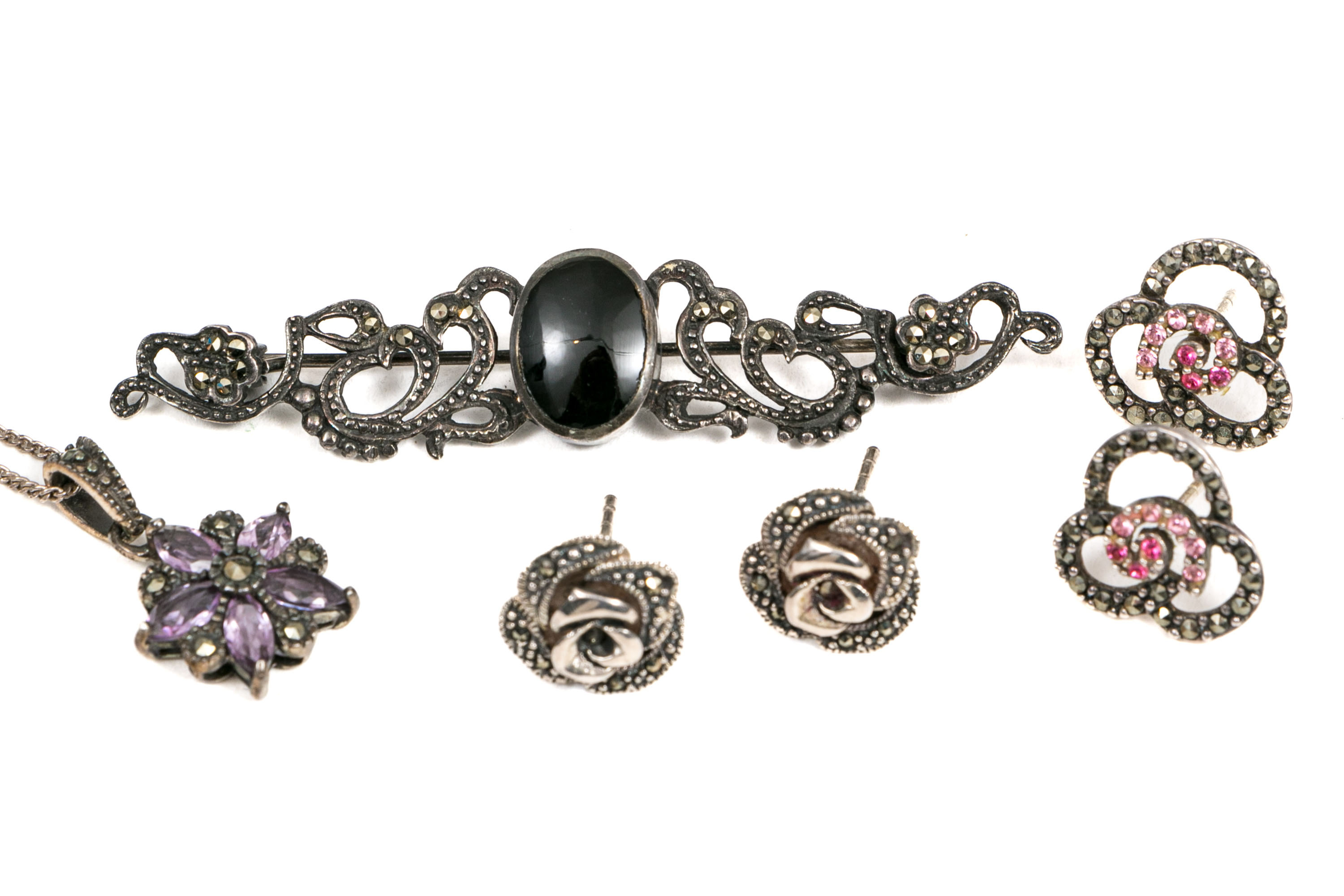 Group of sterling silver and marcasite jewelry. Small cluster pendant with amethyst and onyx set bar pin. Two earrings, one open design and the other a flower form, post backings.